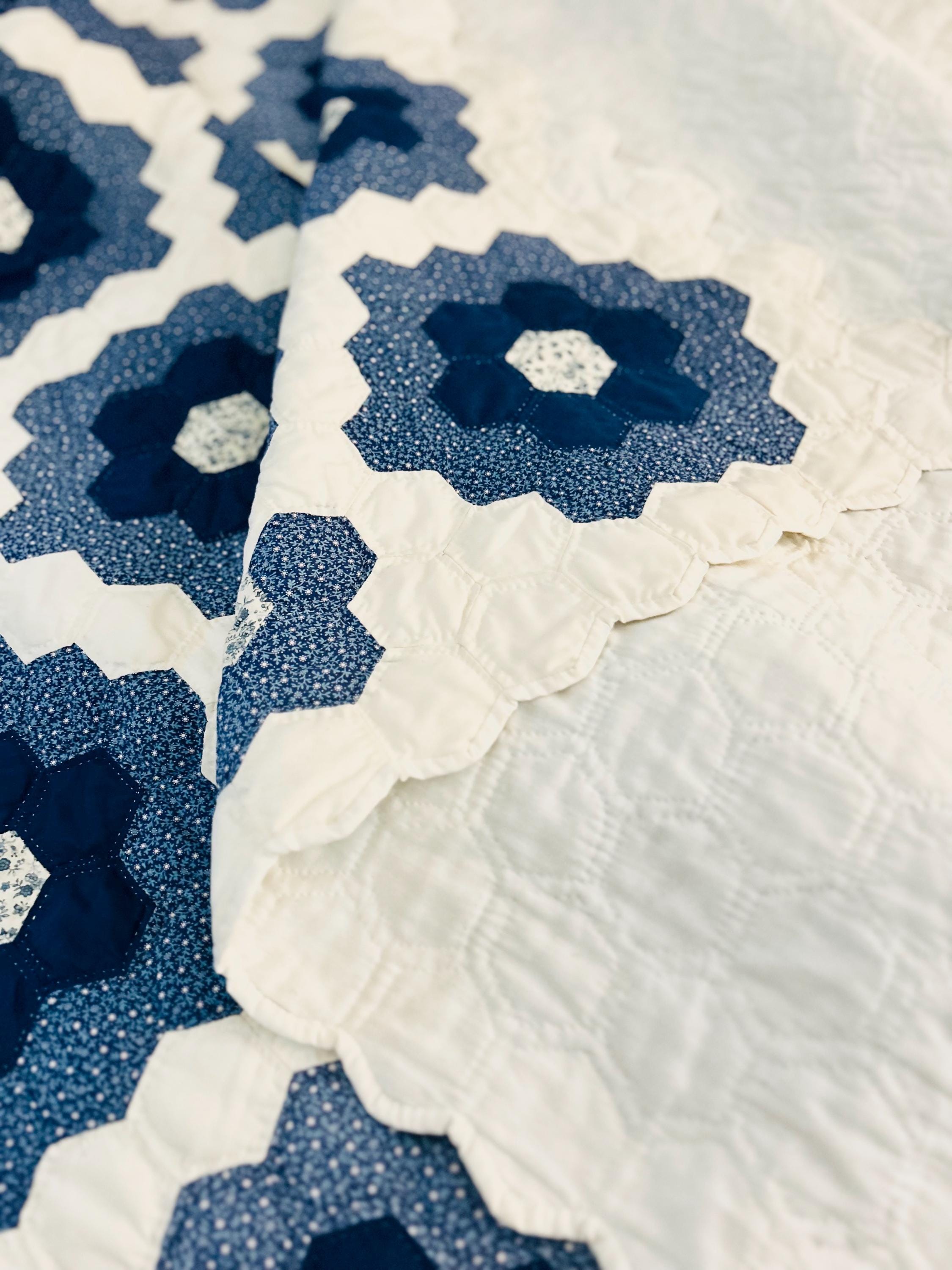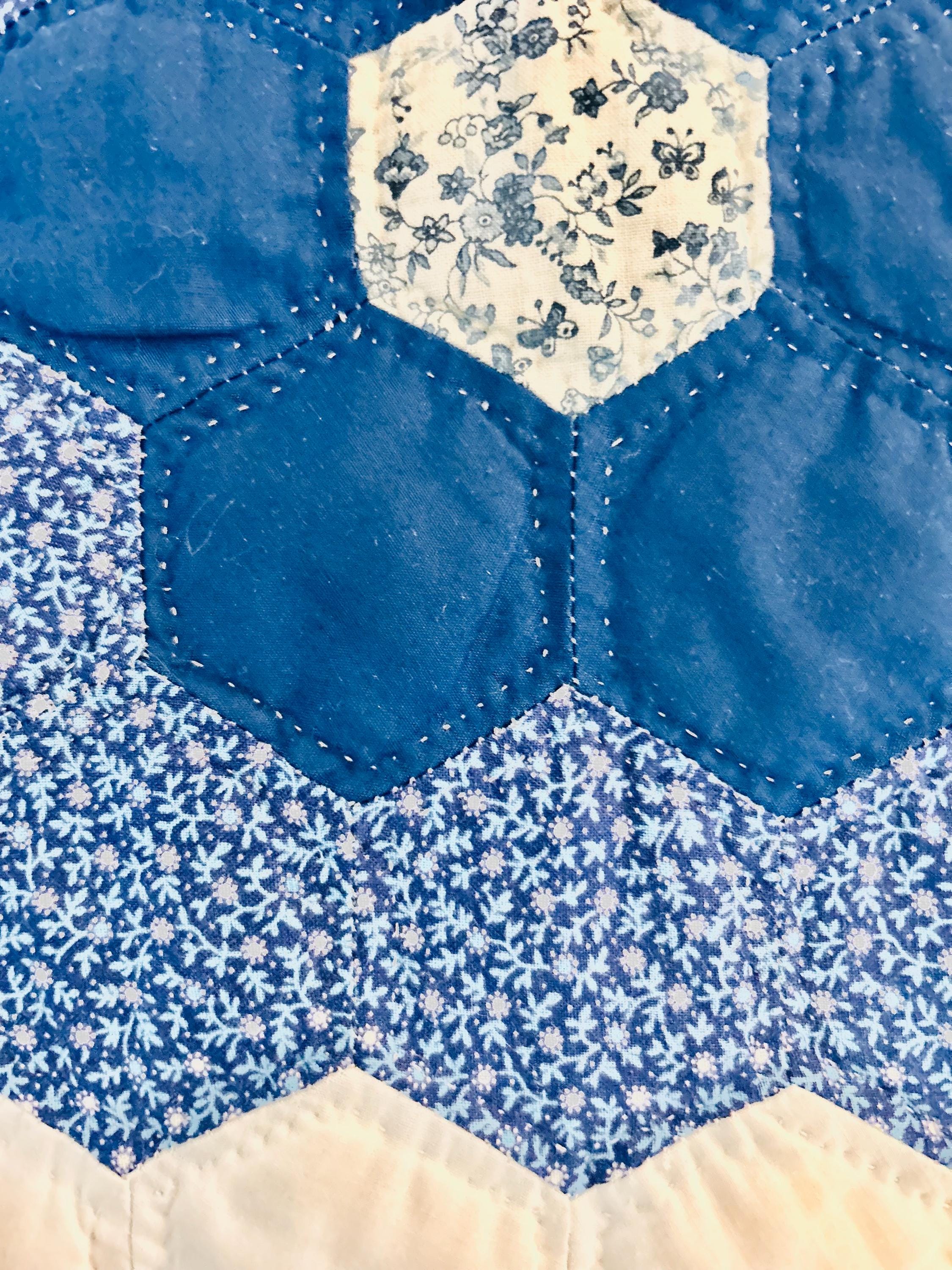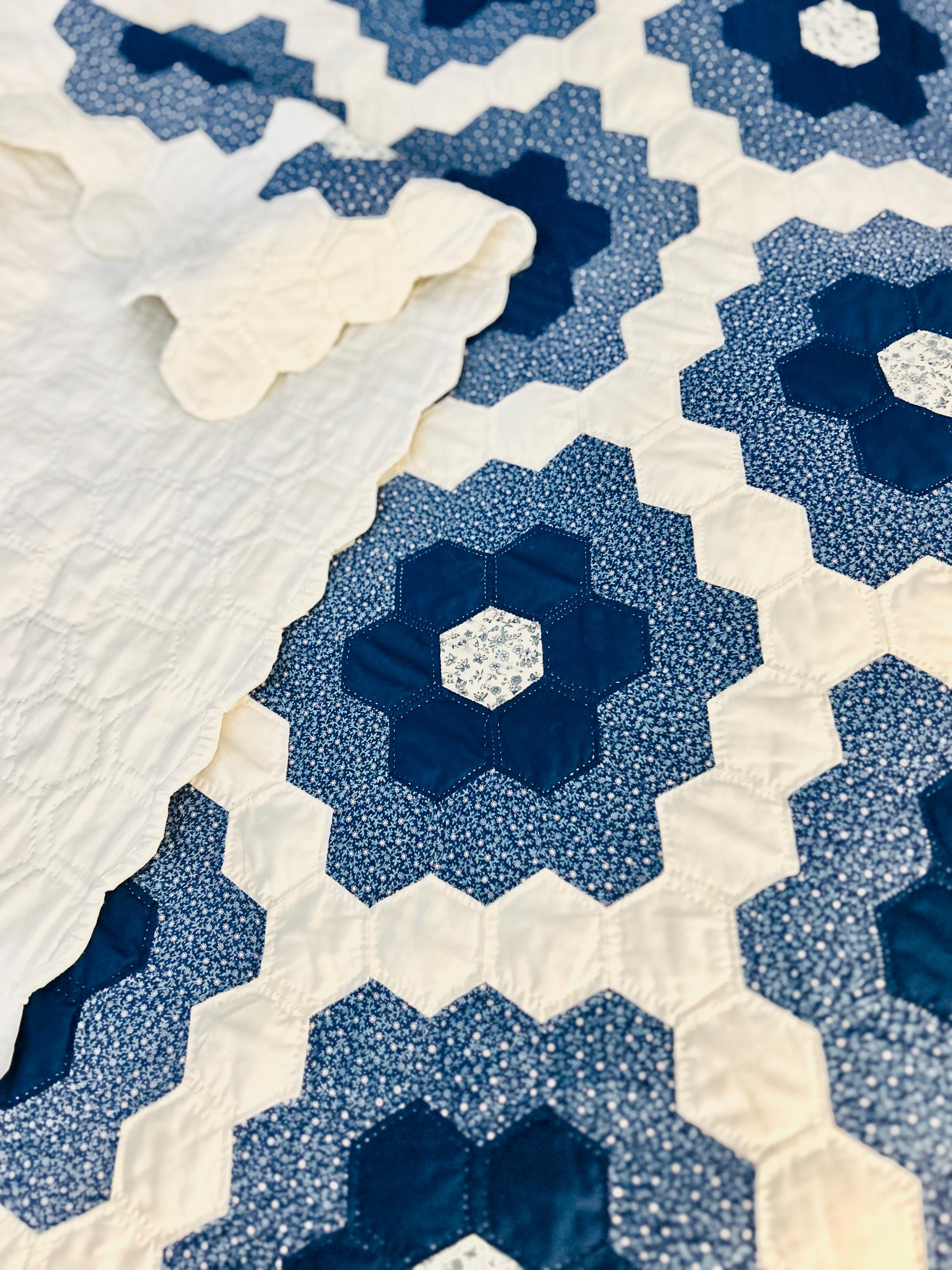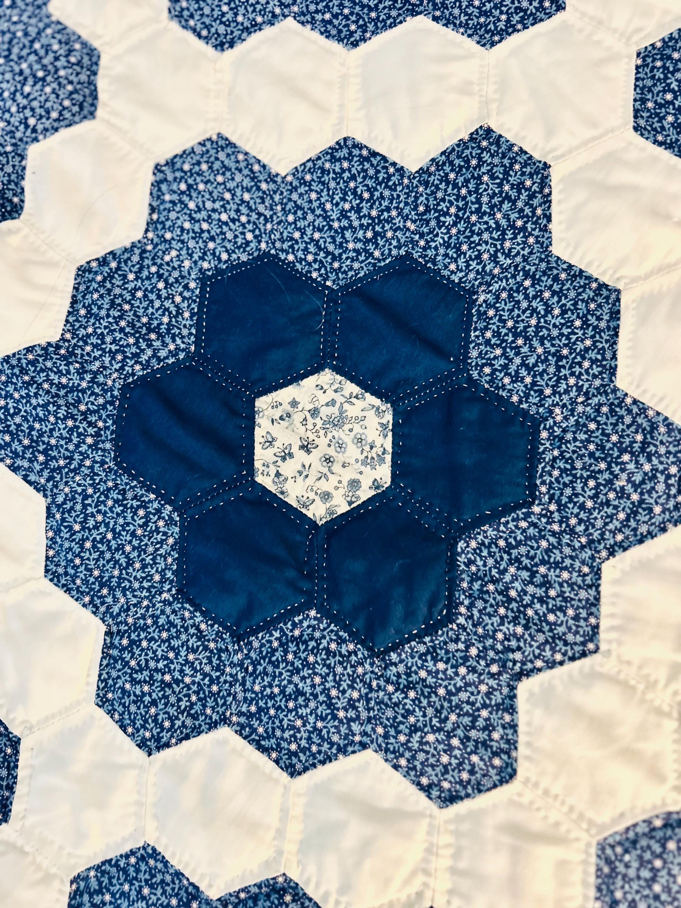 This very large Grandmother's Flower Garden Quilt is circa 1940-1950s and is made up of more than 5,000 hexagons, each of which has been hand-quilted in the shape of the hexagon.