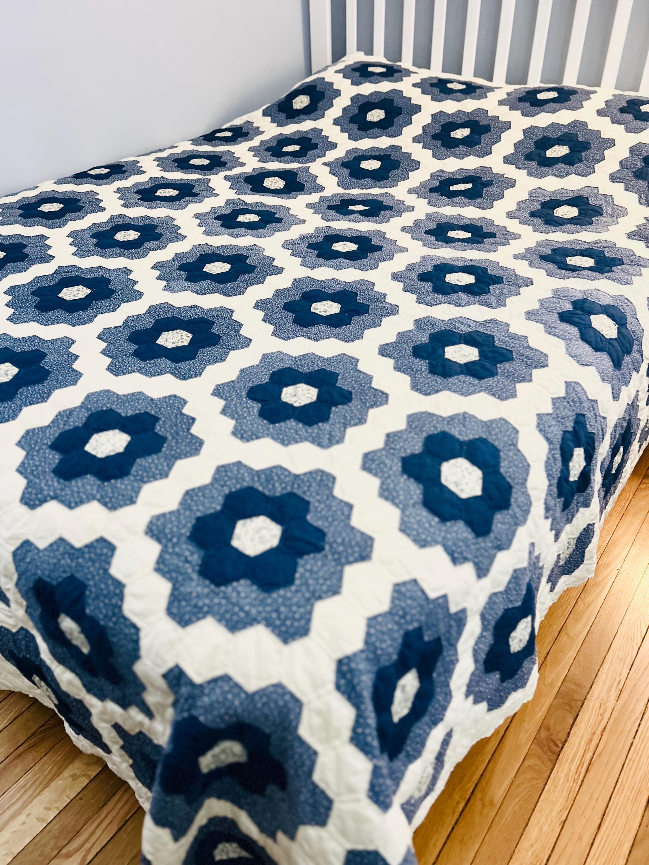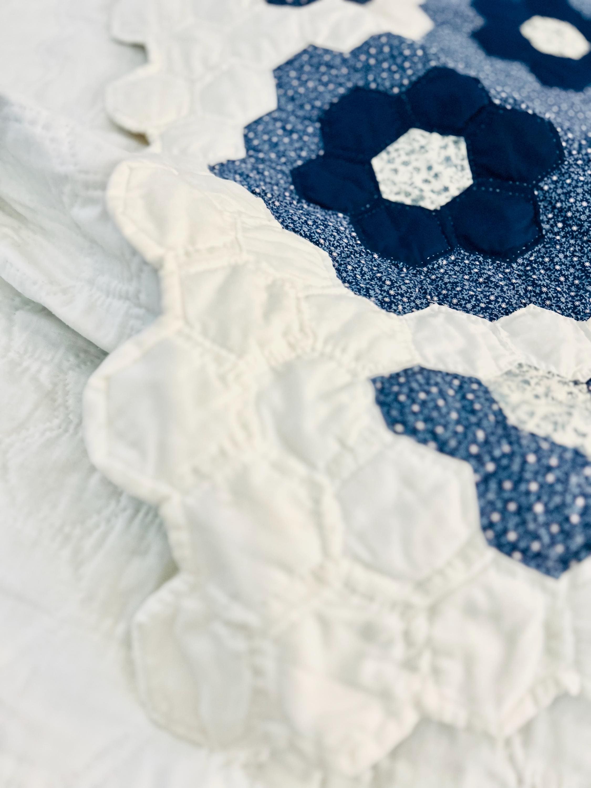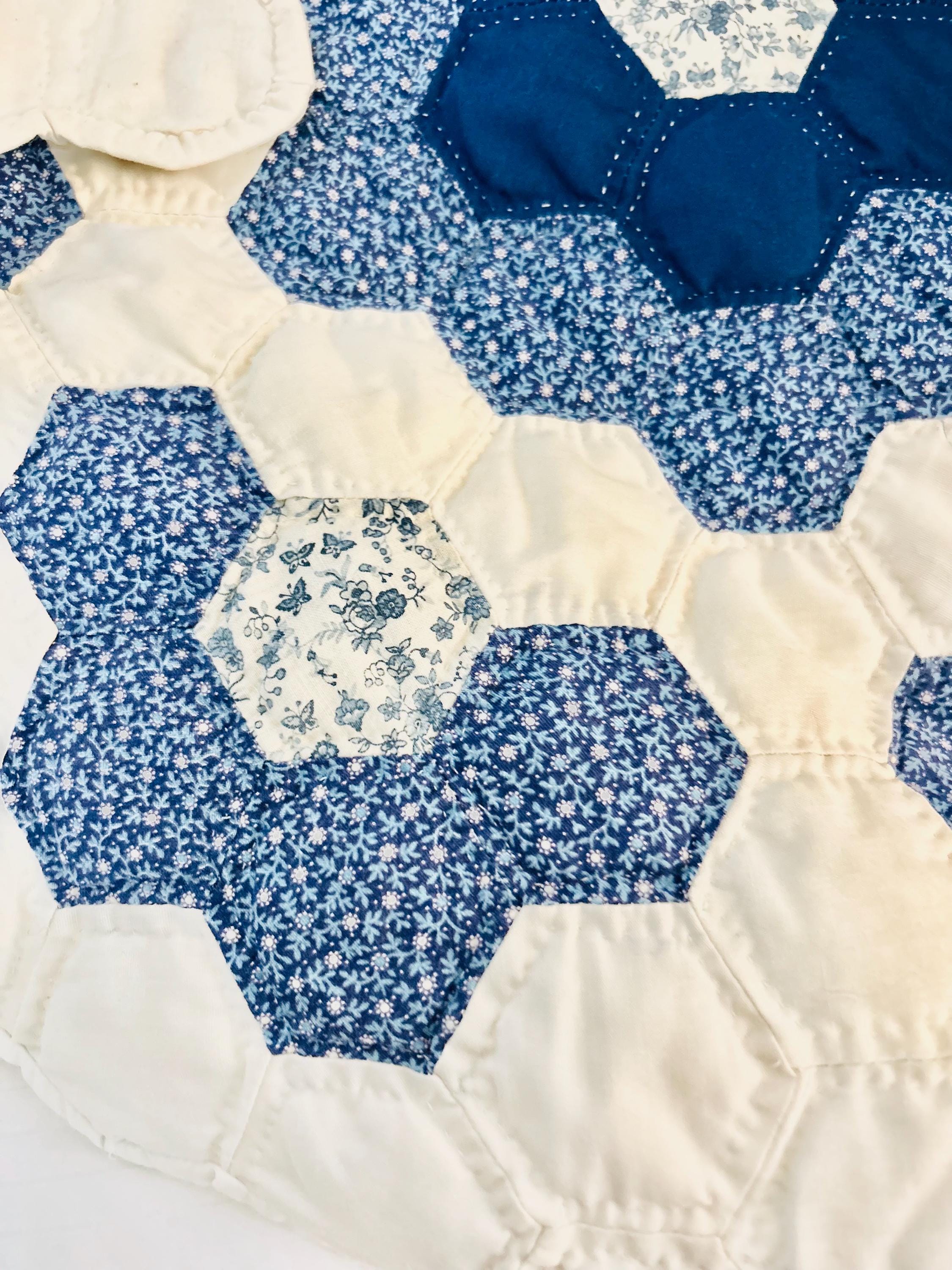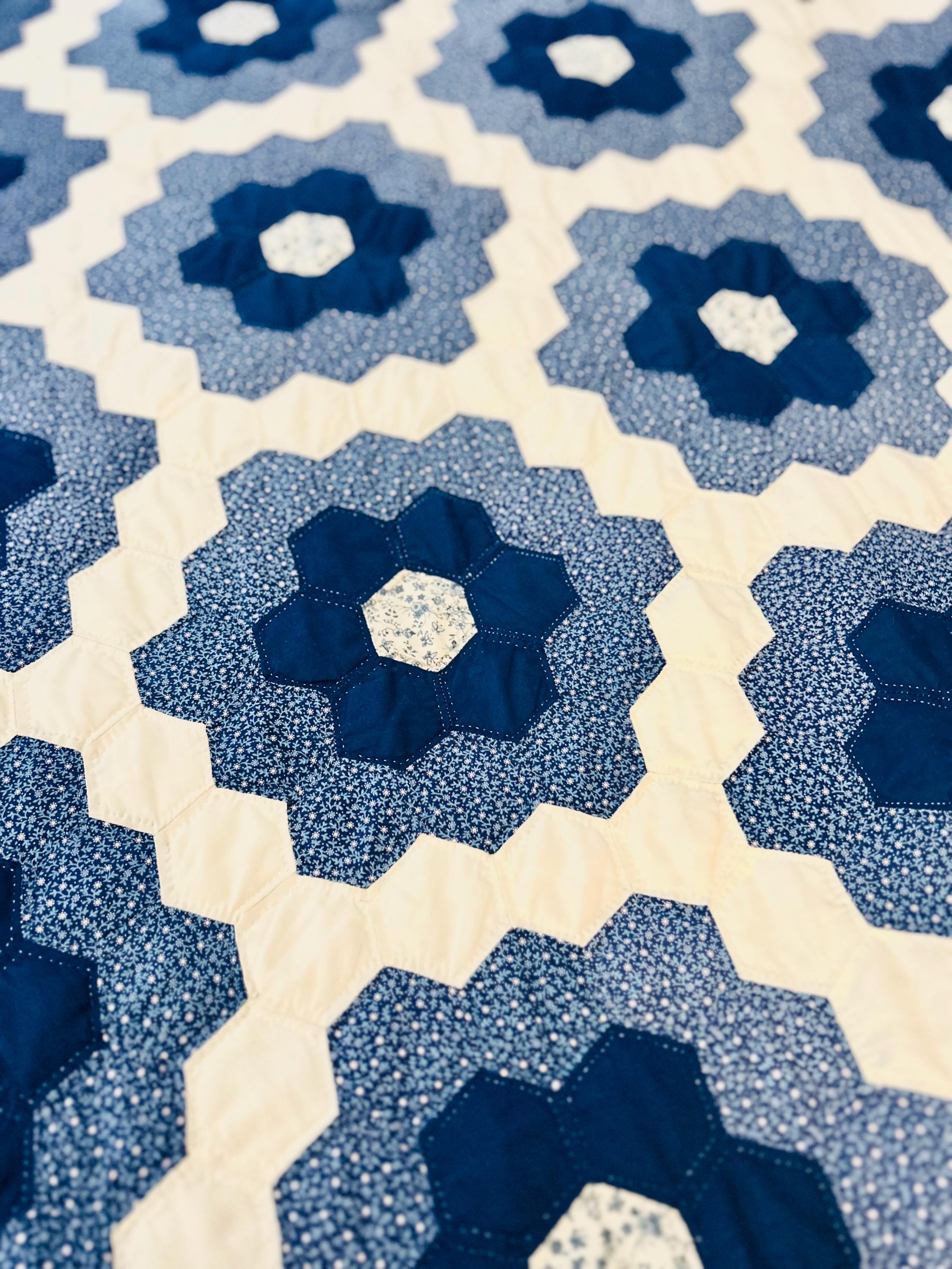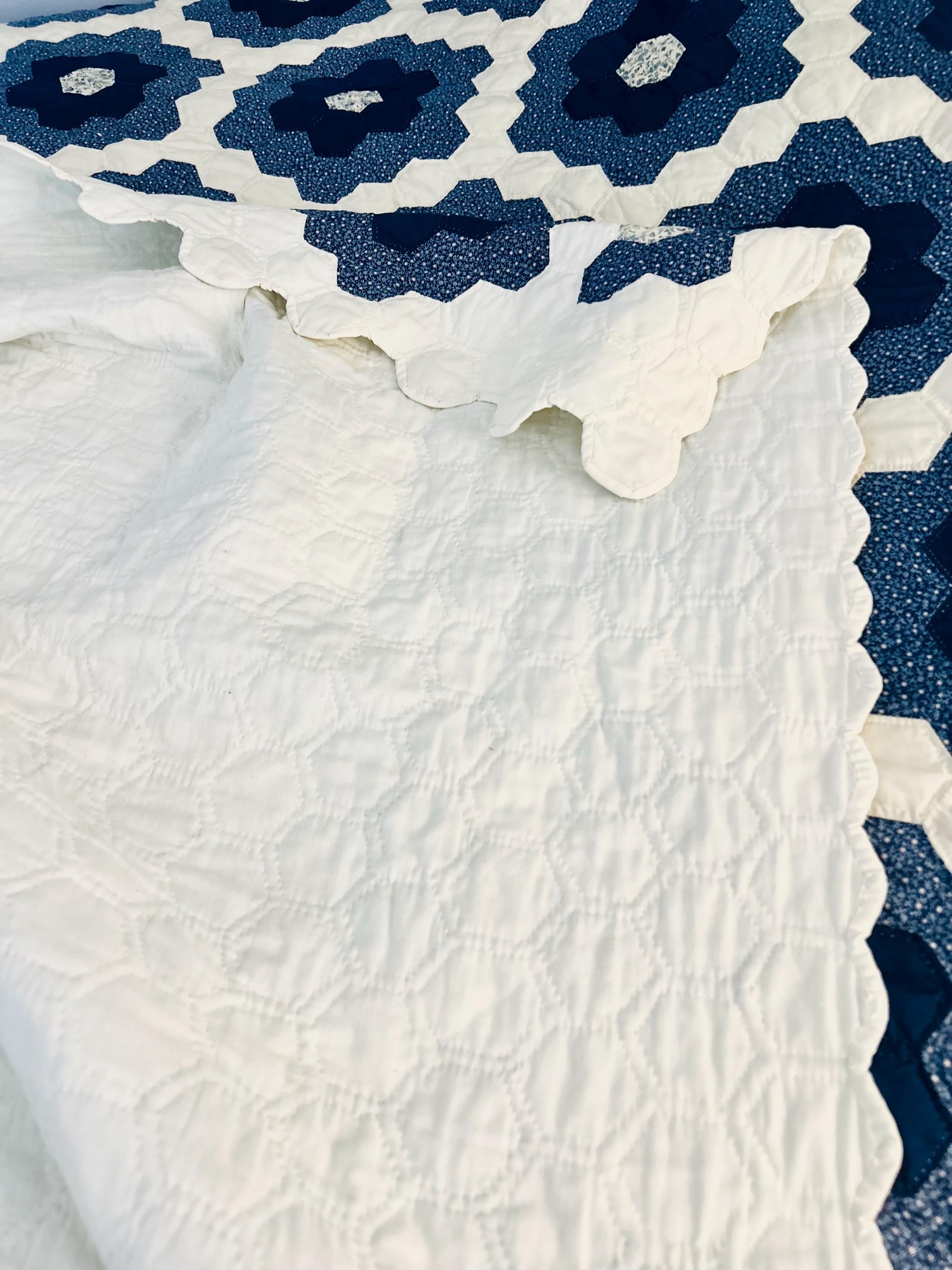 This very large Grandmother's Flower Garden Quilt is circa 1940-1950s and is made up of more than 5,000 hexagons, each of which has been hand-quilted in the shape of the hexagon.