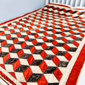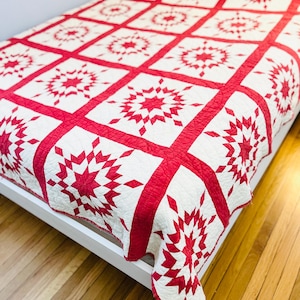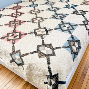 It is a king-size quilt measuring approximately 92 inches by 98 inches and comes from a smoke-free and pet-free home. Pictured on a queen-size bed.
