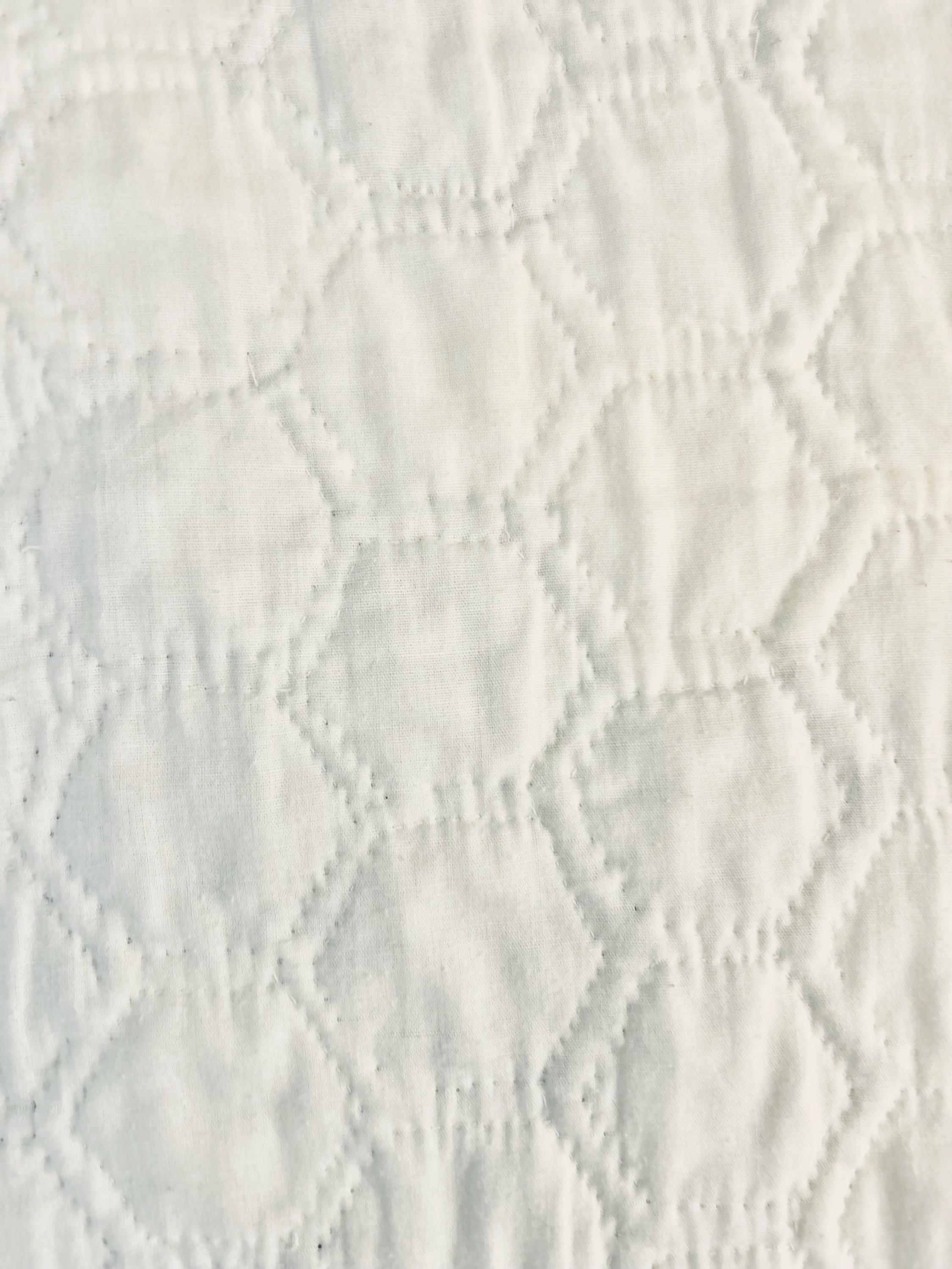 The back is white cotton as is the binding that has been machine stitched to the front and hand-stitched to the back. The batting is lightweight.