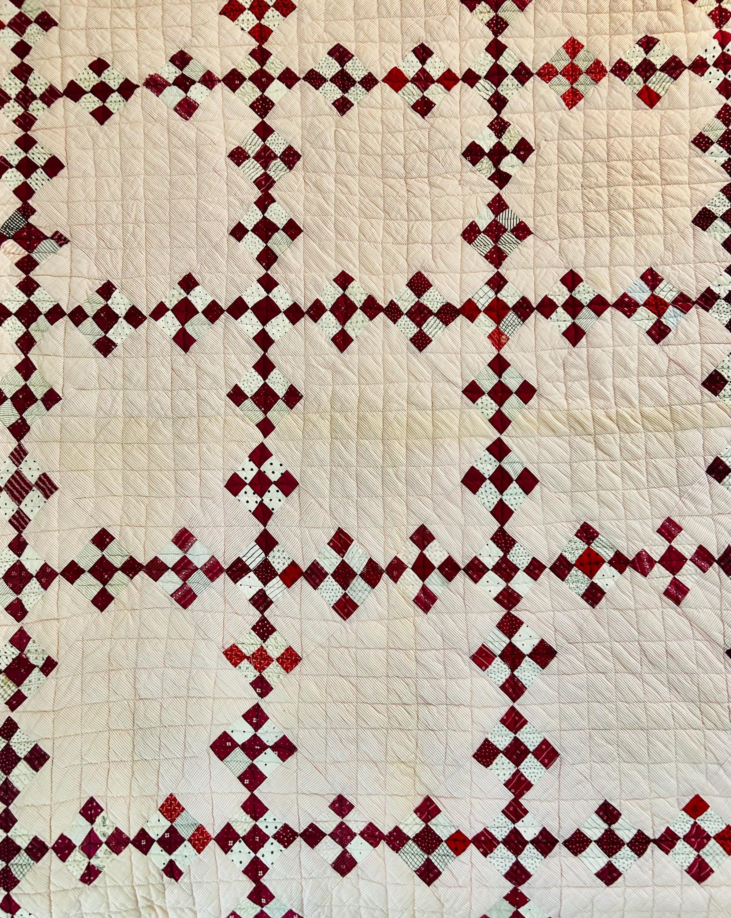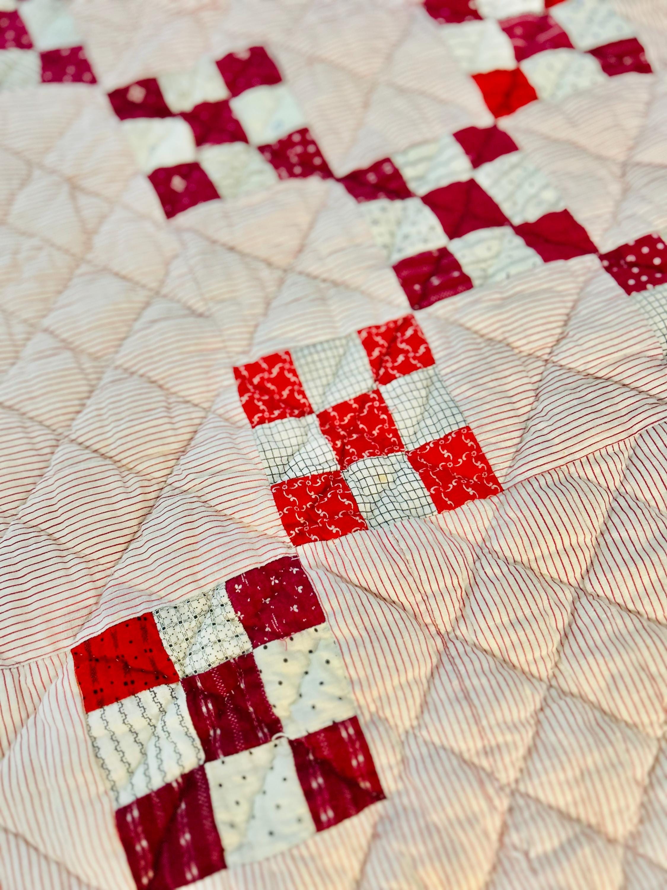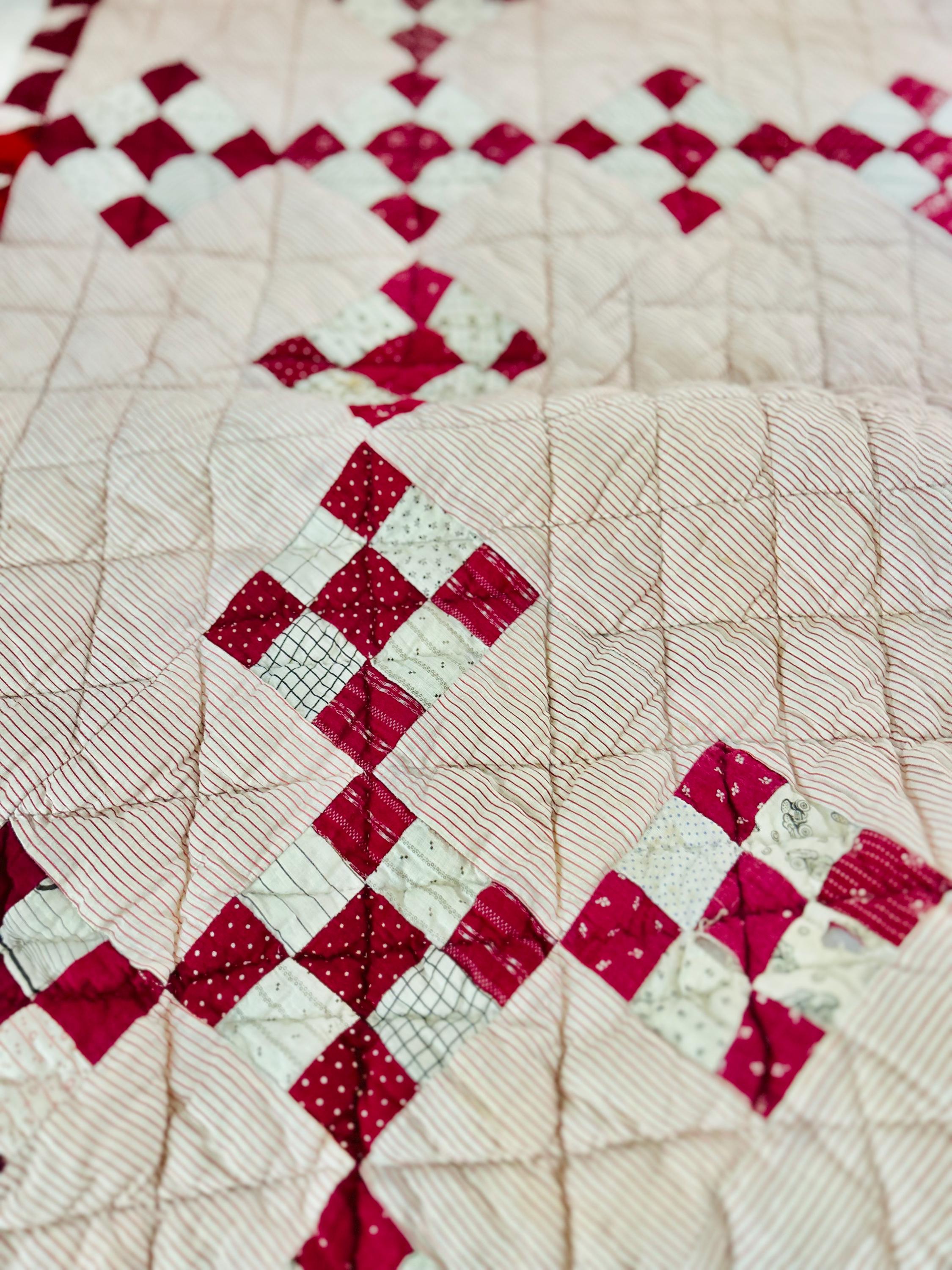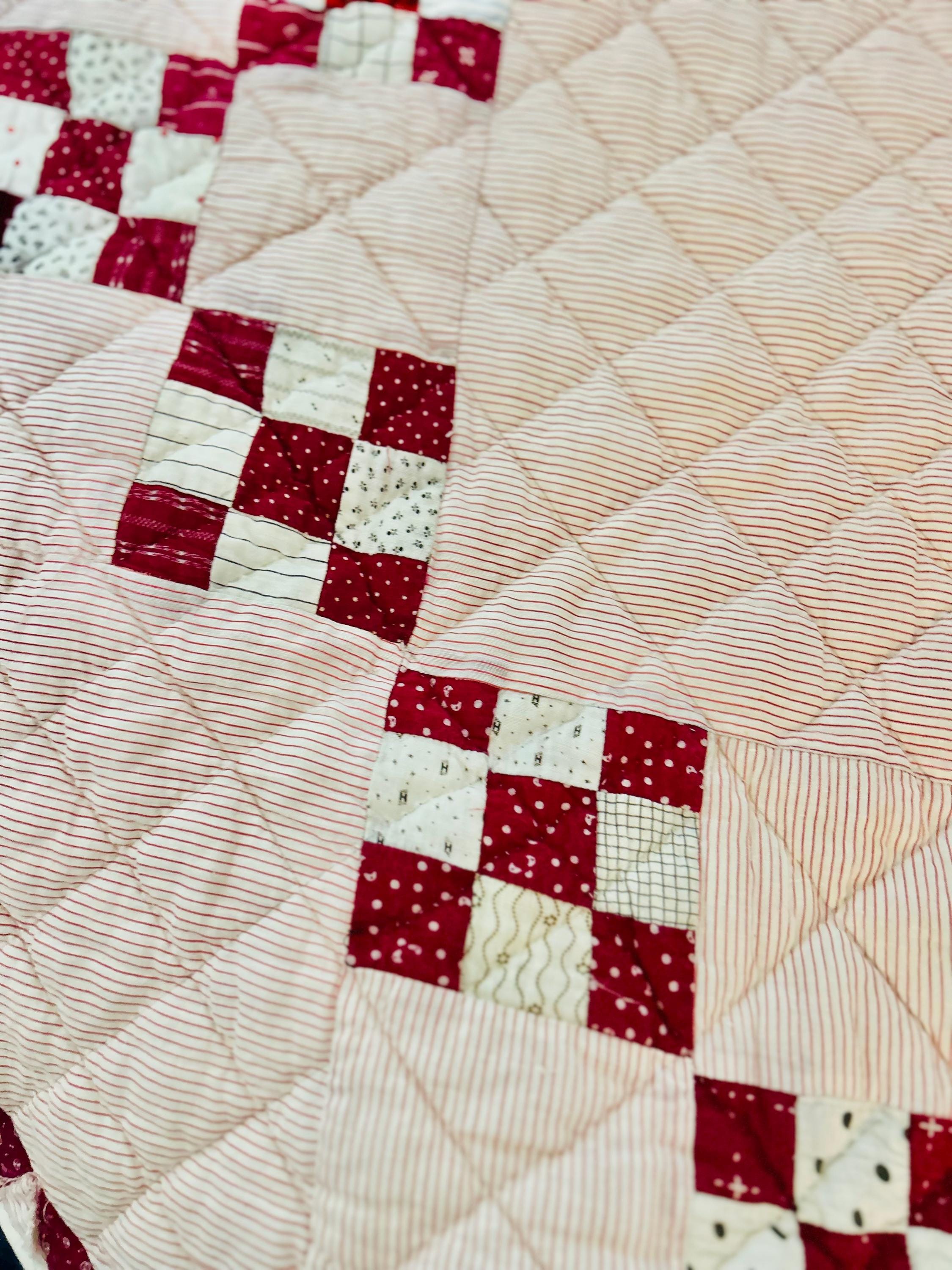 This sweet Double Nine-Patch Quilt is circa 1930-1940s and nine-patches are made with patchwork squares just 1-inch square. It is entirely hand-quilted in diagonals and diamonds. The patchwork sawtooth border goes around all four sides.