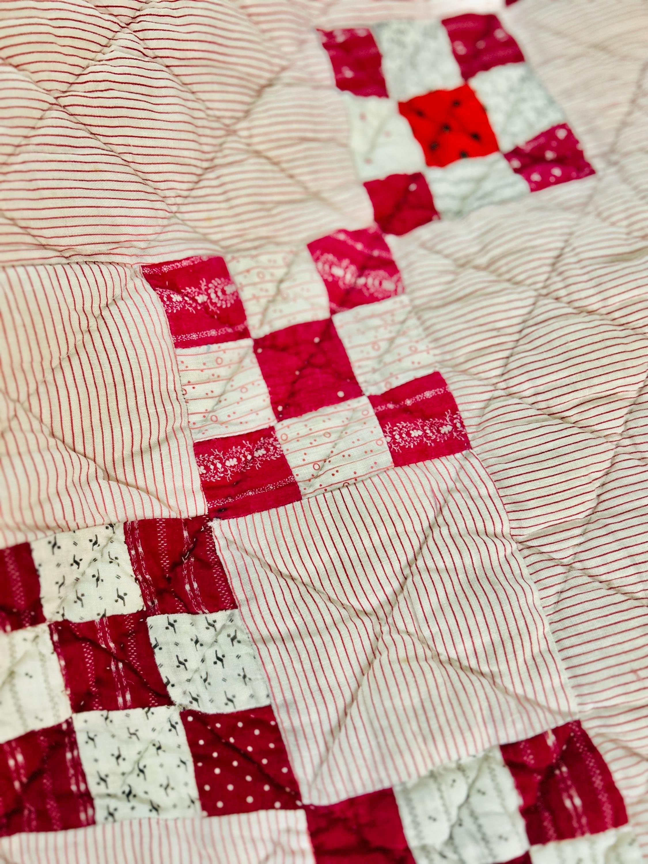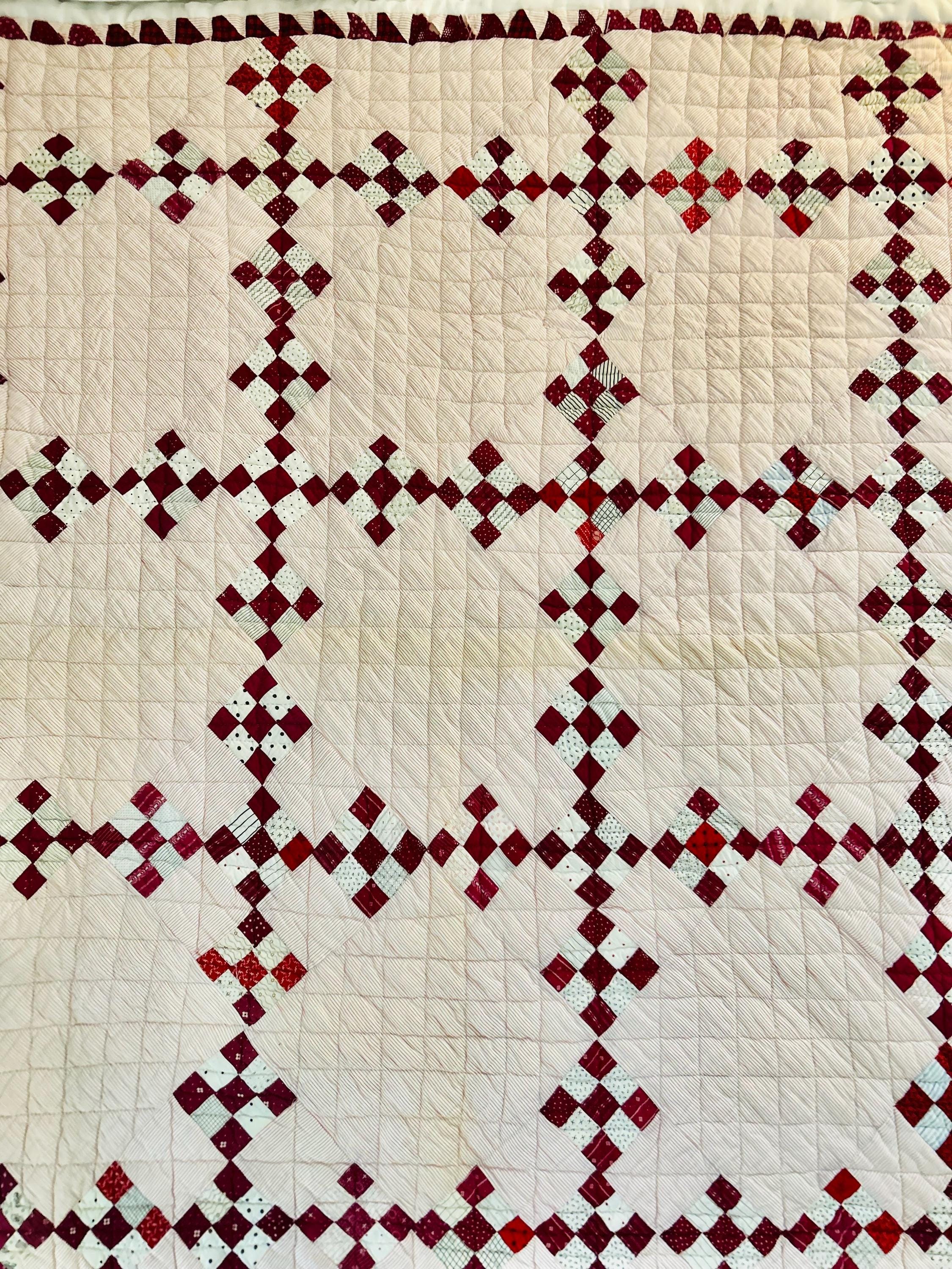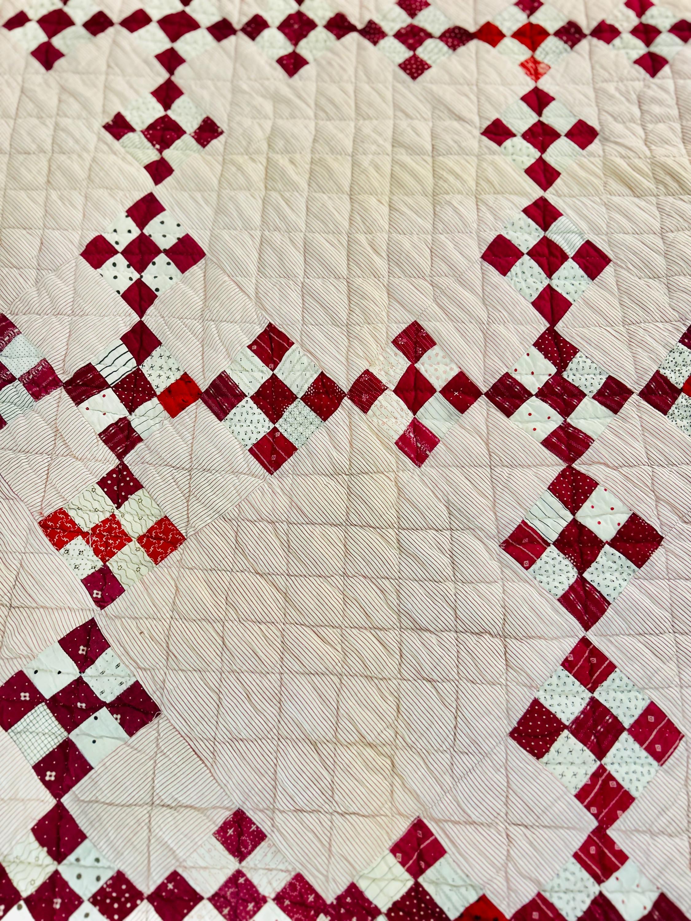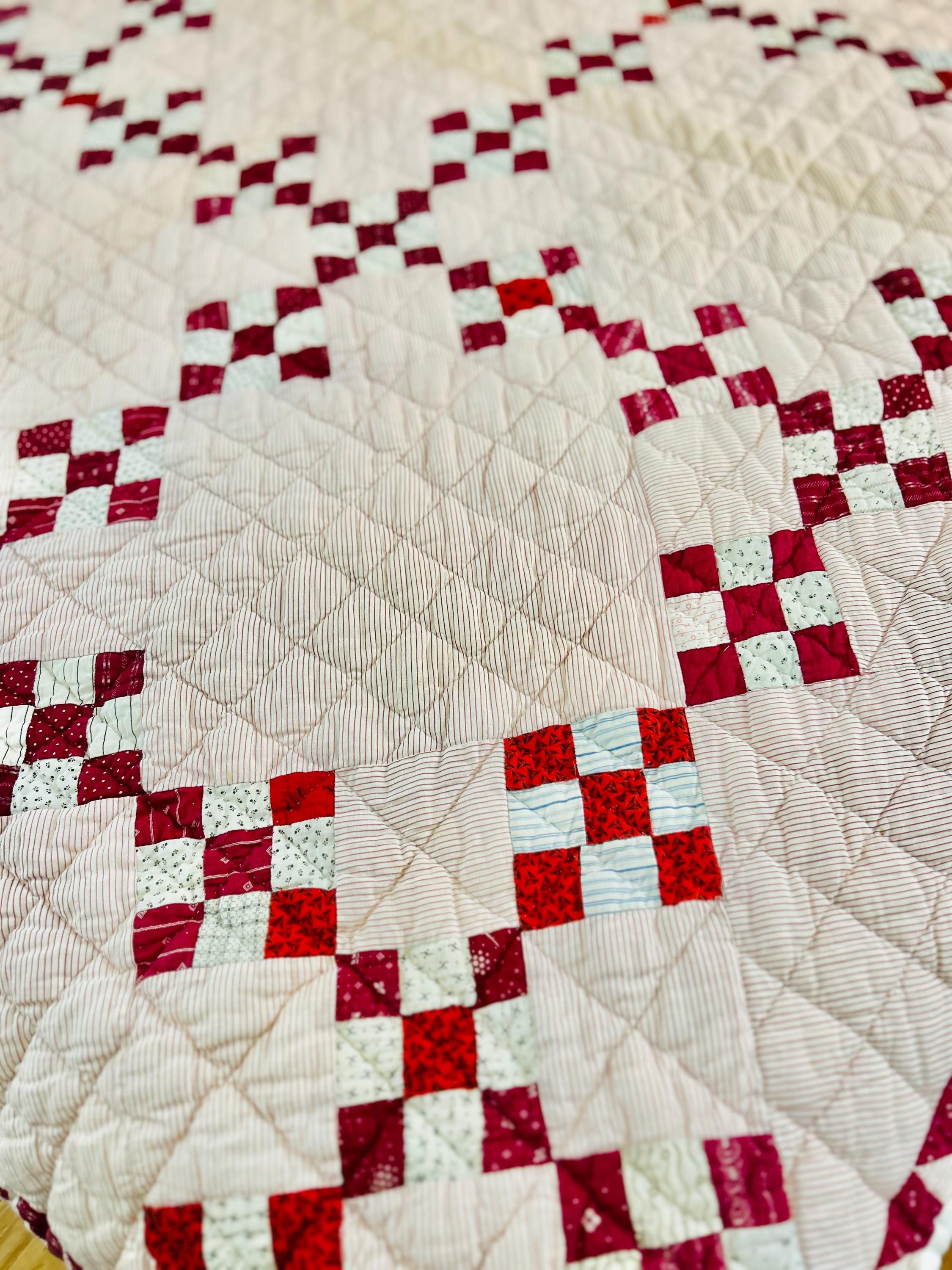 This sweet Double Nine-Patch Quilt is circa 1930-1940s and nine-patches are made with patchwork squares just 1-inch square. It is entirely hand-quilted in diagonals and diamonds. The patchwork sawtooth border goes around all four sides.