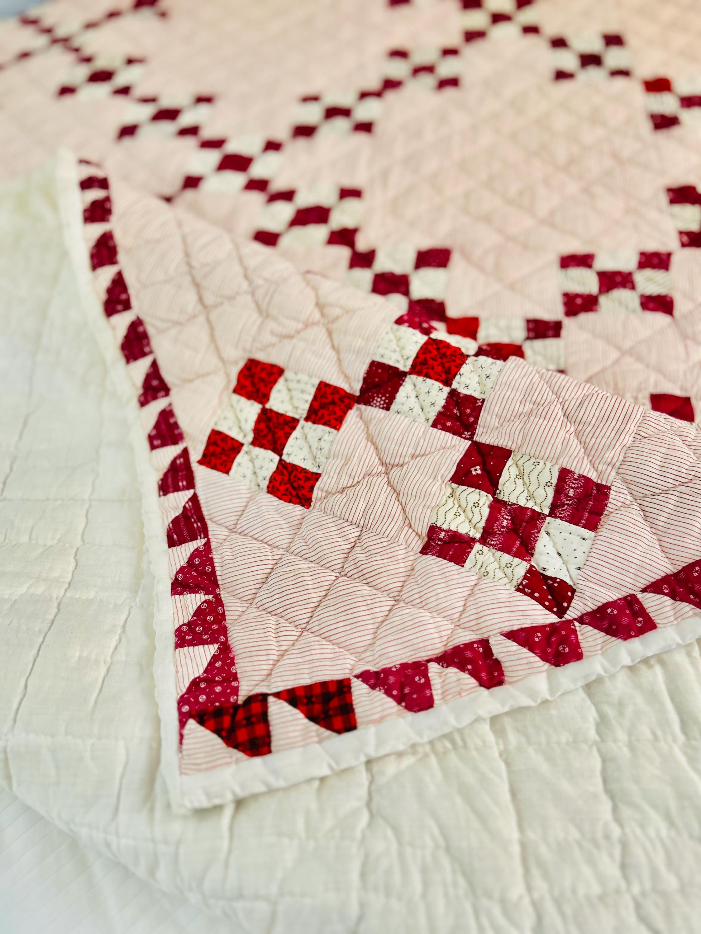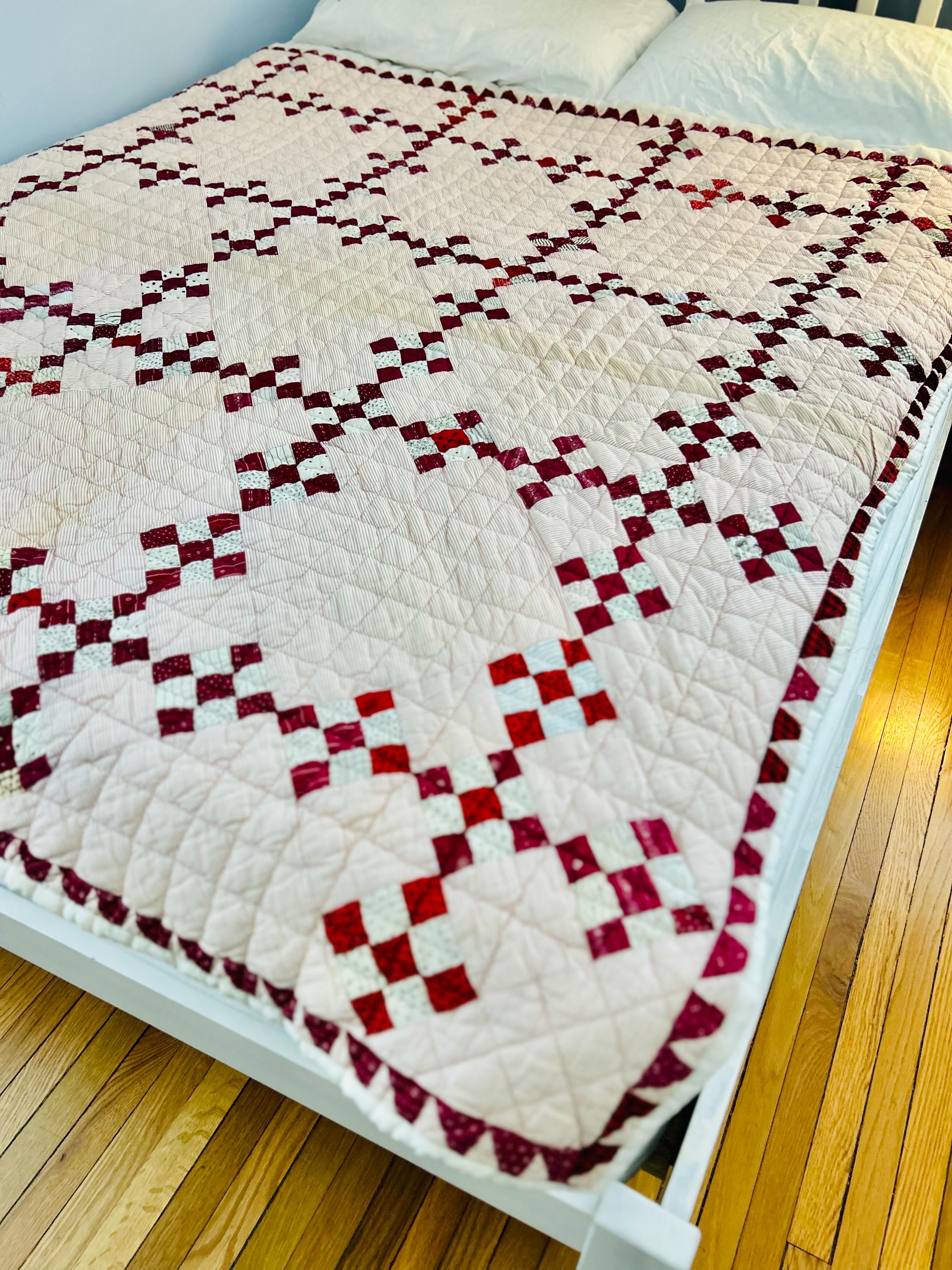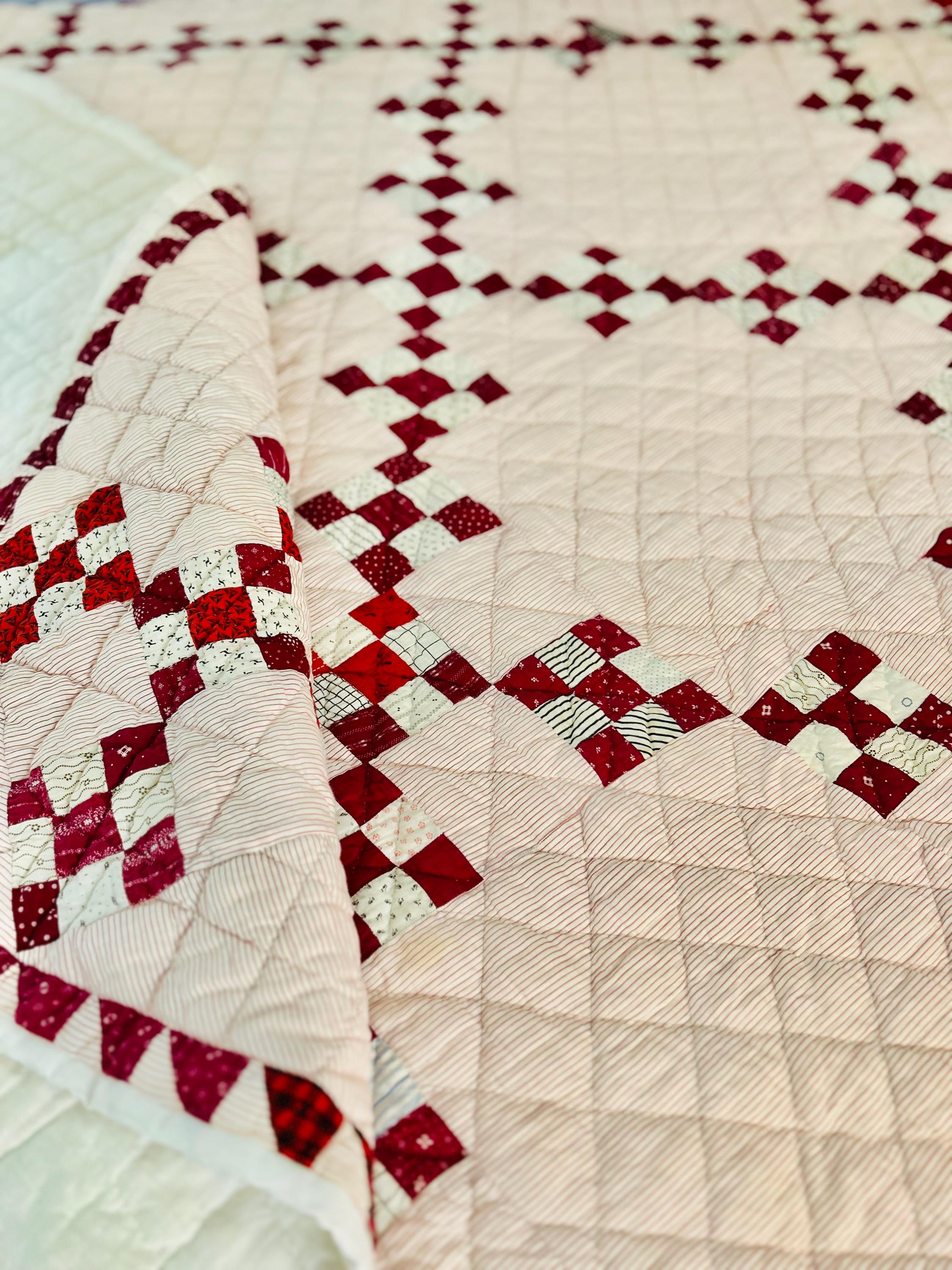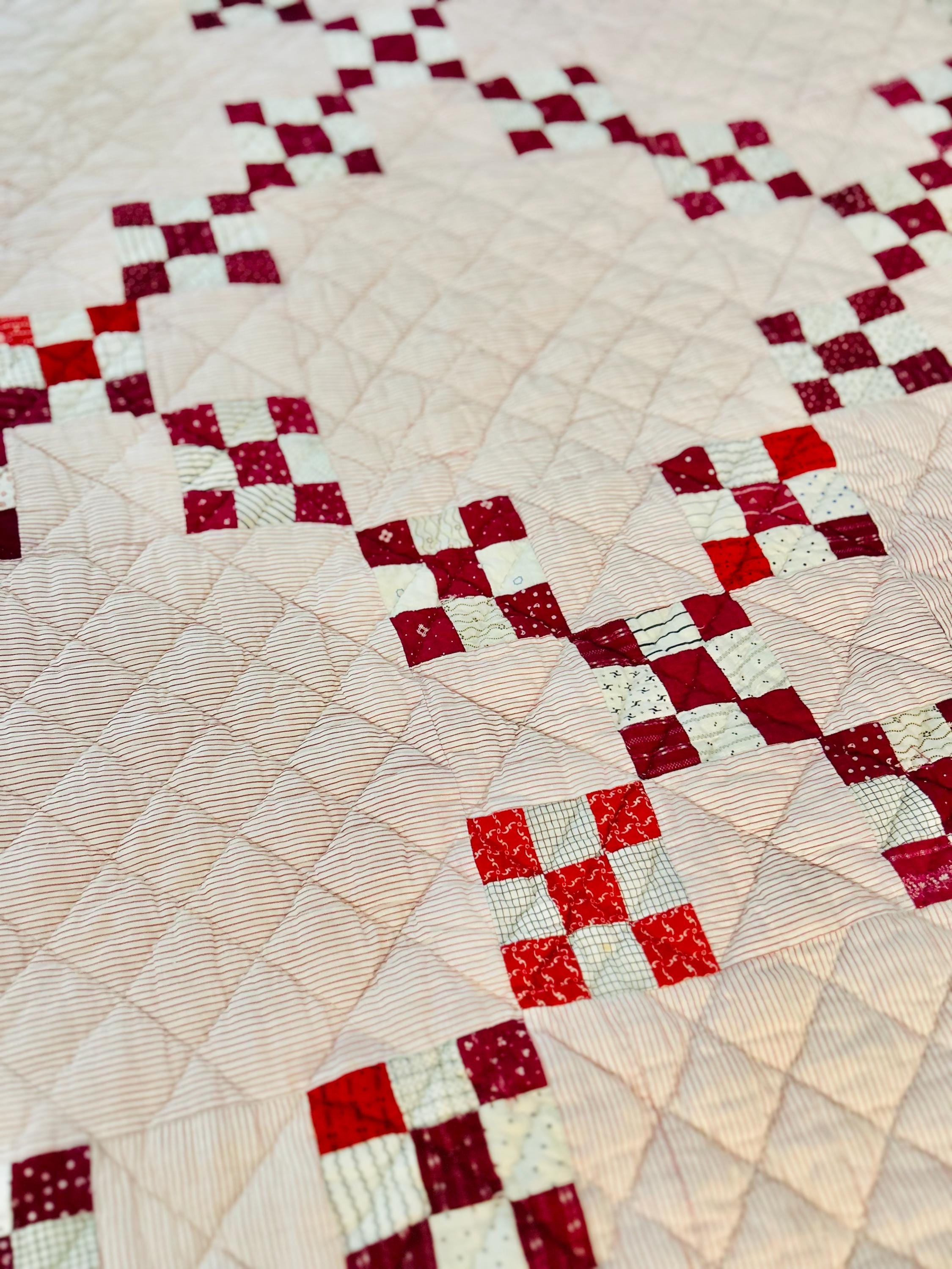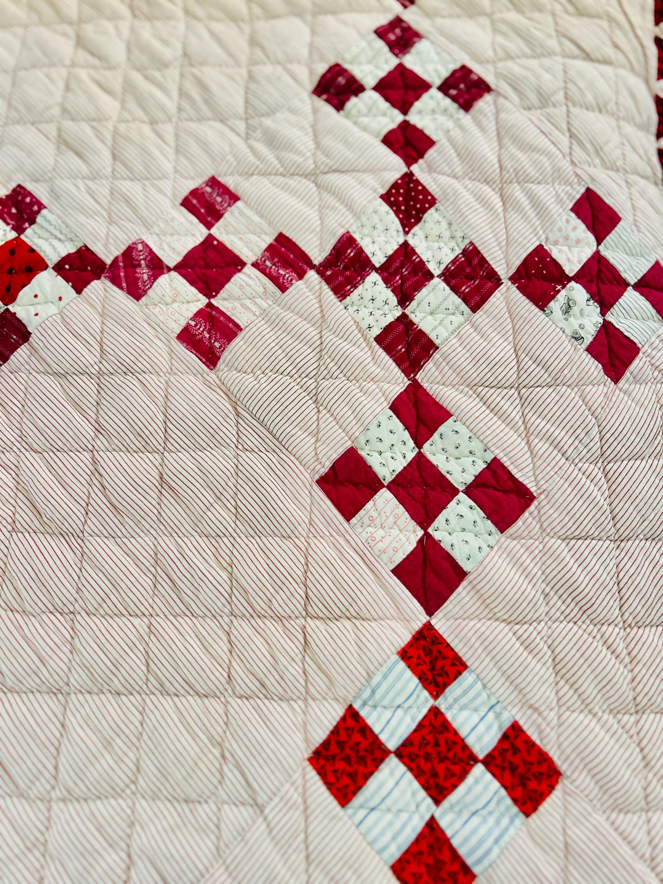 This sweet Double Nine-Patch Quilt is circa 1930-1940s and nine-patches are made with patchwork squares just 1-inch square. It is entirely hand-quilted in diagonals and diamonds. The patchwork sawtooth border goes around all four sides.
