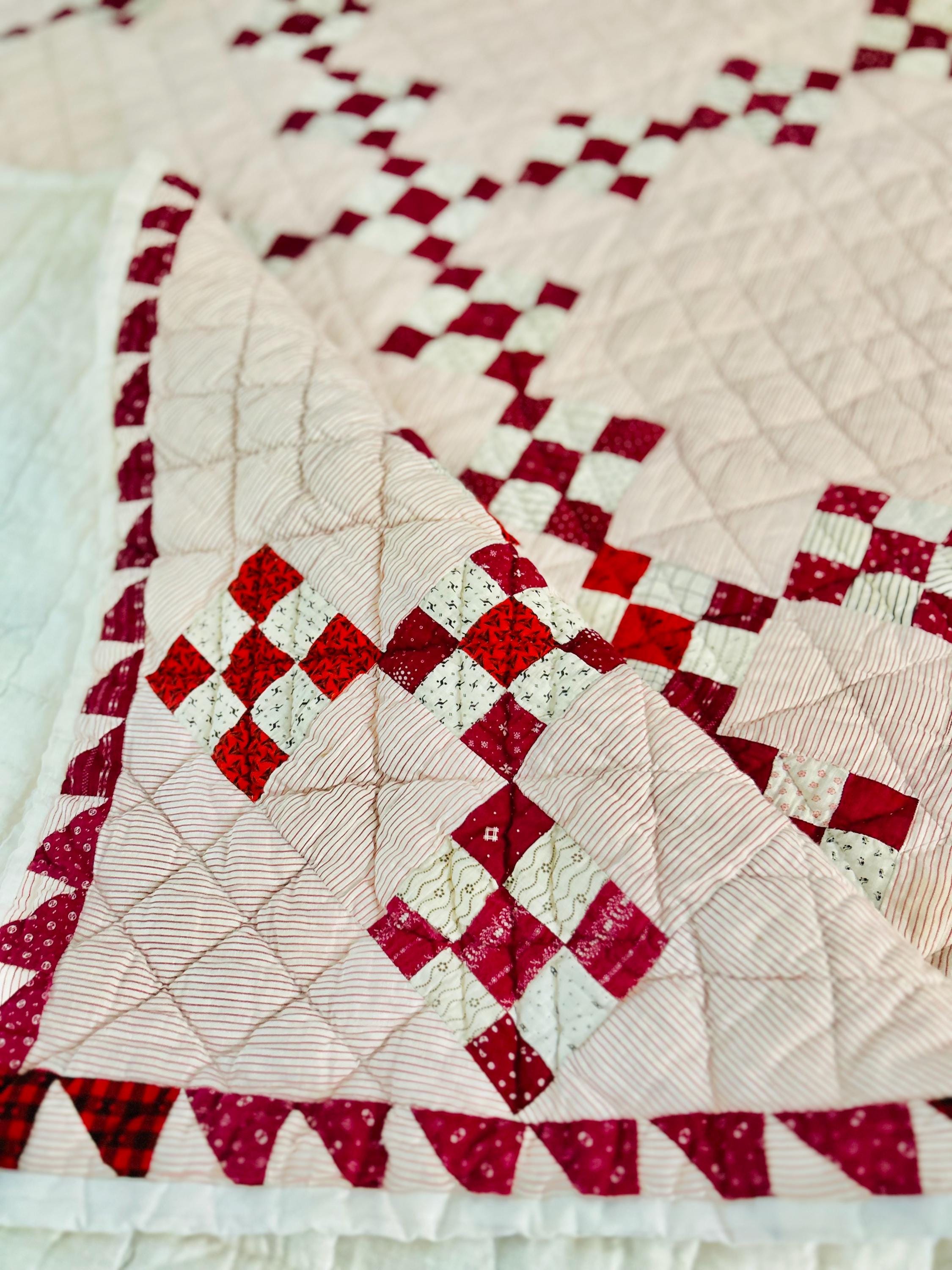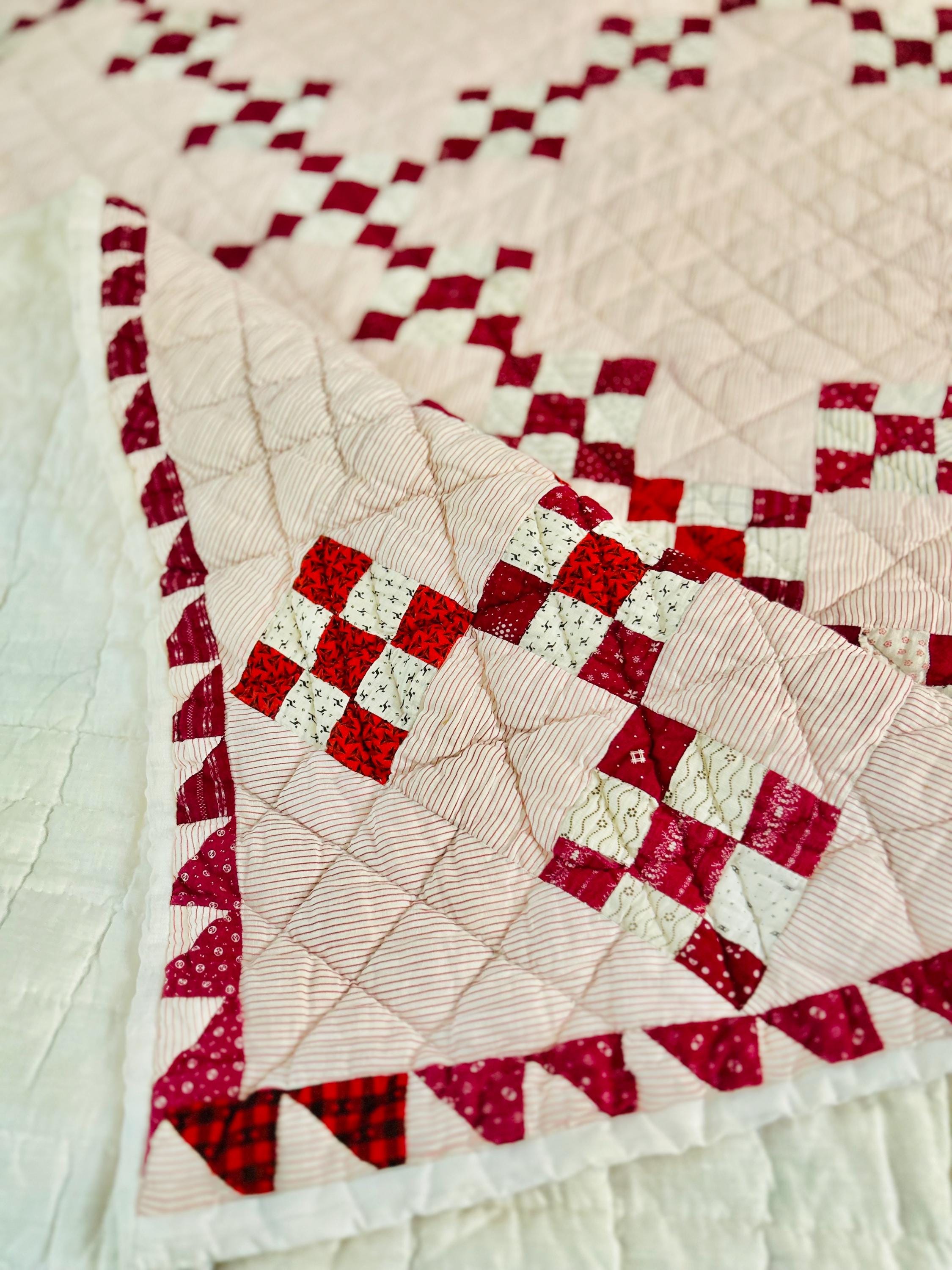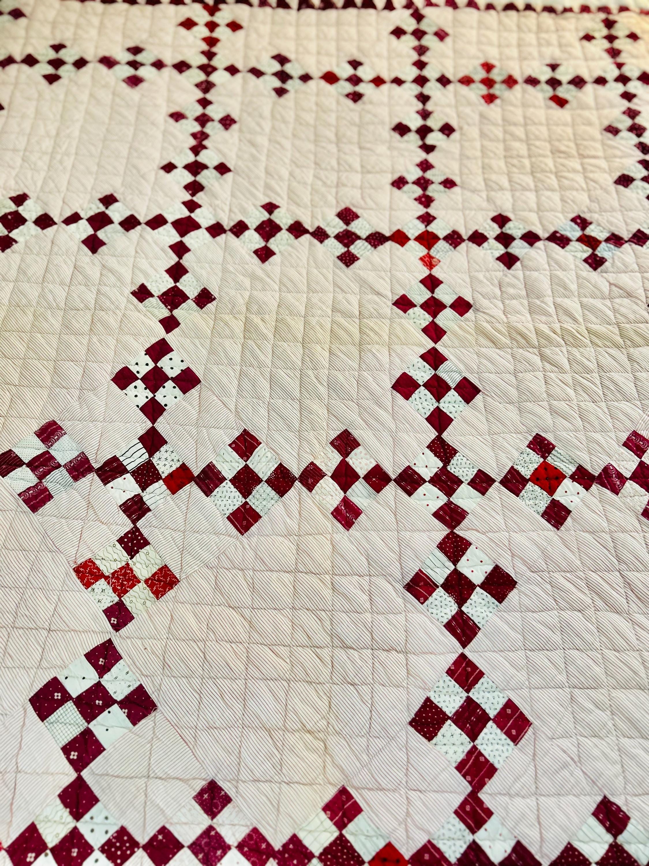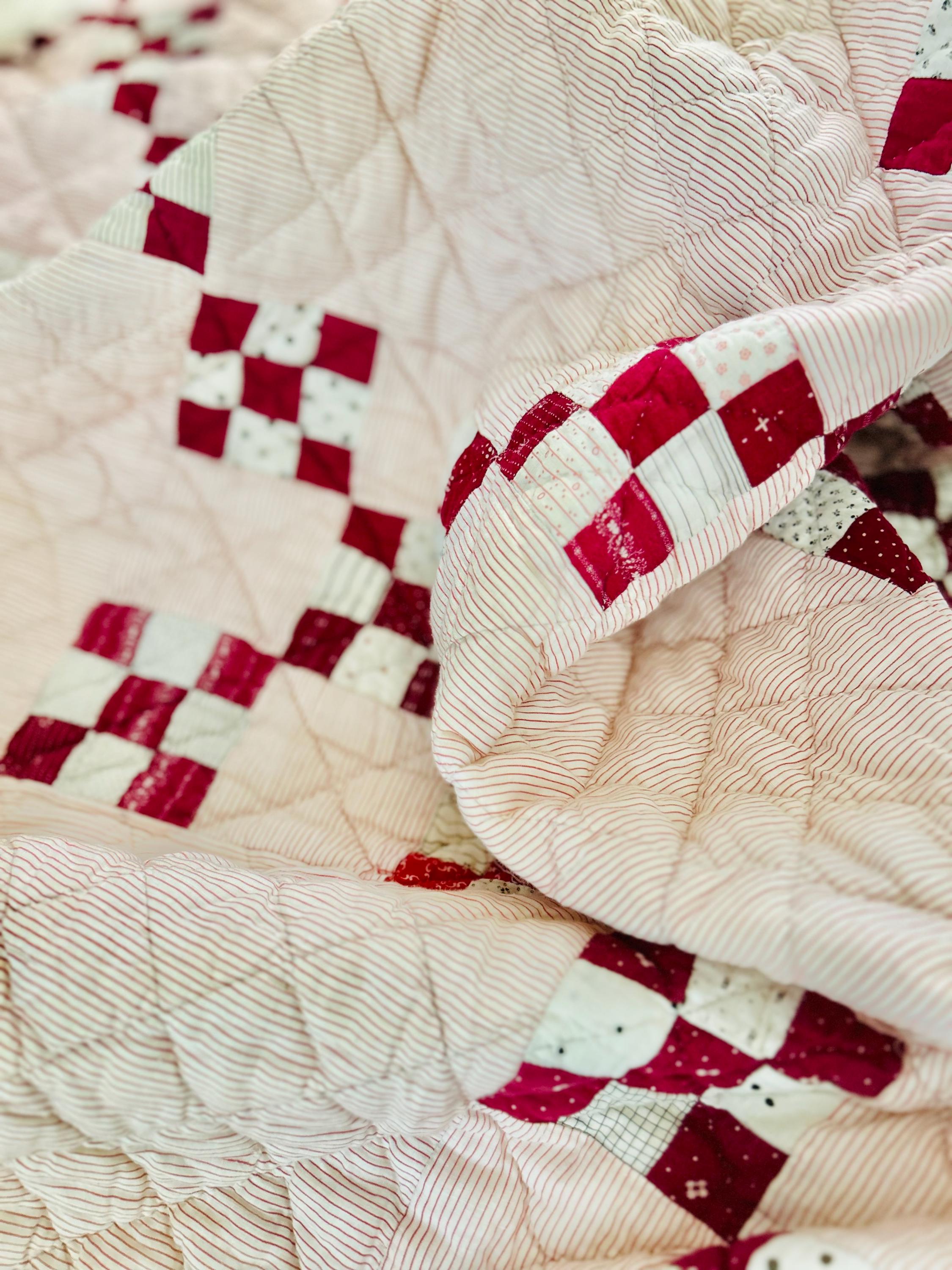 This sweet Double Nine-Patch Quilt is circa 1930-1940s and nine-patches are made with patchwork squares just 1-inch square. It is entirely hand-quilted in diagonals and diamonds. The patchwork sawtooth border goes around all four sides.