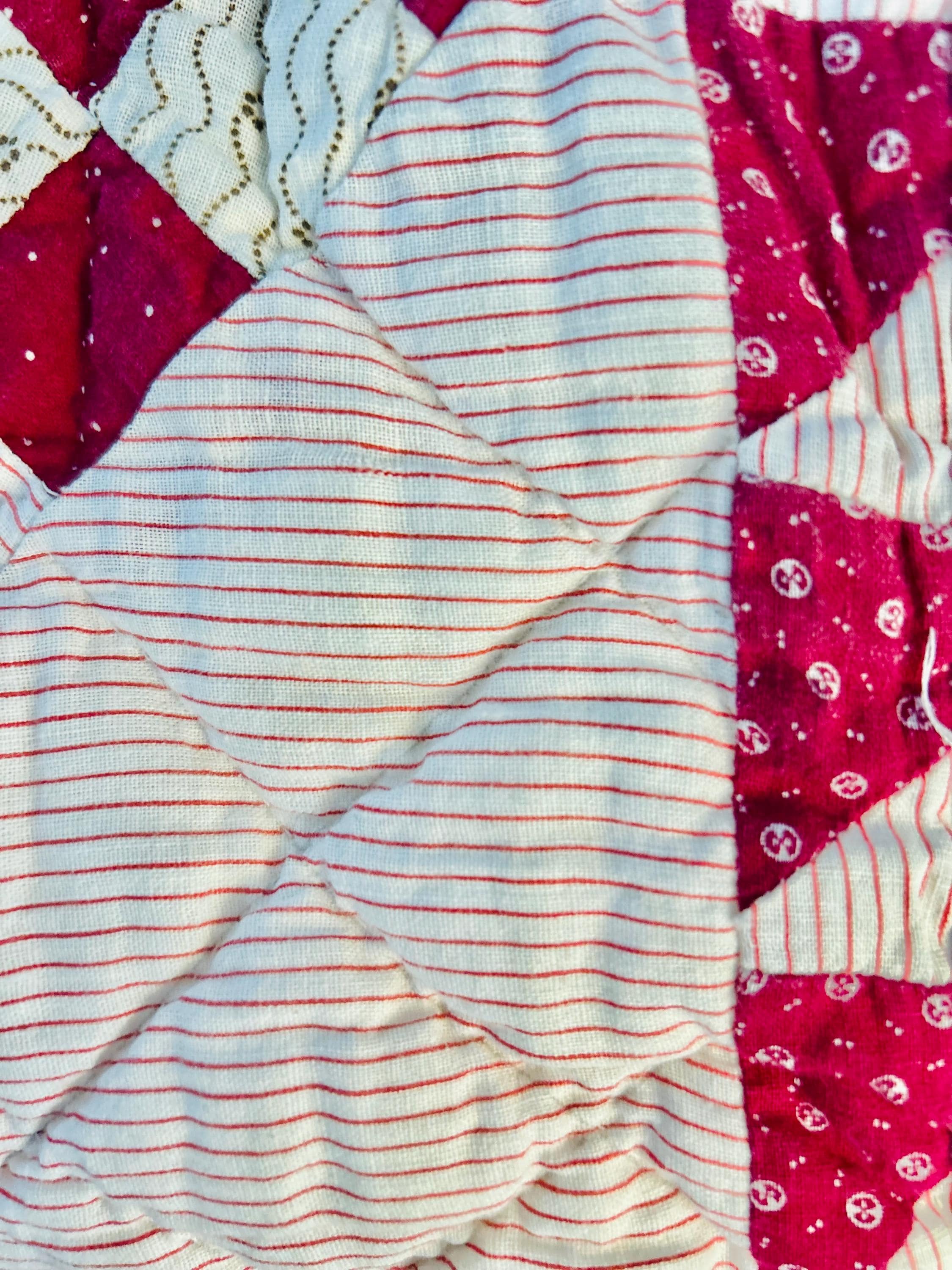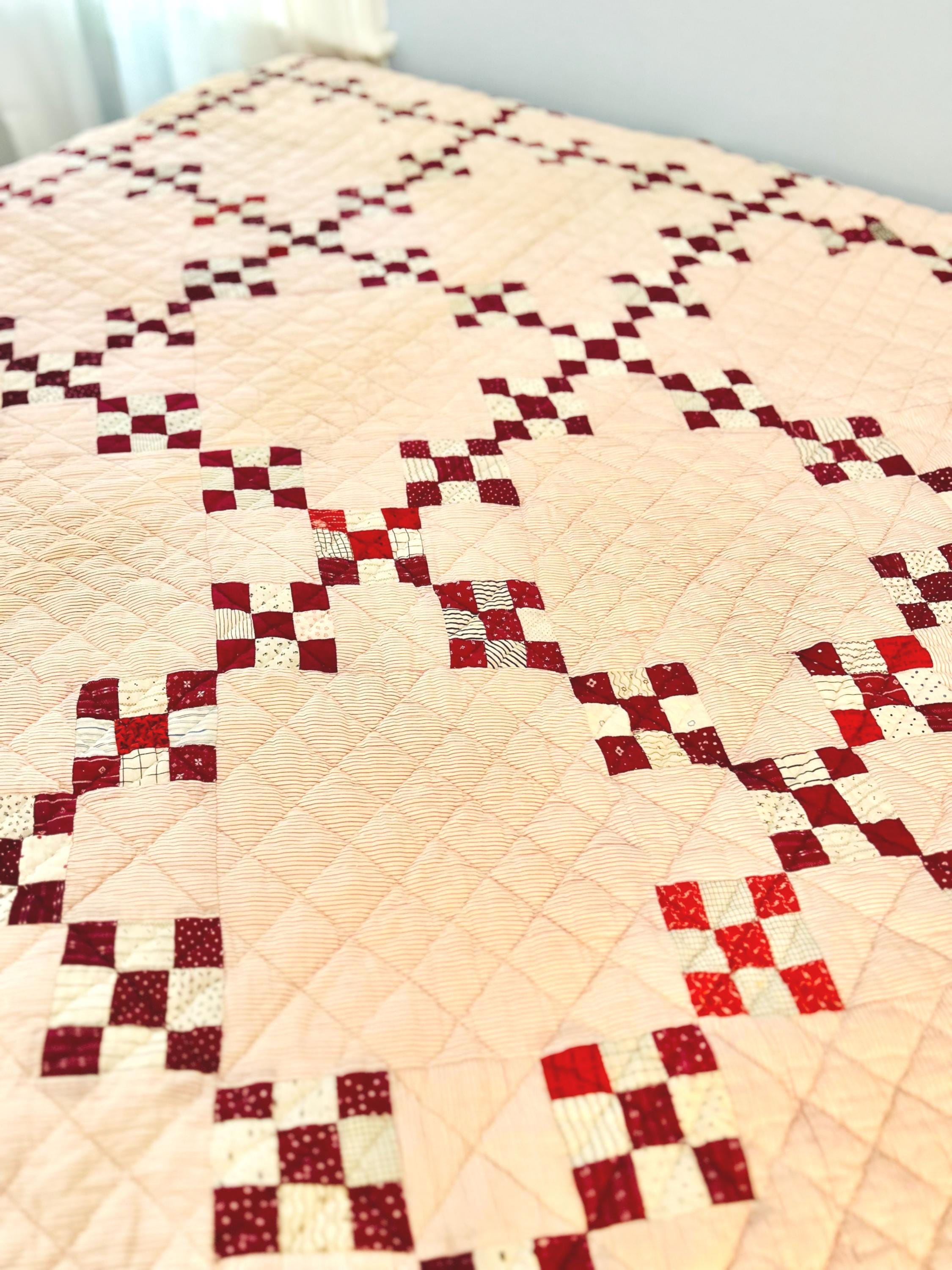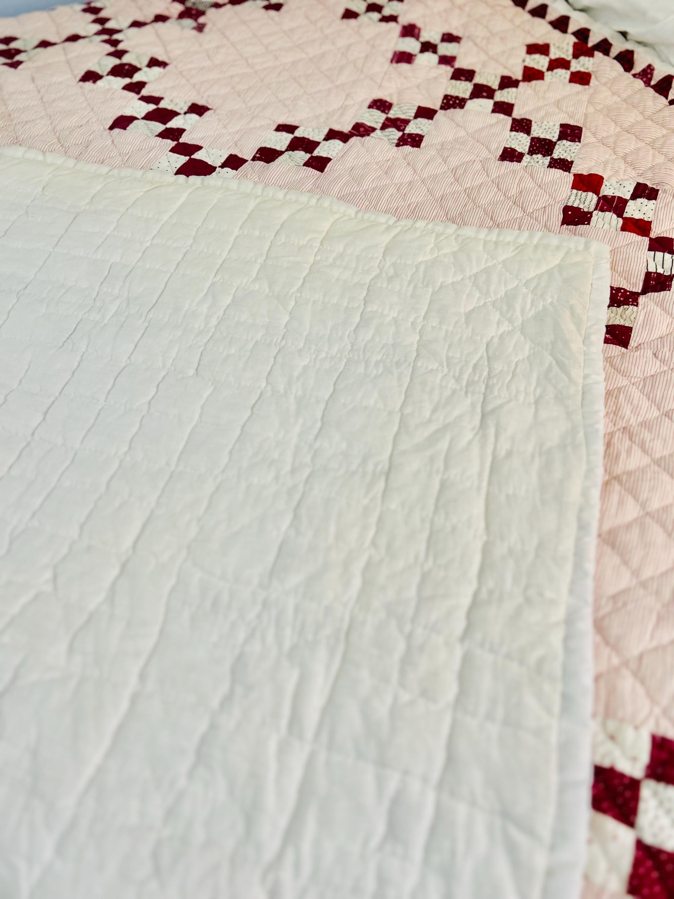 This lovely quilt has been soaked, hand-washed and line-dried. It is clean and soft and measures 63 inches by 69 inches. From a smoke-free, pet-free home. Shown on a queen-size bed.