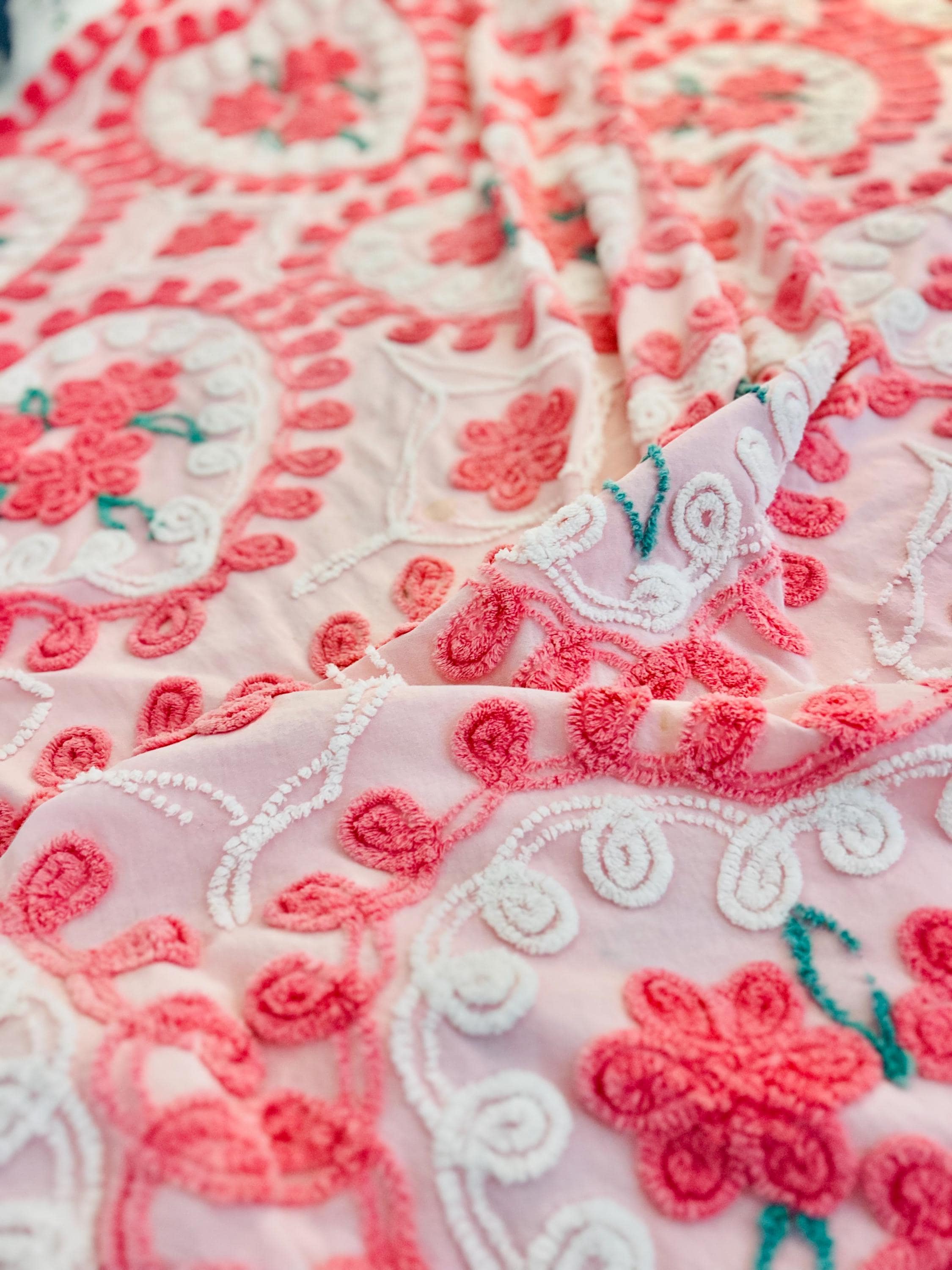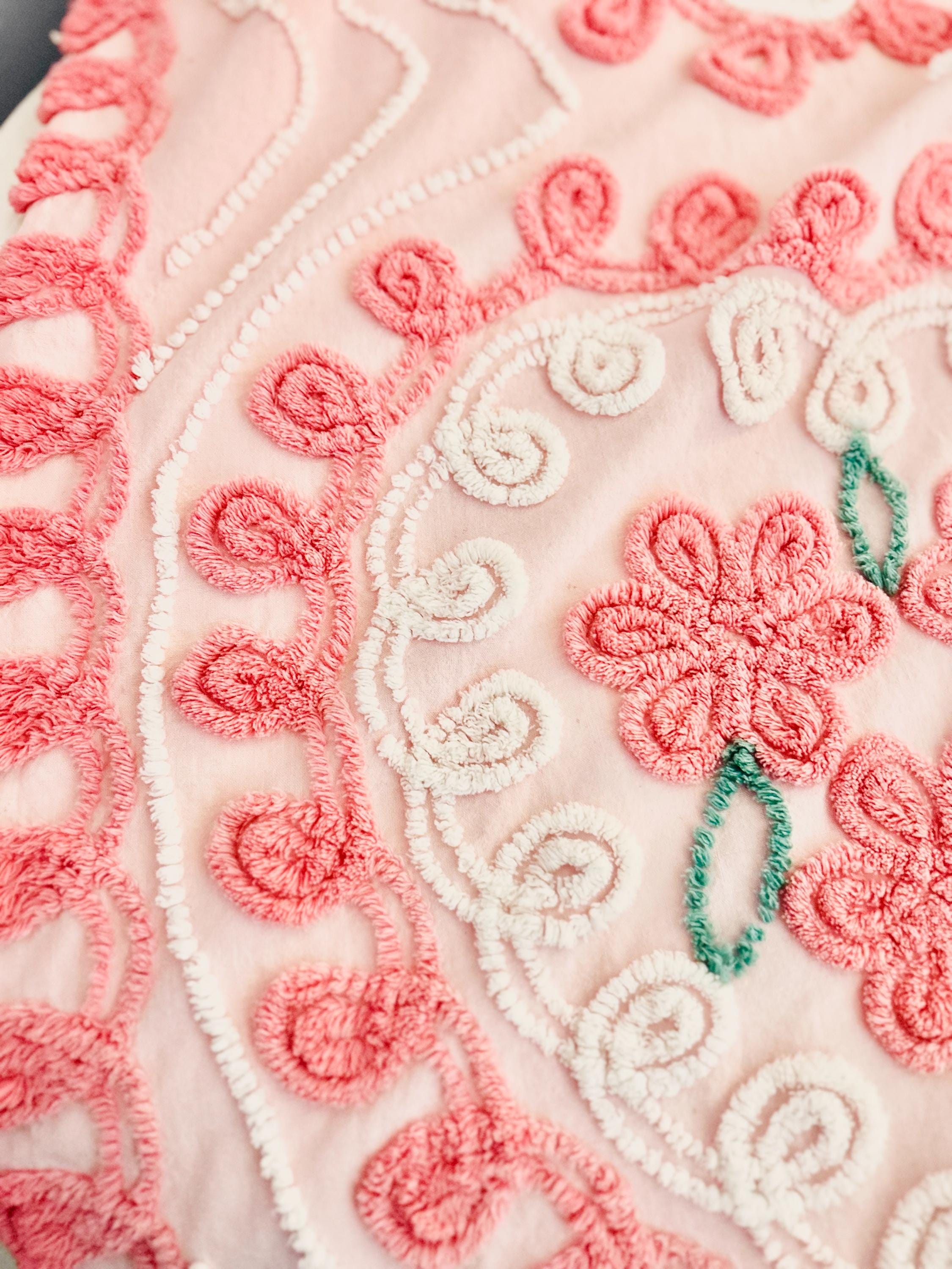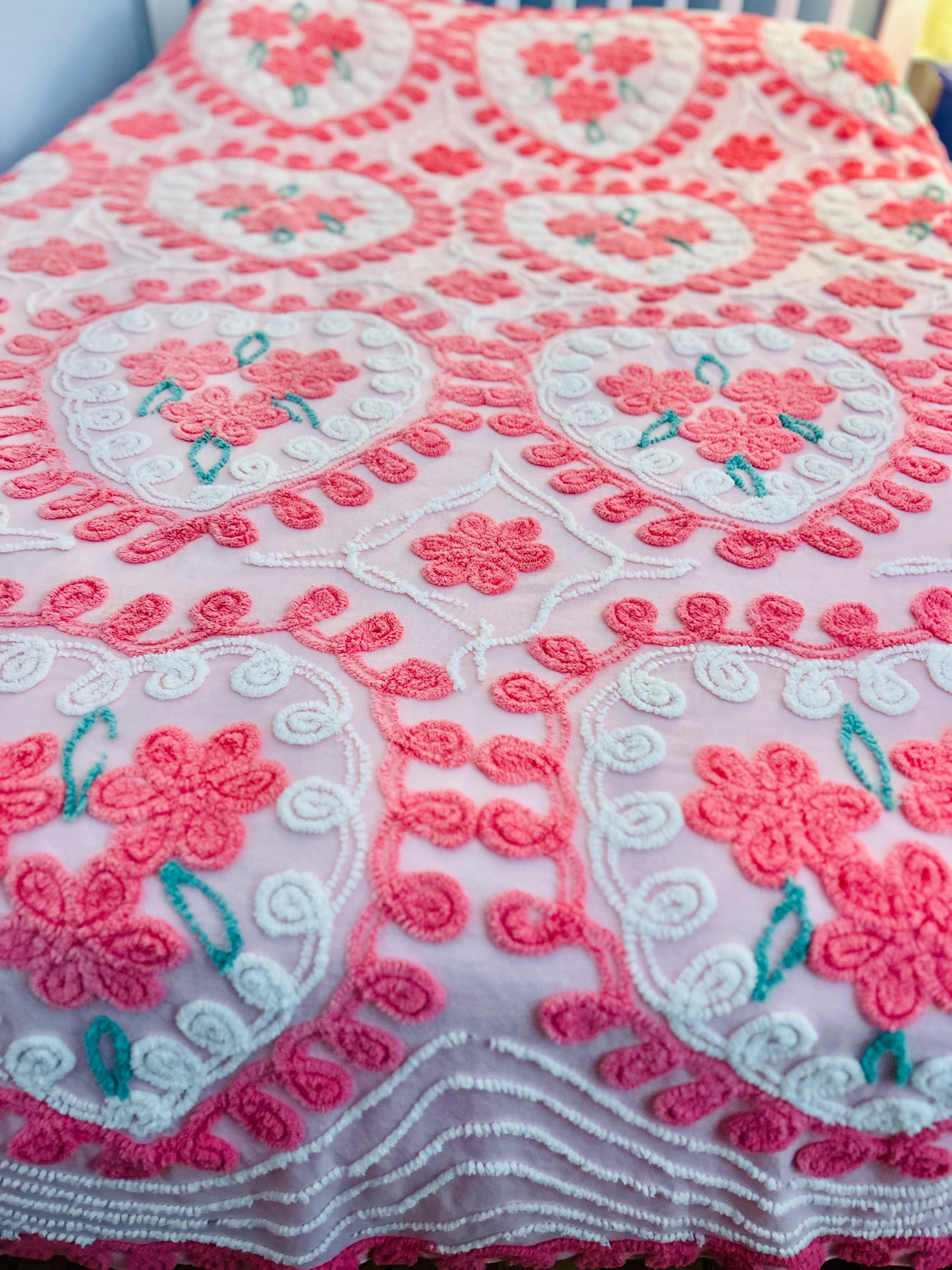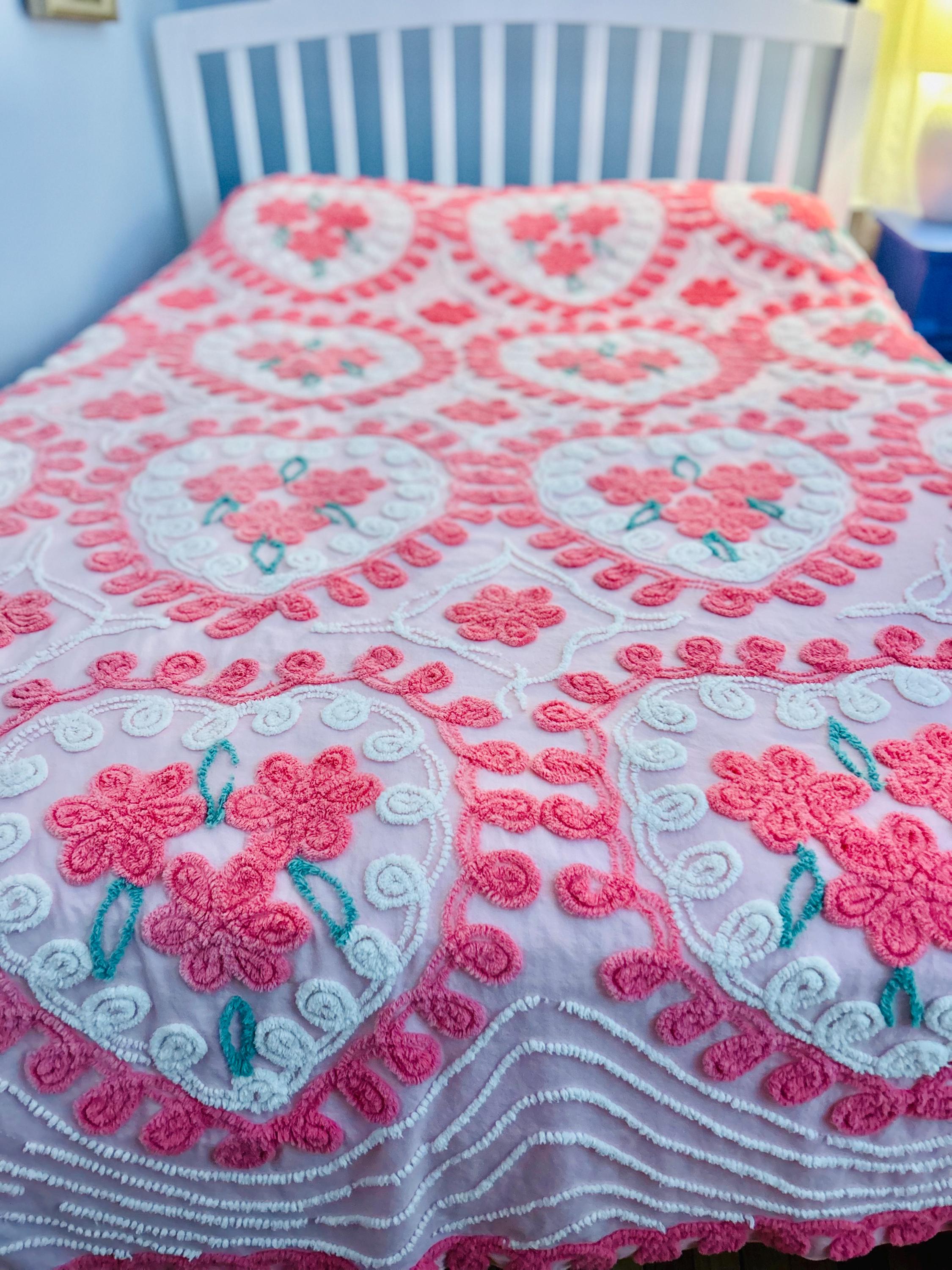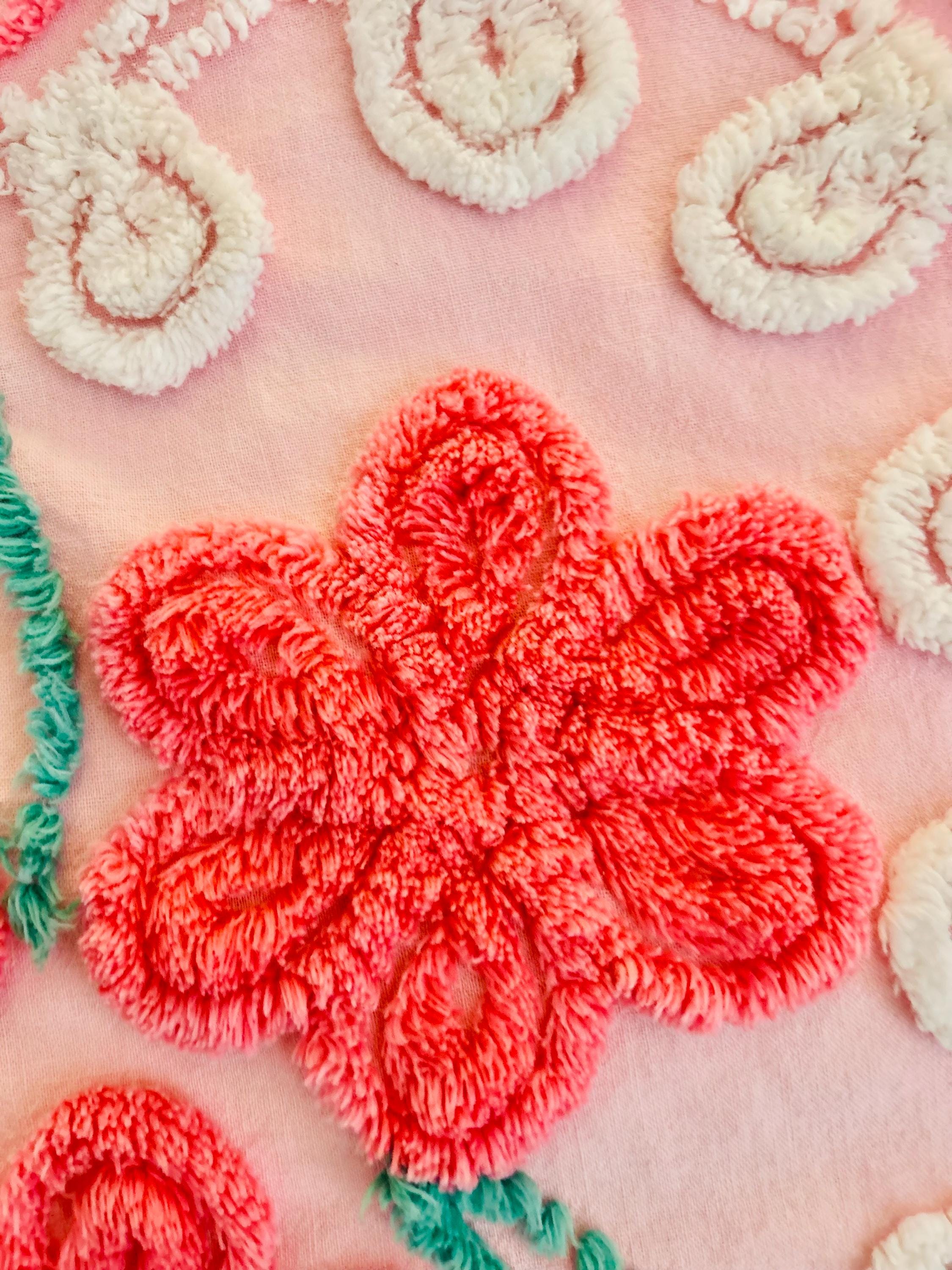This Hearts and Flowers Mid-Century Modern Chenille bedspread is circa 1950s-1960s and is bright and fluffy with a pink background and bright pink flowers with white and pink heart-shaped loops around them.