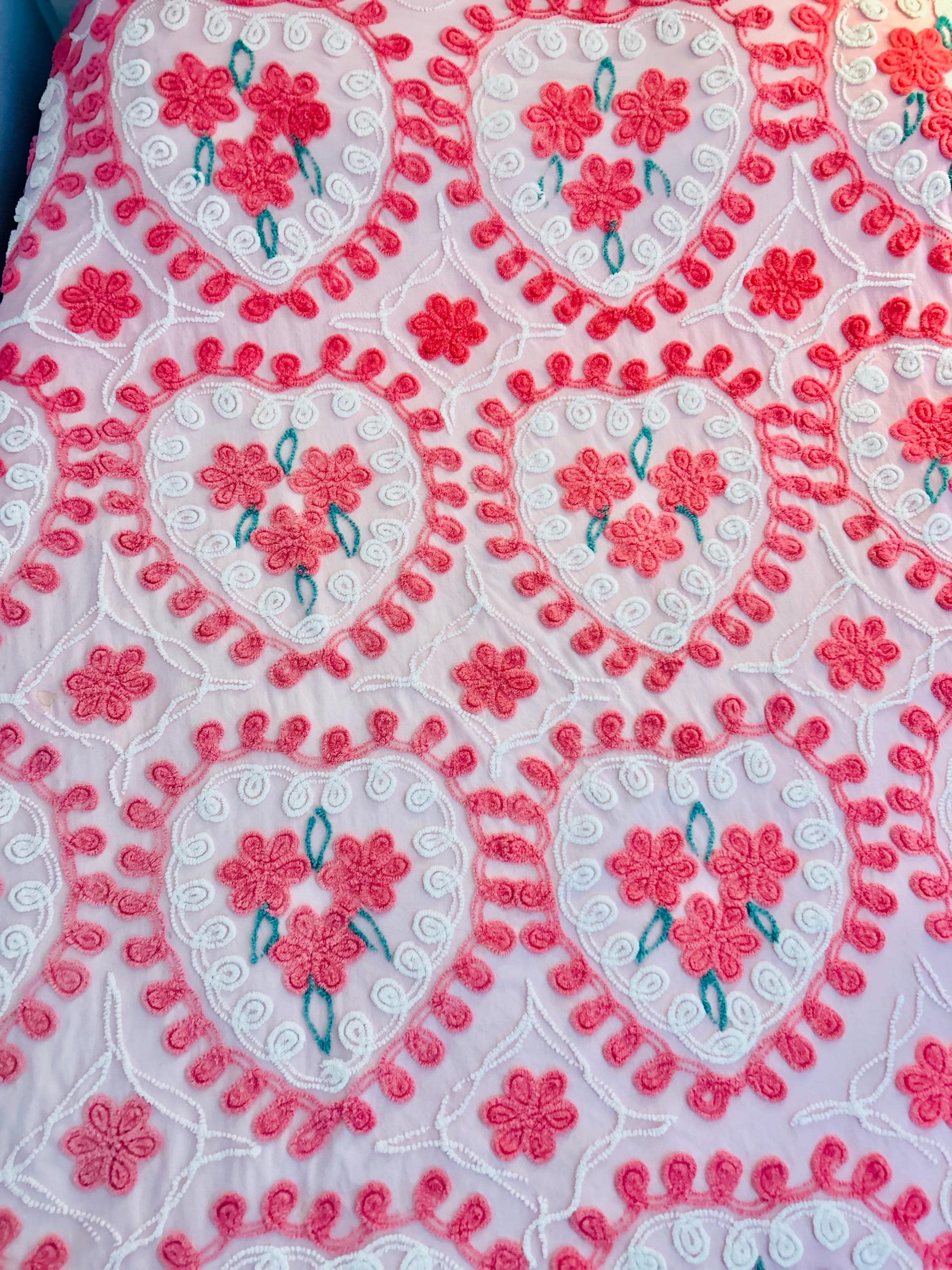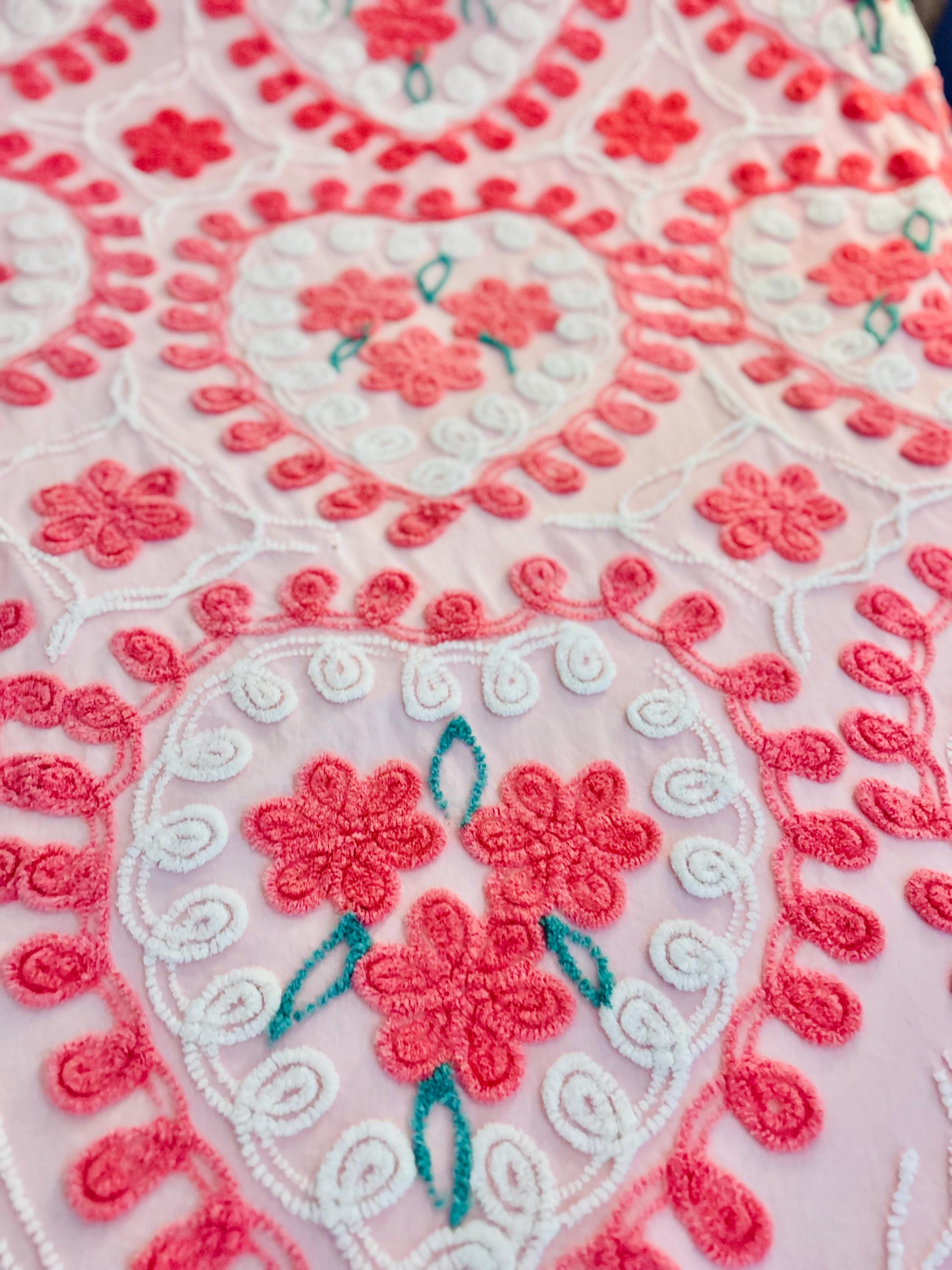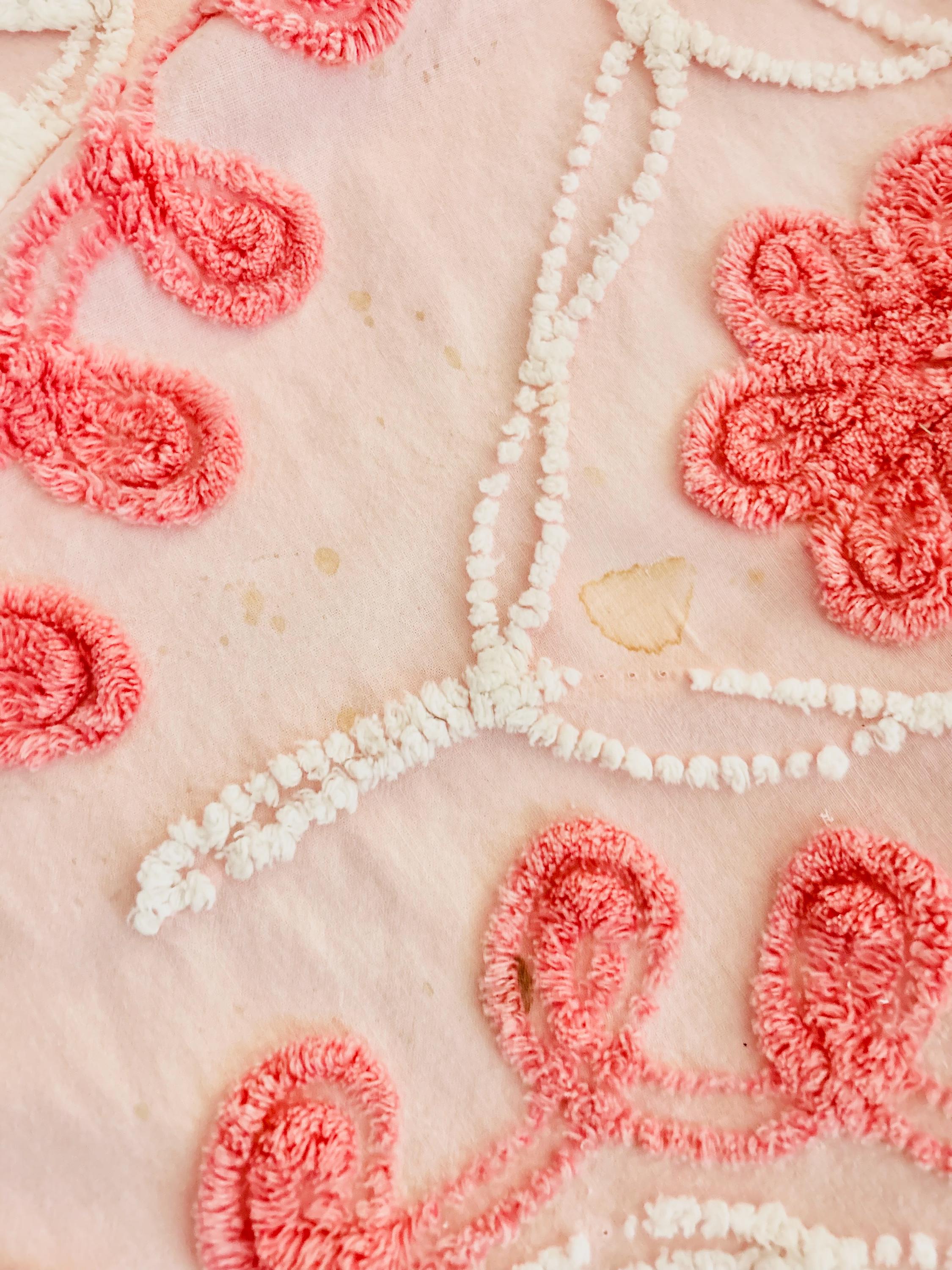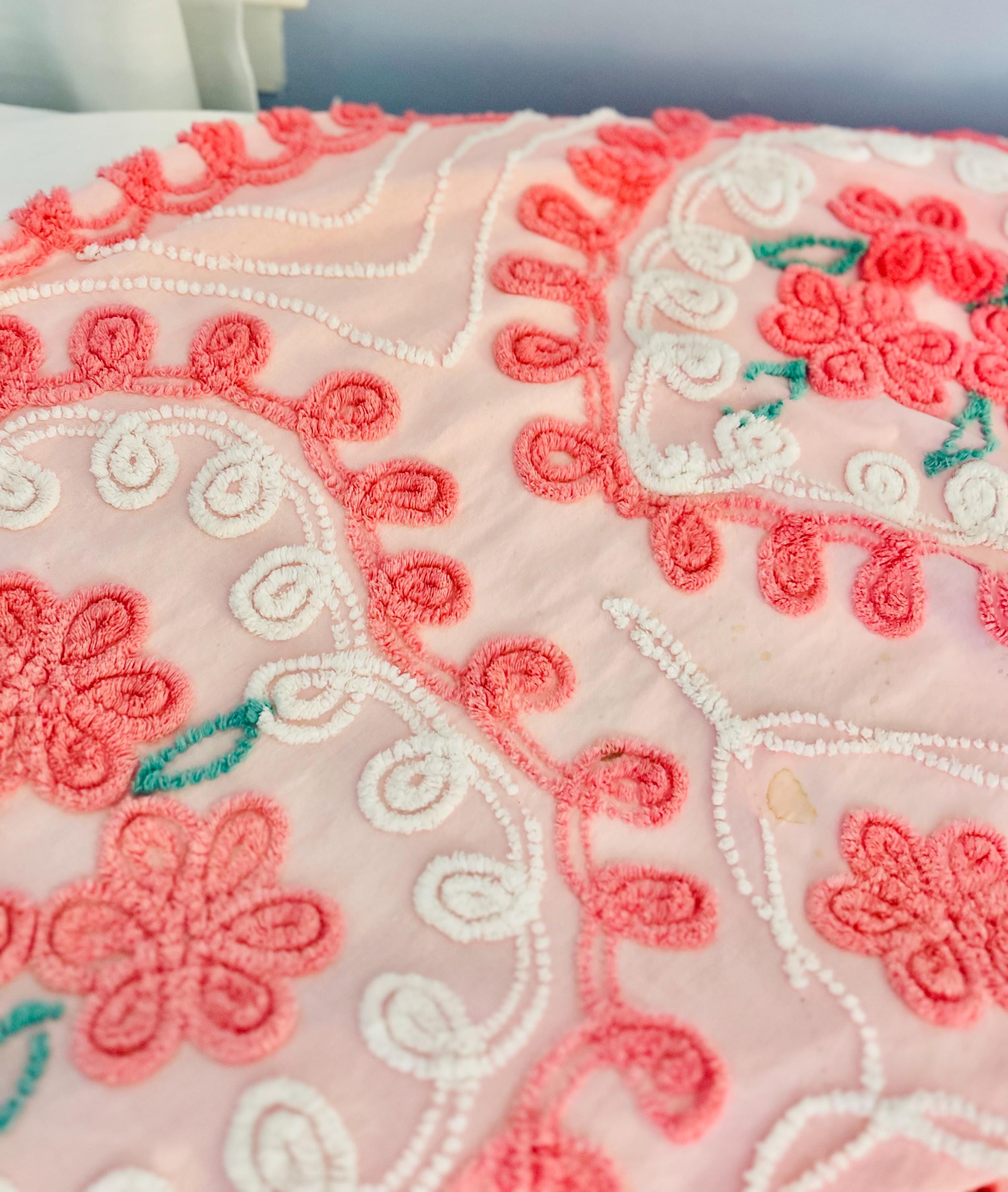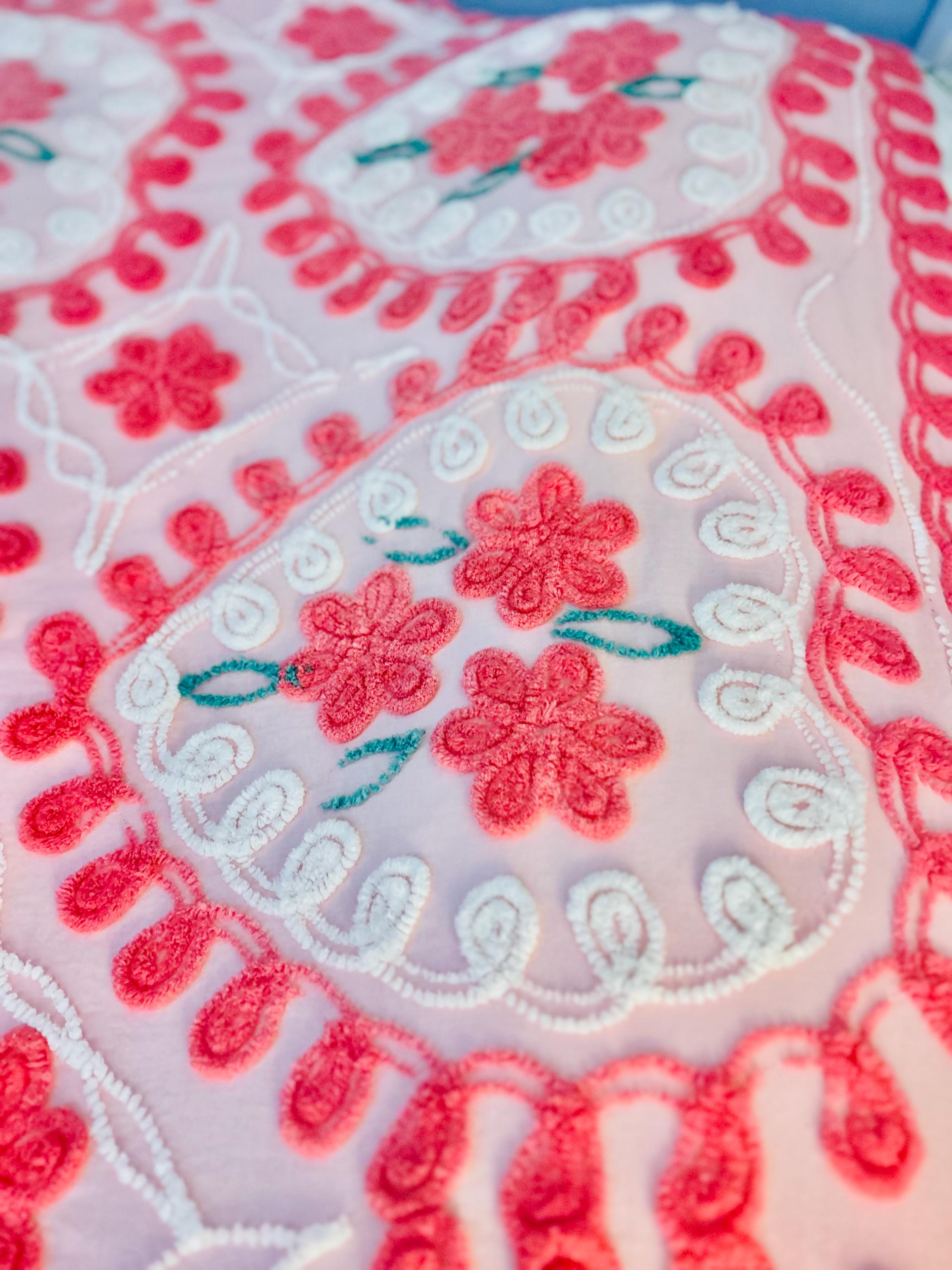 This Hearts and Flowers Mid-Century Modern Chenille bedspread is circa 1950s-1960s and is bright and fluffy with a pink background and bright pink flowers with white and pink heart-shaped loops around them.