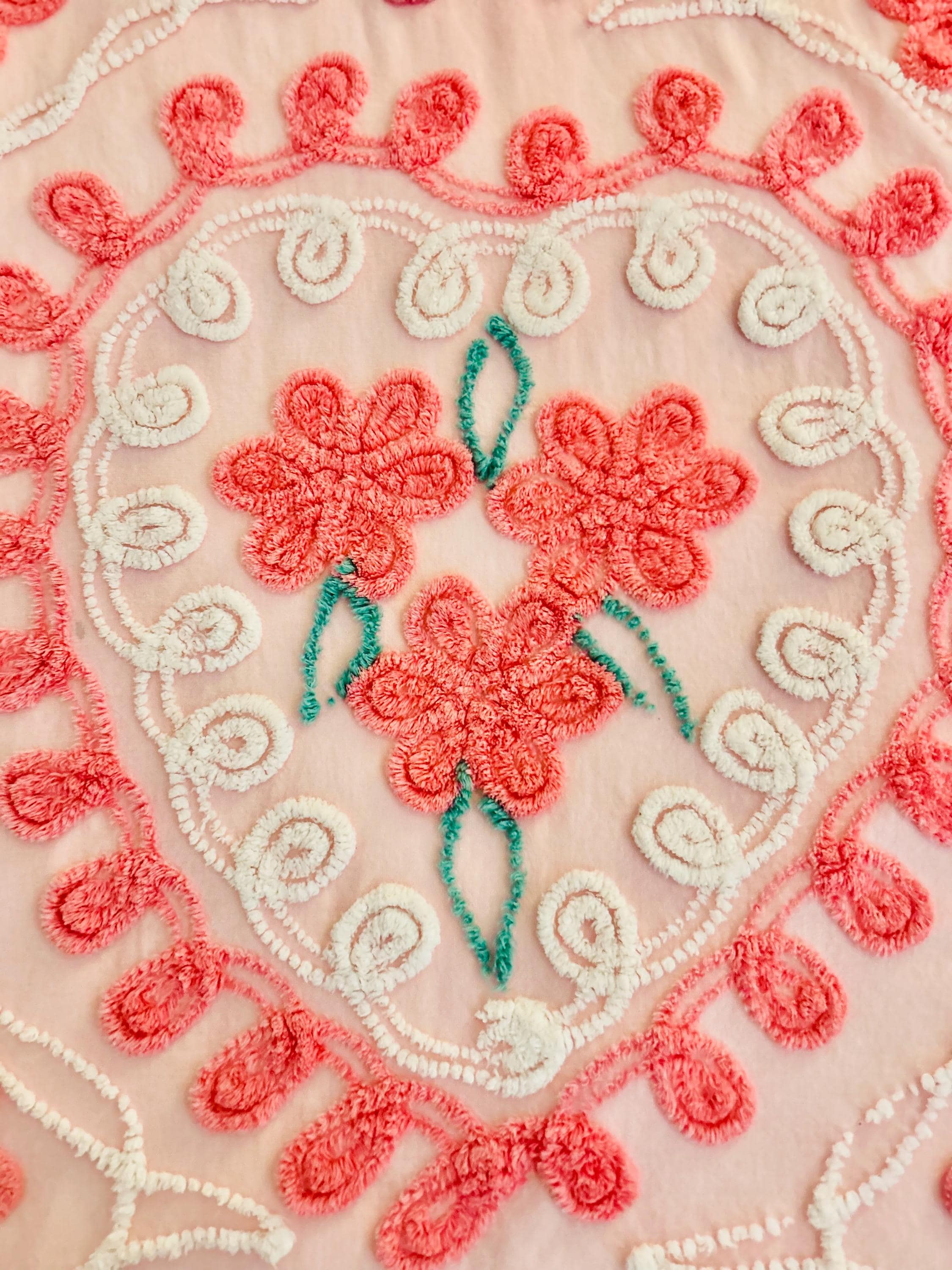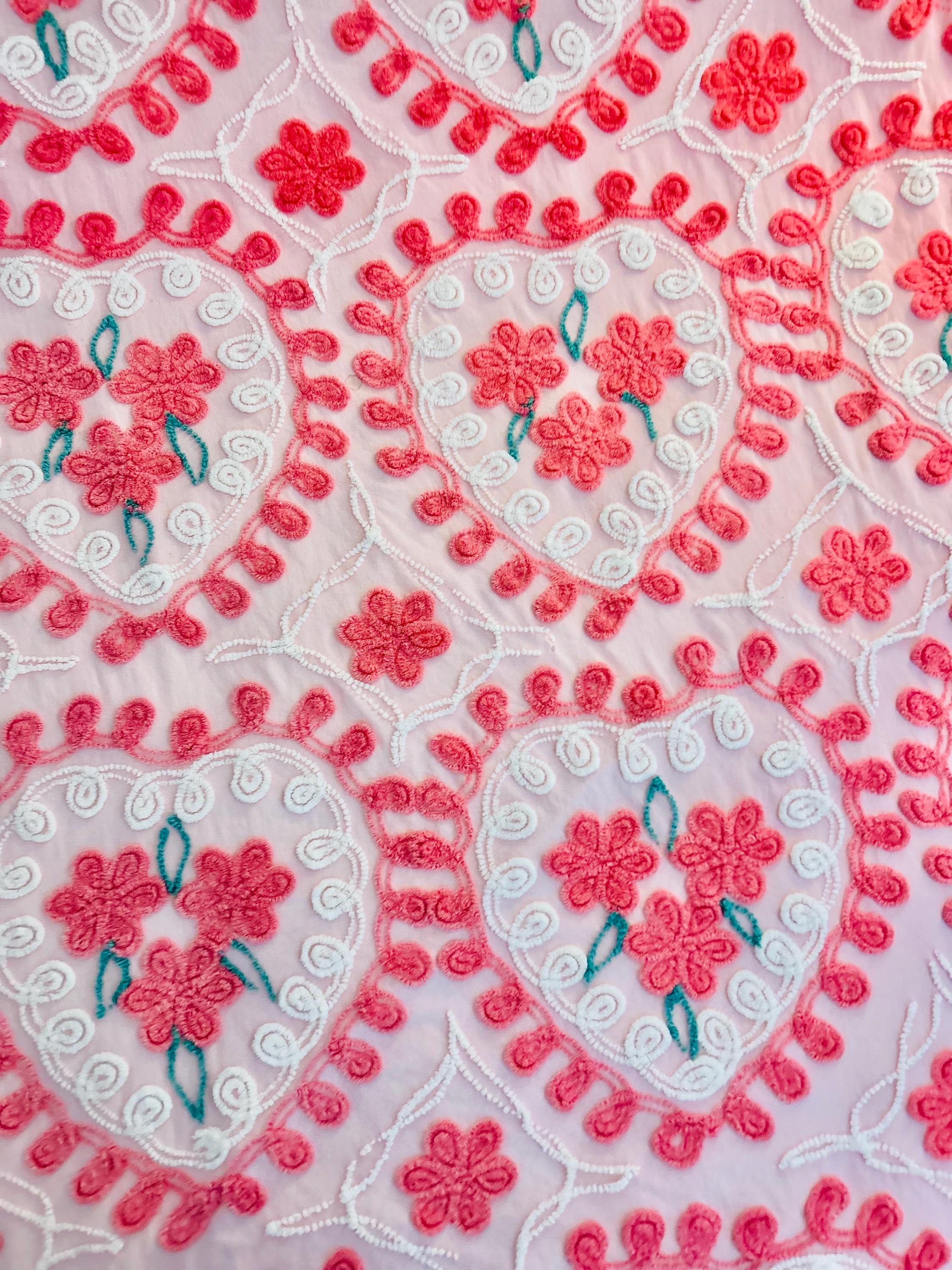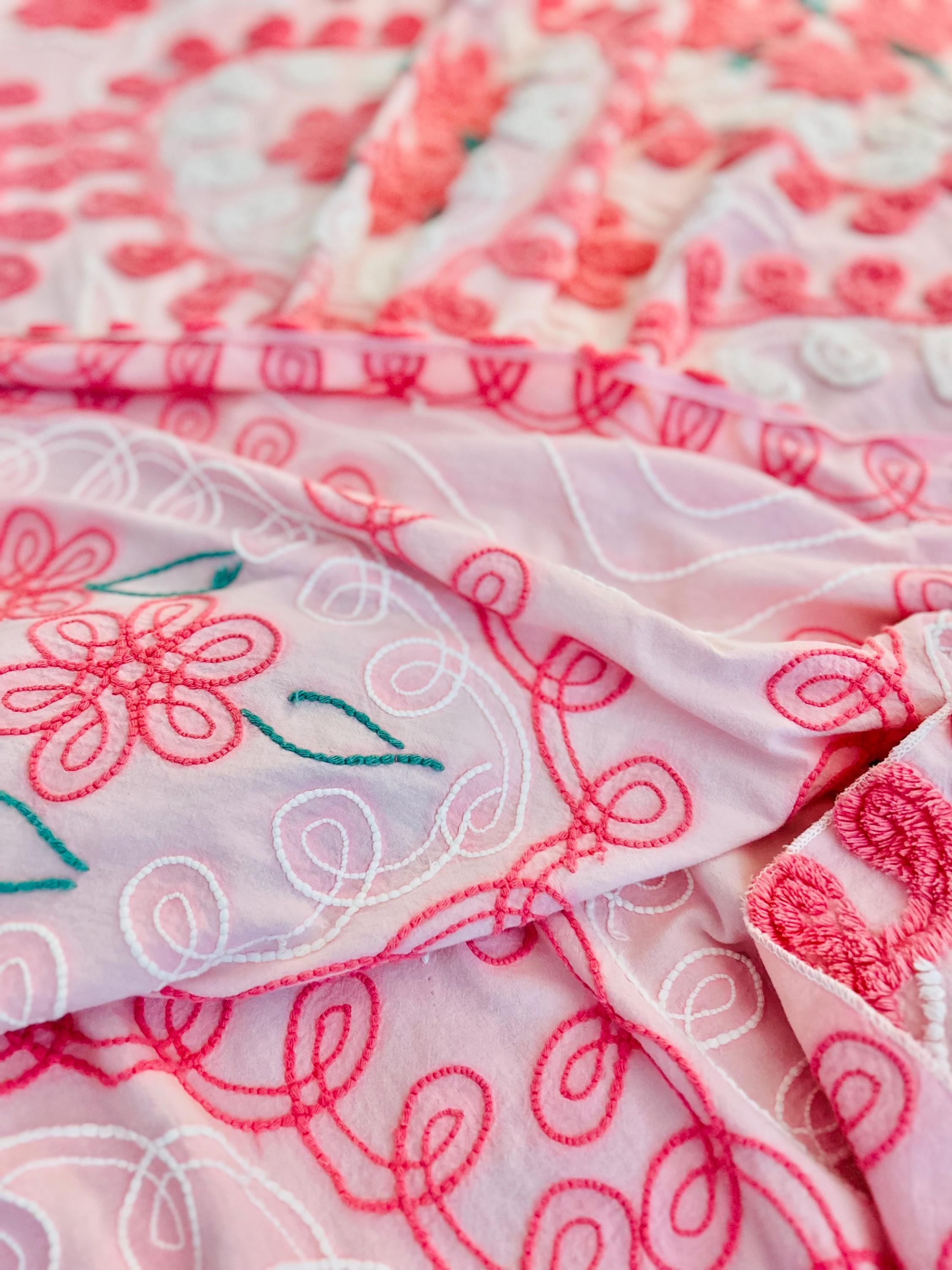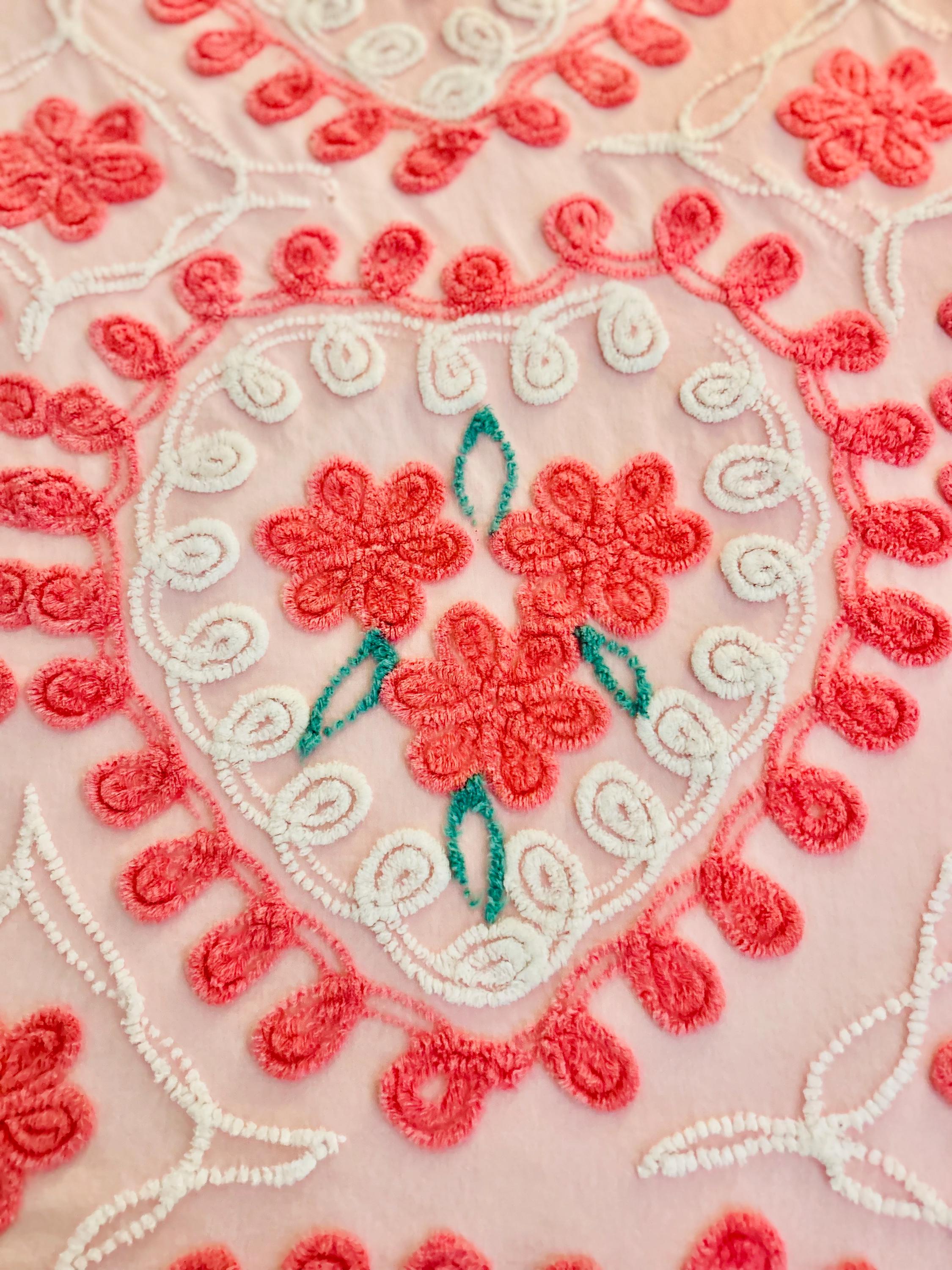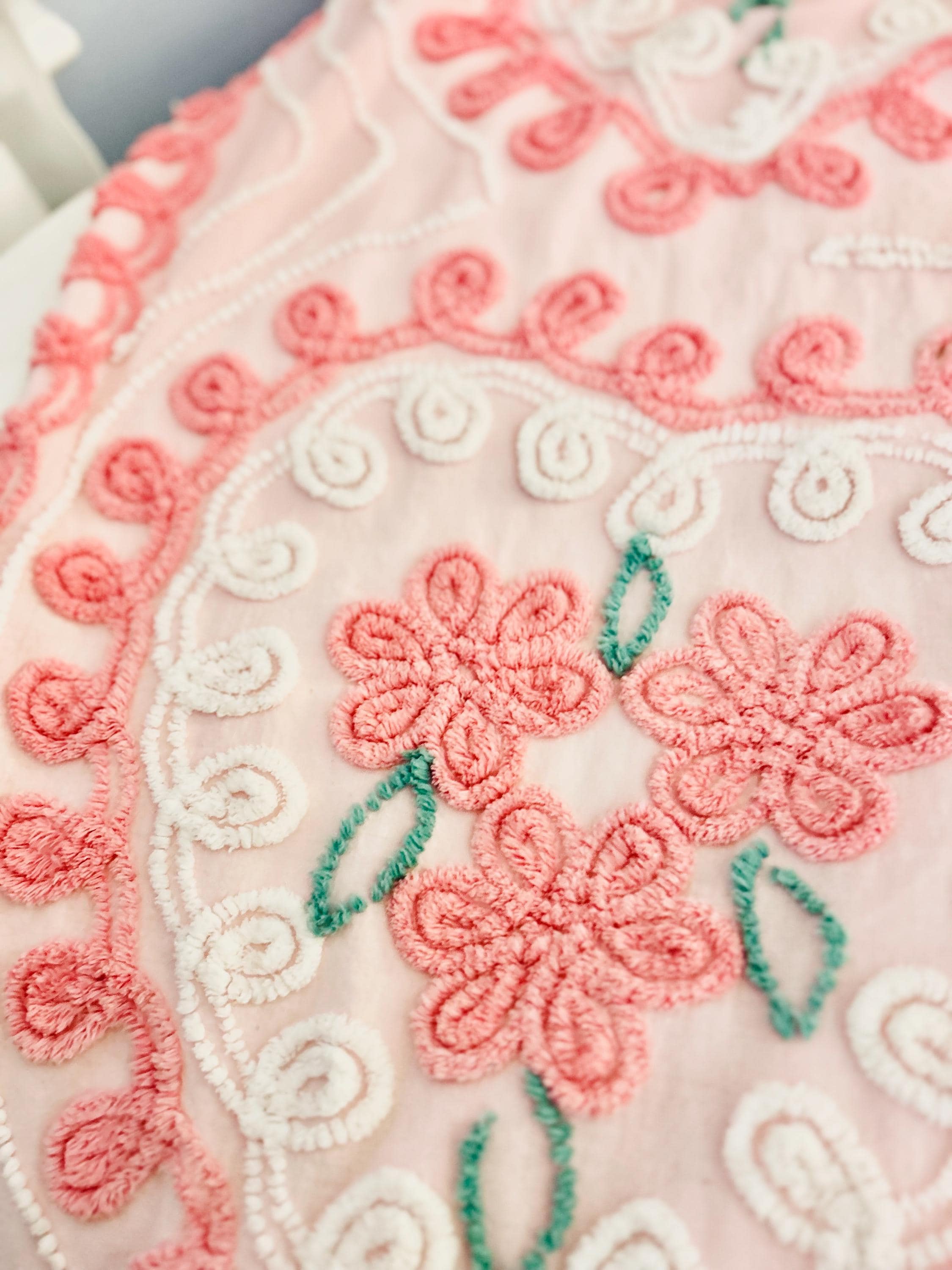 This Hearts and Flowers Mid-Century Modern Chenille bedspread is circa 1950s-1960s and is bright and fluffy with a pink background and bright pink flowers with white and pink heart-shaped loops around them.