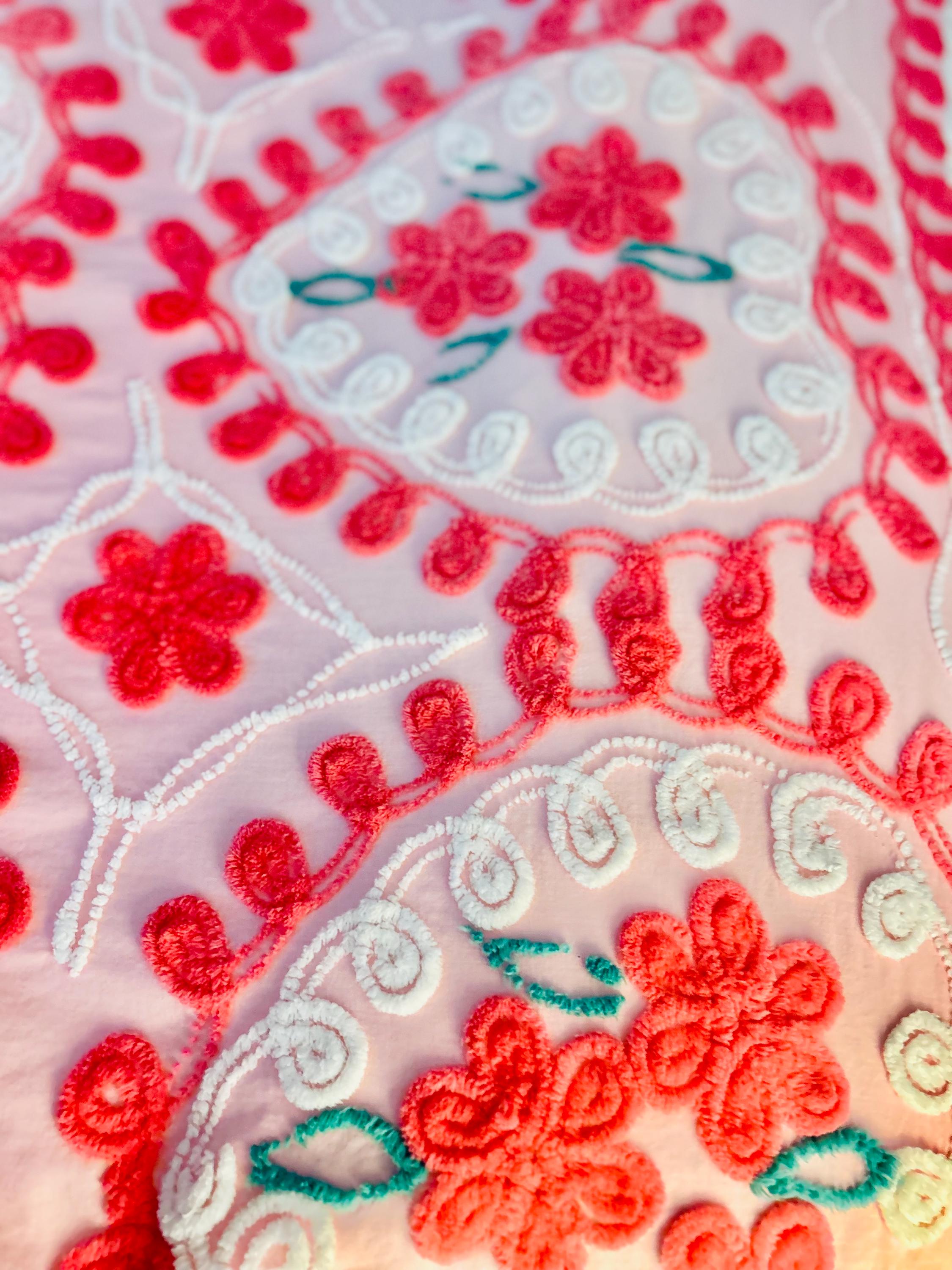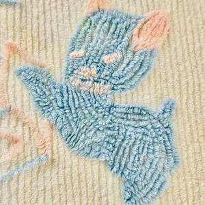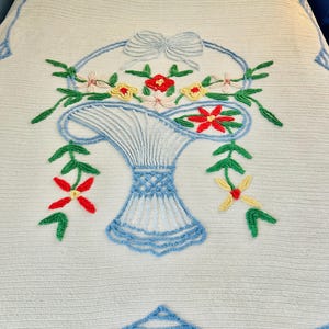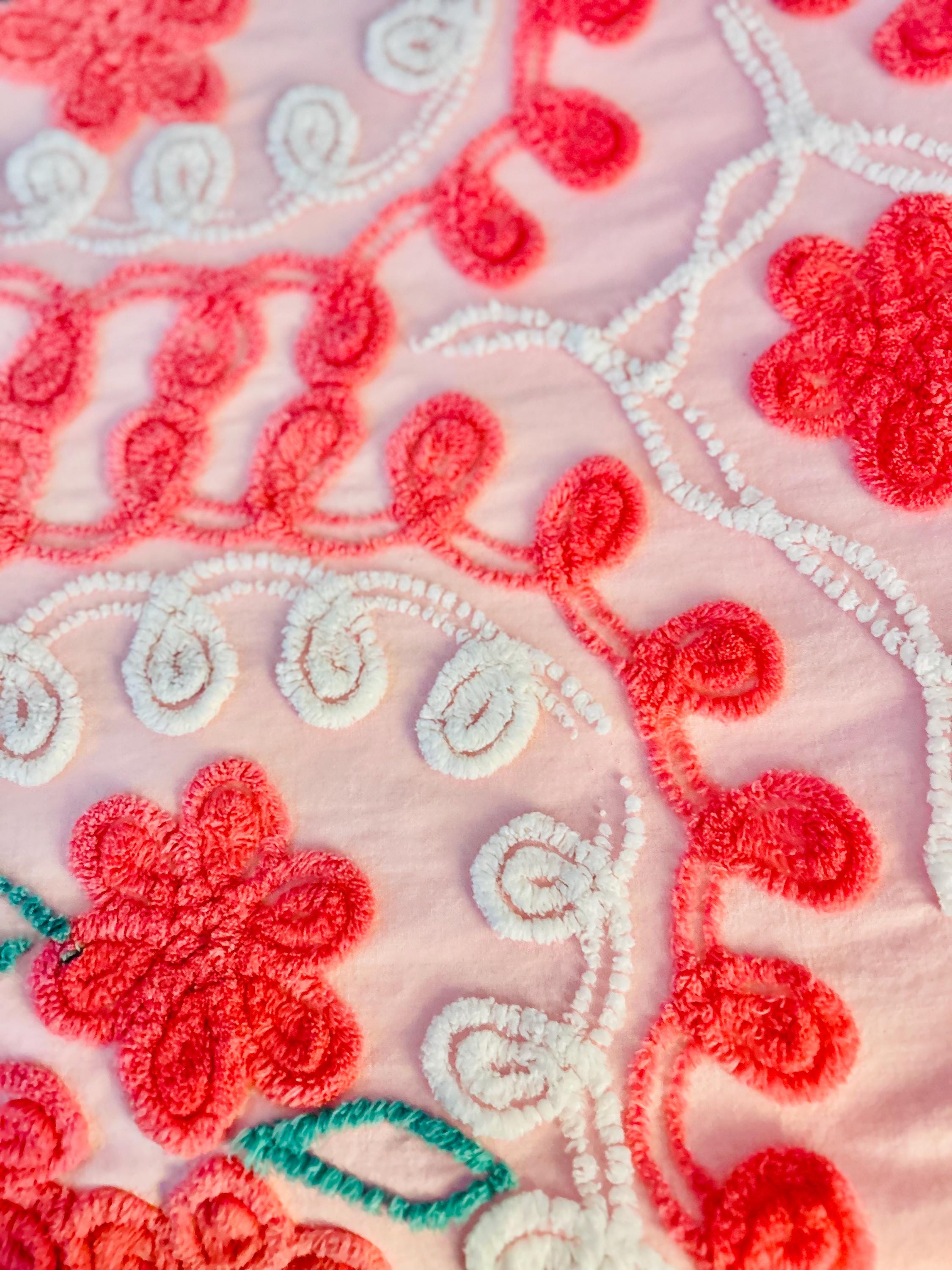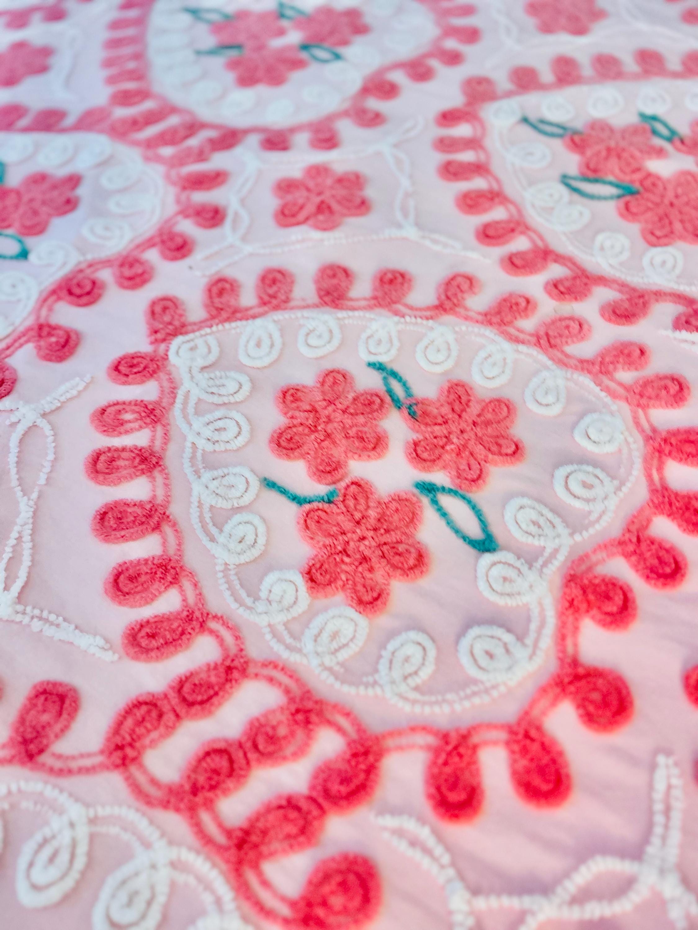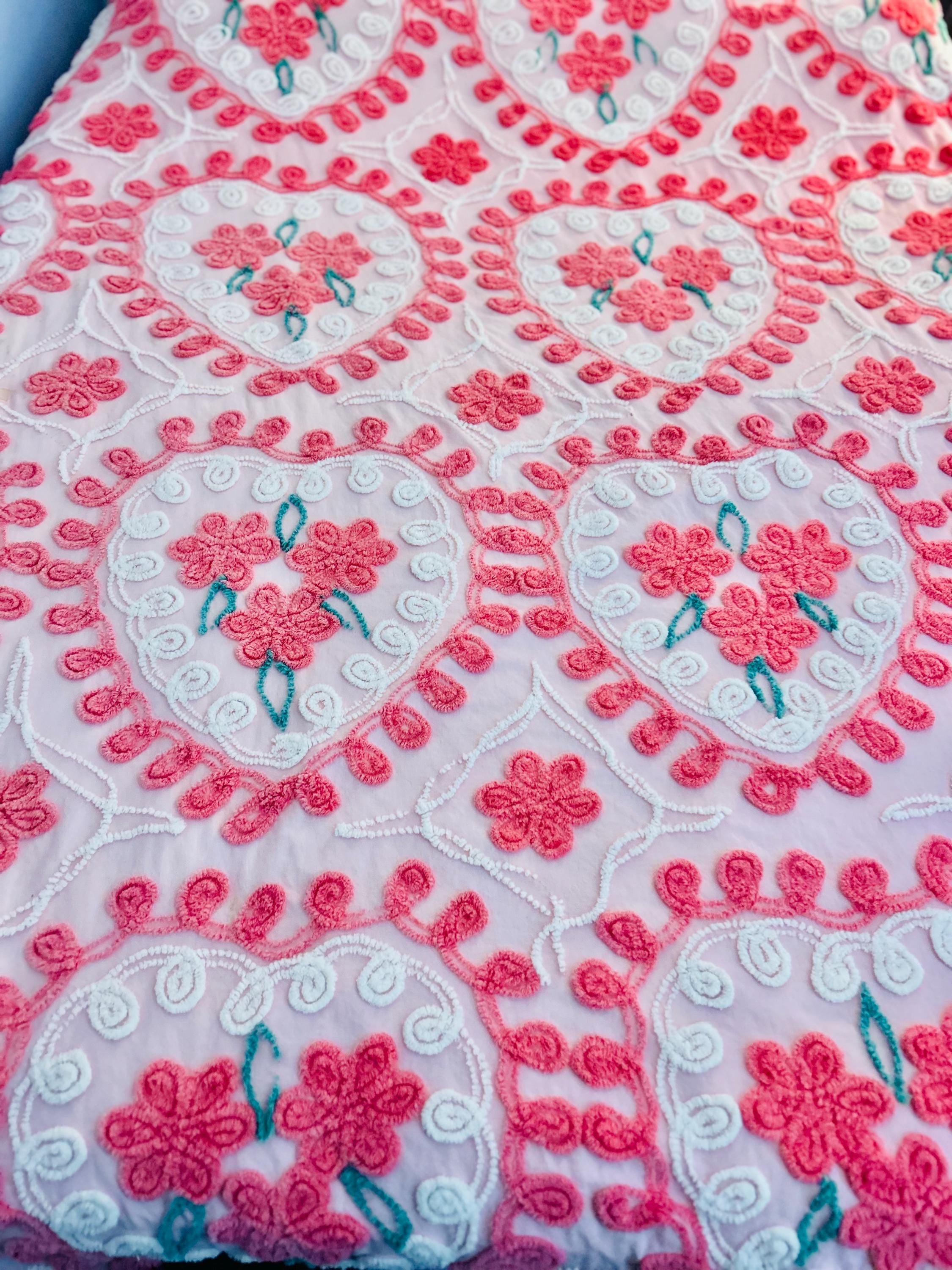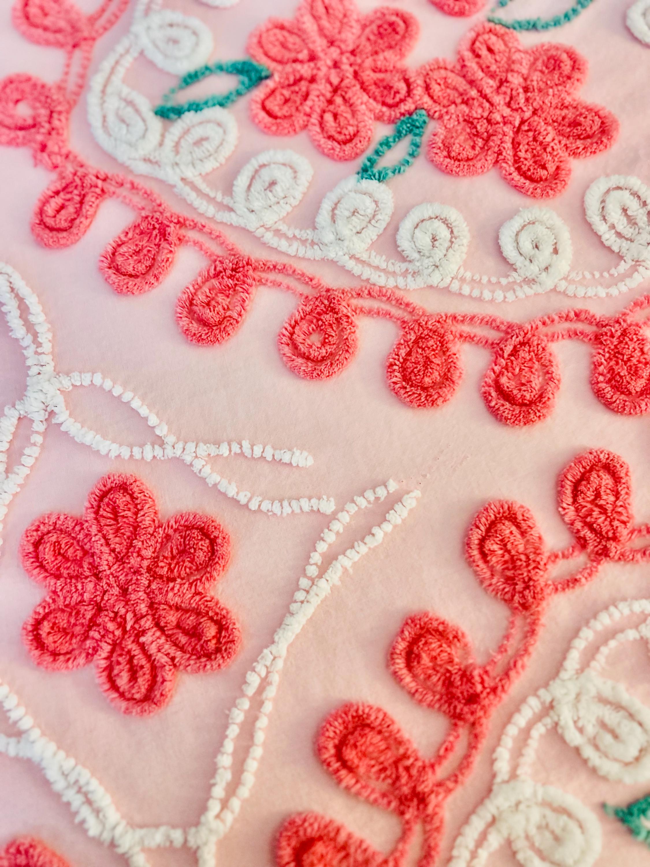 This Hearts and Flowers Mid-Century Modern Chenille bedspread is circa 1950s-1960s and is bright and fluffy with a pink background and bright pink flowers with white and pink heart-shaped loops around them.