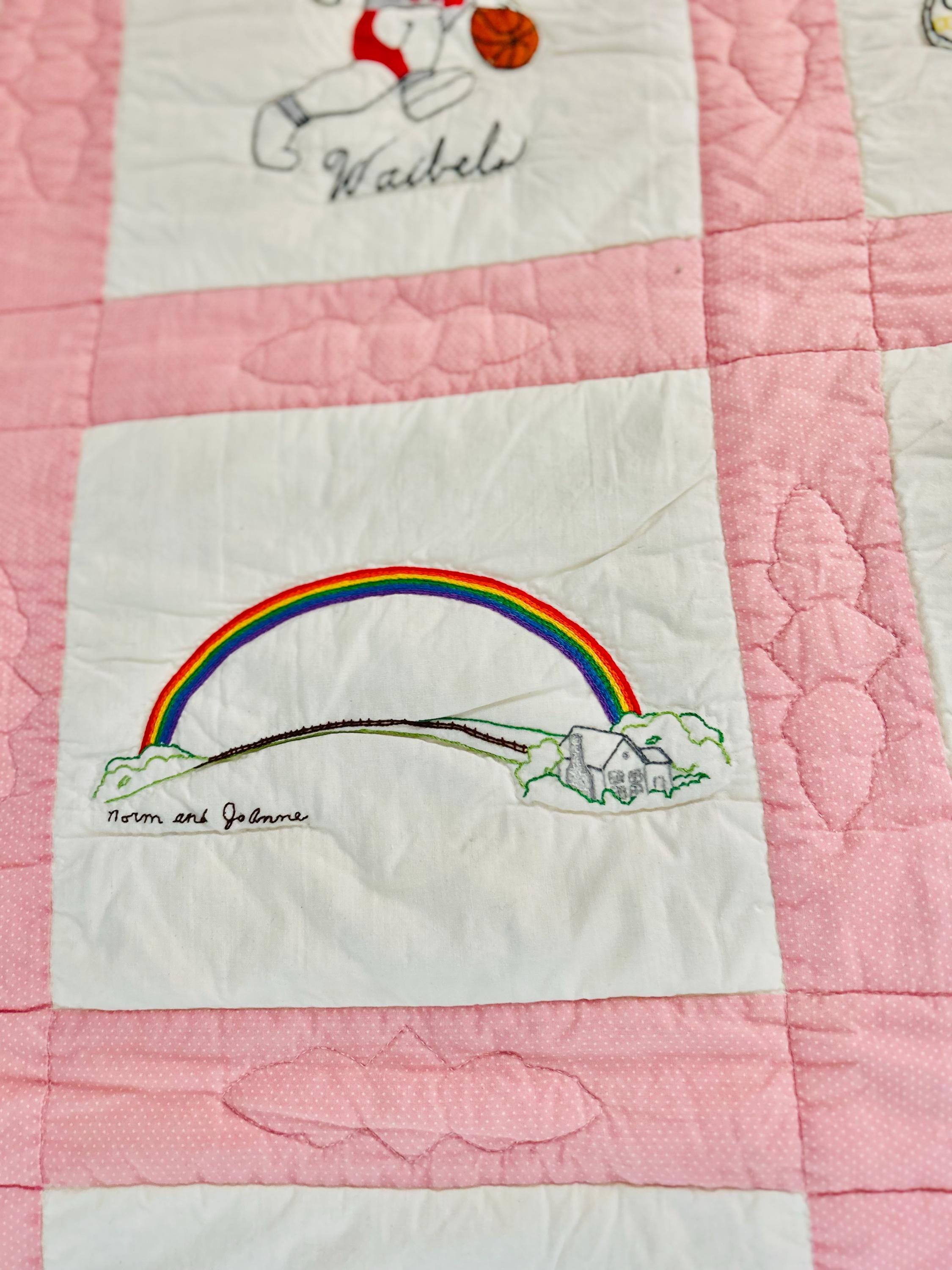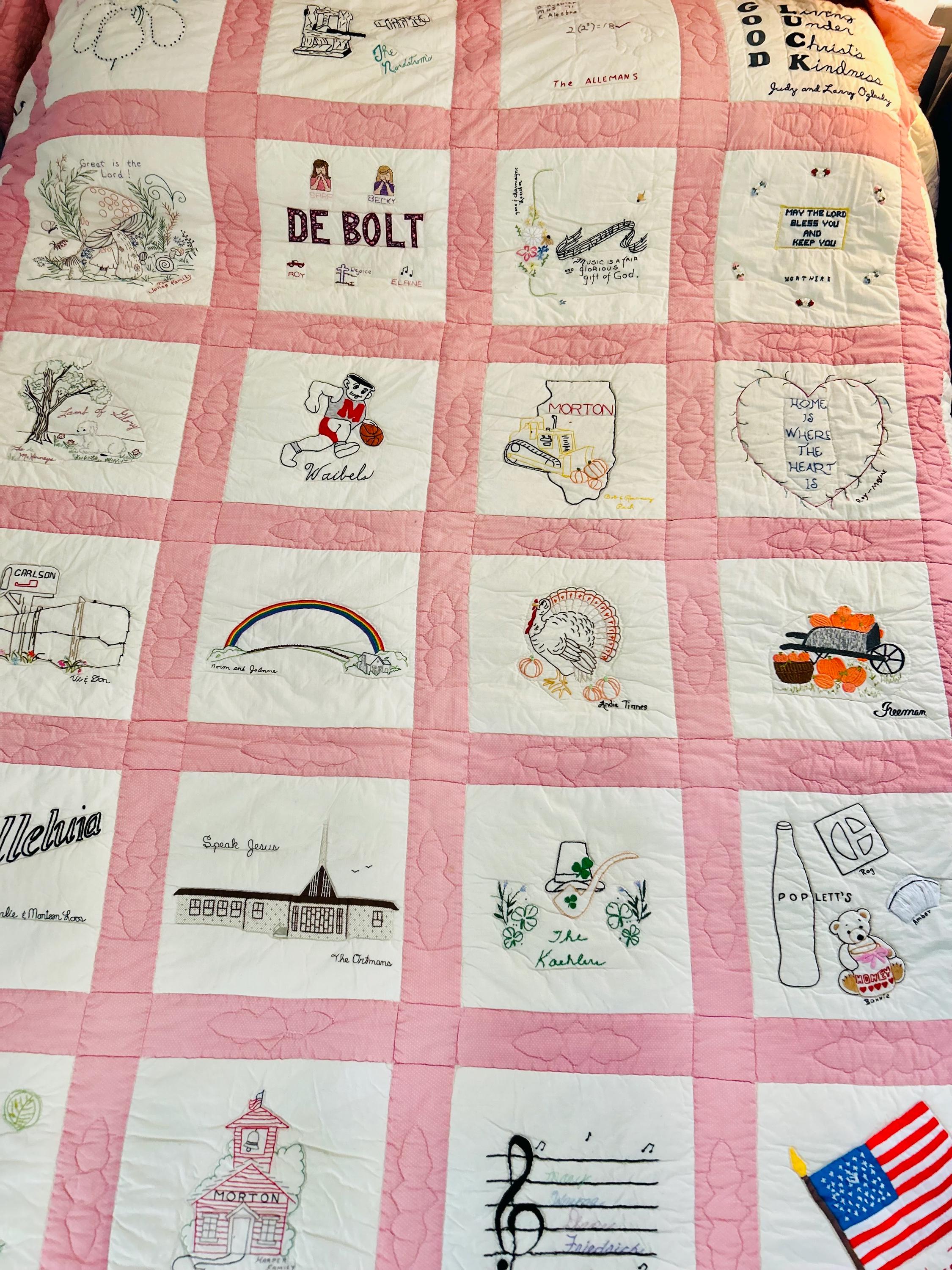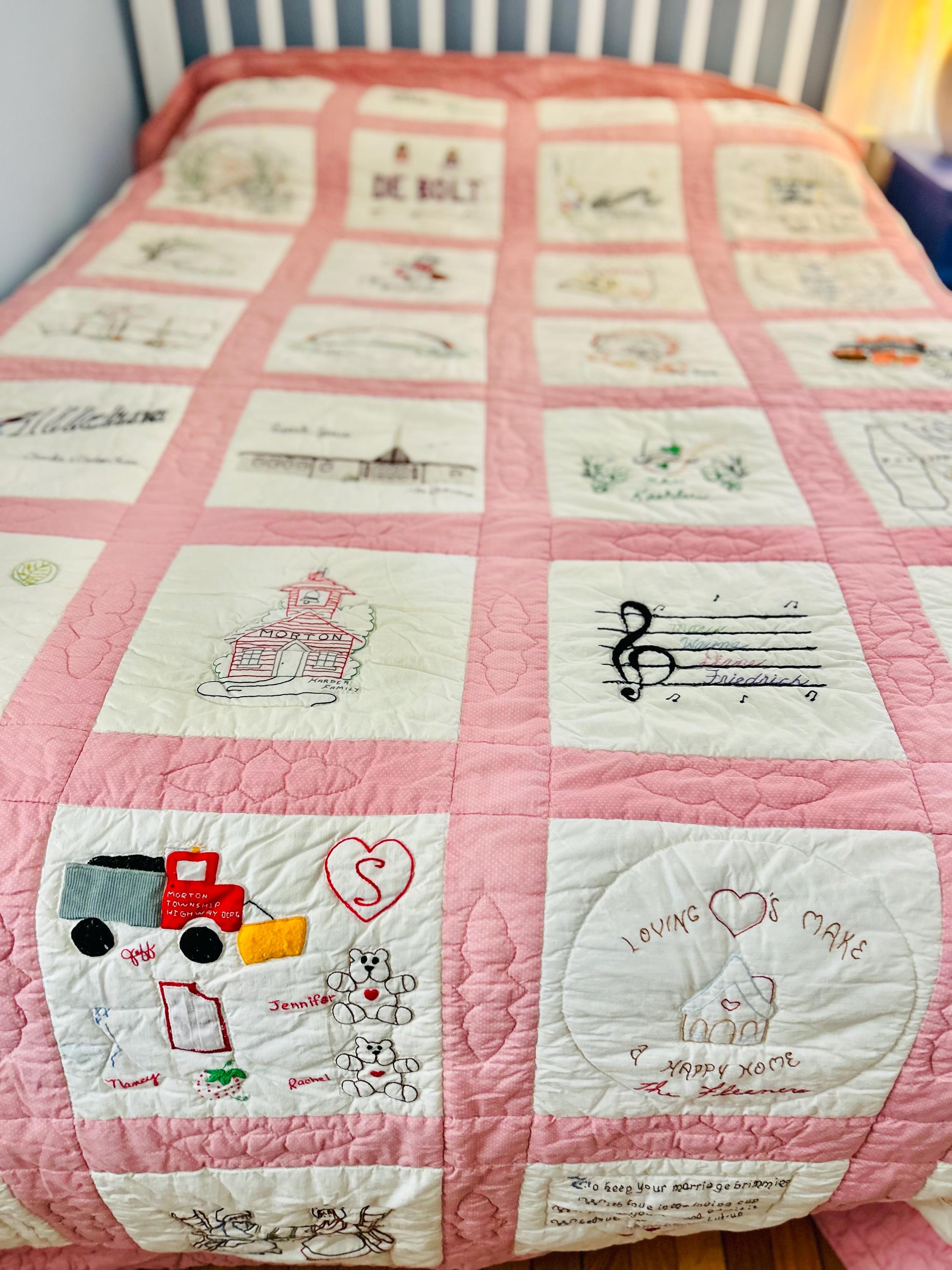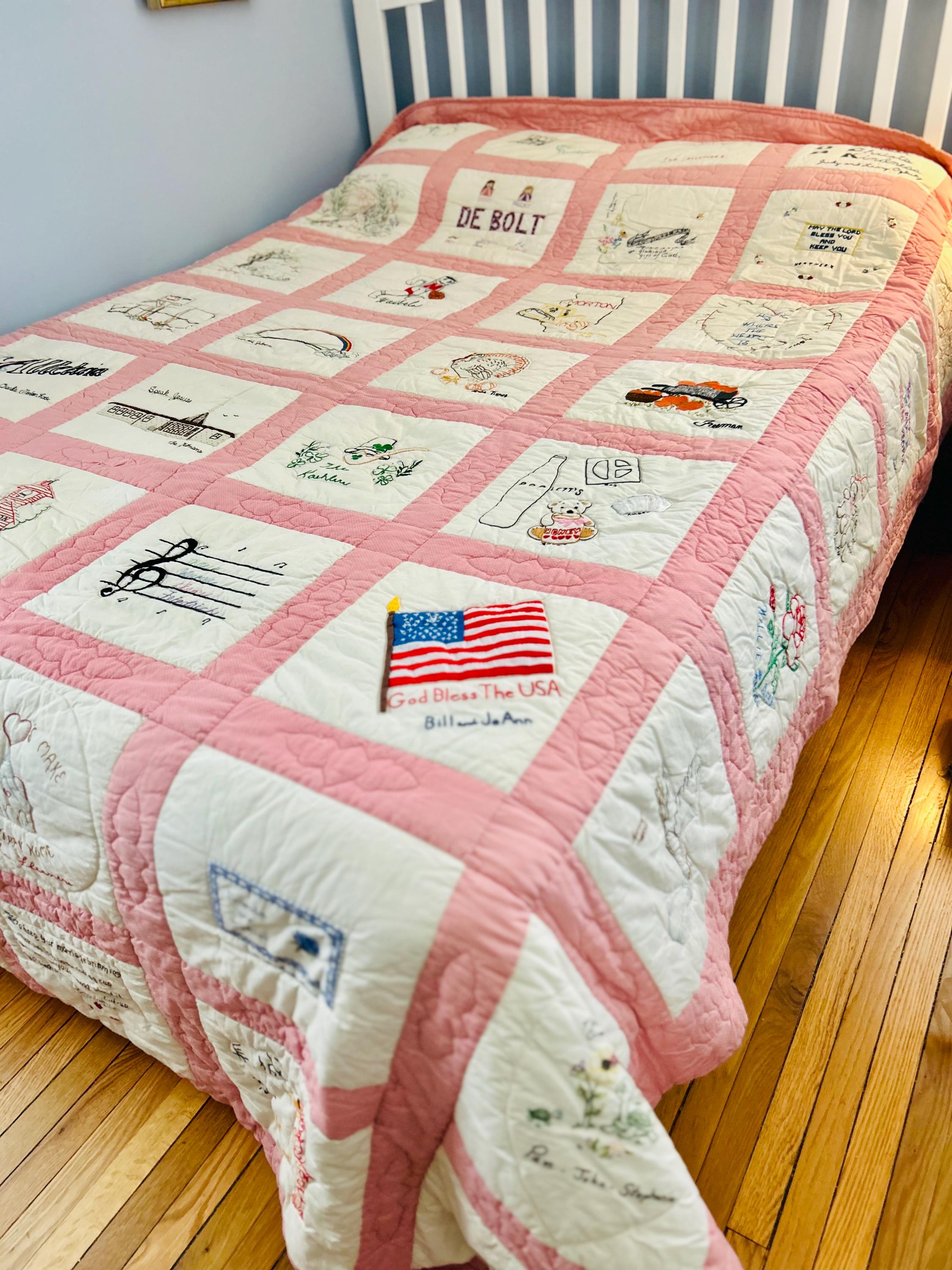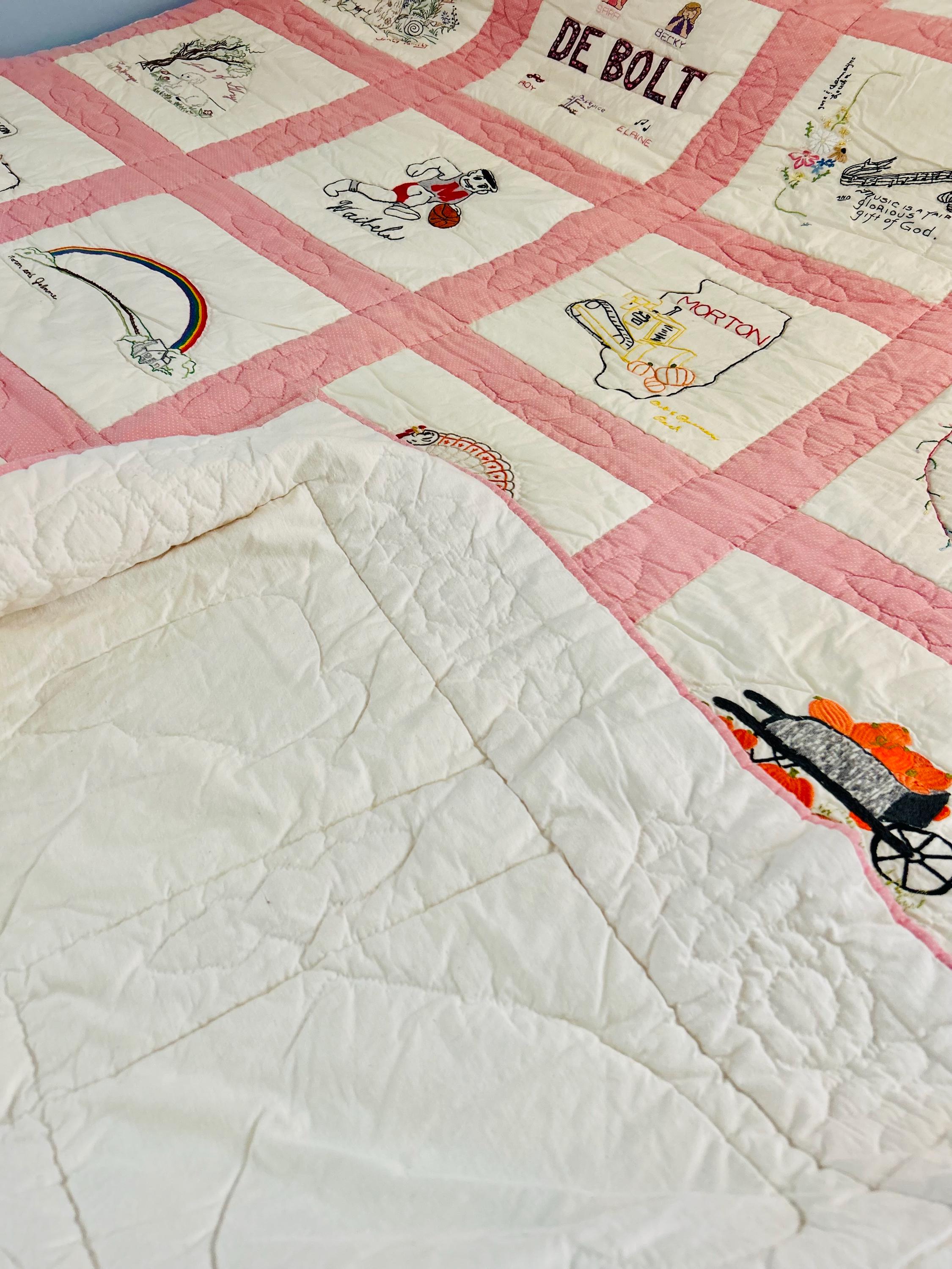 This Signature Album Quilt has 30 blocks embroidered with different vignettes, quotes and memories by church members in honor of a wedding. It is signed and dated 1987. The quilting is in outlines of the embroidery and -- along the sashing and border -- the quilting is in lovely flowers and unique geometric patterns.