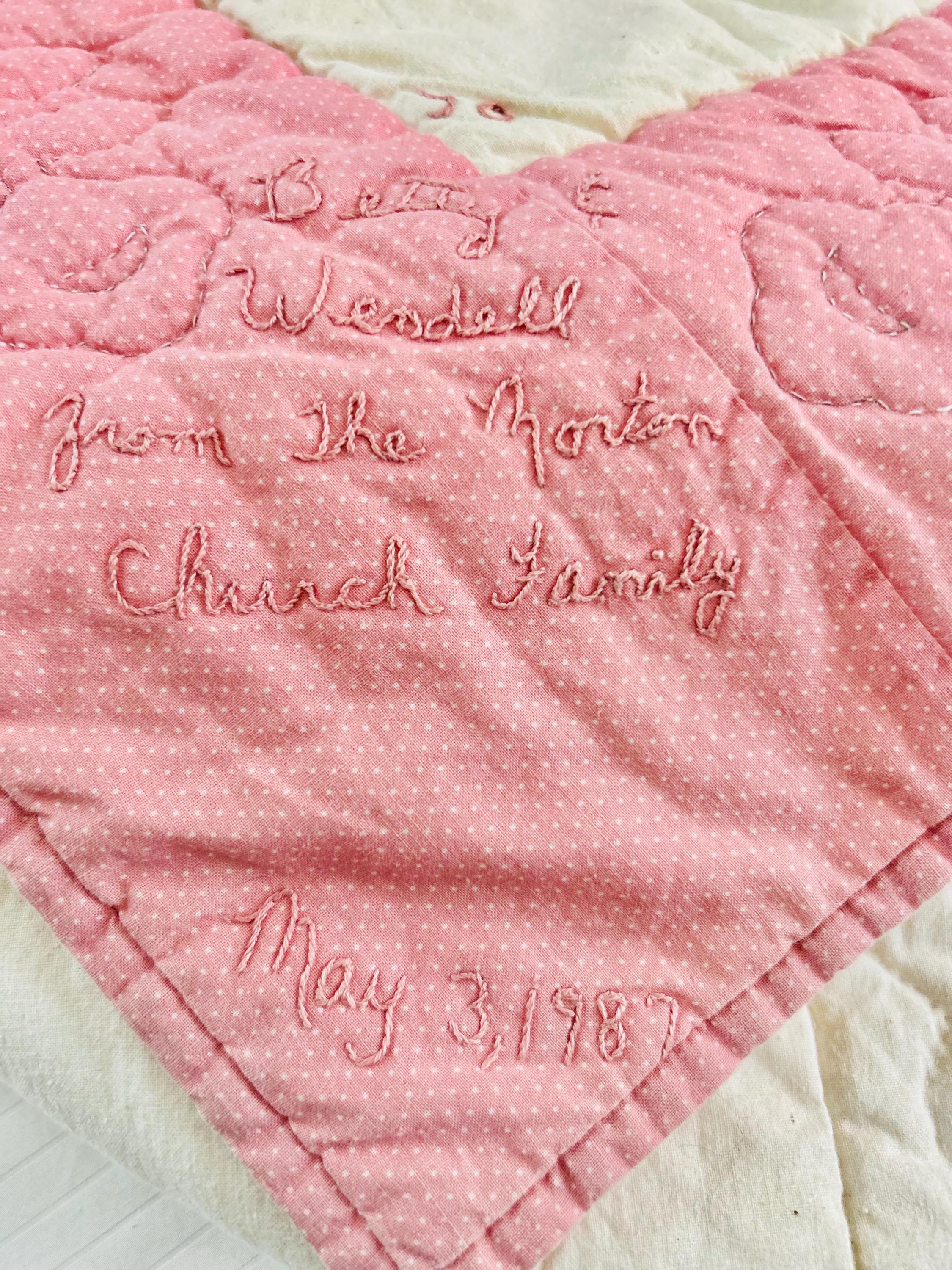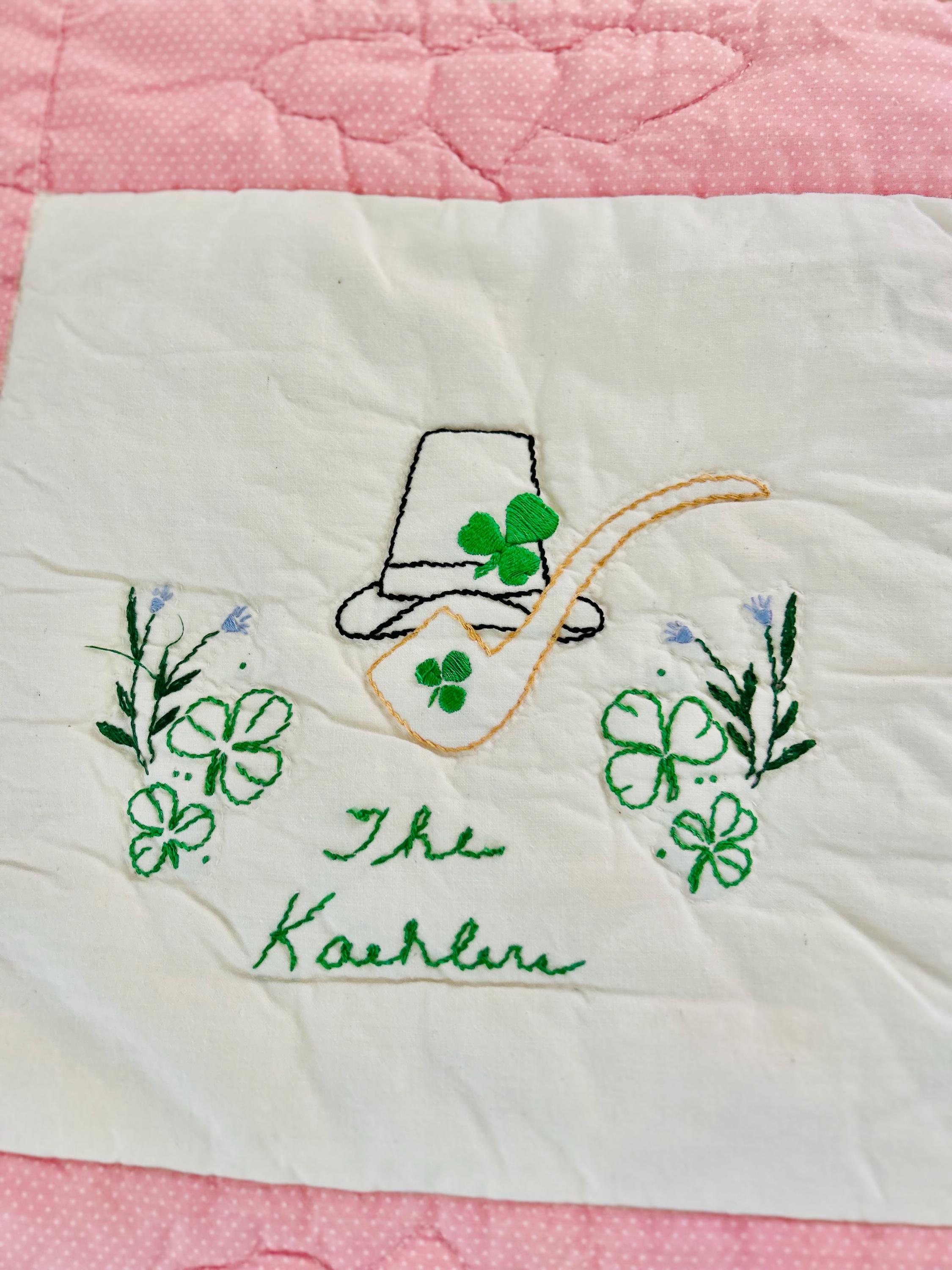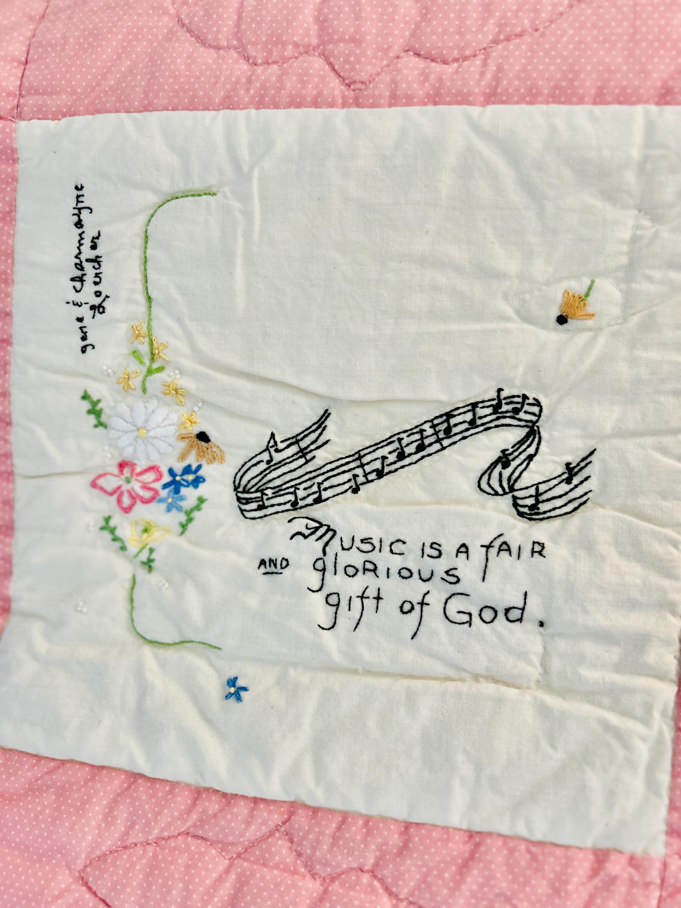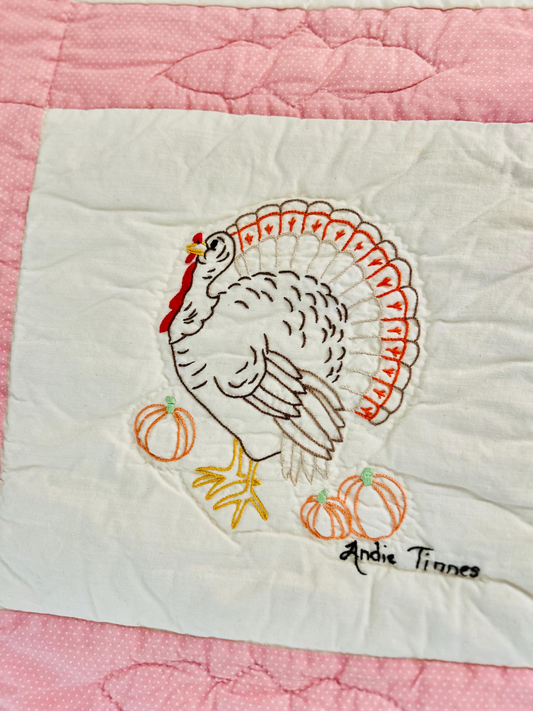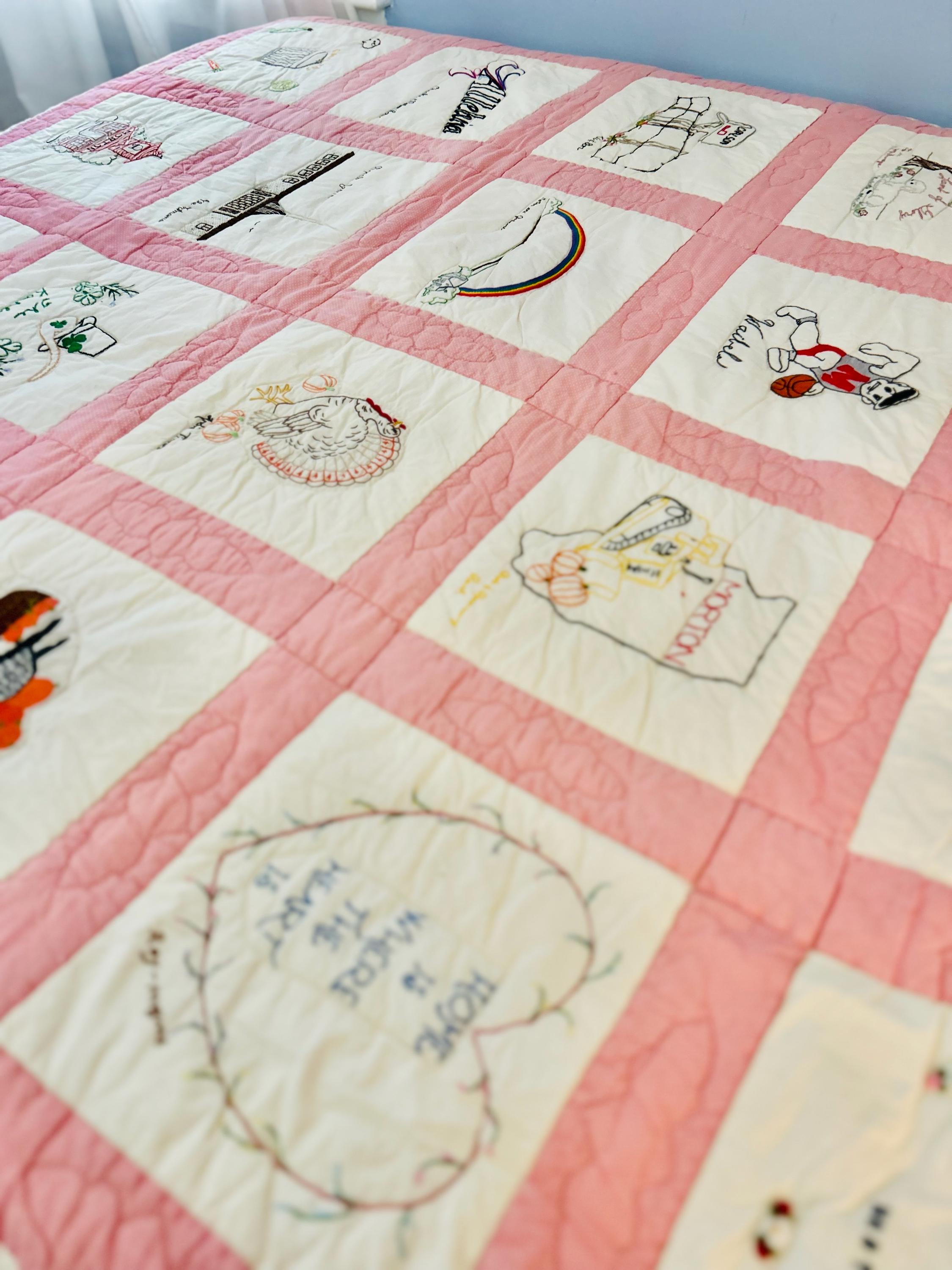 This Signature Album Quilt has 30 blocks embroidered with different vignettes, quotes and memories by church members in honor of a wedding. It is signed and dated 1987. The quilting is in outlines of the embroidery and -- along the sashing and border -- the quilting is in lovely flowers and unique geometric patterns.