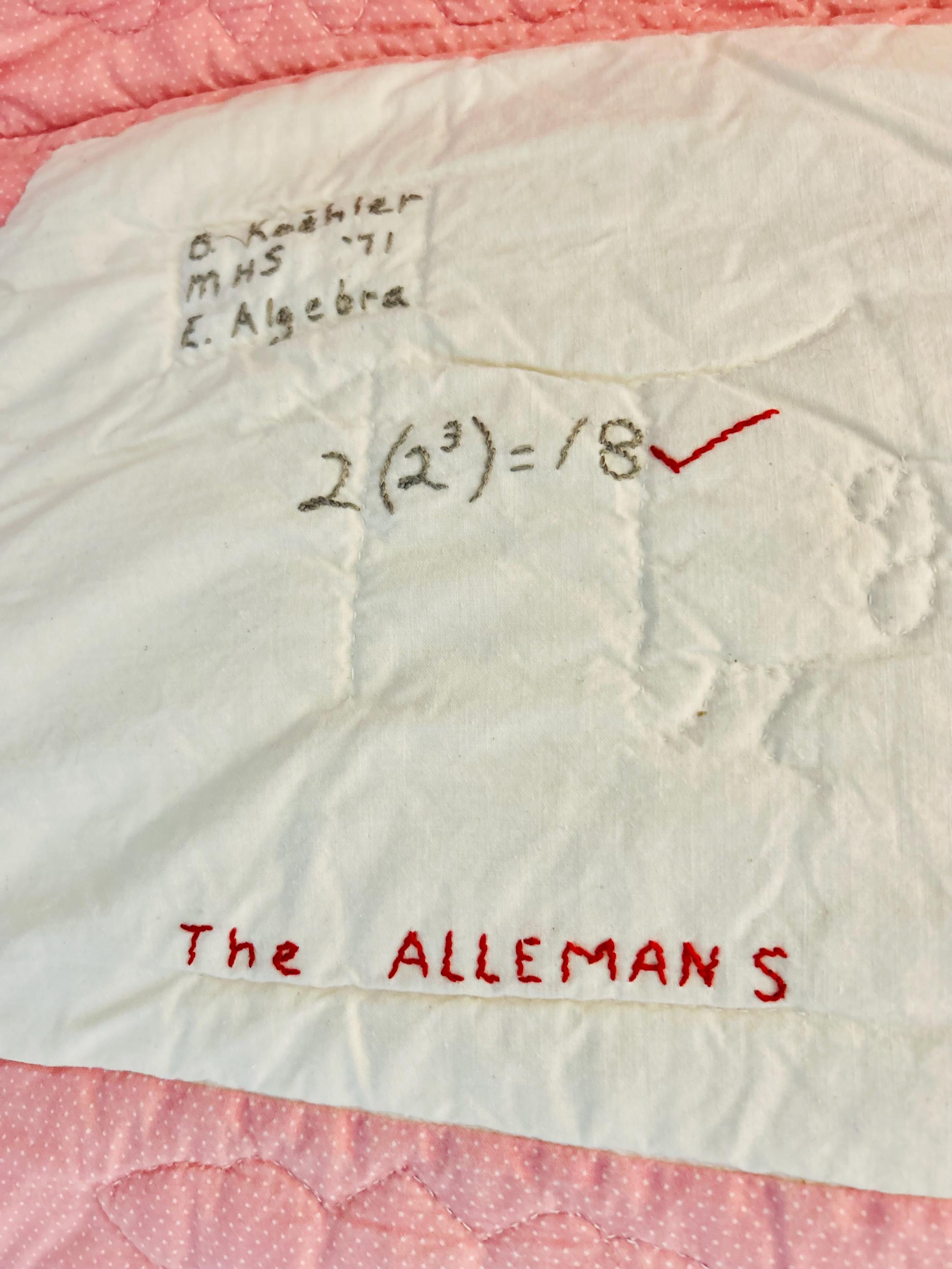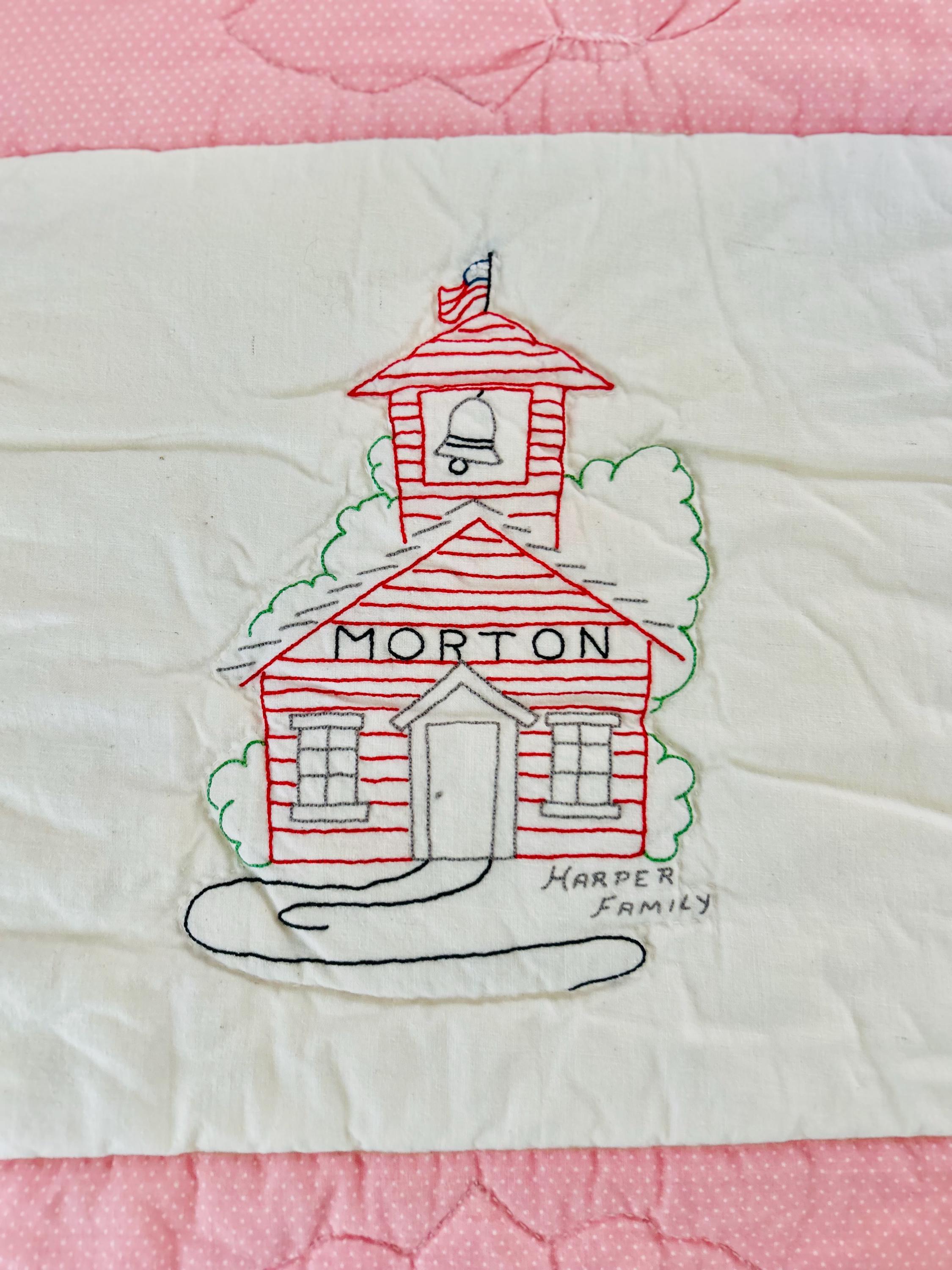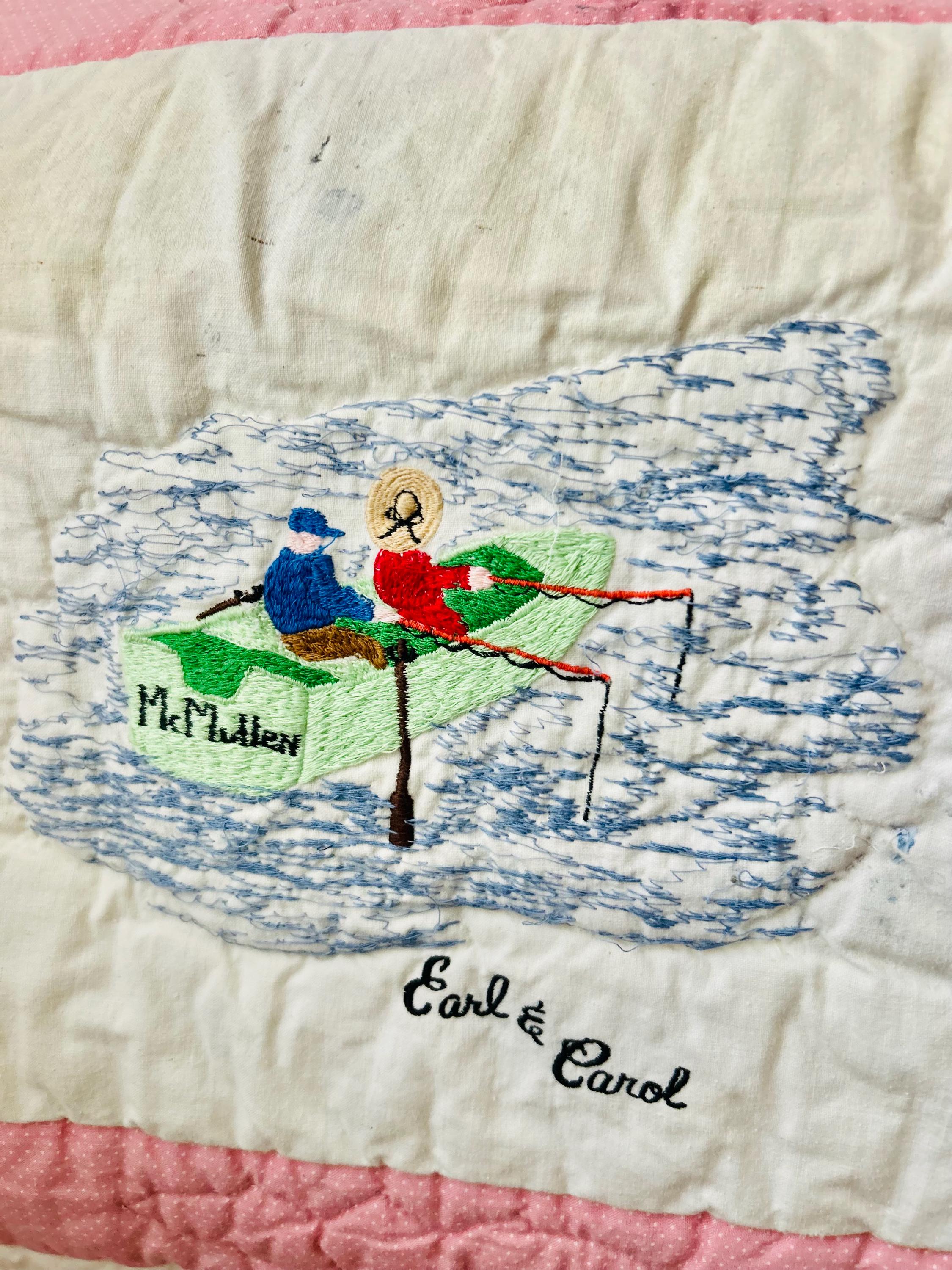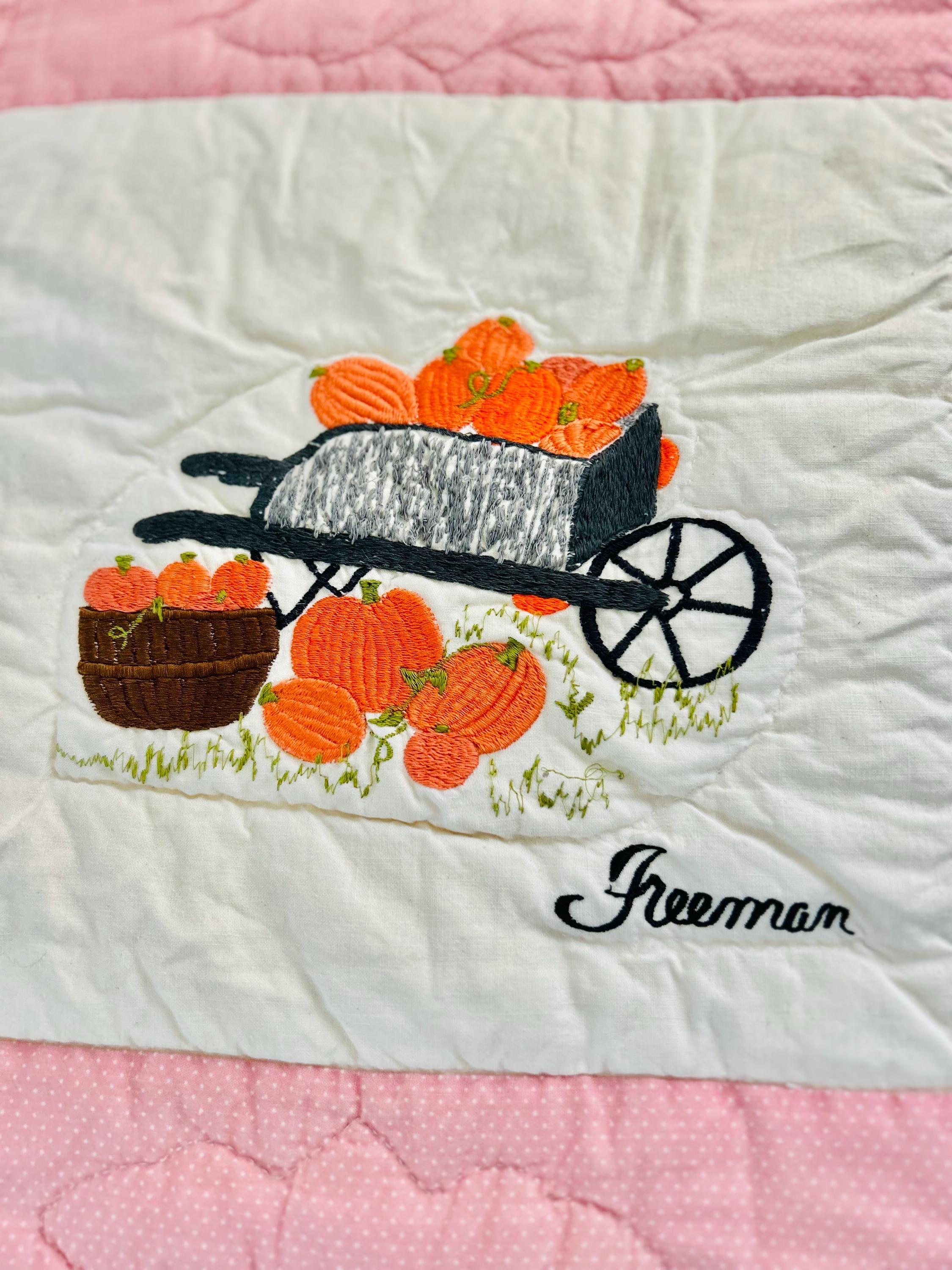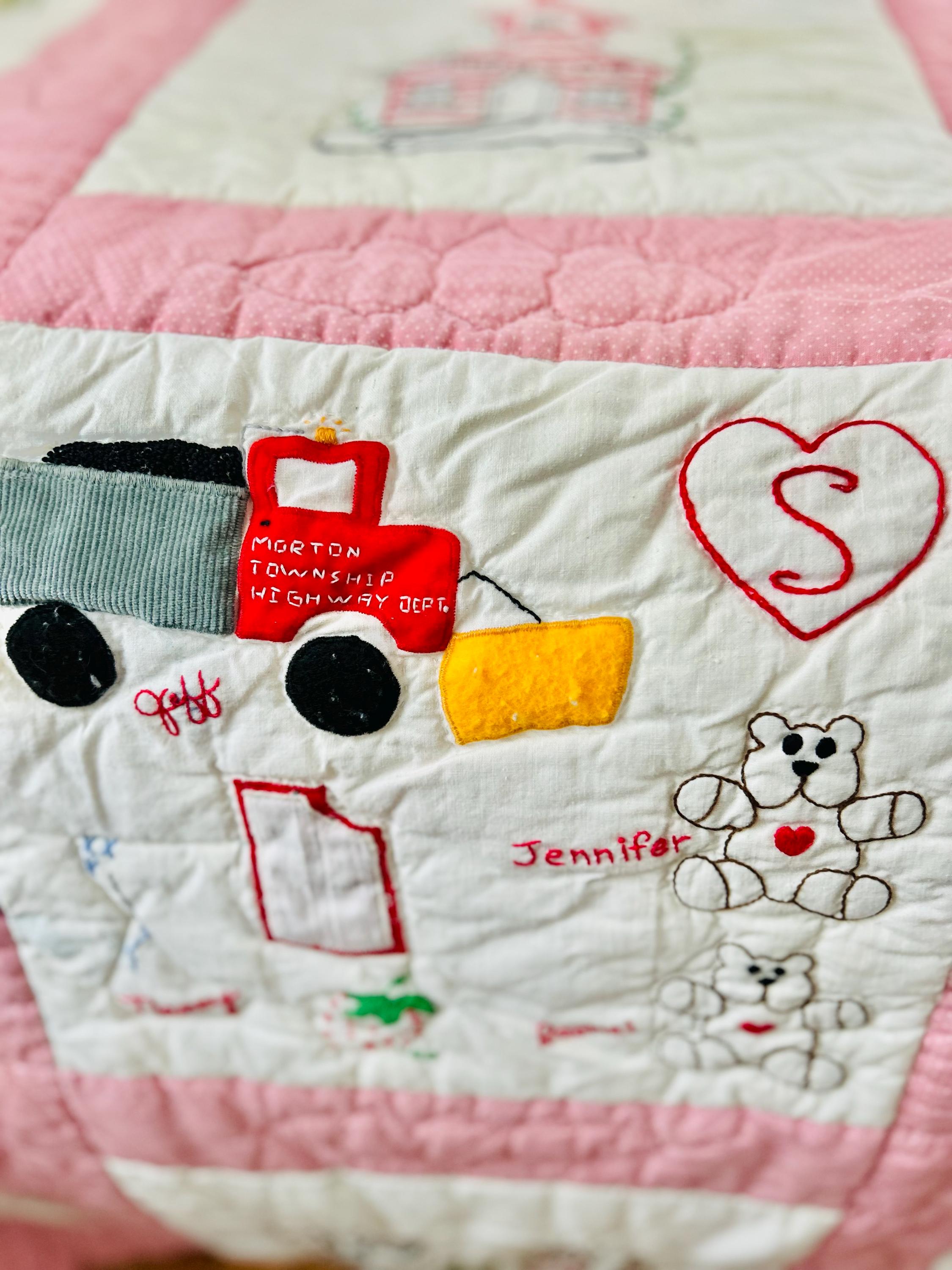 This Signature Album Quilt has 30 blocks embroidered with different vignettes, quotes and memories by church members in honor of a wedding. It is signed and dated 1987. The quilting is in outlines of the embroidery and -- along the sashing and border -- the quilting is in lovely flowers and unique geometric patterns.