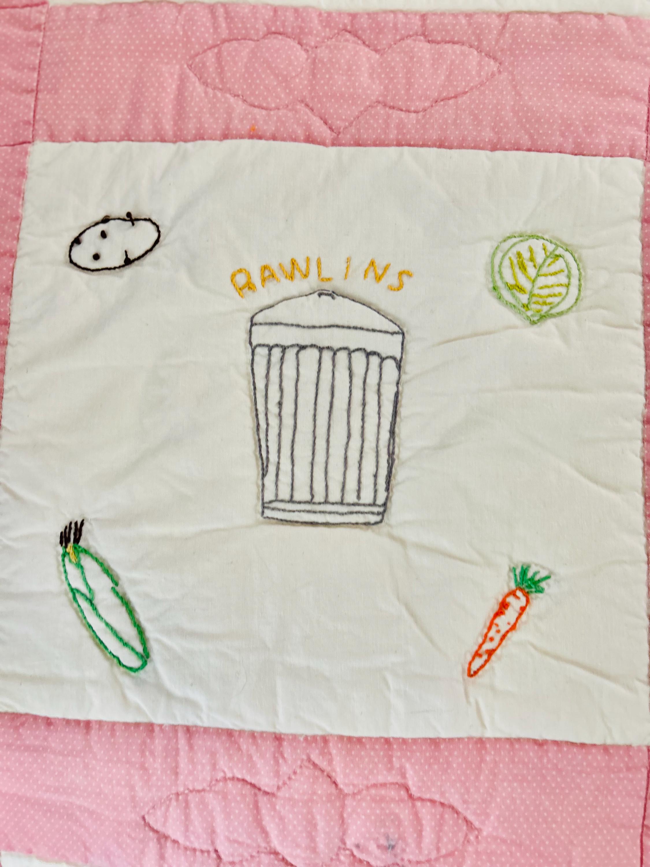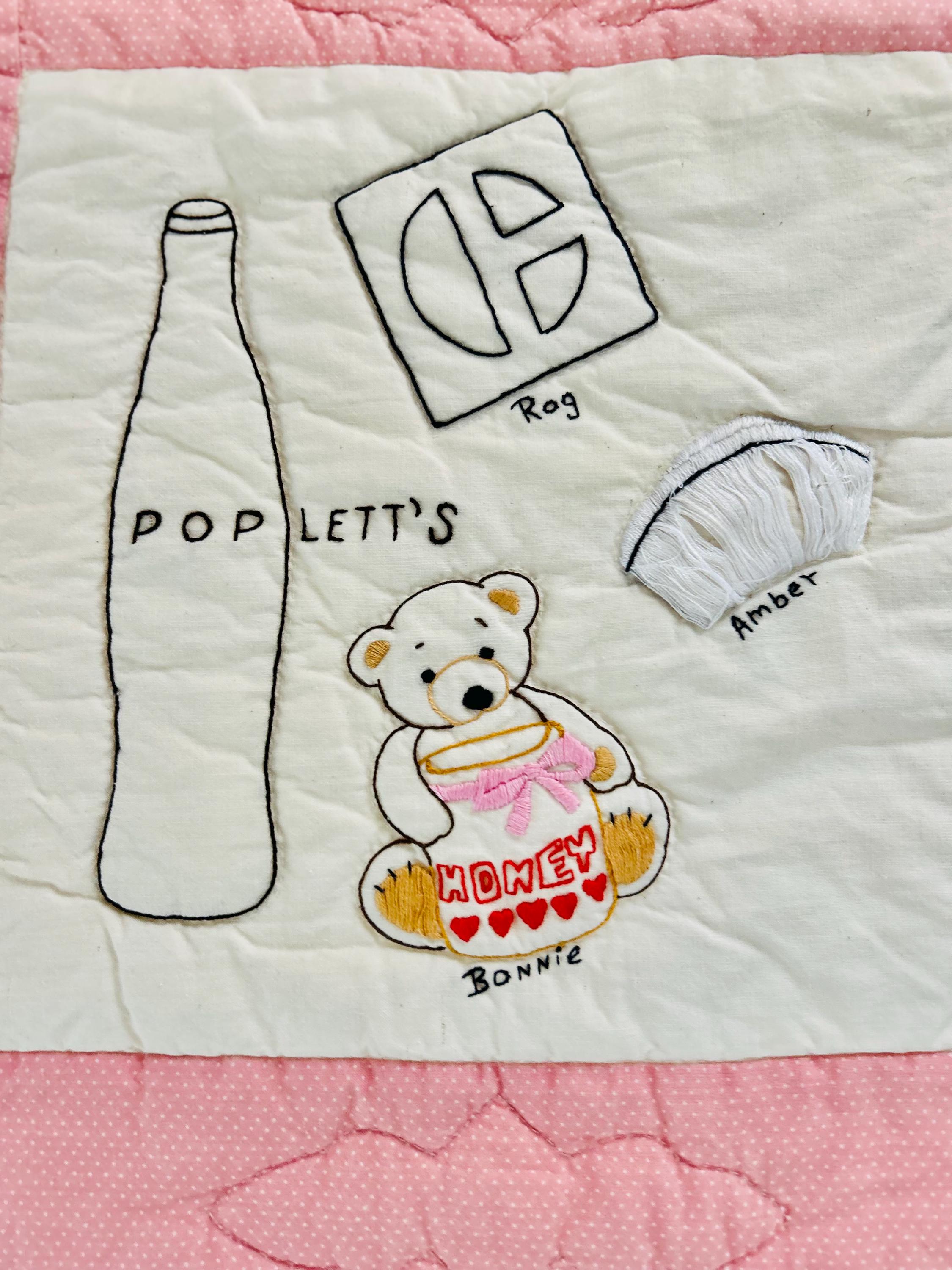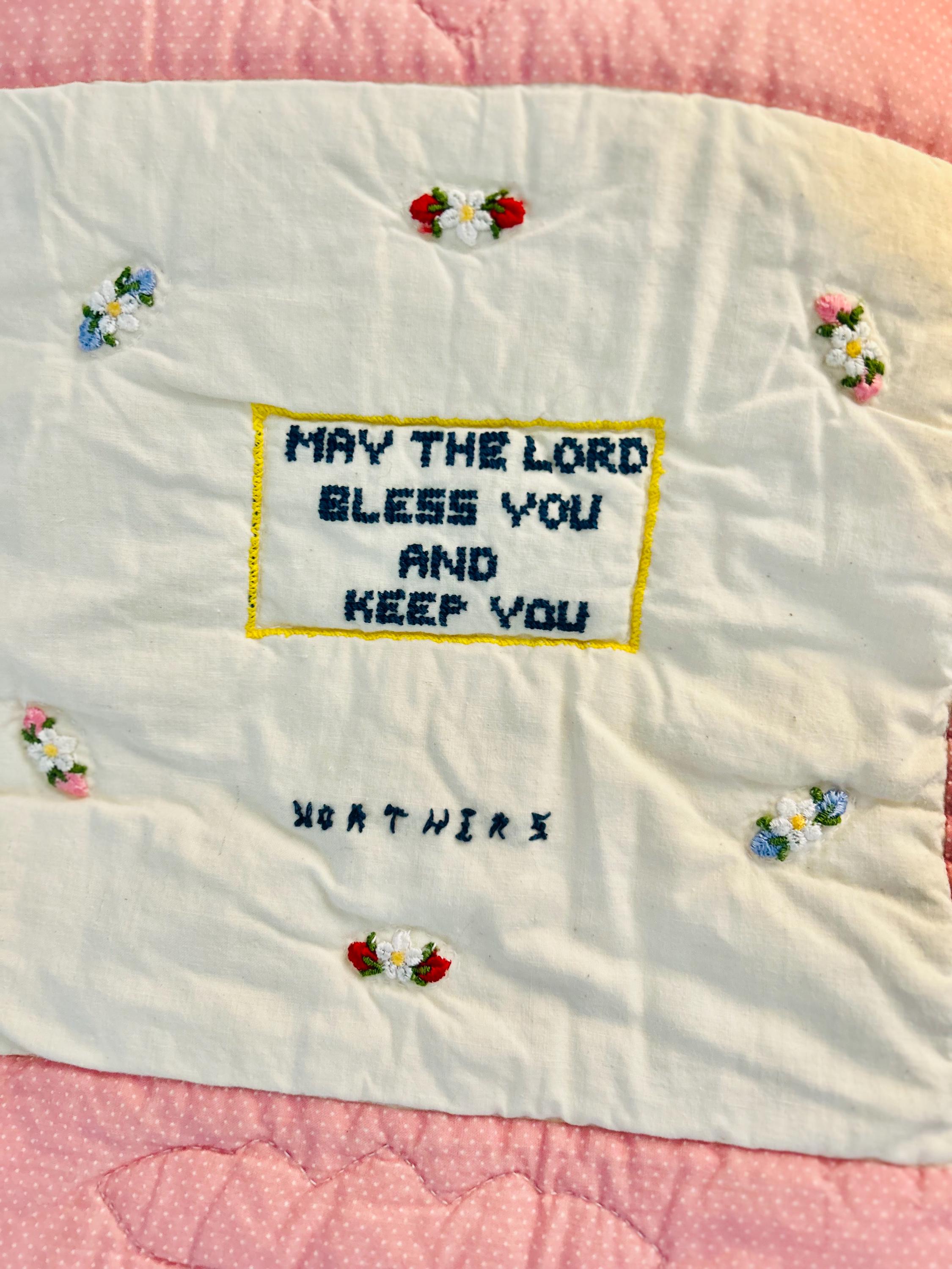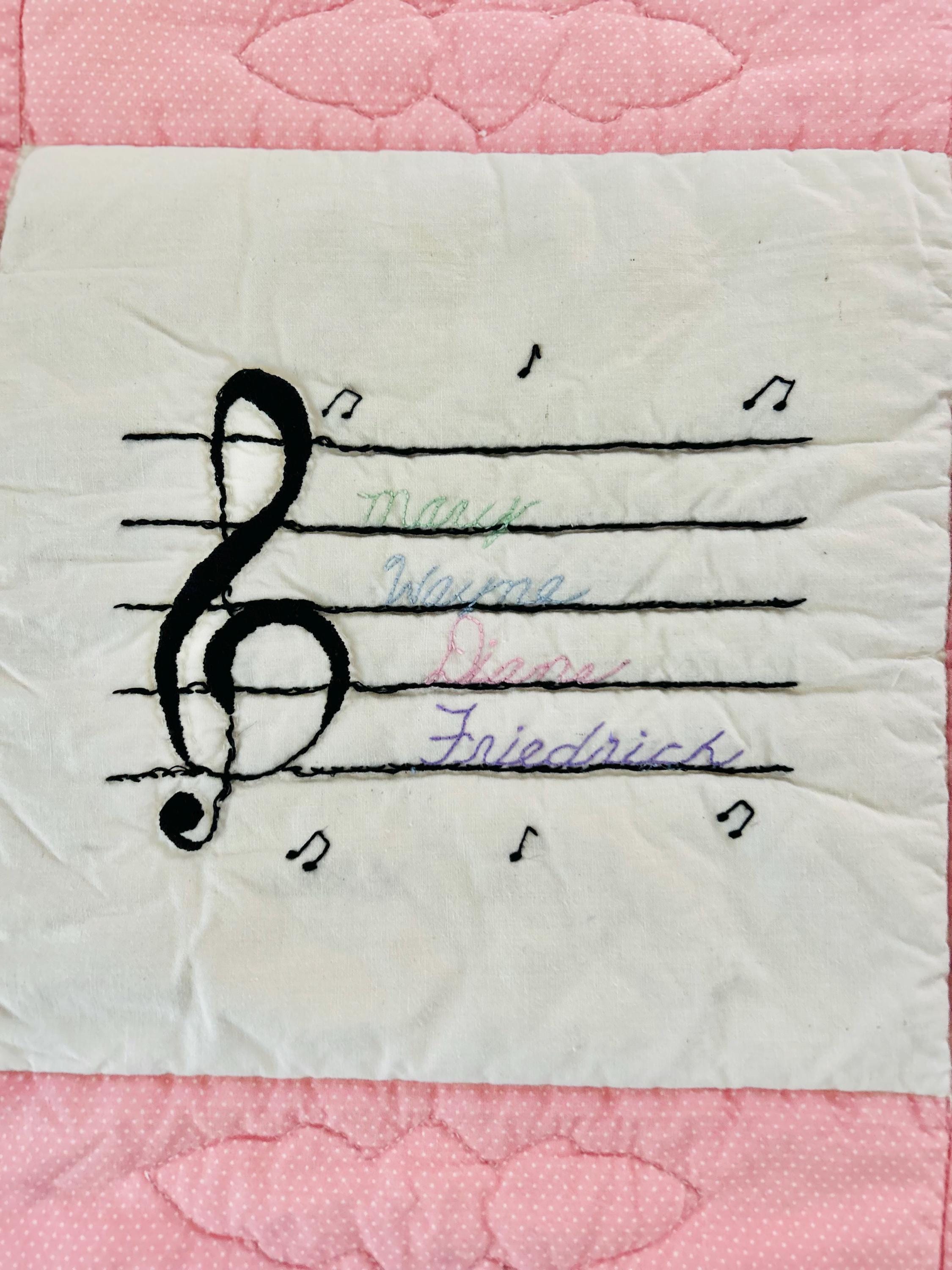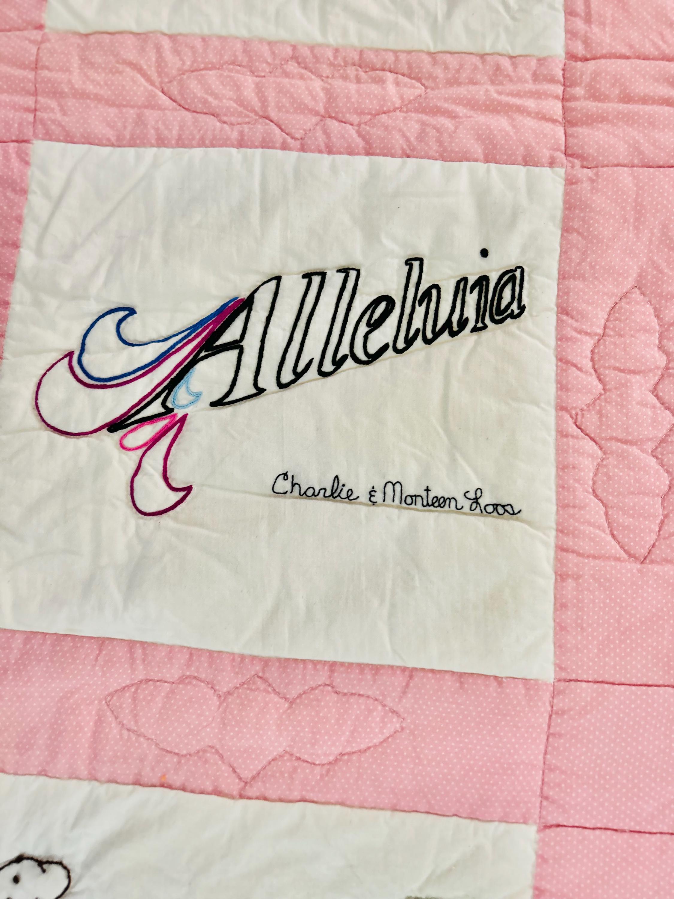 This Signature Album Quilt has 30 blocks embroidered with different vignettes, quotes and memories by church members in honor of a wedding. It is signed and dated 1987. The quilting is in outlines of the embroidery and -- along the sashing and border -- the quilting is in lovely flowers and unique geometric patterns.