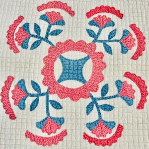 The back is white cotton and the binding has been made by turning the four-sided border to the back and machine-stitching. The batting is lightweight but the quilt is heavy due to its very large size.