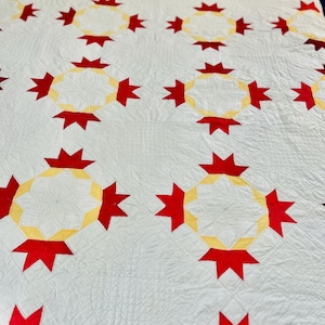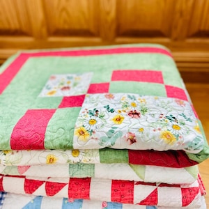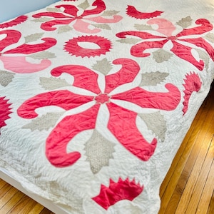 This unique quilt is clean and soft and measures 90 inches by 110 inches. From a smoke-free, pet-free home. Shown on a queen-size bed.