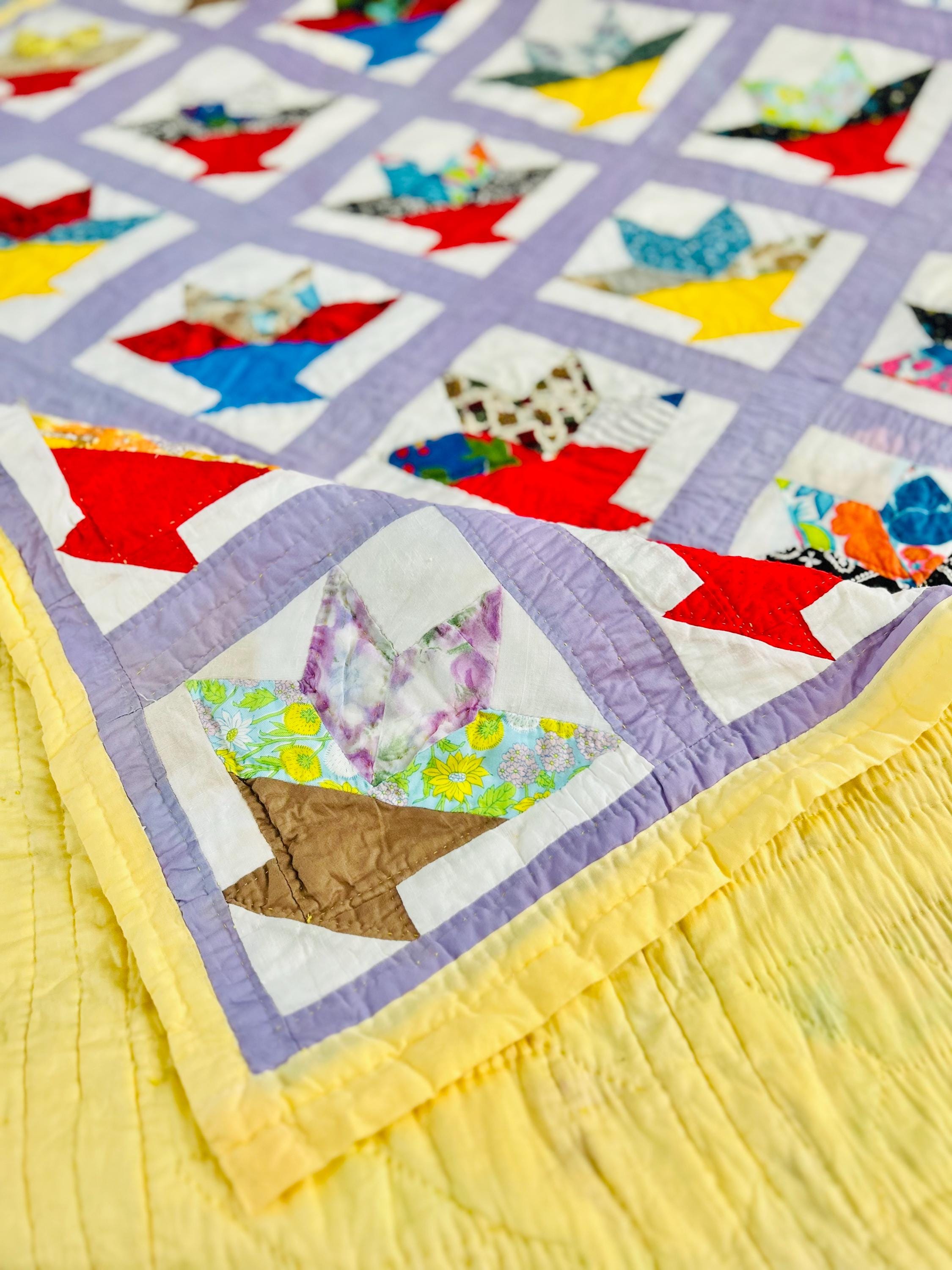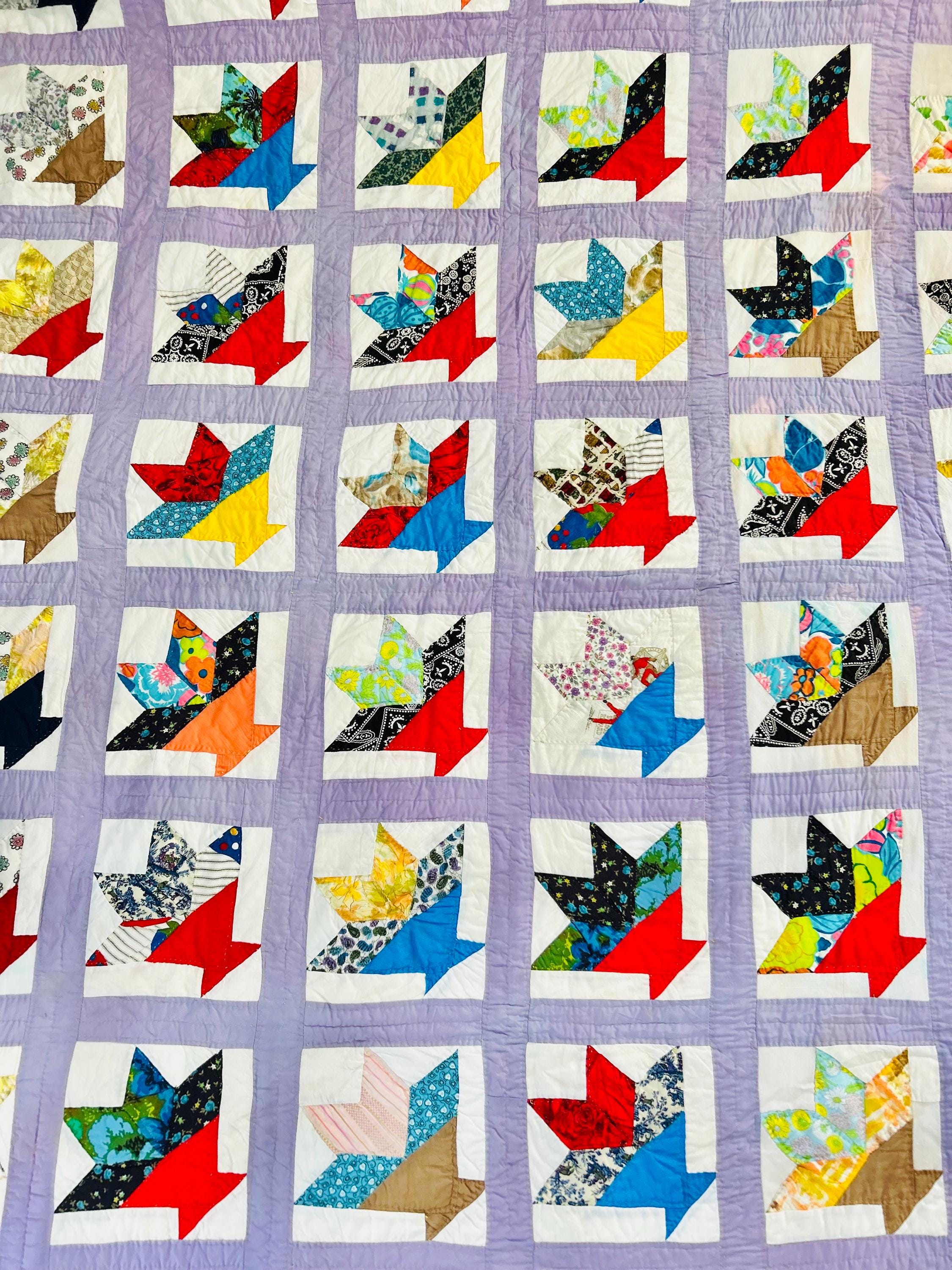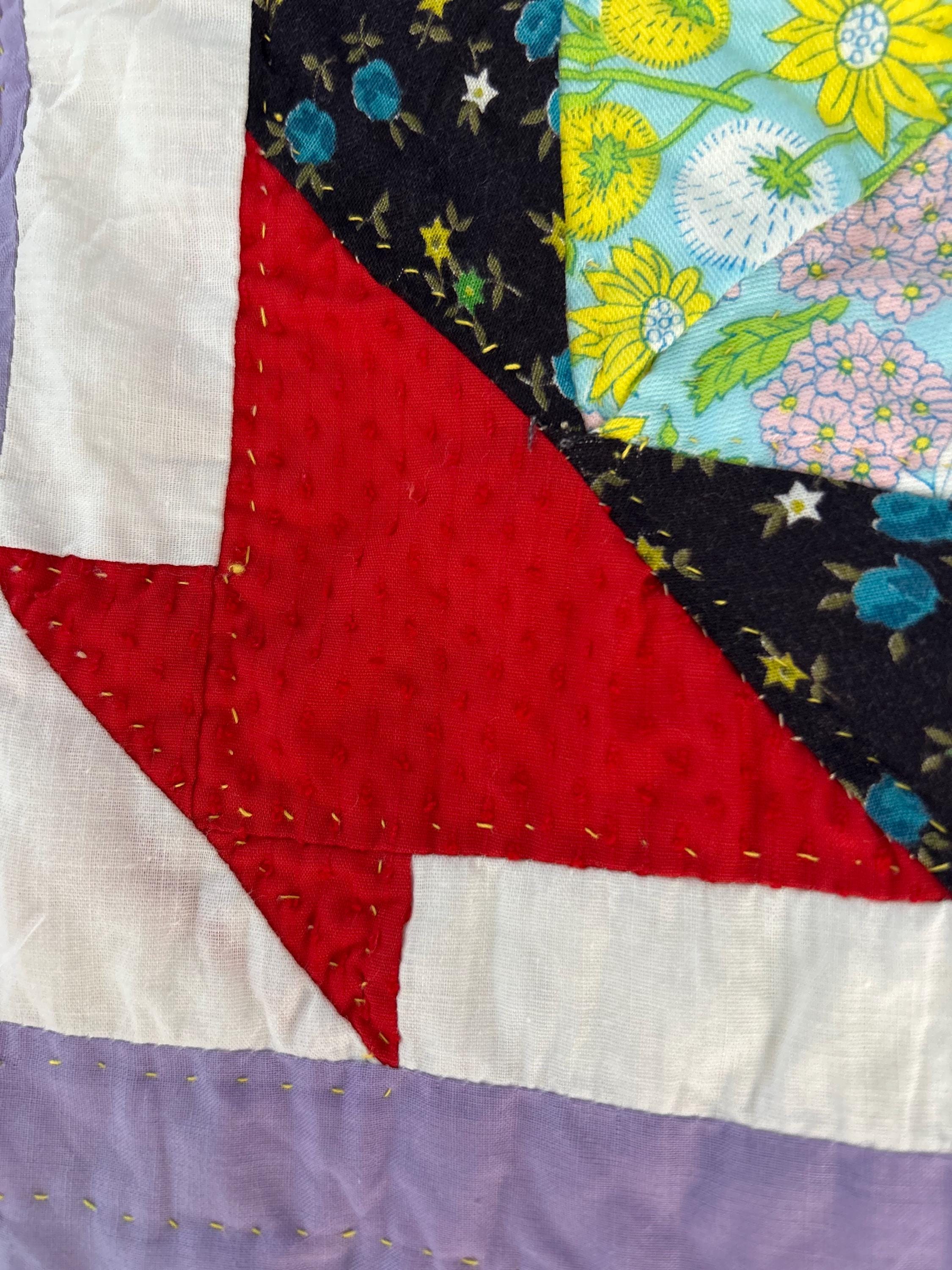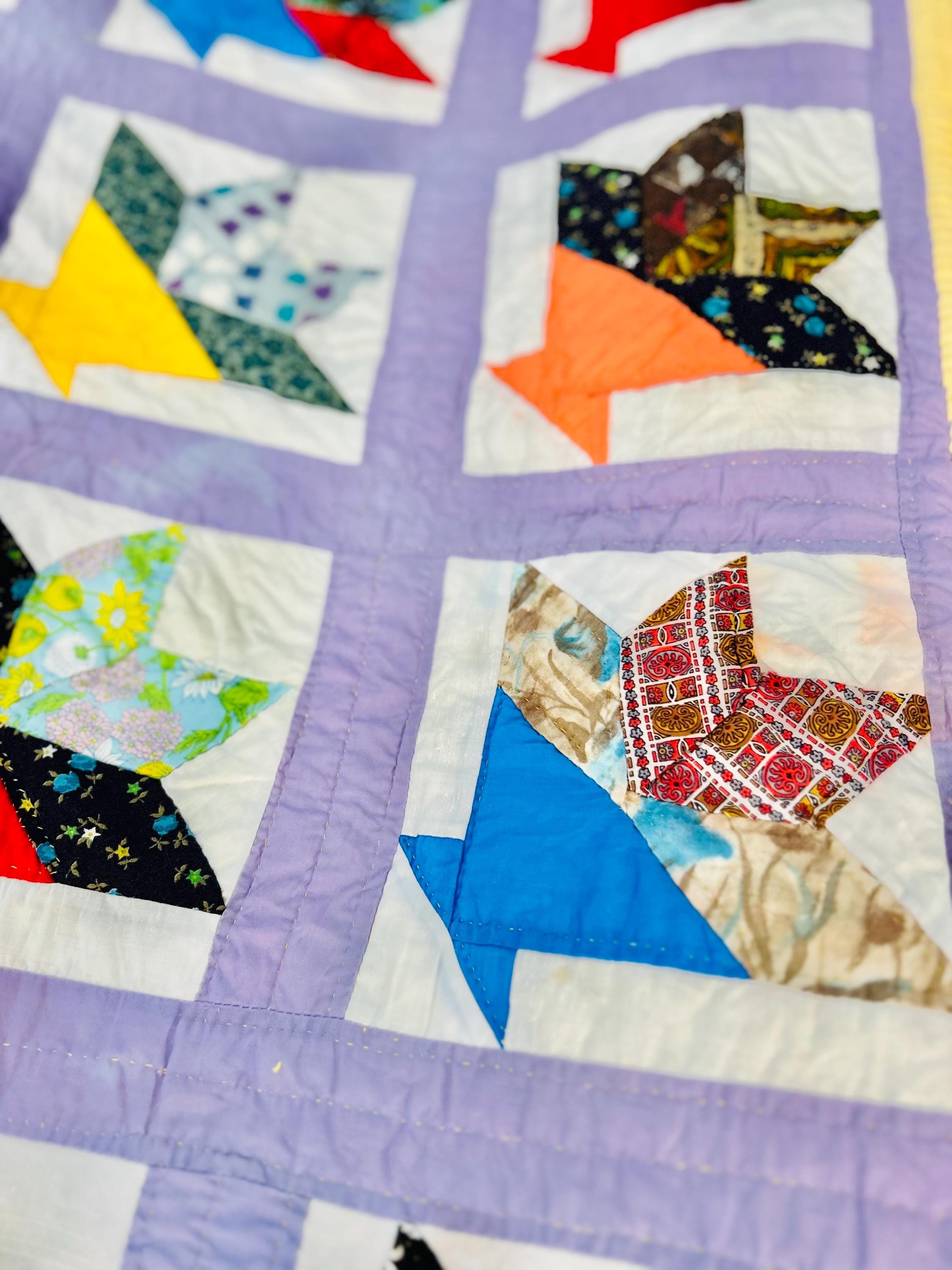 The quilt is in excellent condition with some light color transfer (see photos) and some color loss/fading of two small spots of the purple sashing. See photos.