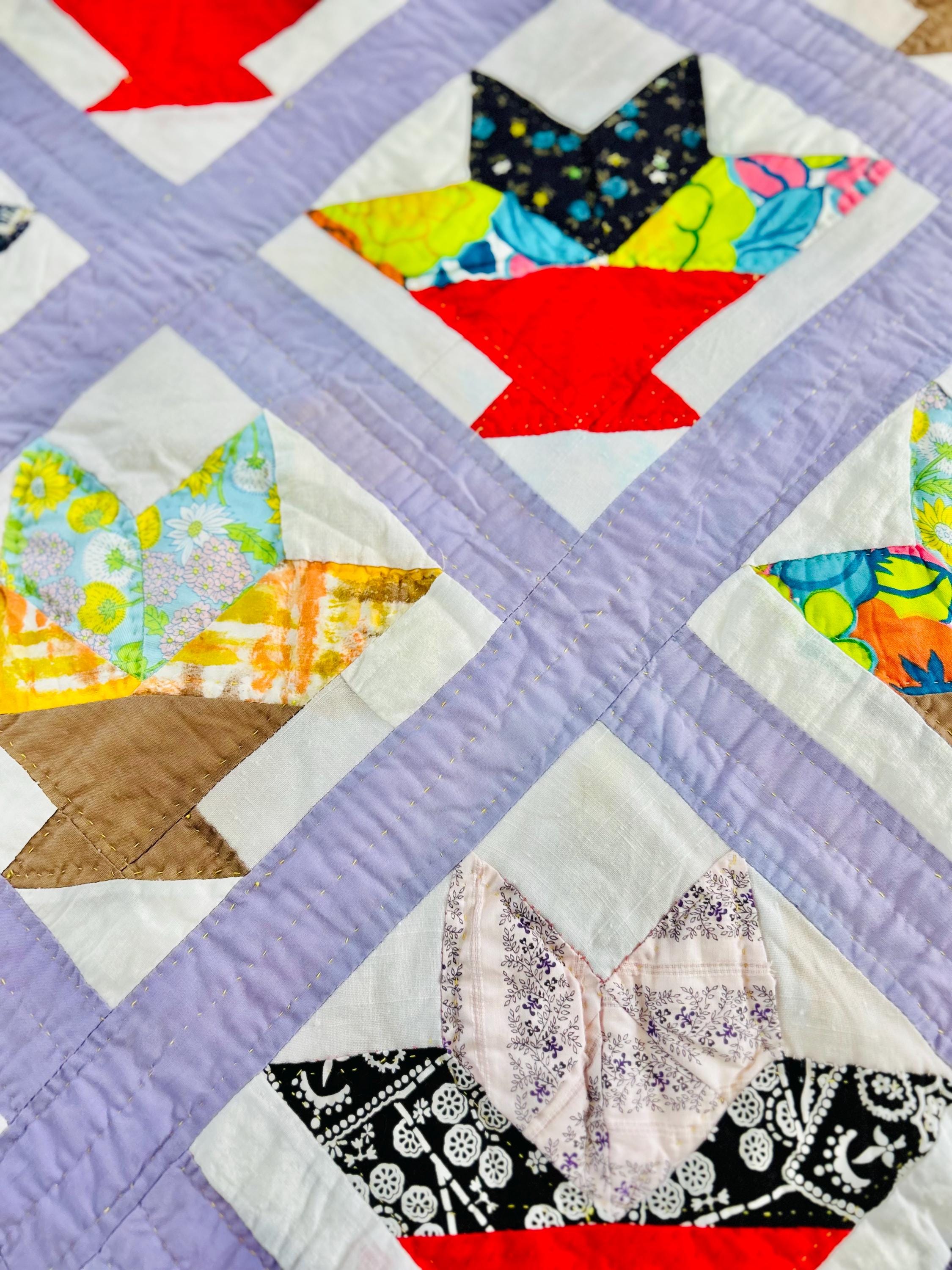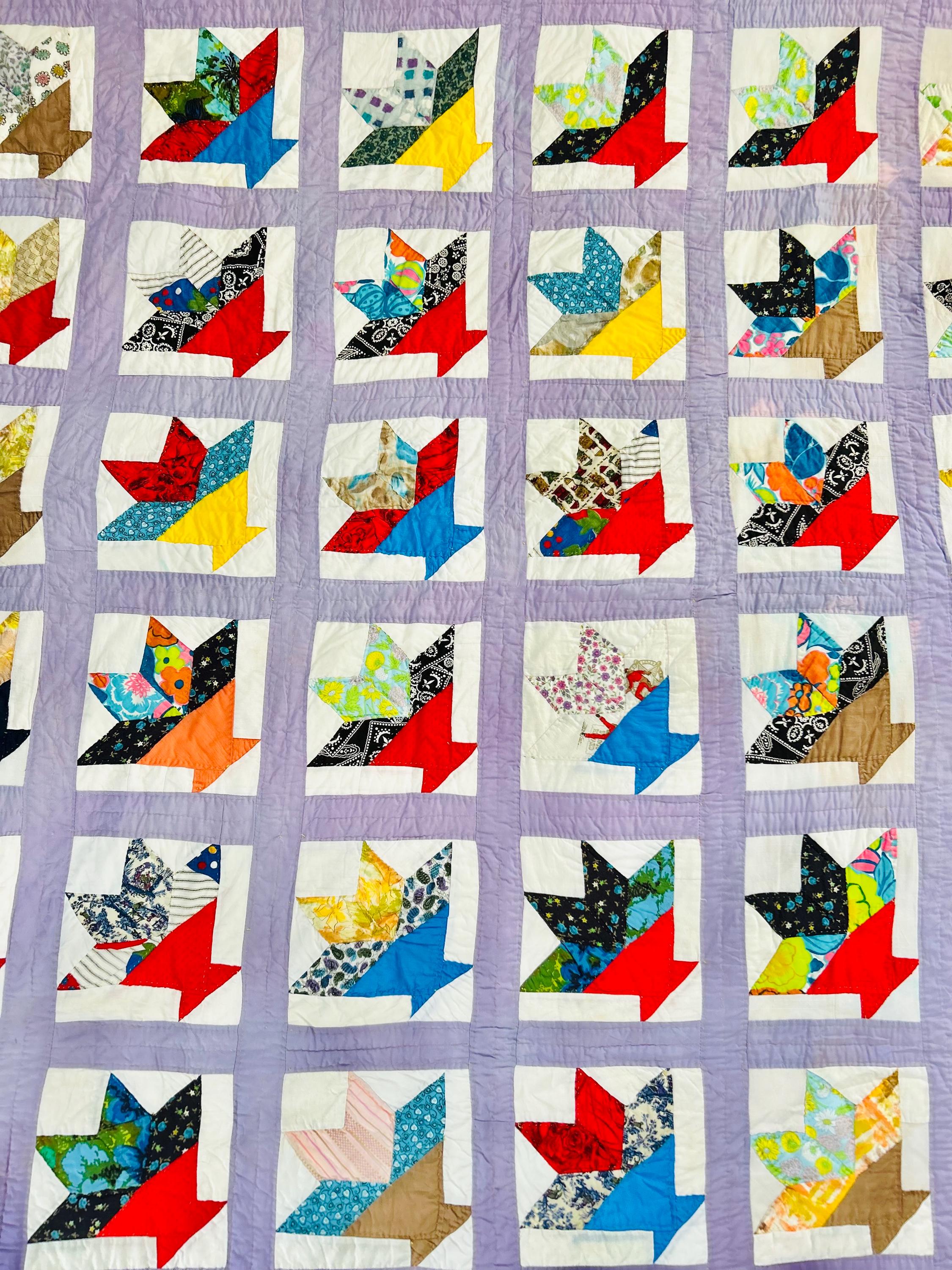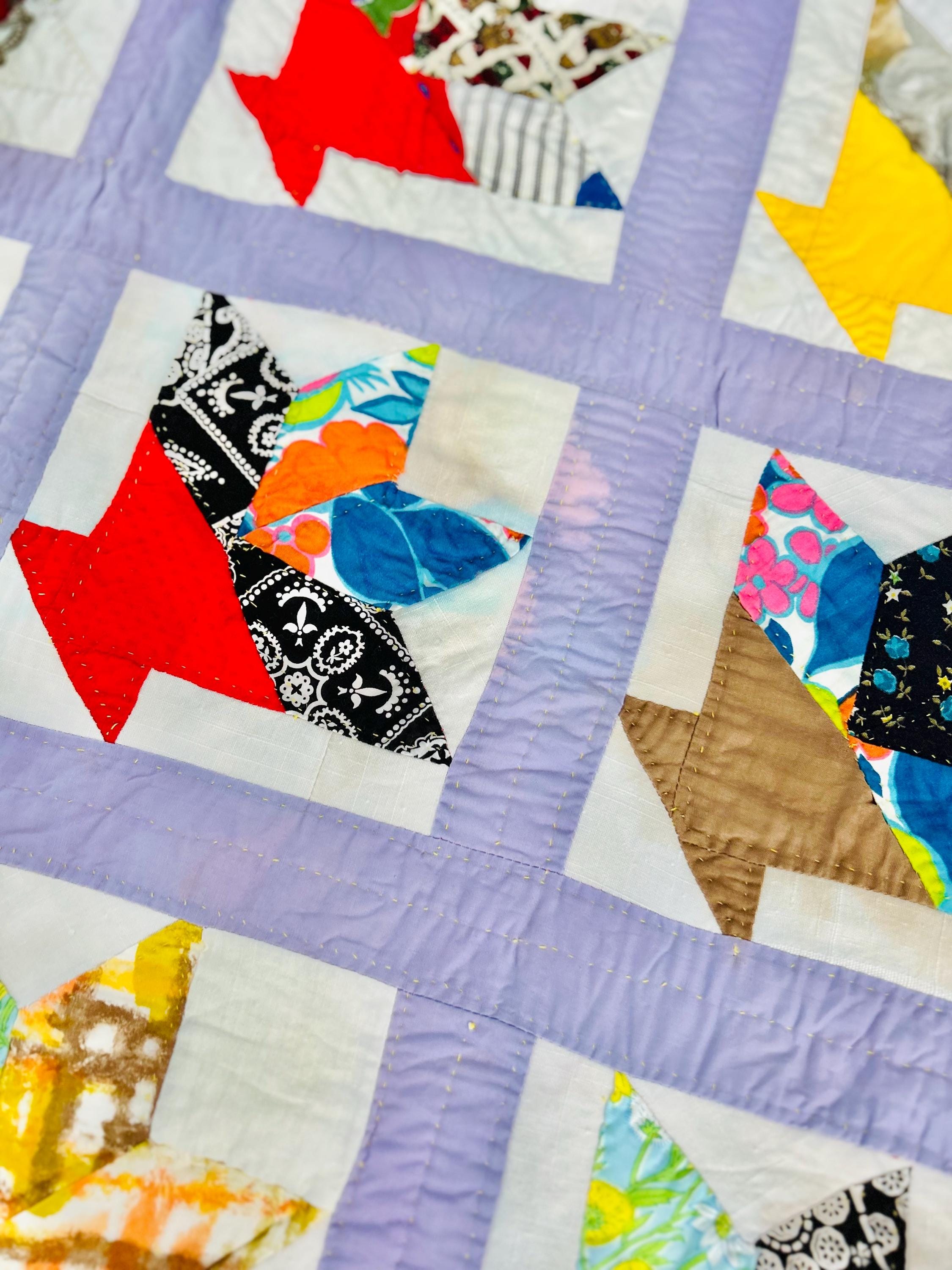 The quilt is in excellent condition with some light color transfer (see photos) and some color loss/fading of two small spots of the purple sashing. See photos.