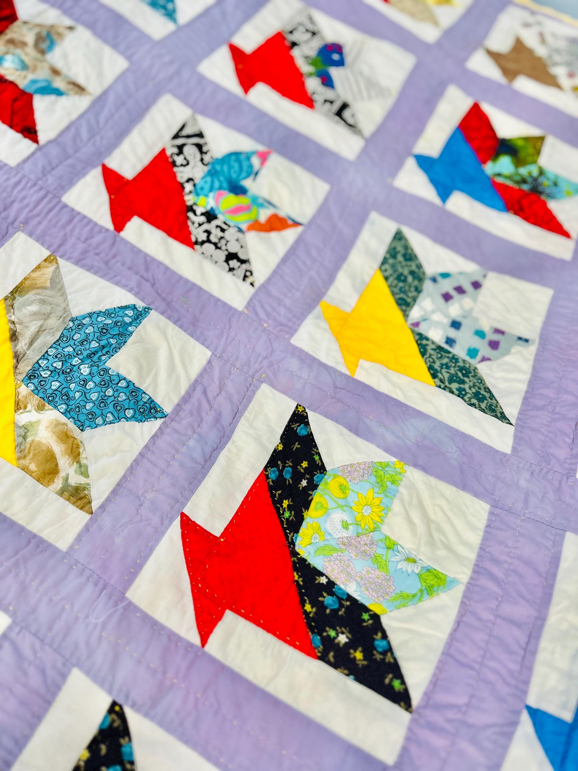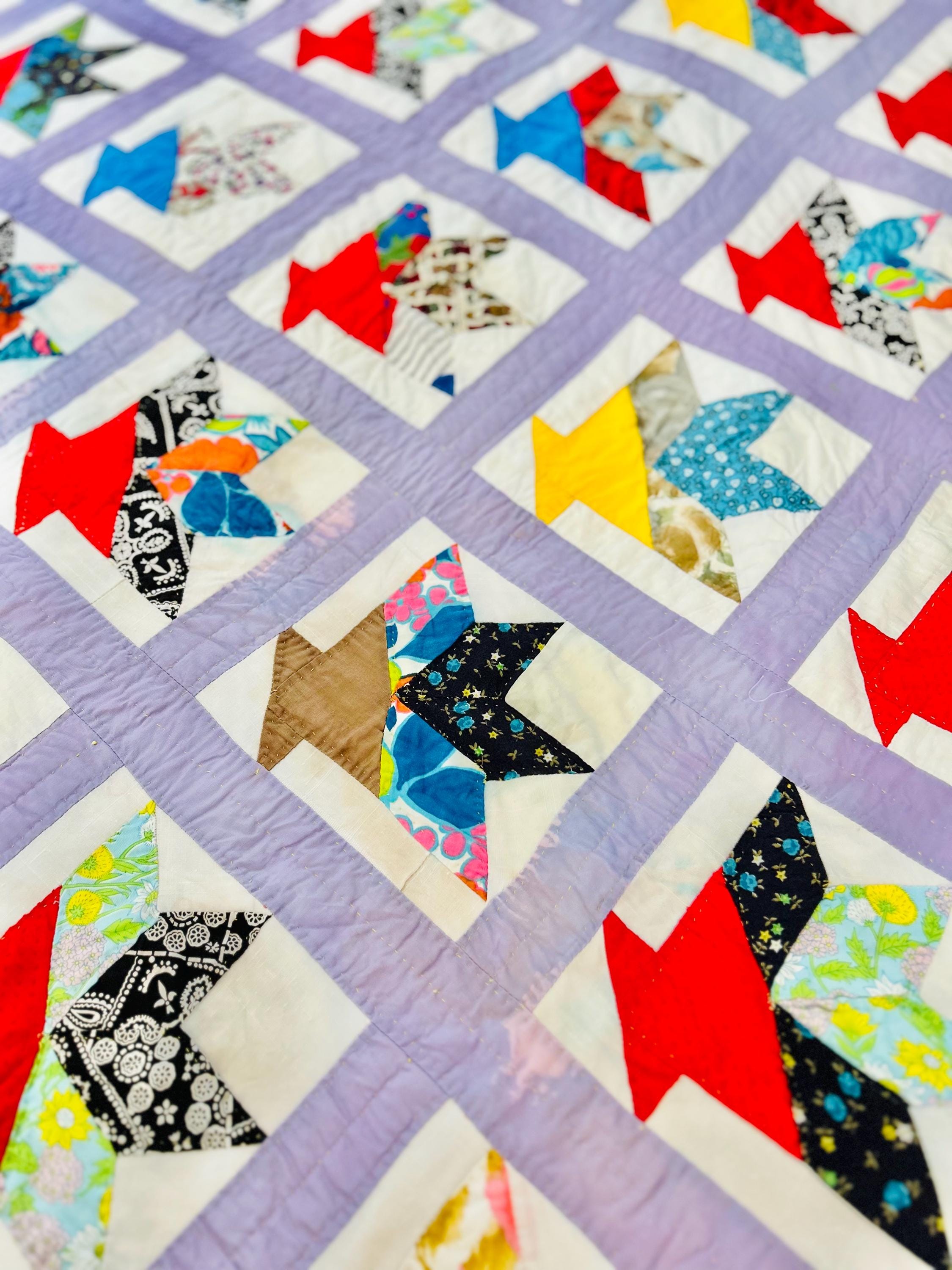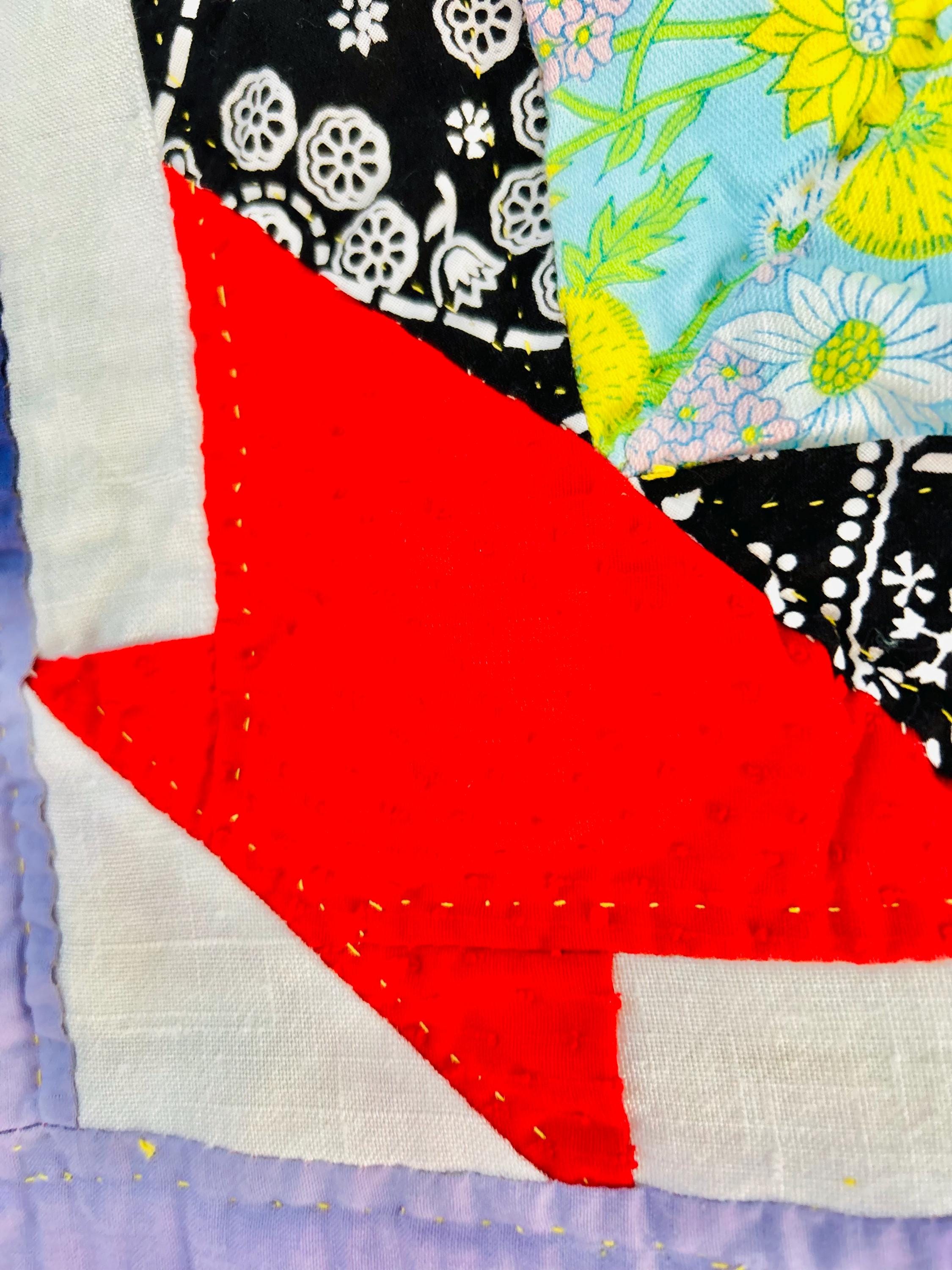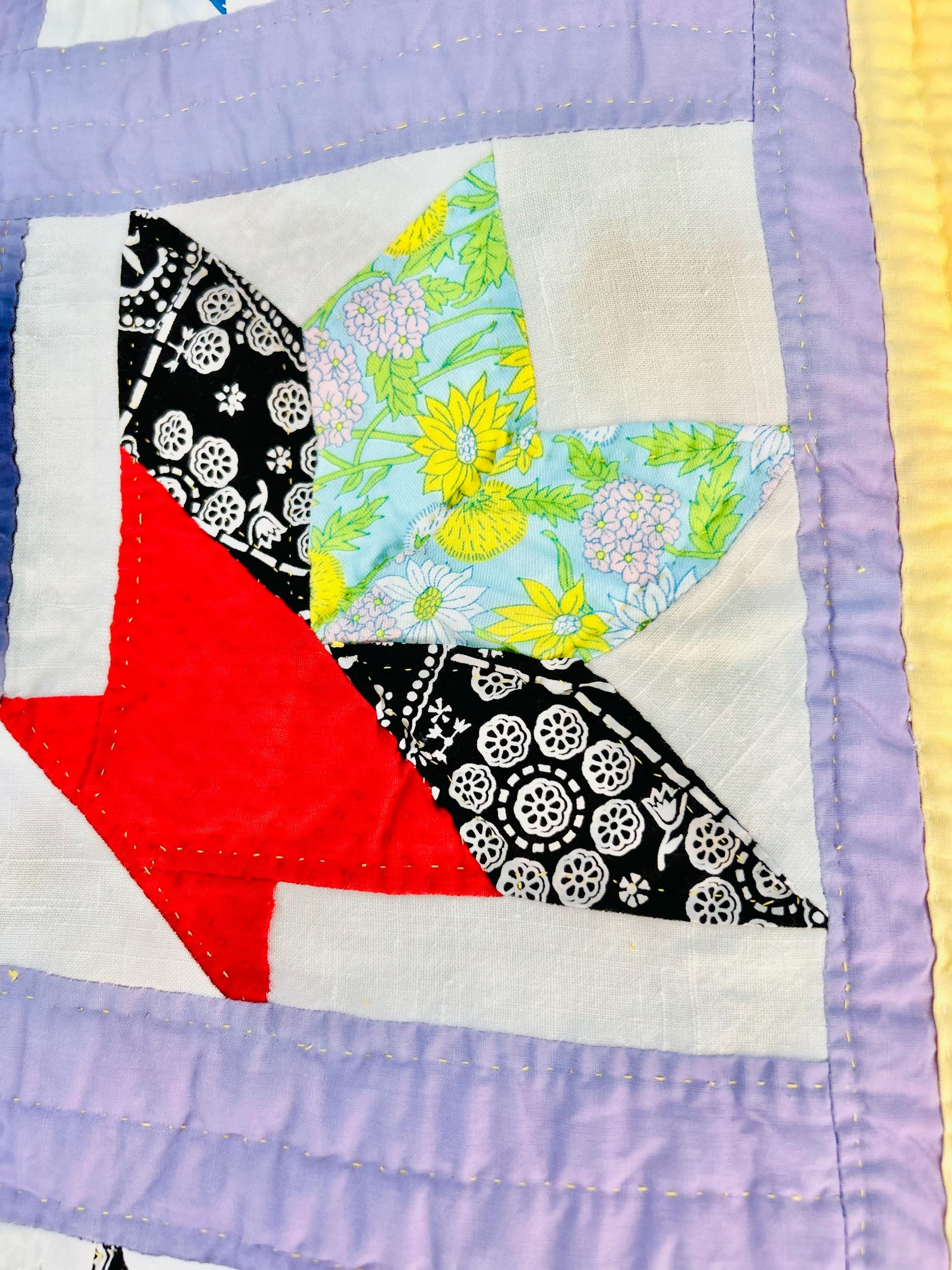 The quilt is in excellent condition with some light color transfer (see photos) and some color loss/fading of two small spots of the purple sashing. See photos.