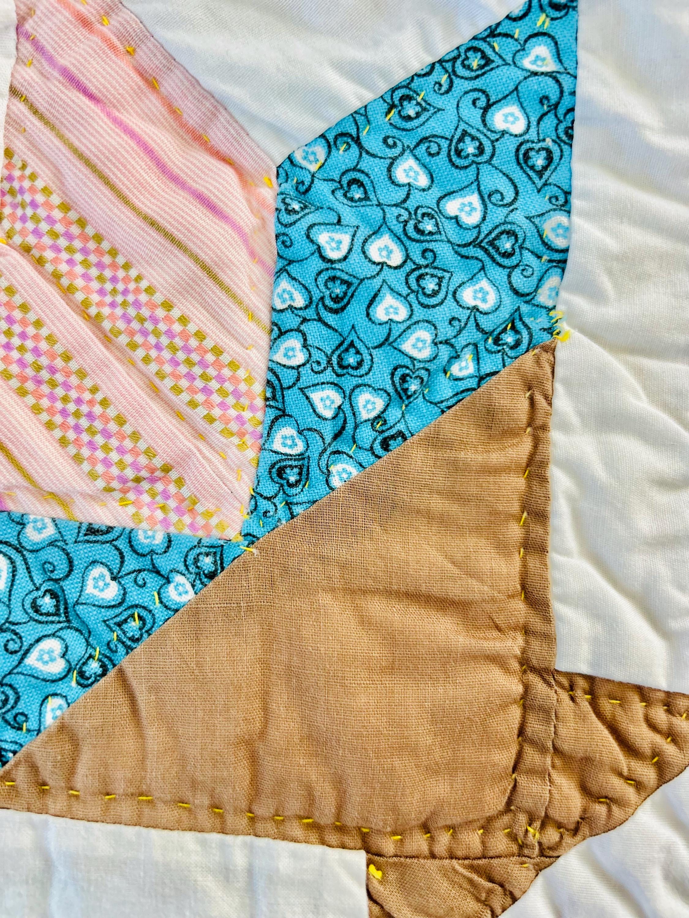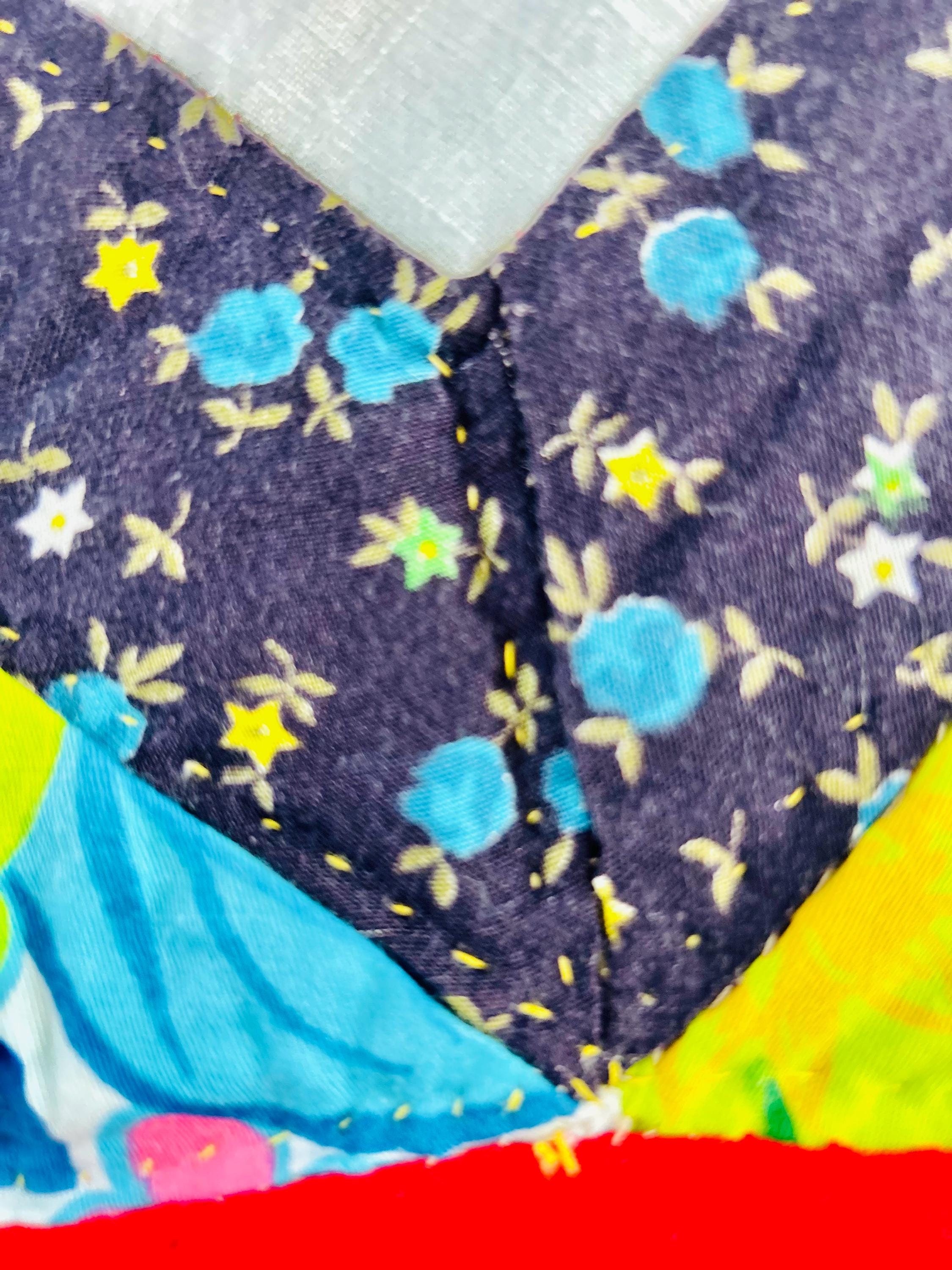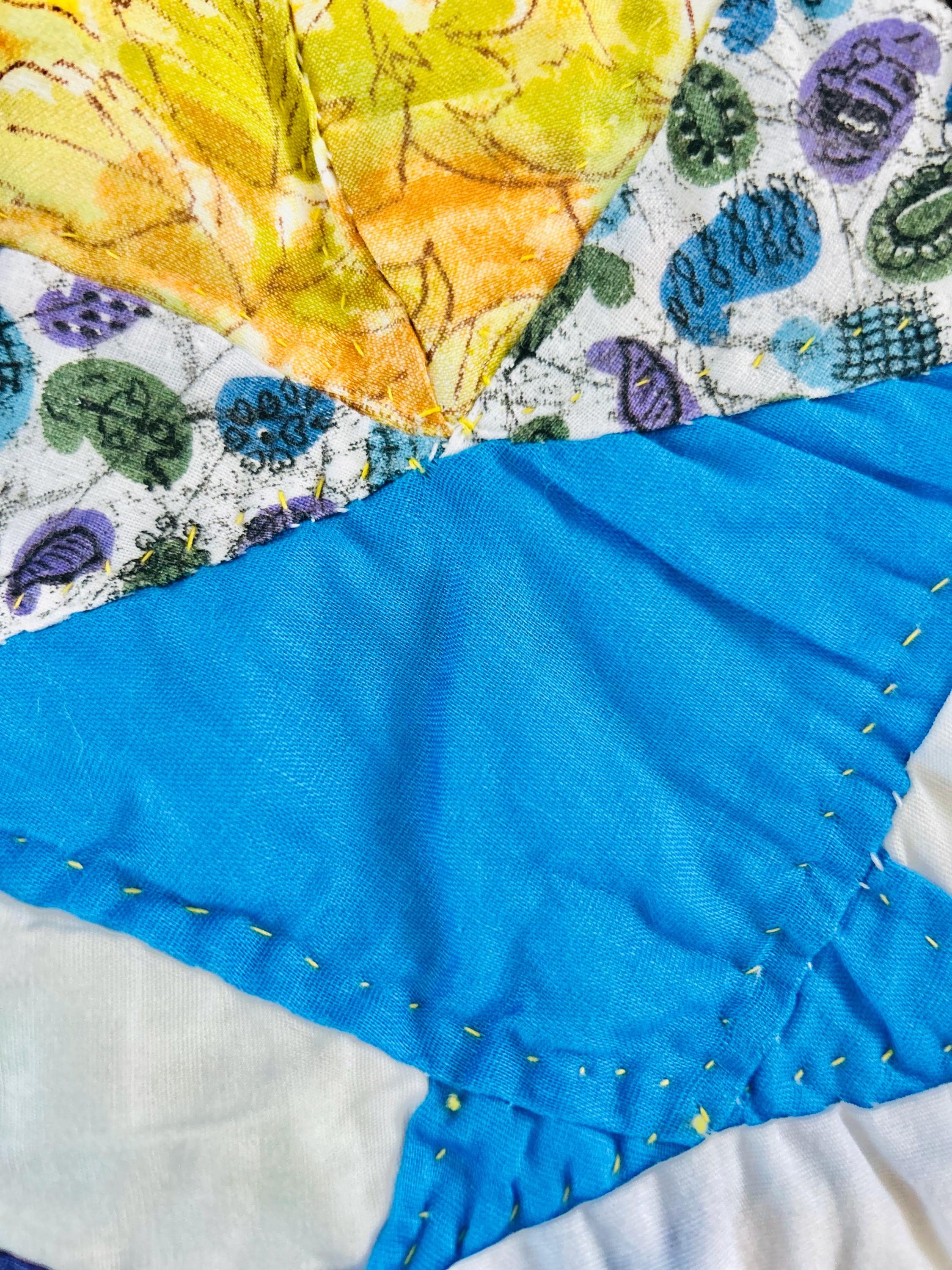 The back is bright yellow cotton which has been turned to the front and hand-stitched to form the binding. The batting is lightweight.