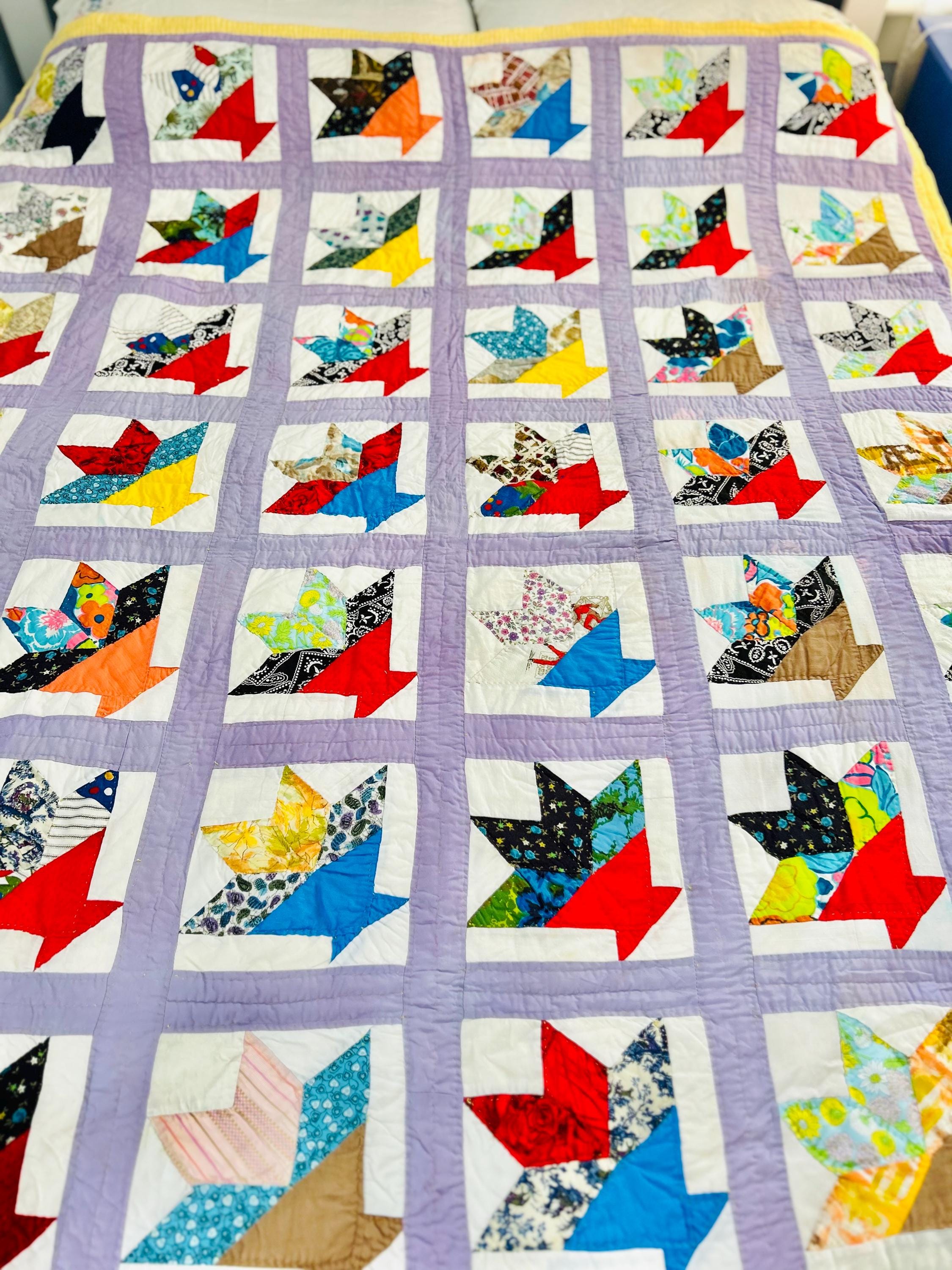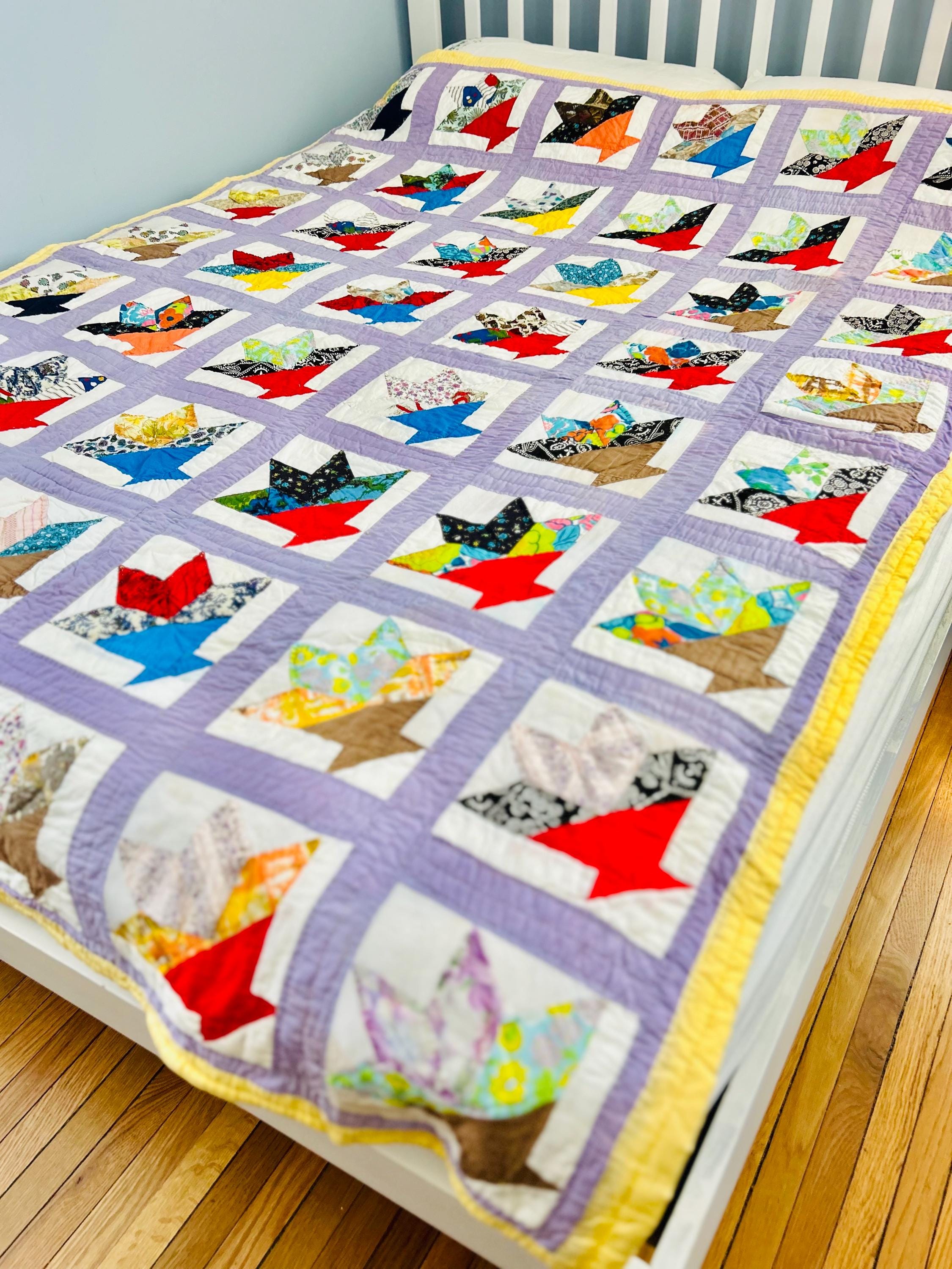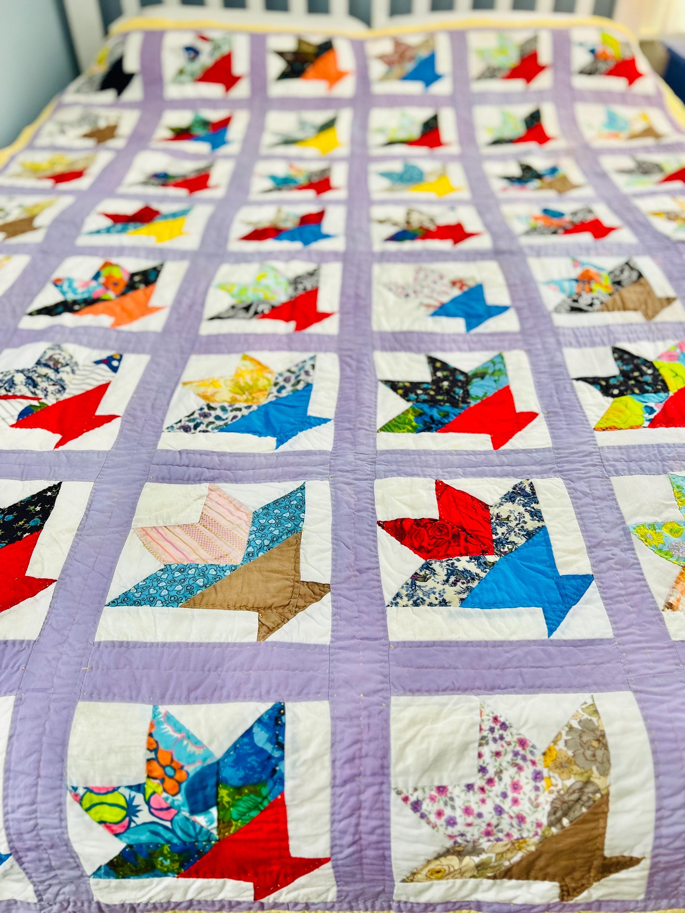 The quilt has been soaked, hand-washed and line-dried and measures 61 inches by 80 inches. It comes from a smoke-free and pet-free home and is shown on a queen-size bed.