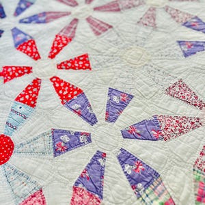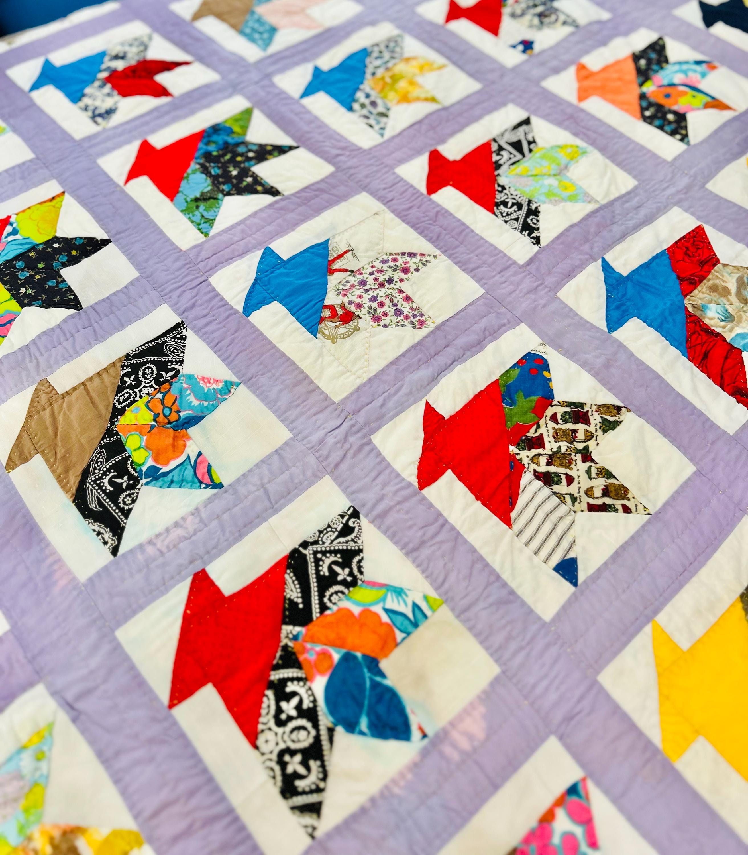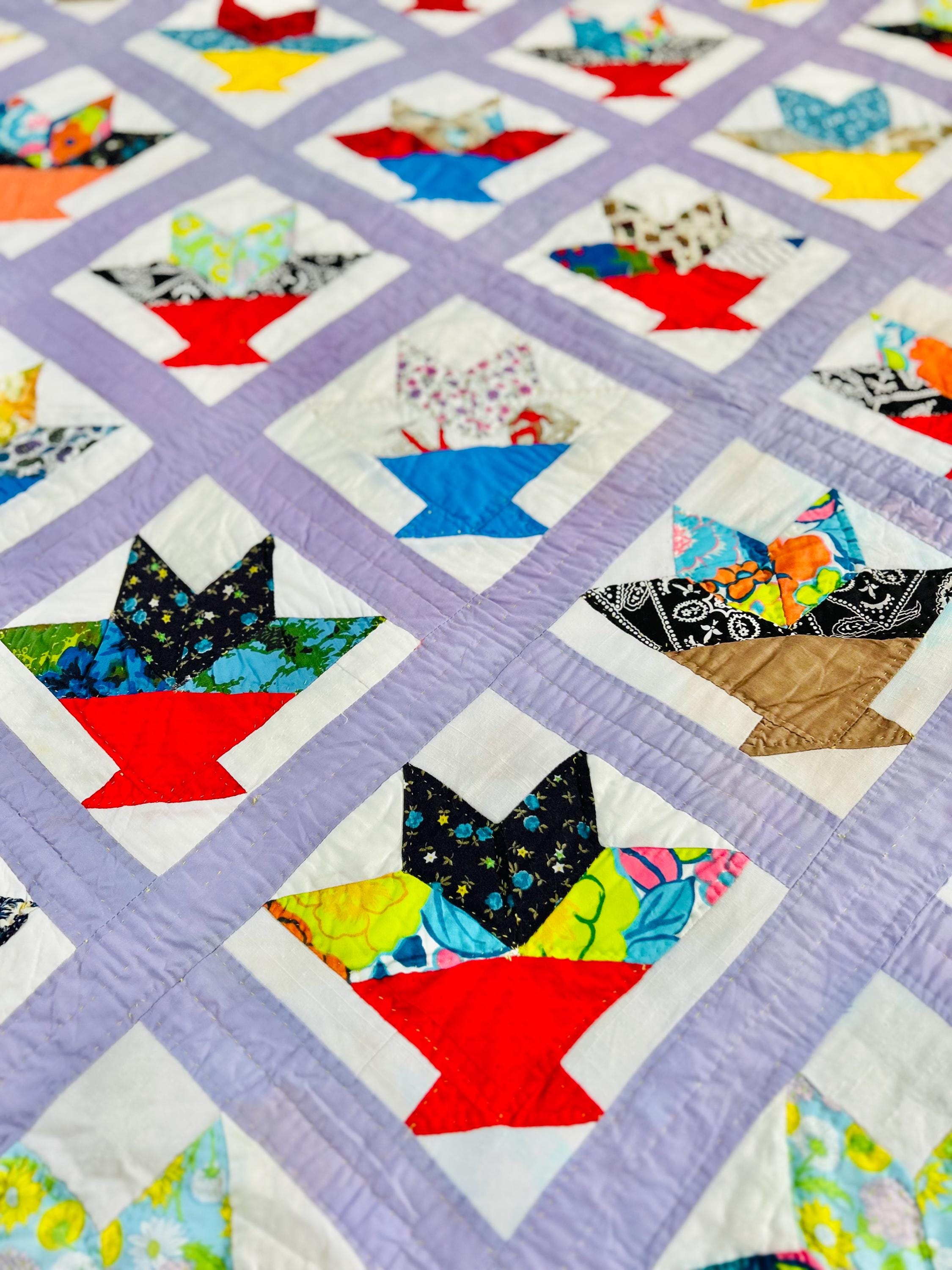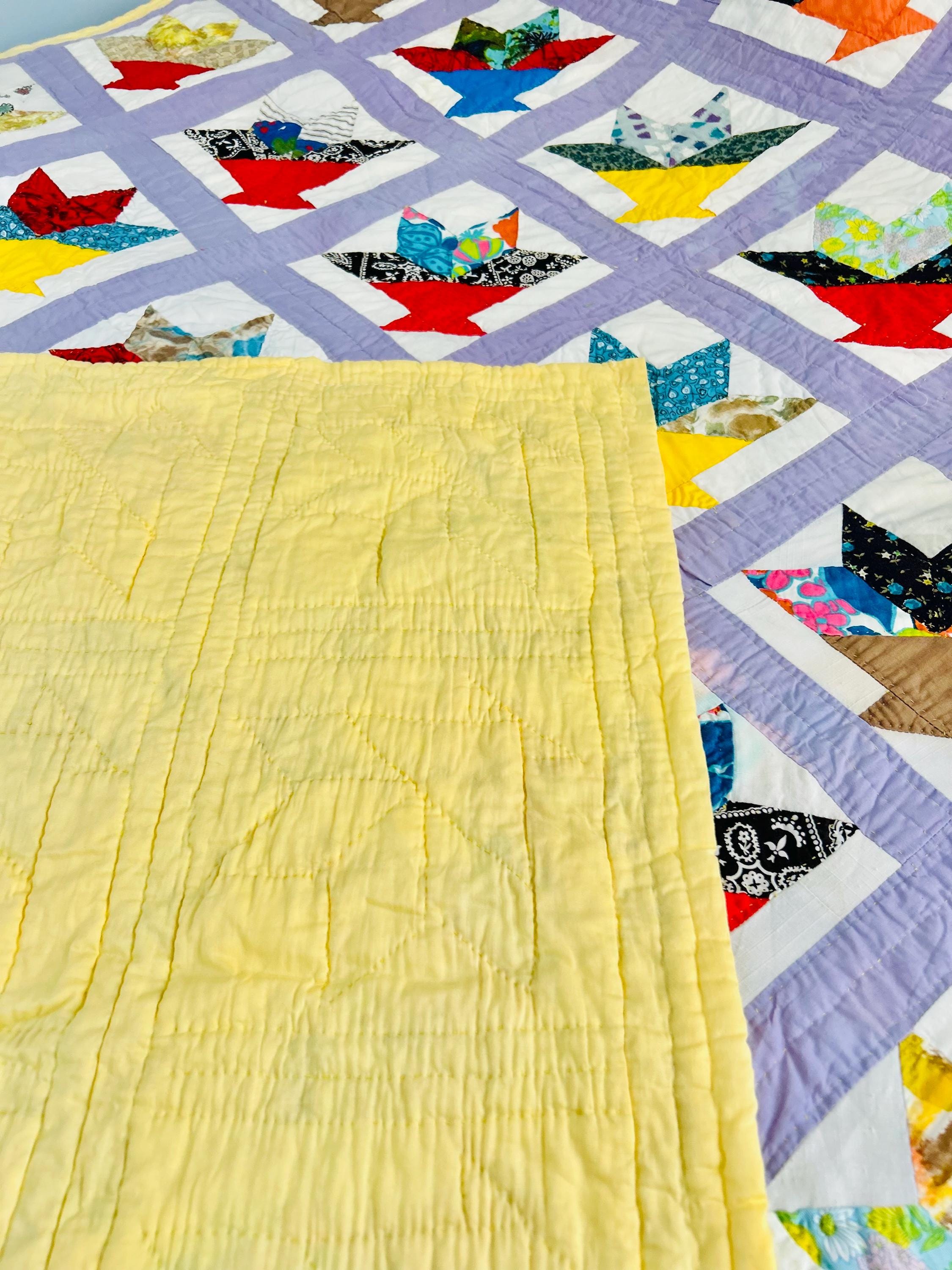 The quilt has been soaked, hand-washed and line-dried and measures 61 inches by 80 inches. It comes from a smoke-free and pet-free home and is shown on a queen-size bed.