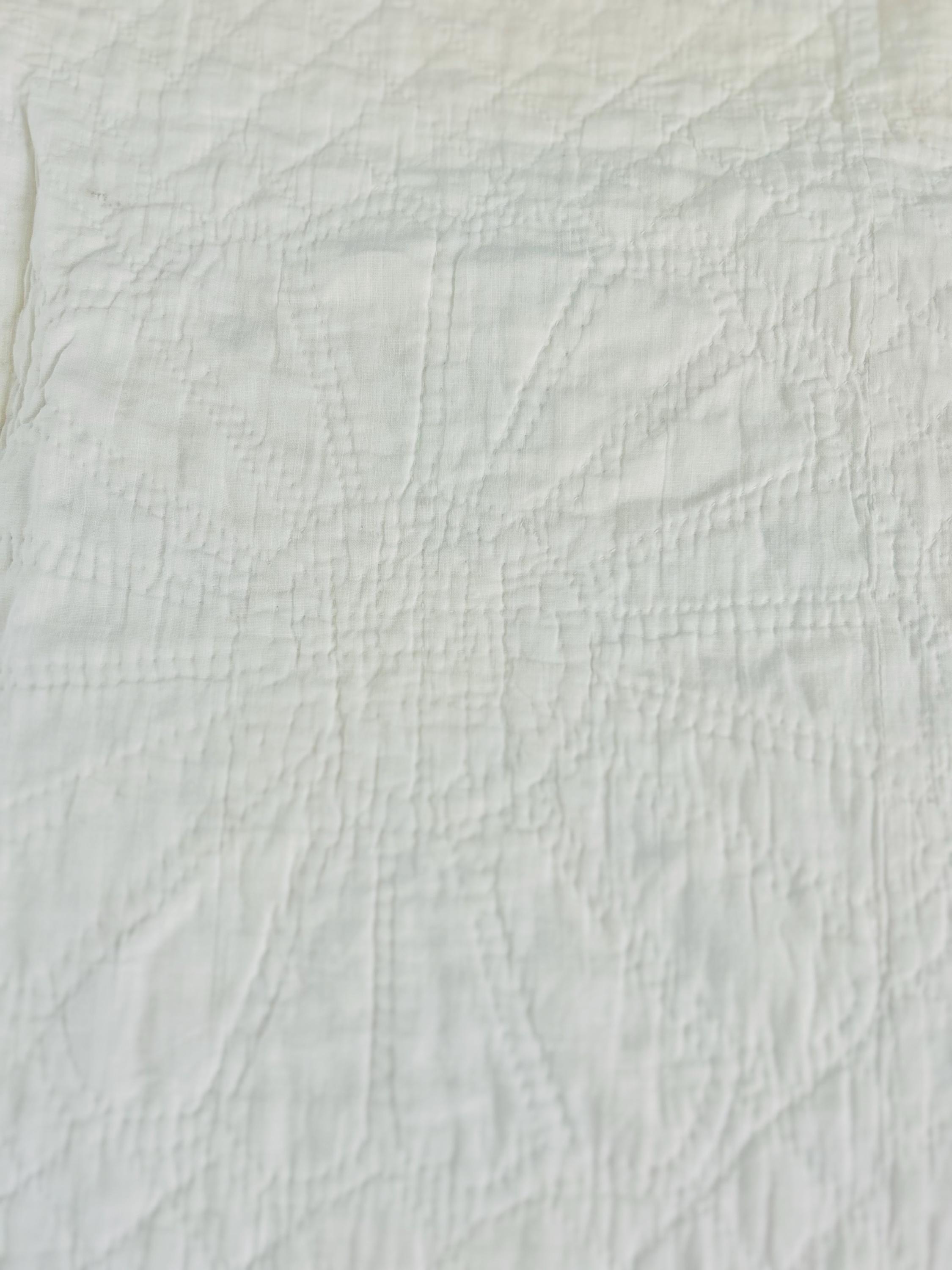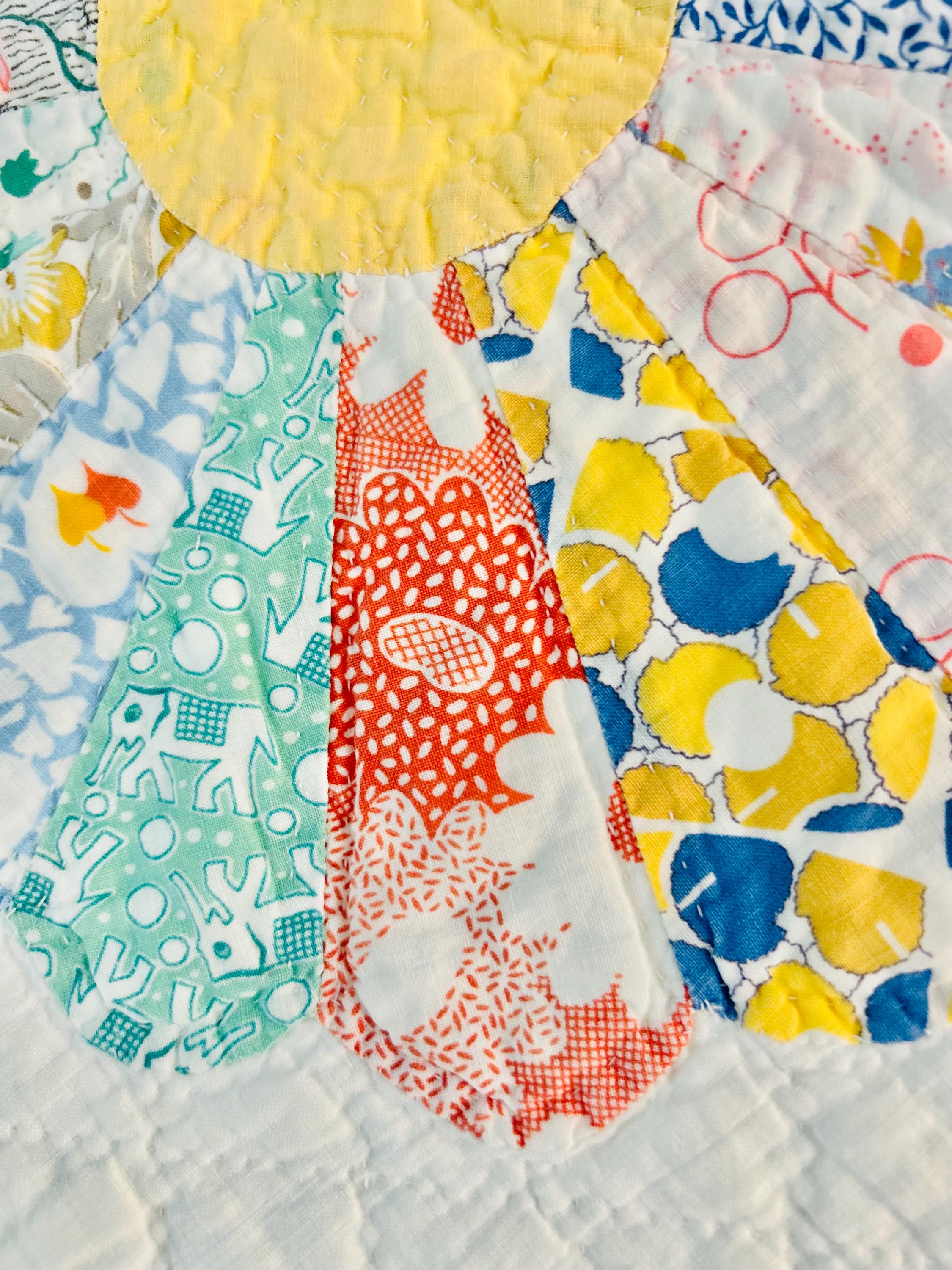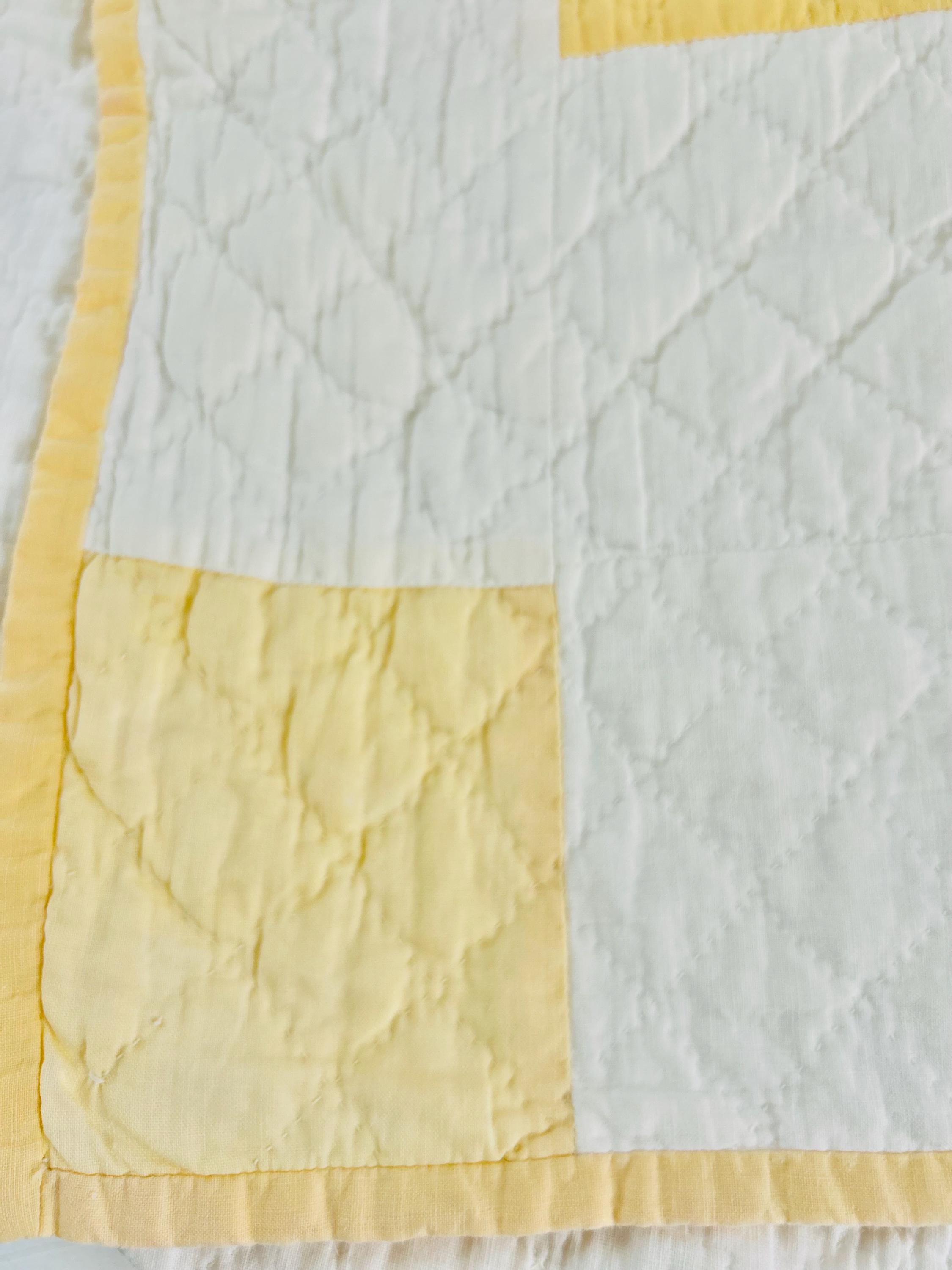The back is bright white cotton while the binding is yellow cotton that has been machine-stitched to the front and hand-stitched to the back. The cotton batting is very lightweight.