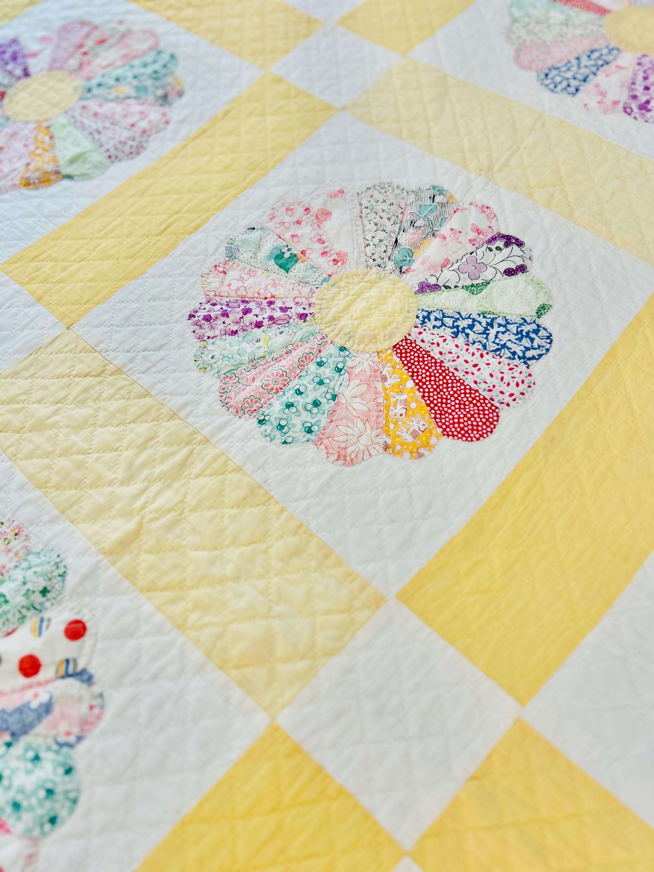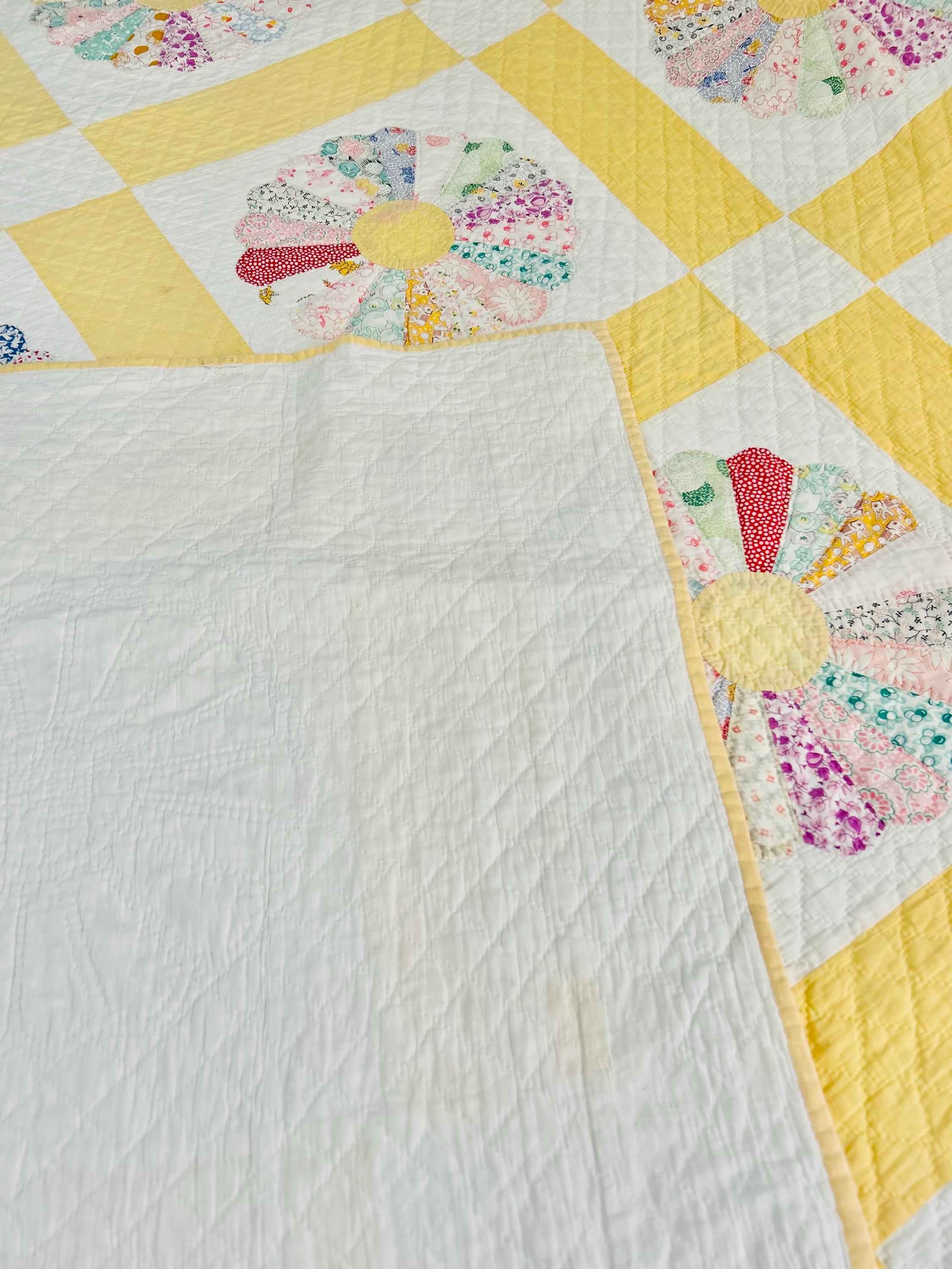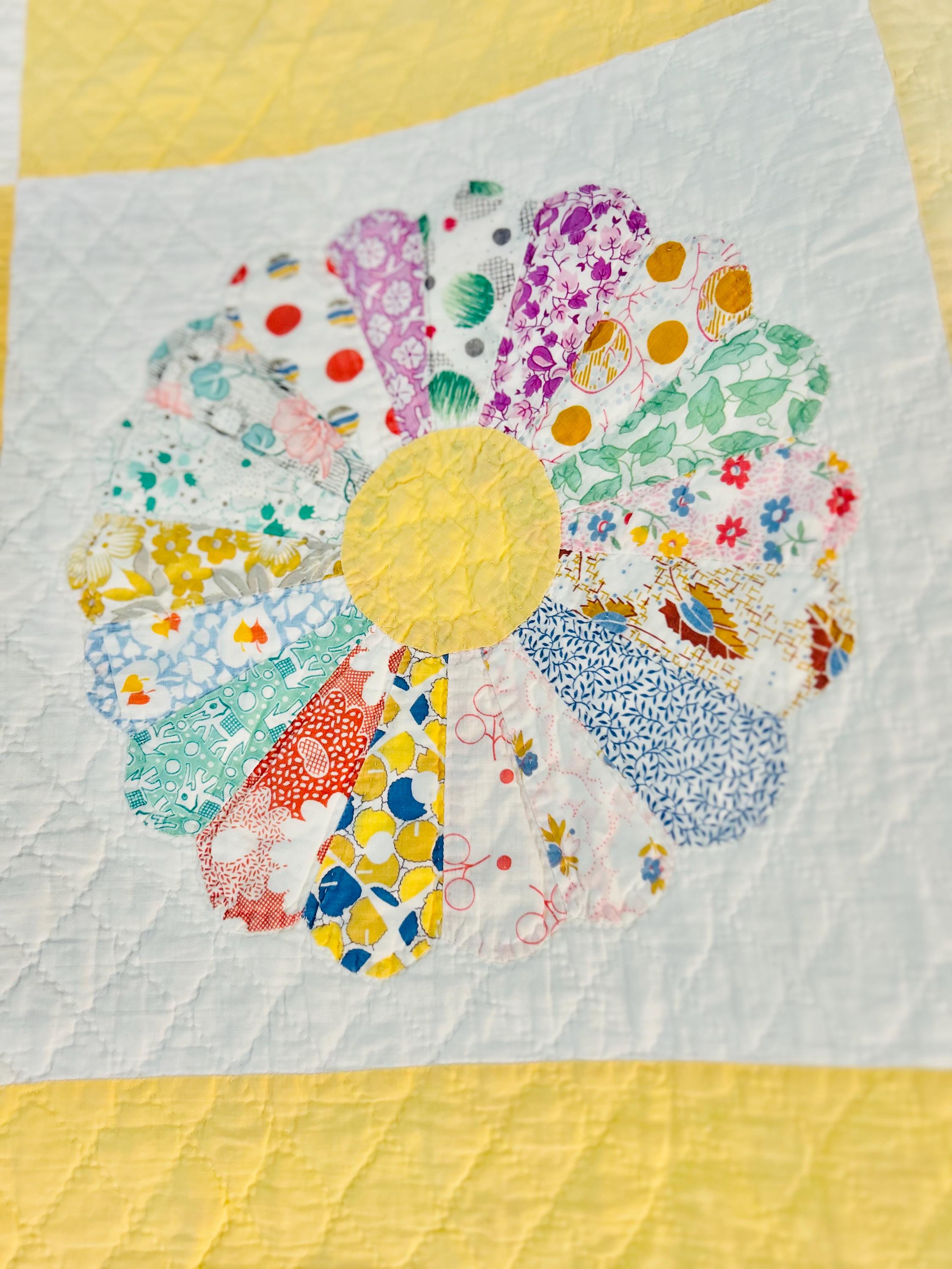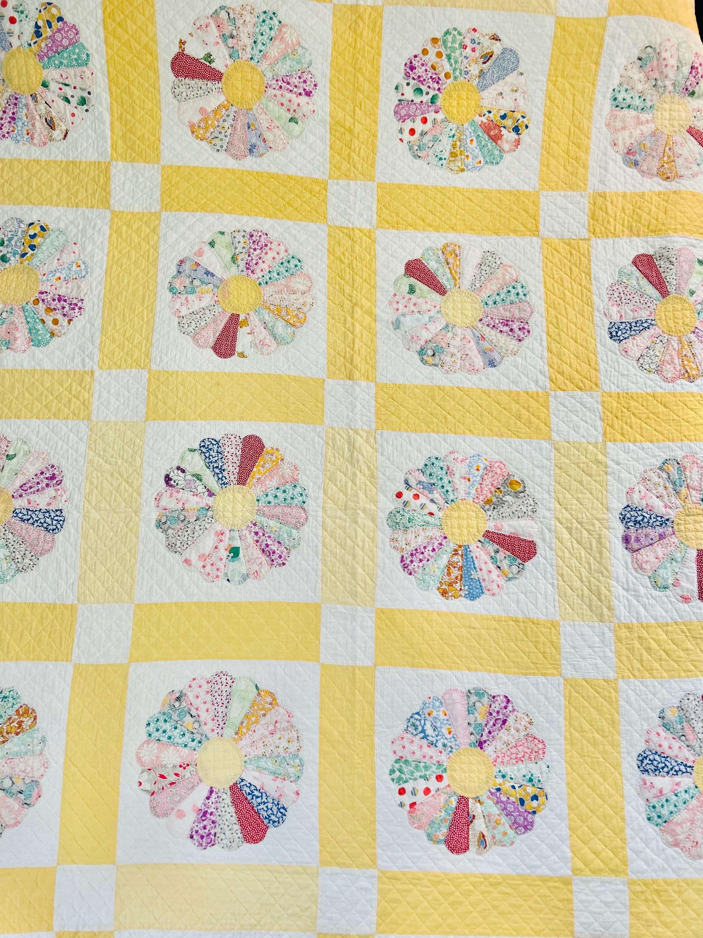 This bright yellow and white Dresden Plate Antique Quilt, circa 1930, is a beauty with meticulous hand-quilting in very tiny stitches forming diamonds and outlines of the Dresden Plates.