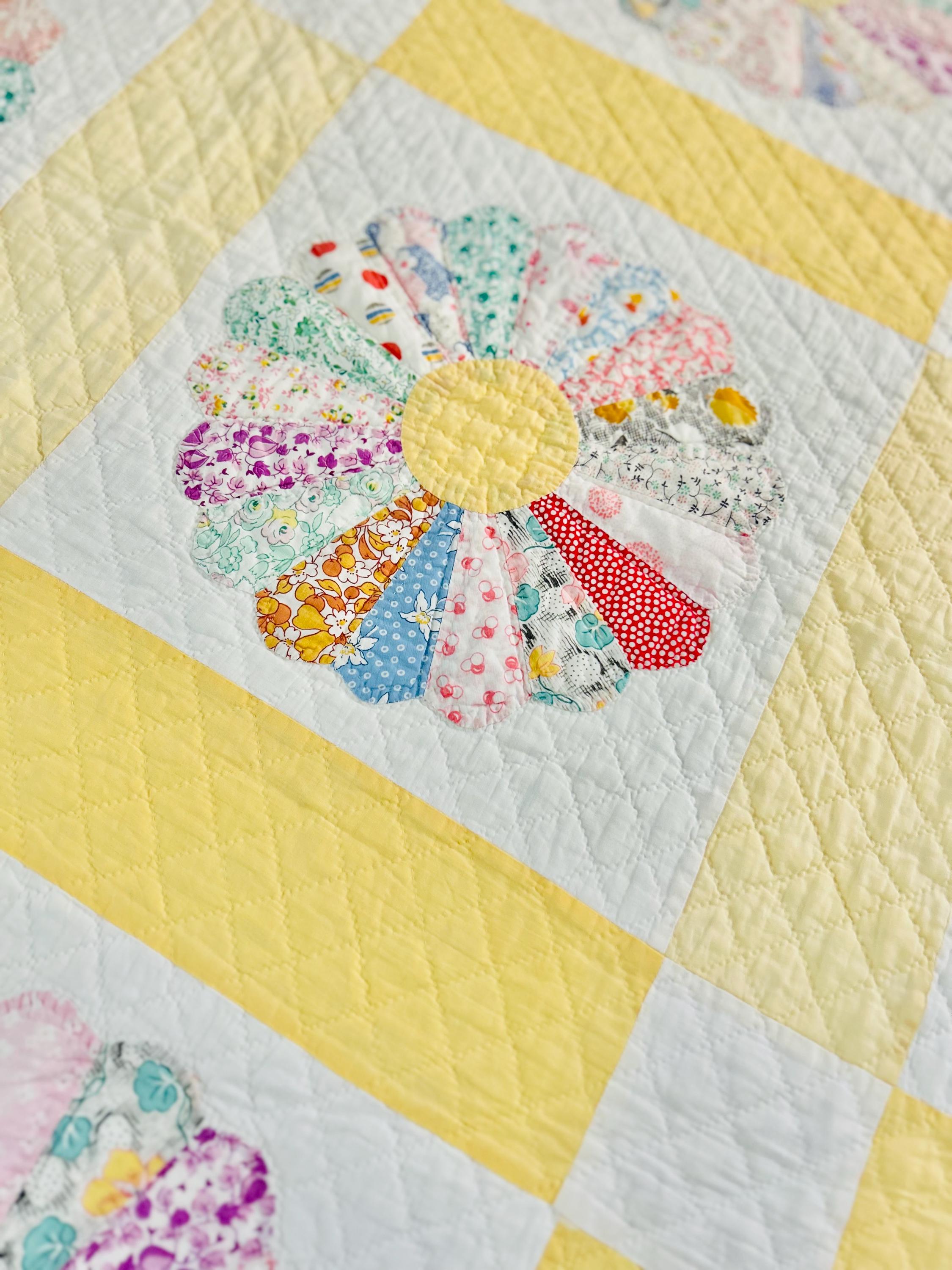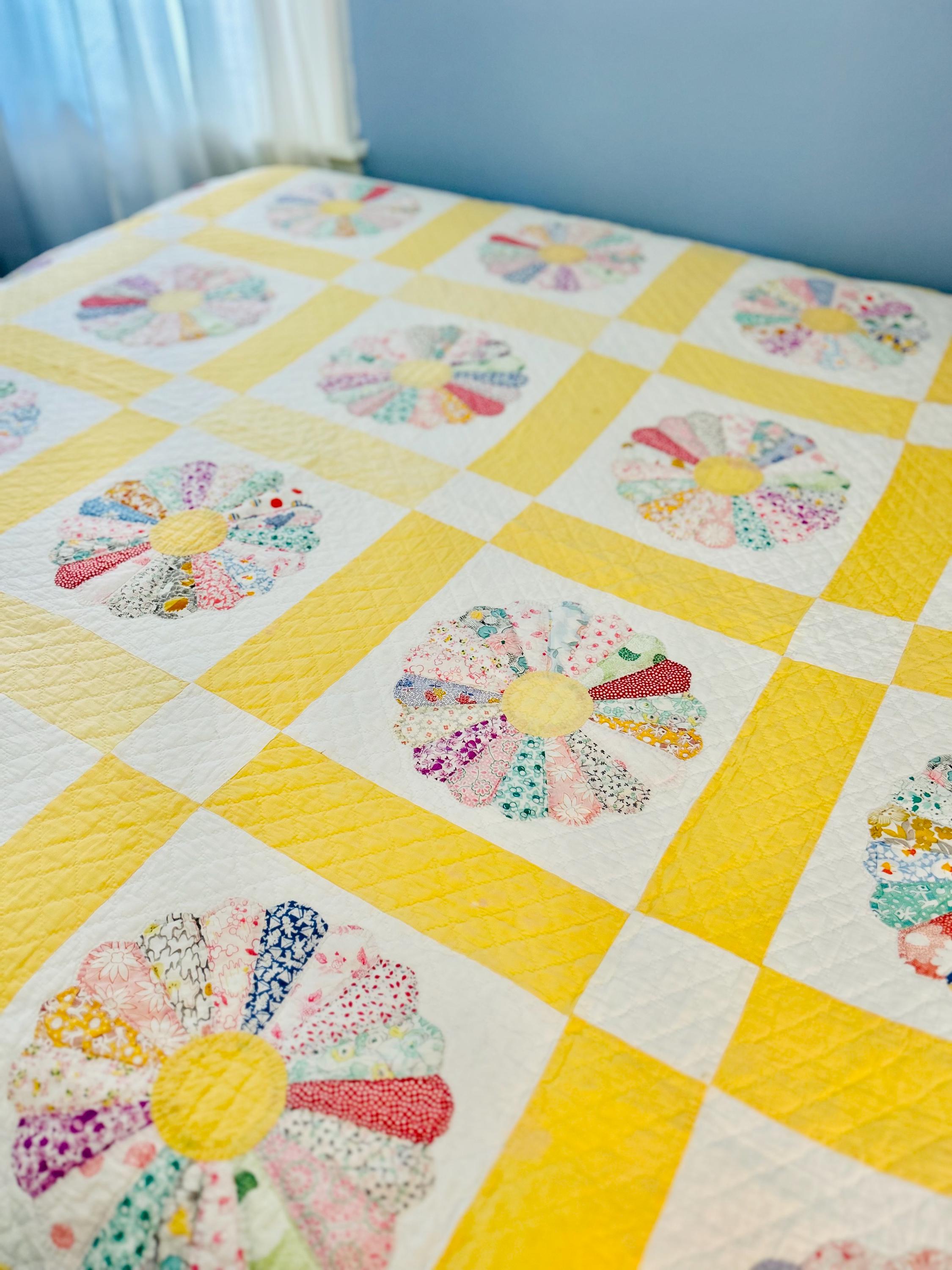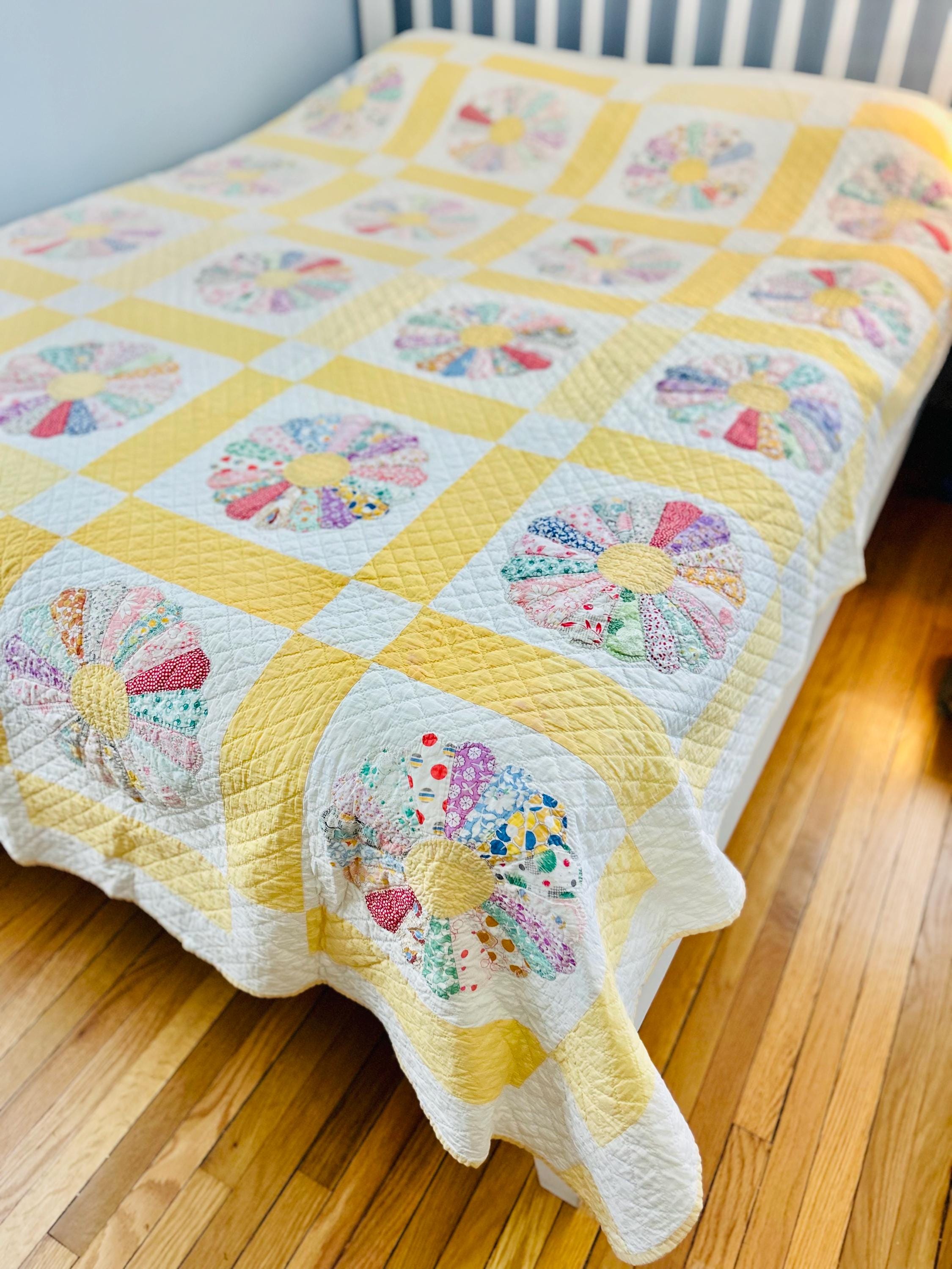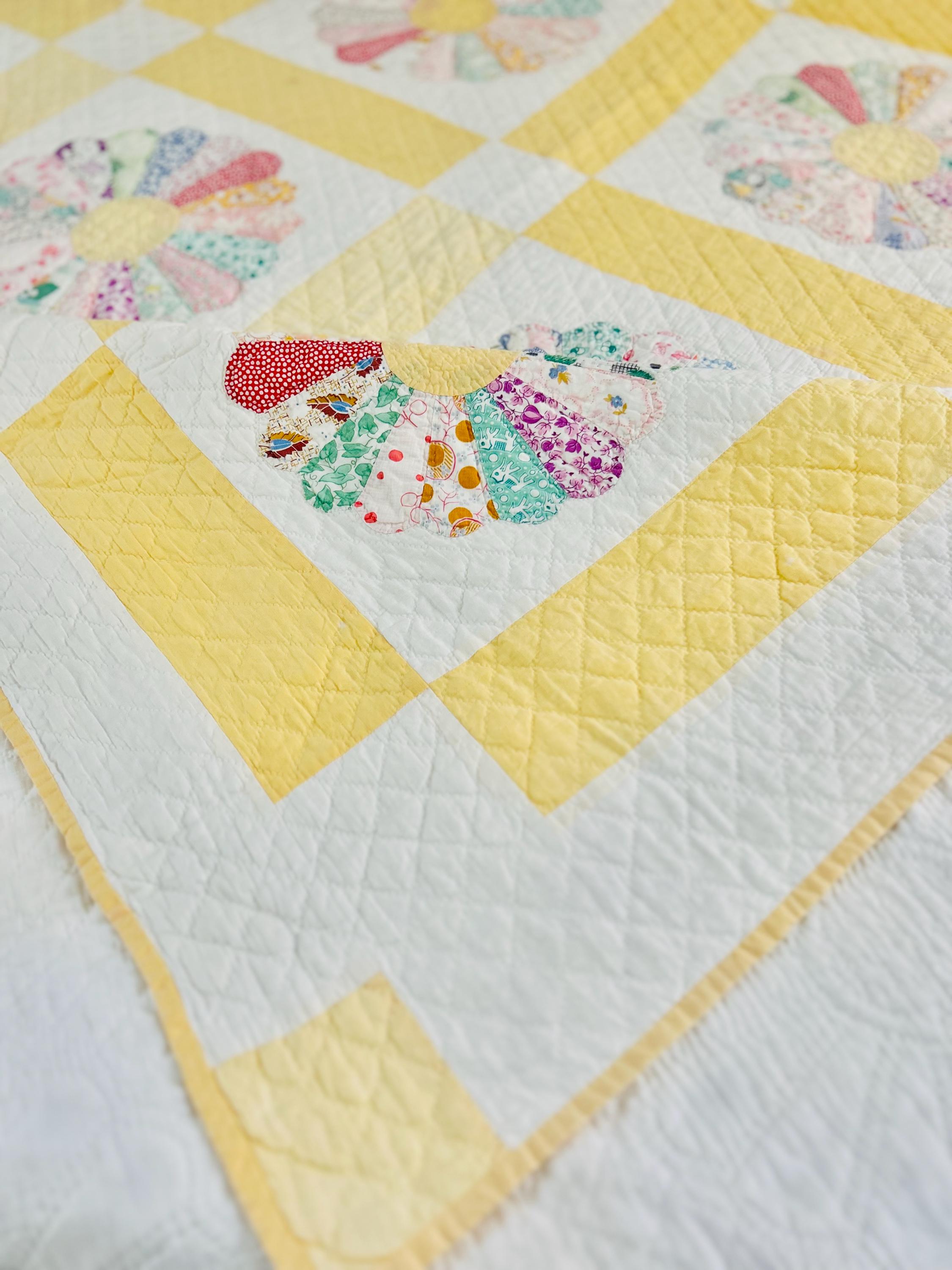 This bright yellow and white Dresden Plate Antique Quilt, circa 1930, is a beauty with meticulous hand-quilting in very tiny stitches forming diamonds and outlines of the Dresden Plates.