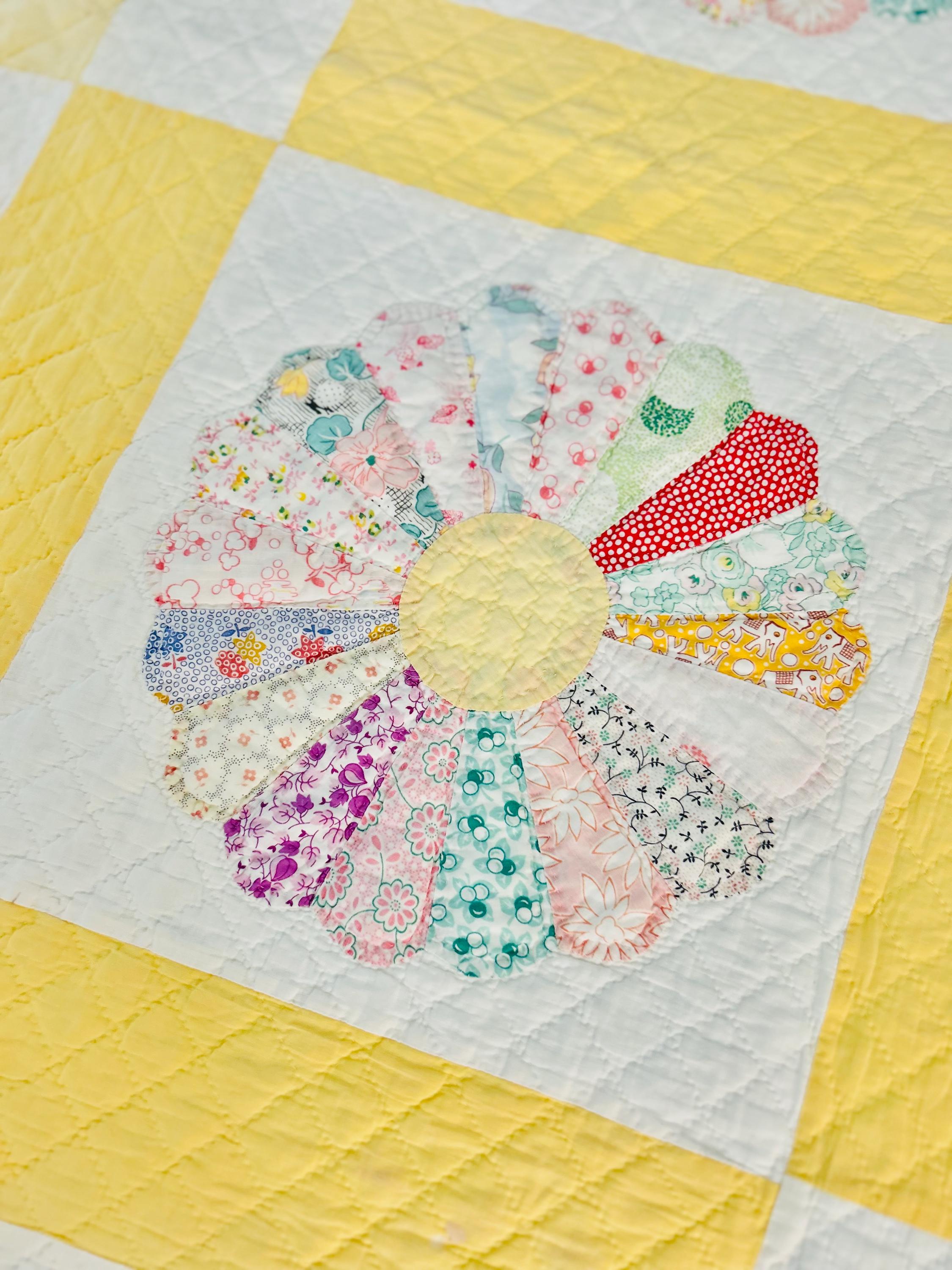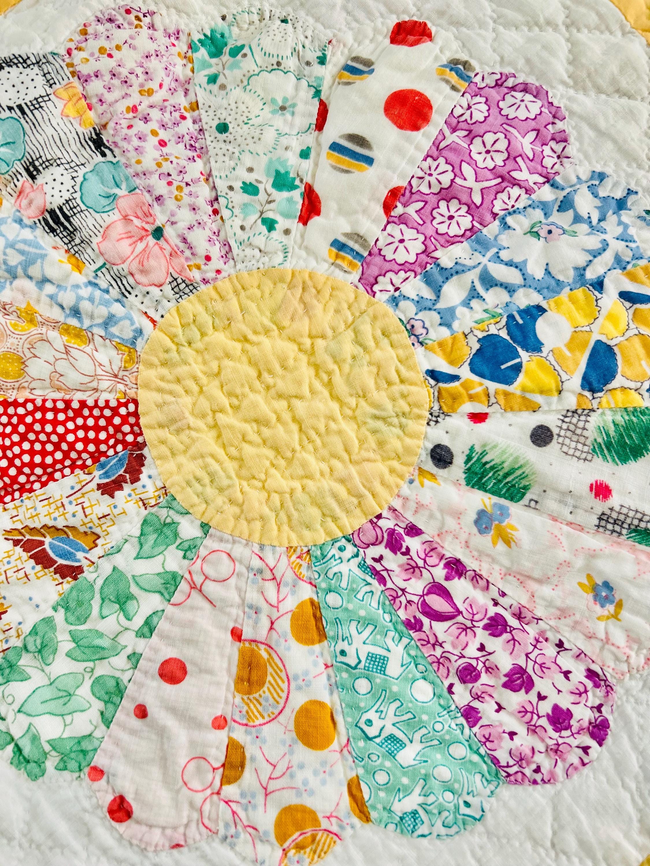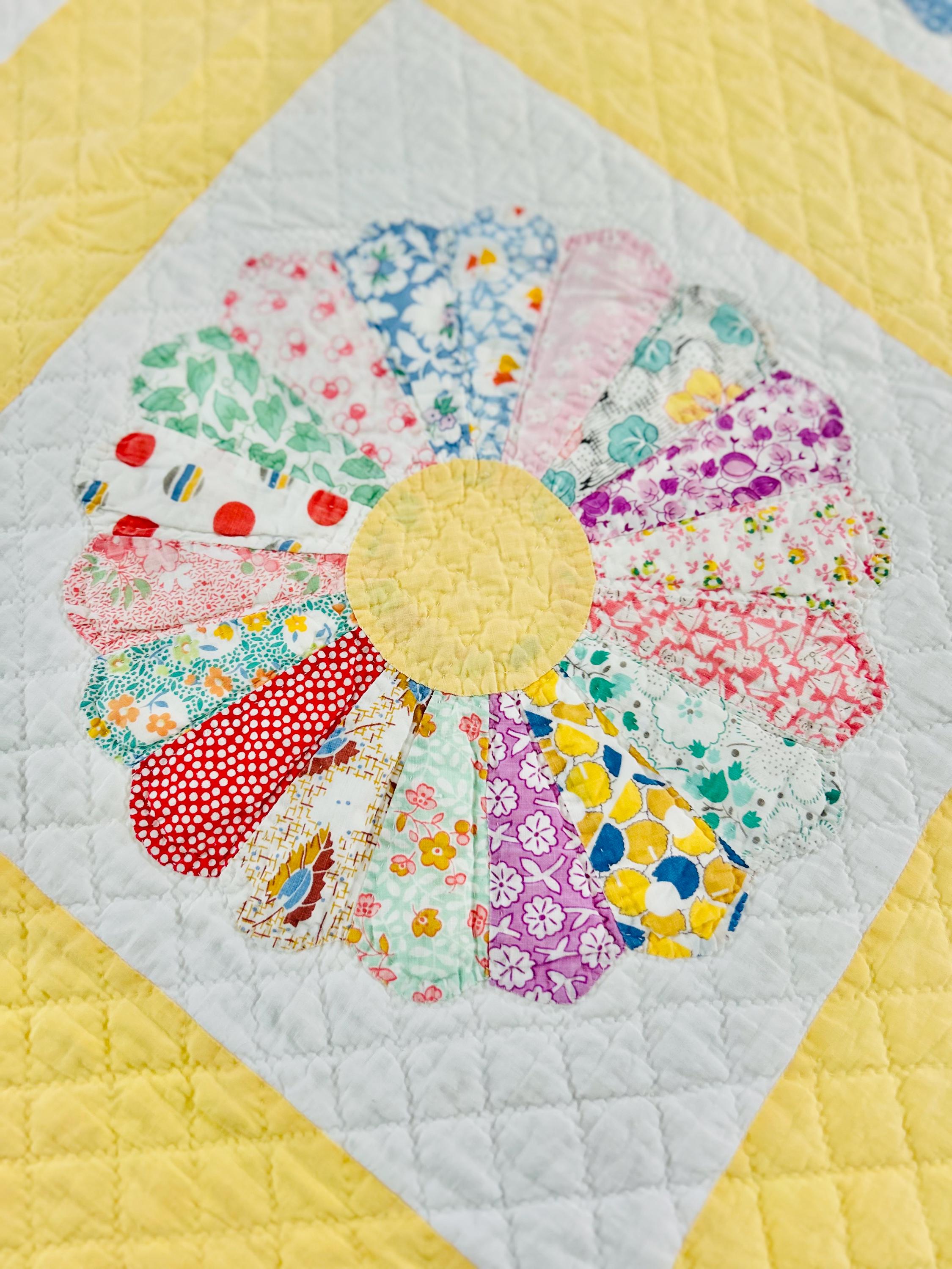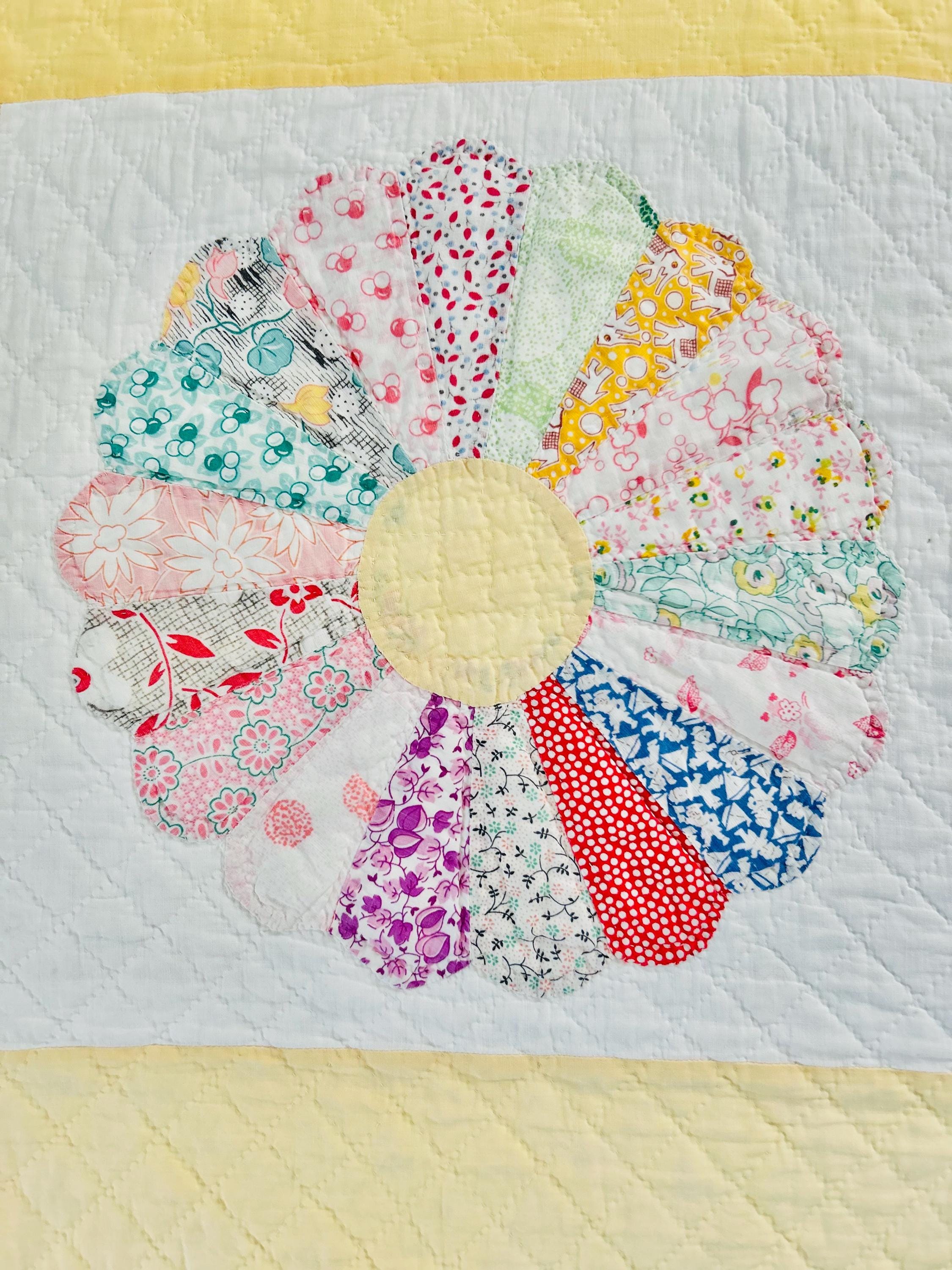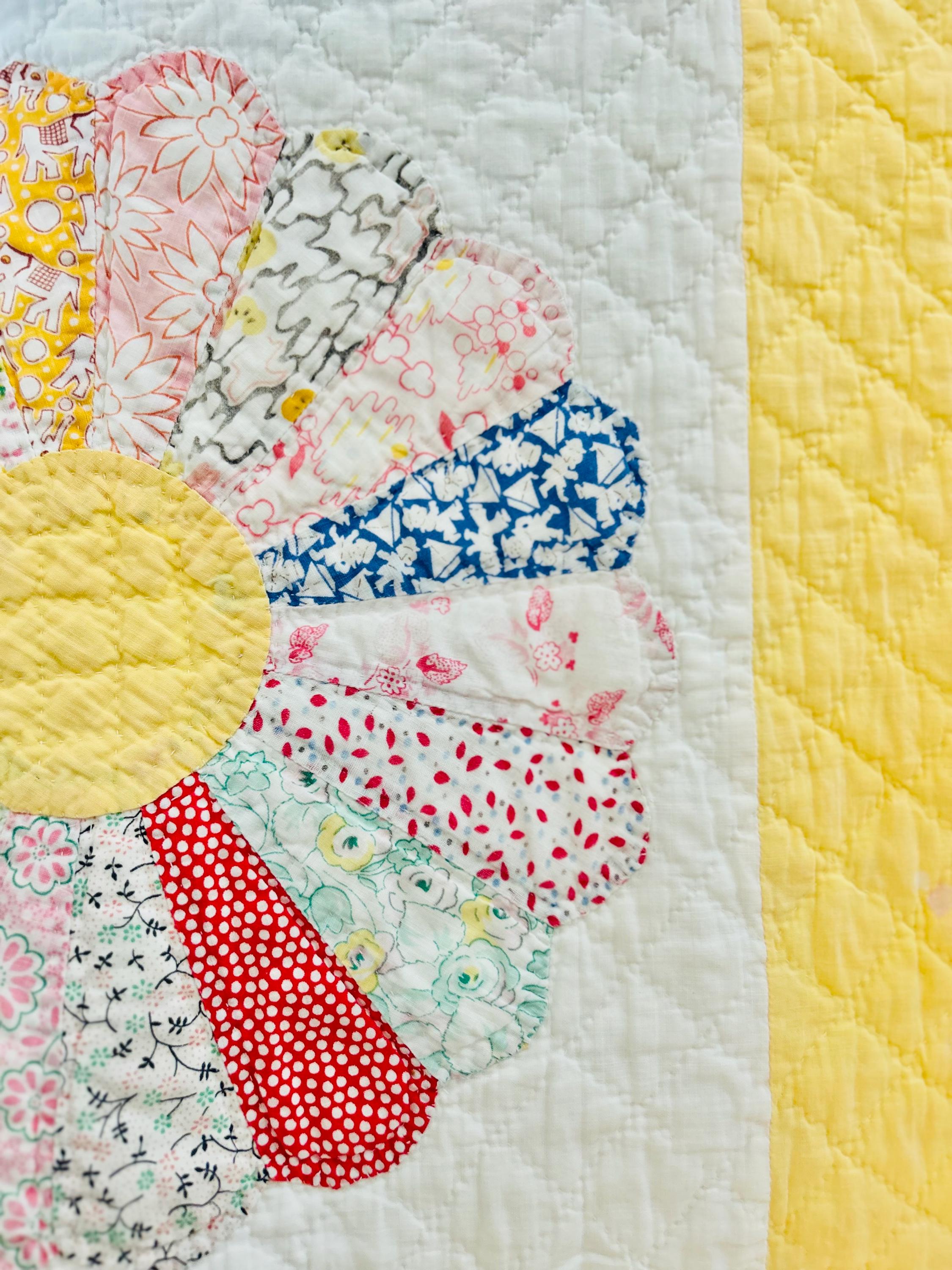 This bright yellow and white Dresden Plate Antique Quilt, circa 1930, is a beauty with meticulous hand-quilting in very tiny stitches forming diamonds and outlines of the Dresden Plates.