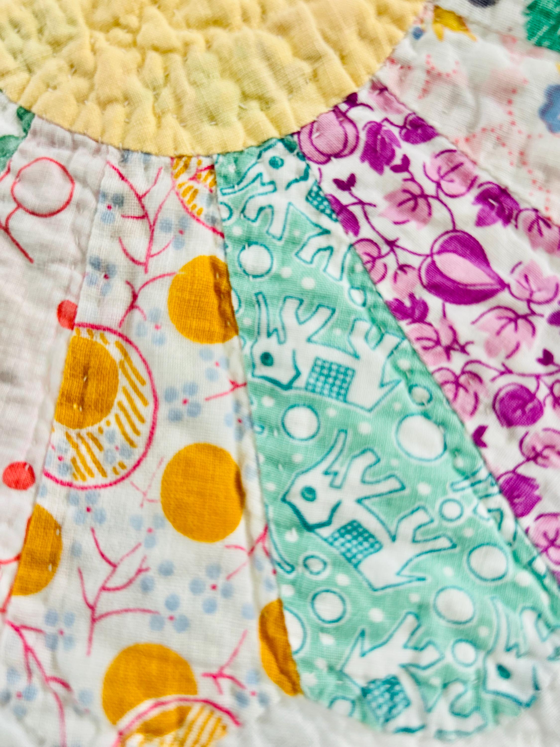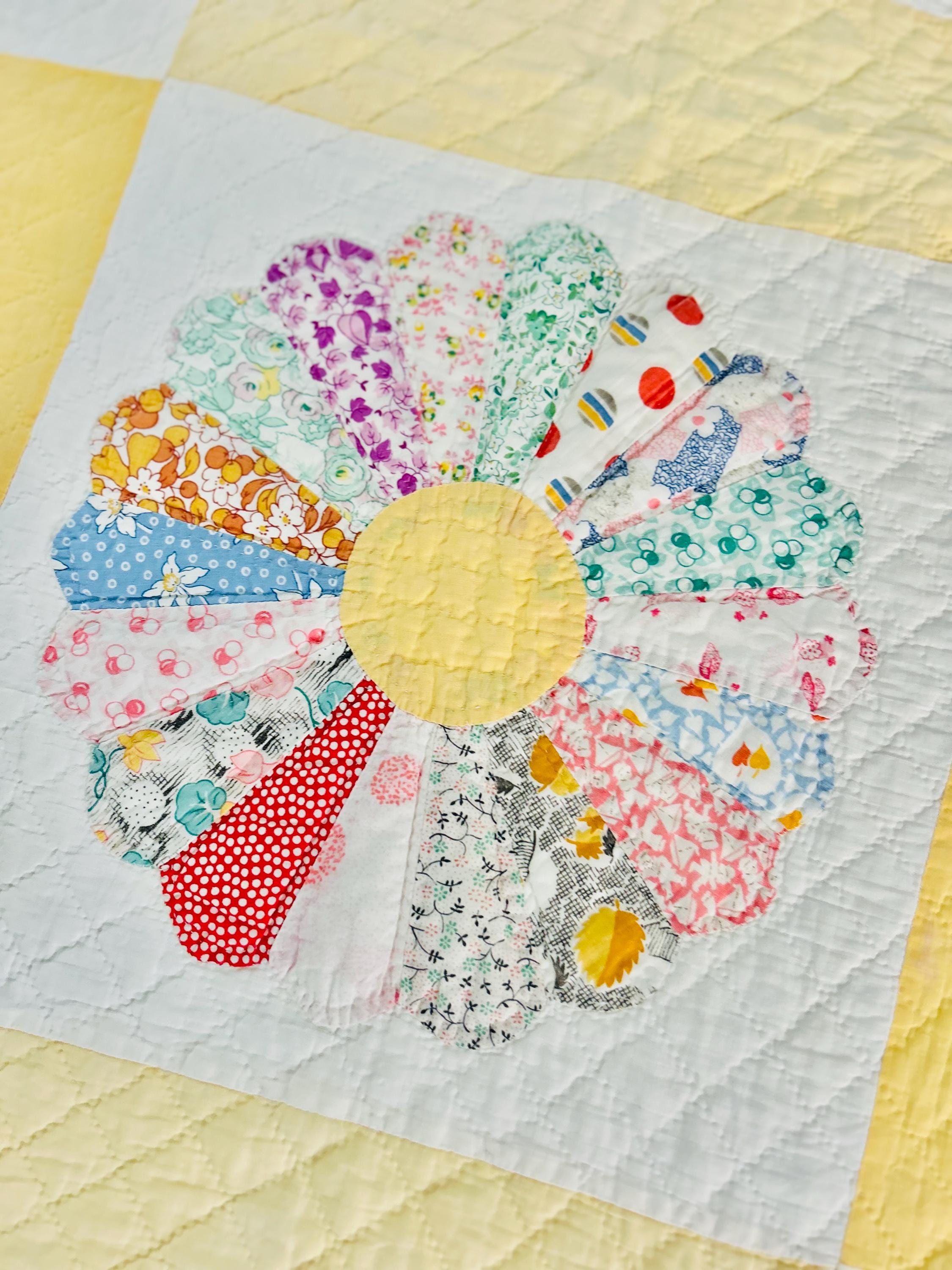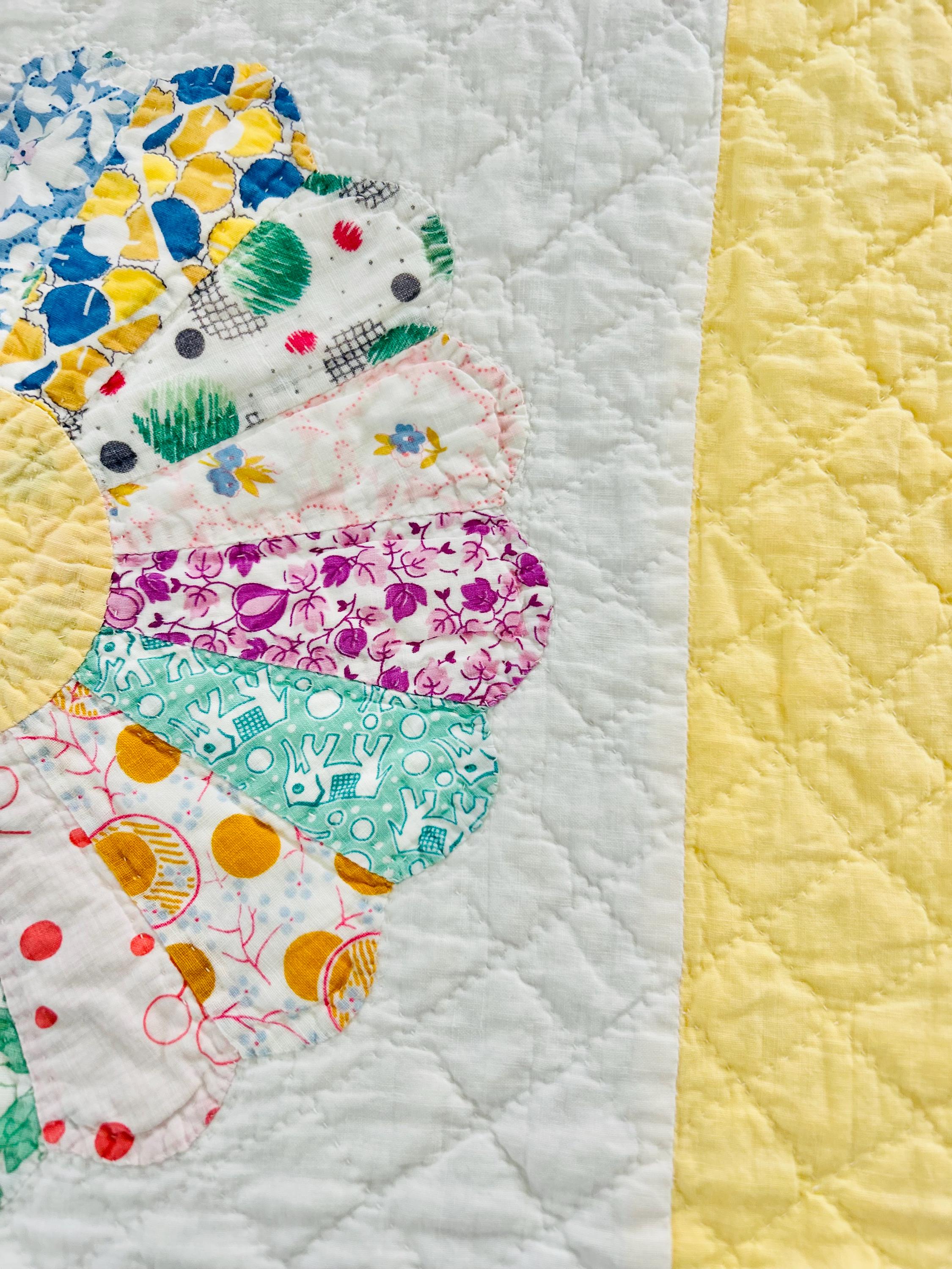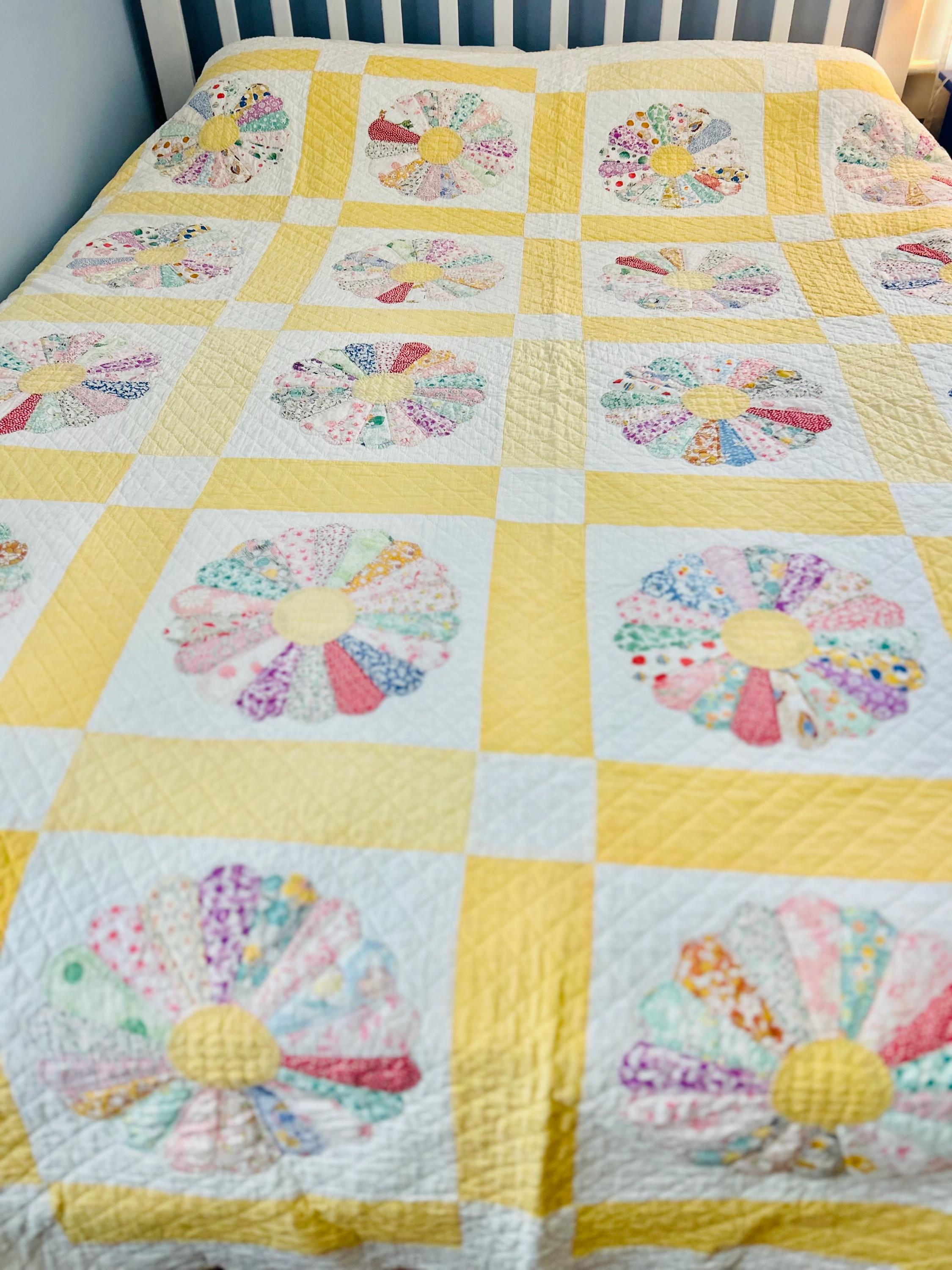This bright yellow and white Dresden Plate Antique Quilt, circa 1930, is a beauty with meticulous hand-quilting in very tiny stitches forming diamonds and outlines of the Dresden Plates.
