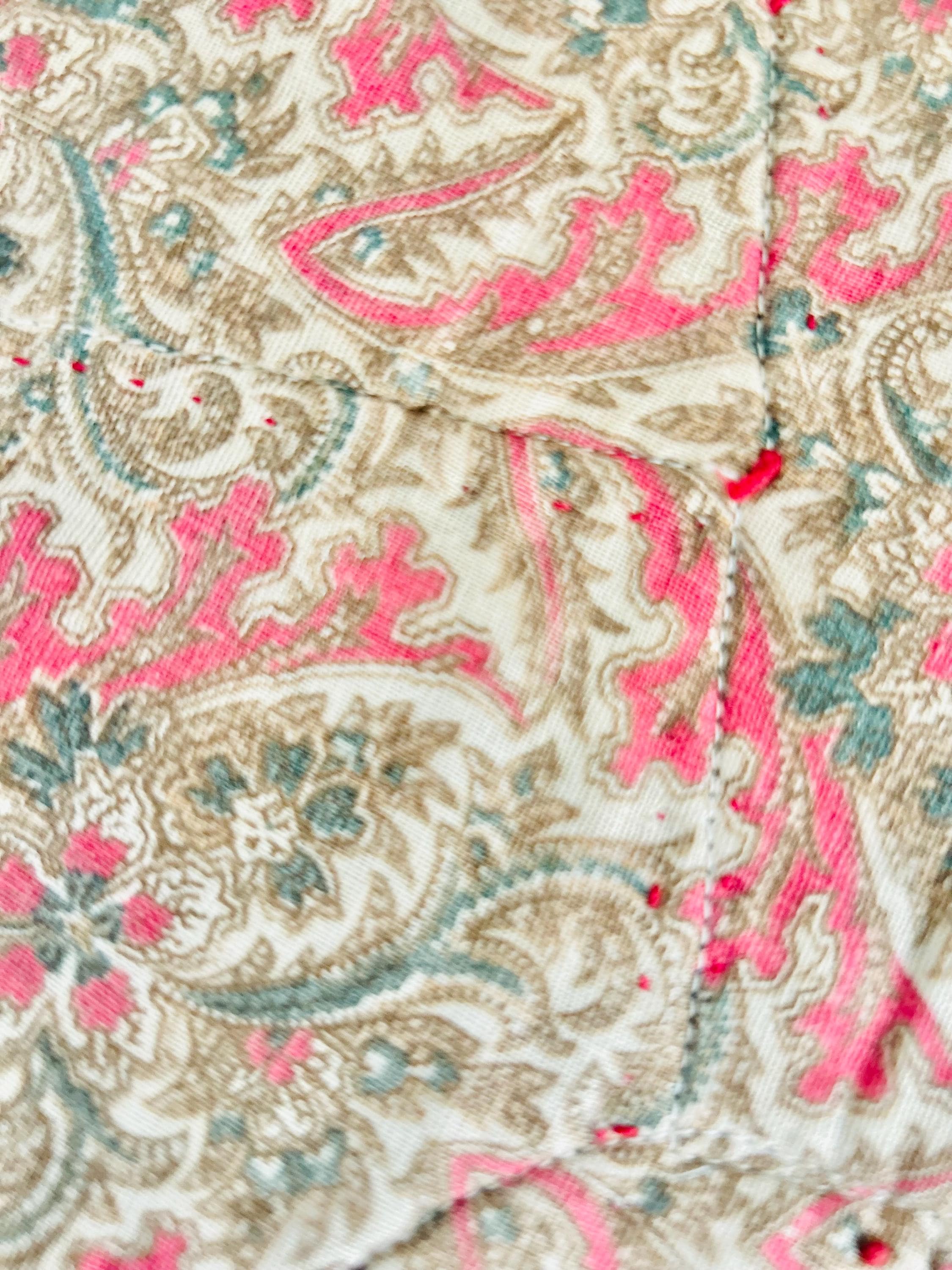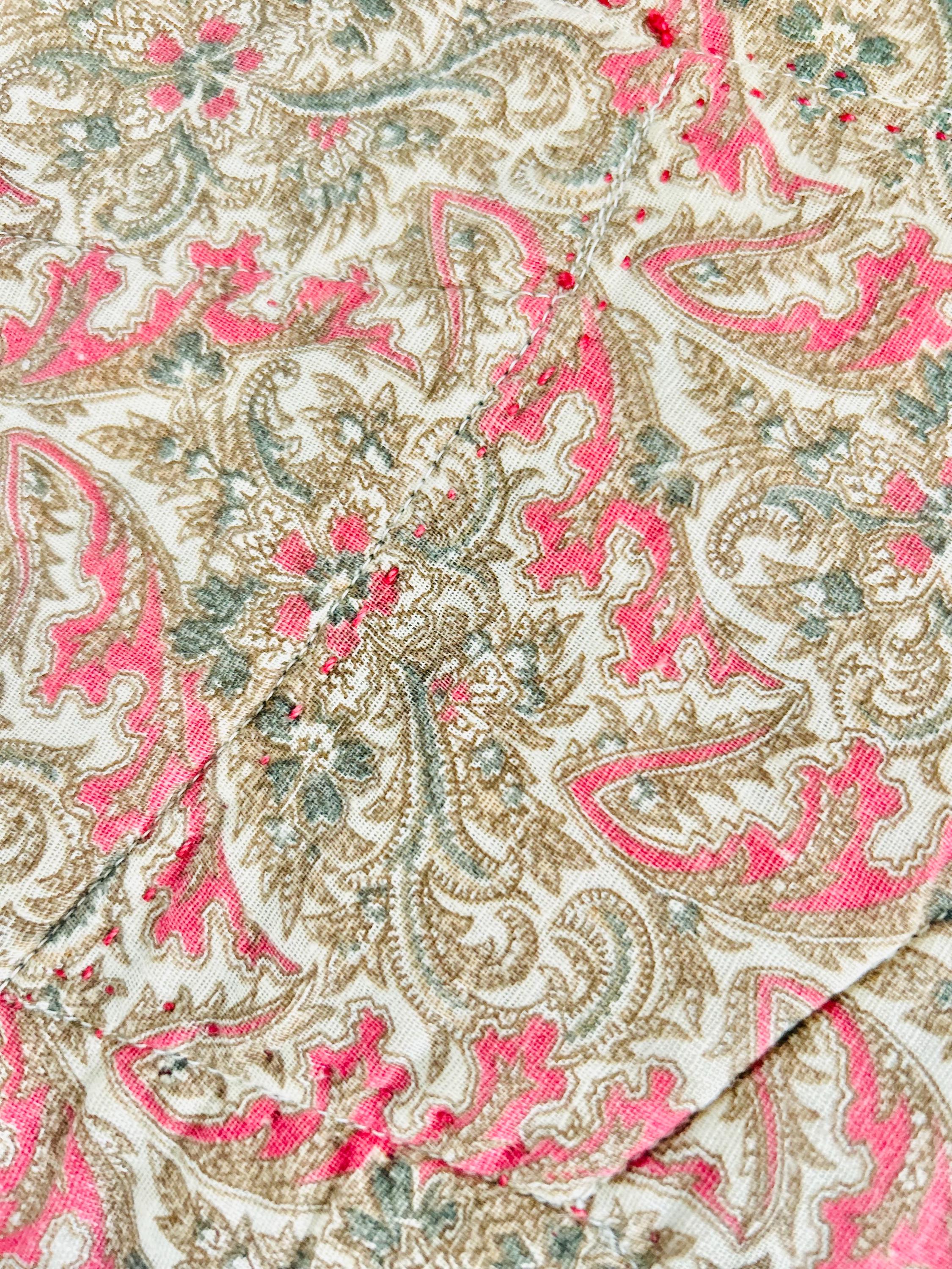 The back is a beautiful late 19 Century cotton with a combination floral/geometric pattern in tans and pinks. The binding is maroon/red cotton that has been machine-stitched to the front and hand-stitched to the back. The cotton batting is lightweight.
