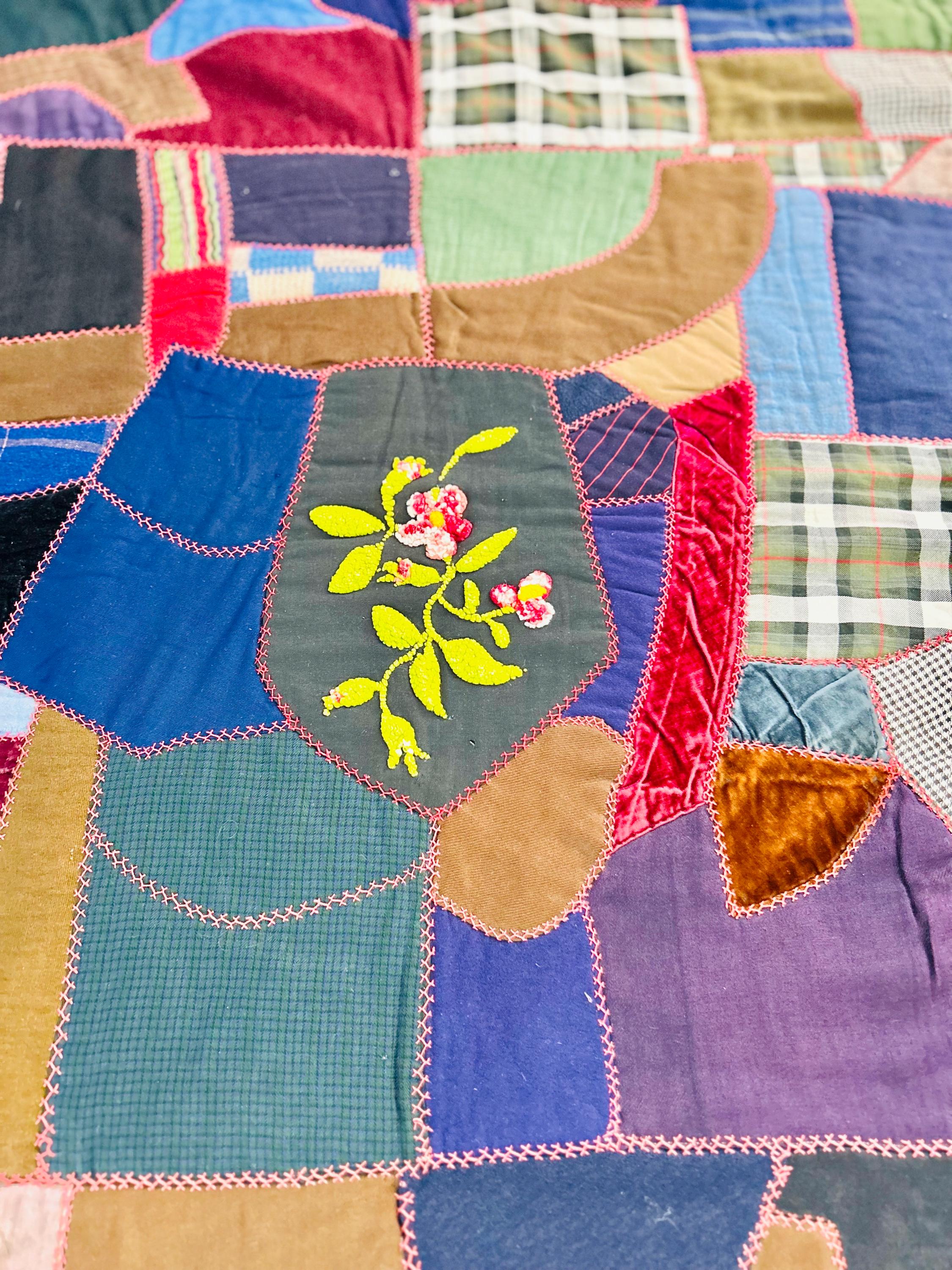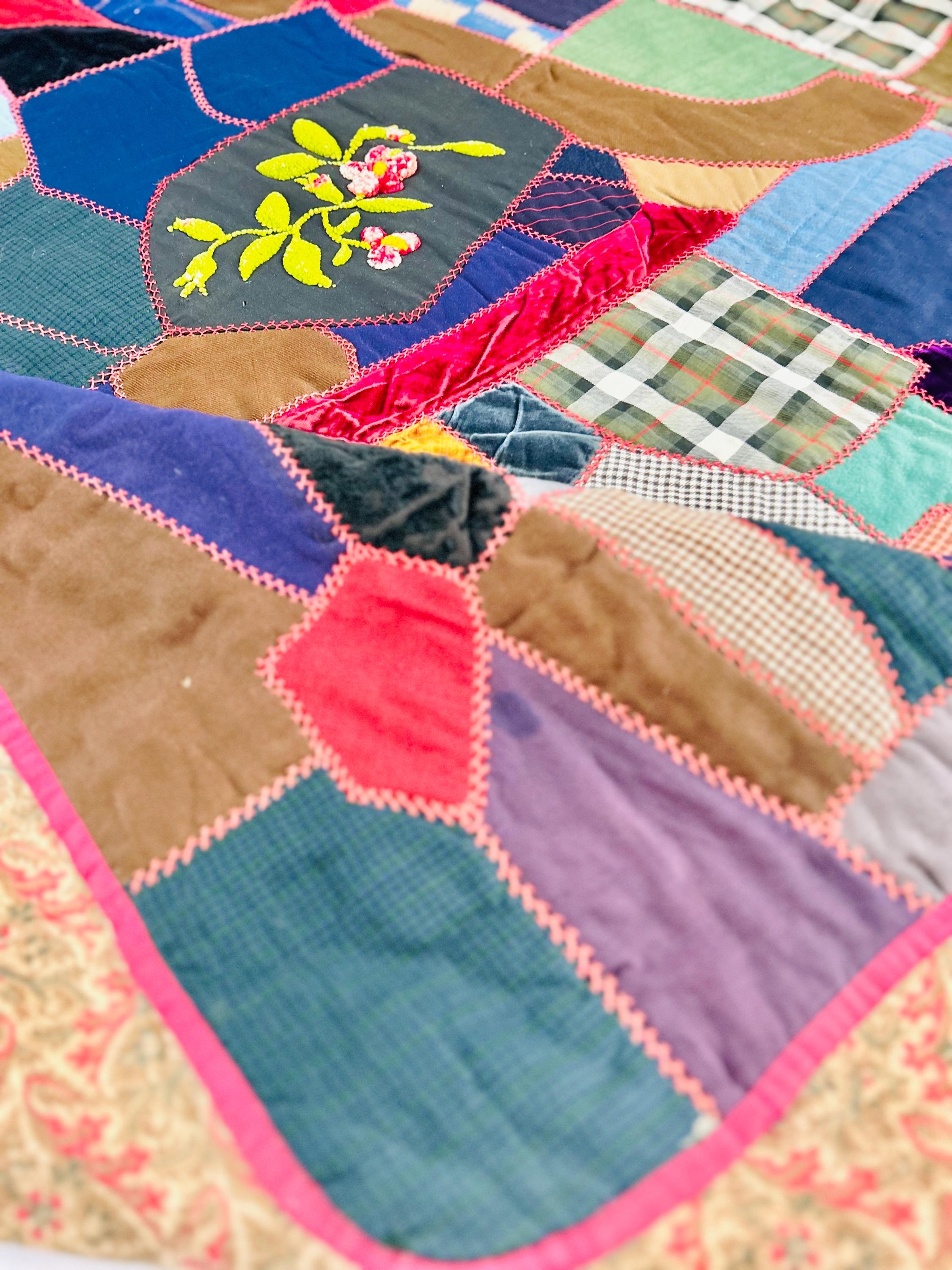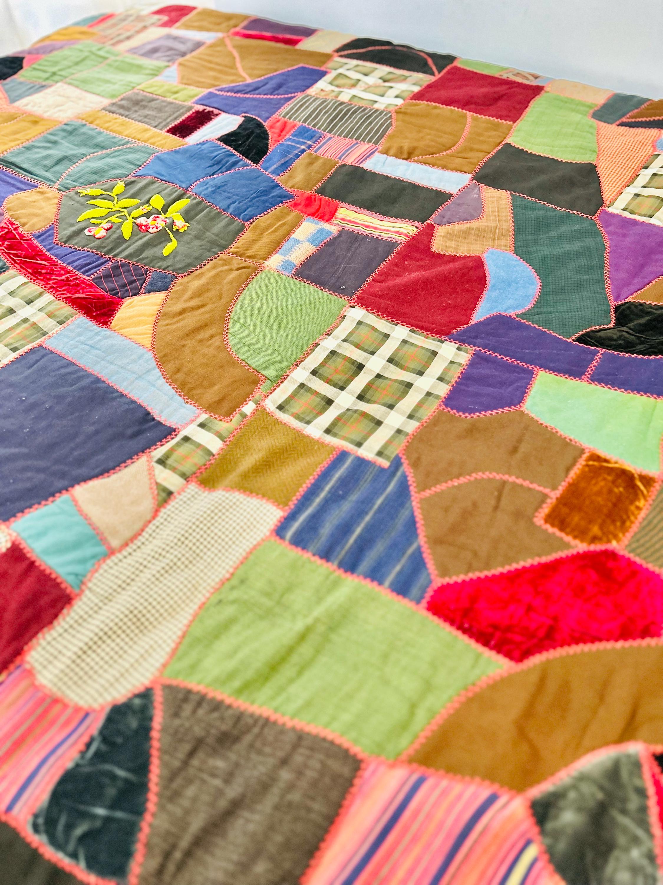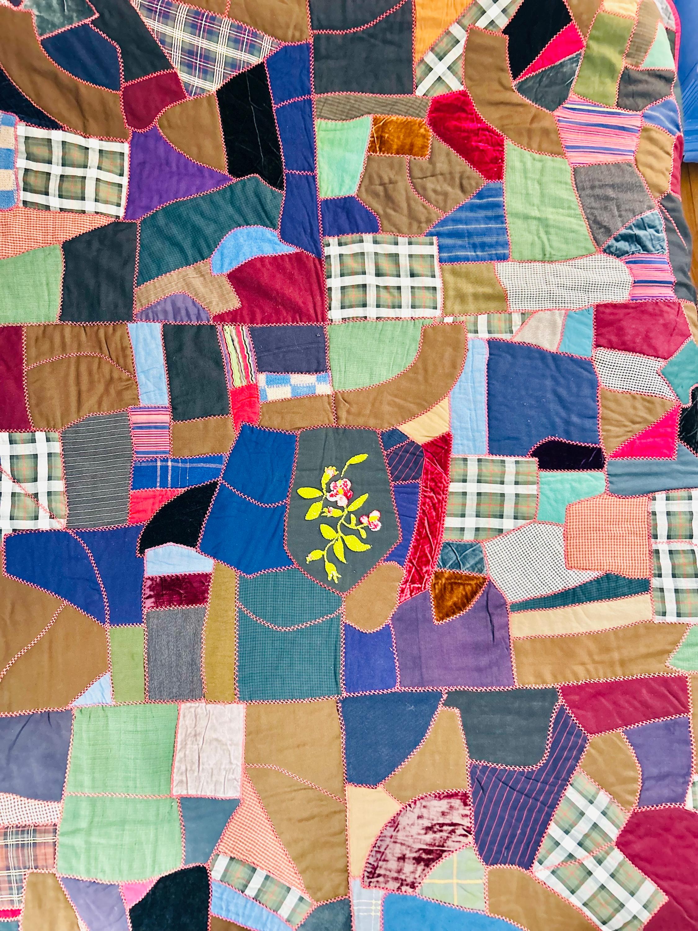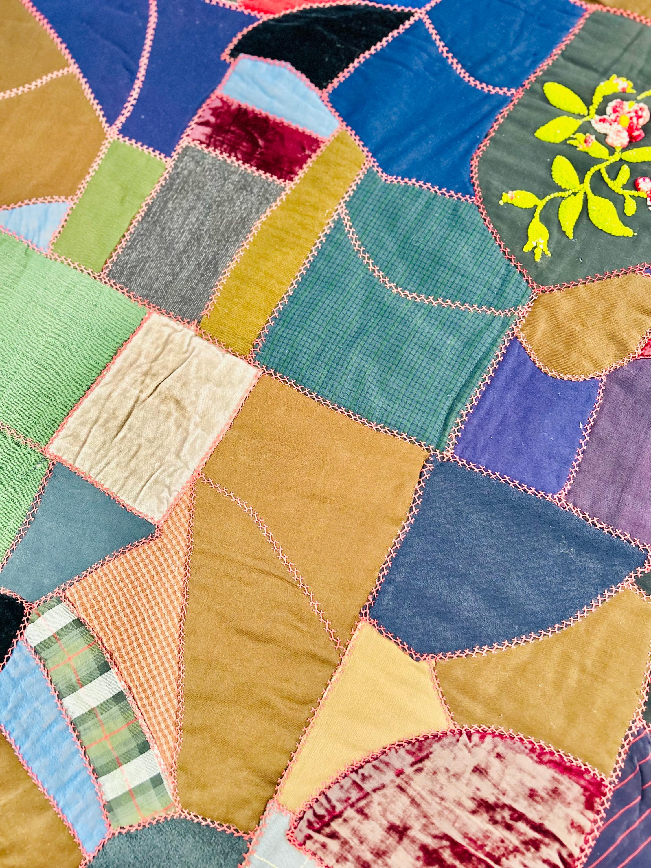 This Crazy Quilt has a center hand-stitched flower in green and reds, all surrounded by velvets, cottons, linens, wools and taffetas. Each patch has been hand-embroidered, while the quilting (which is rare on a crazy quilt) is machine-stitched in outlines of the patchwork.