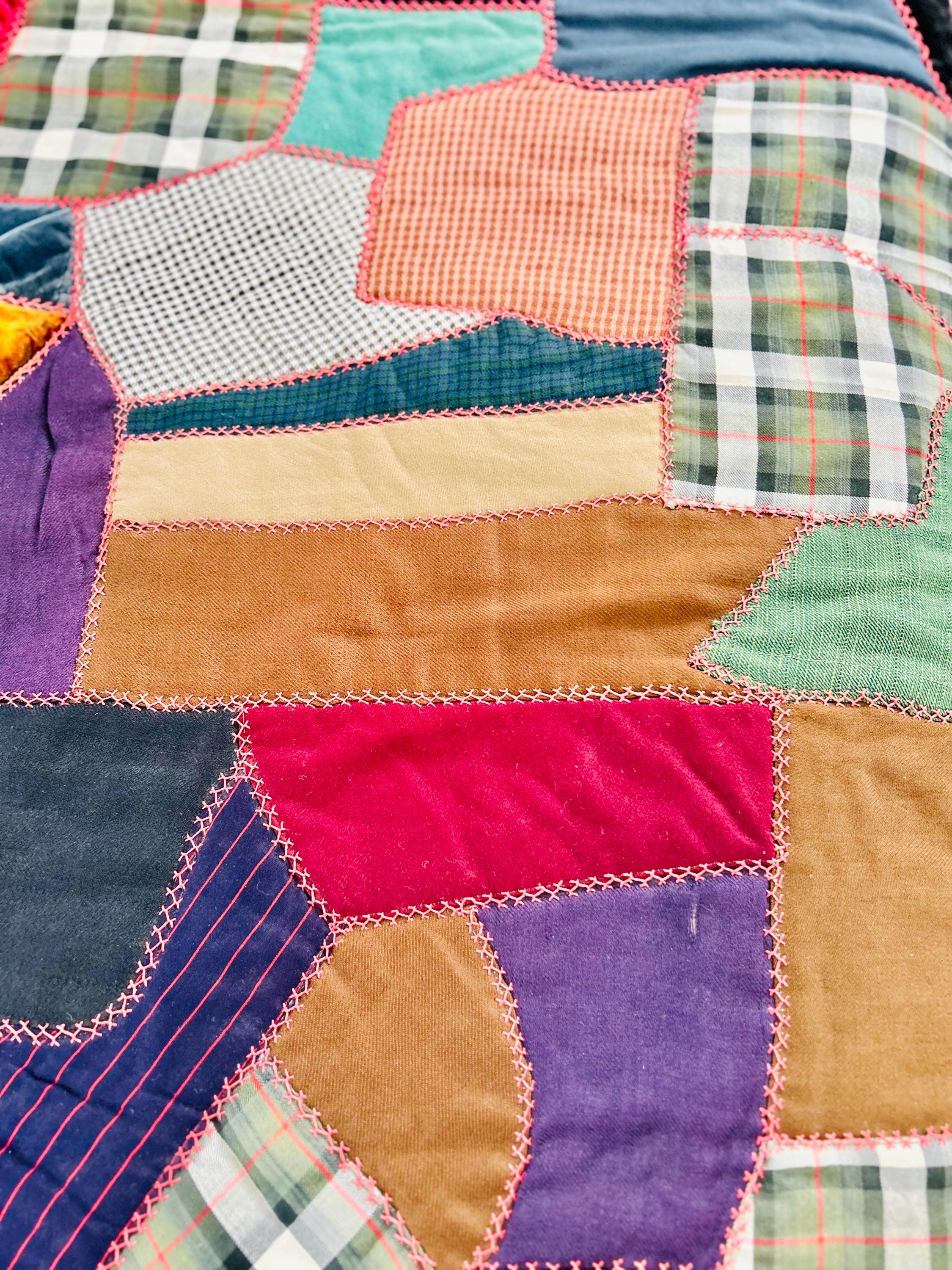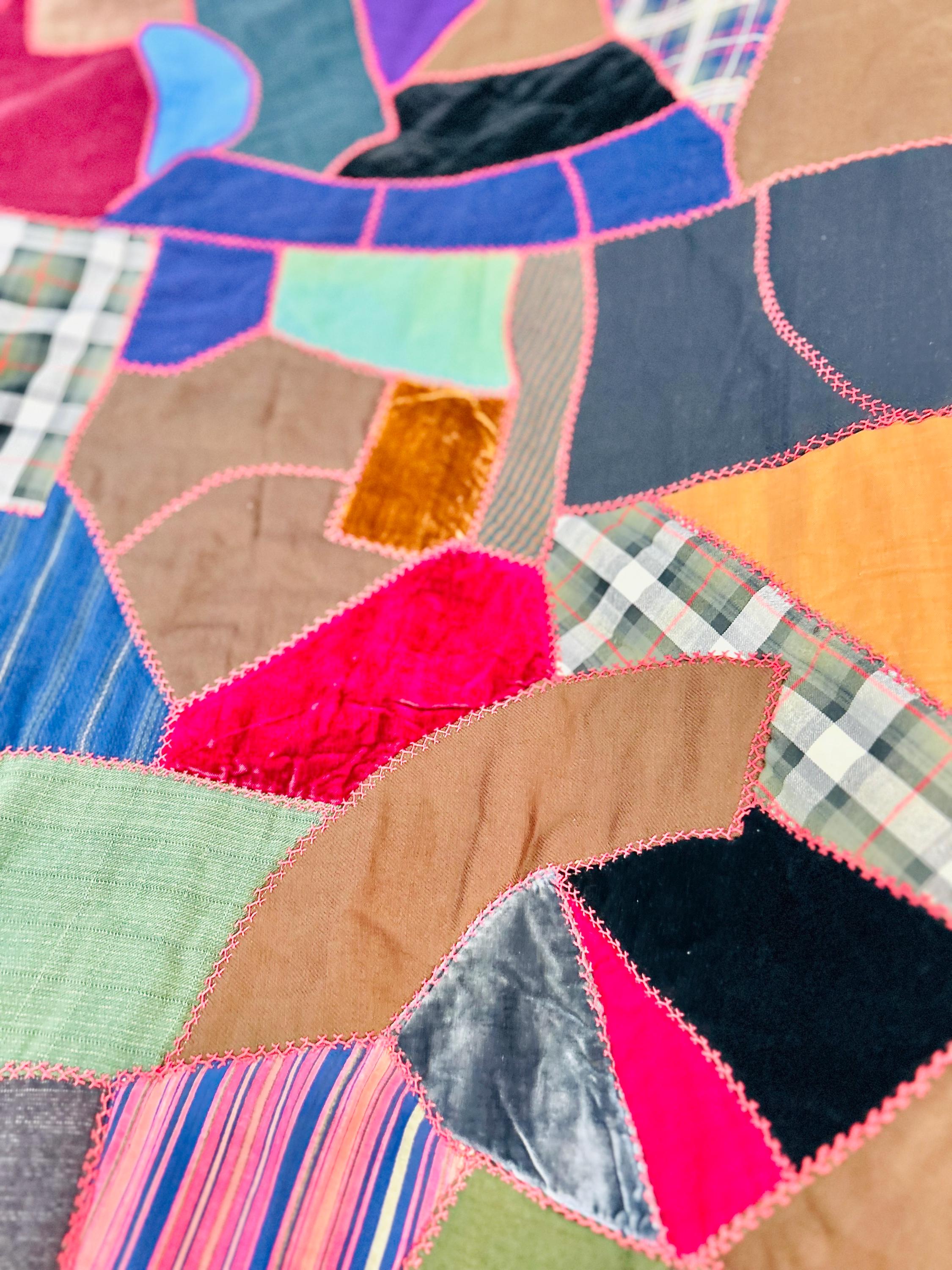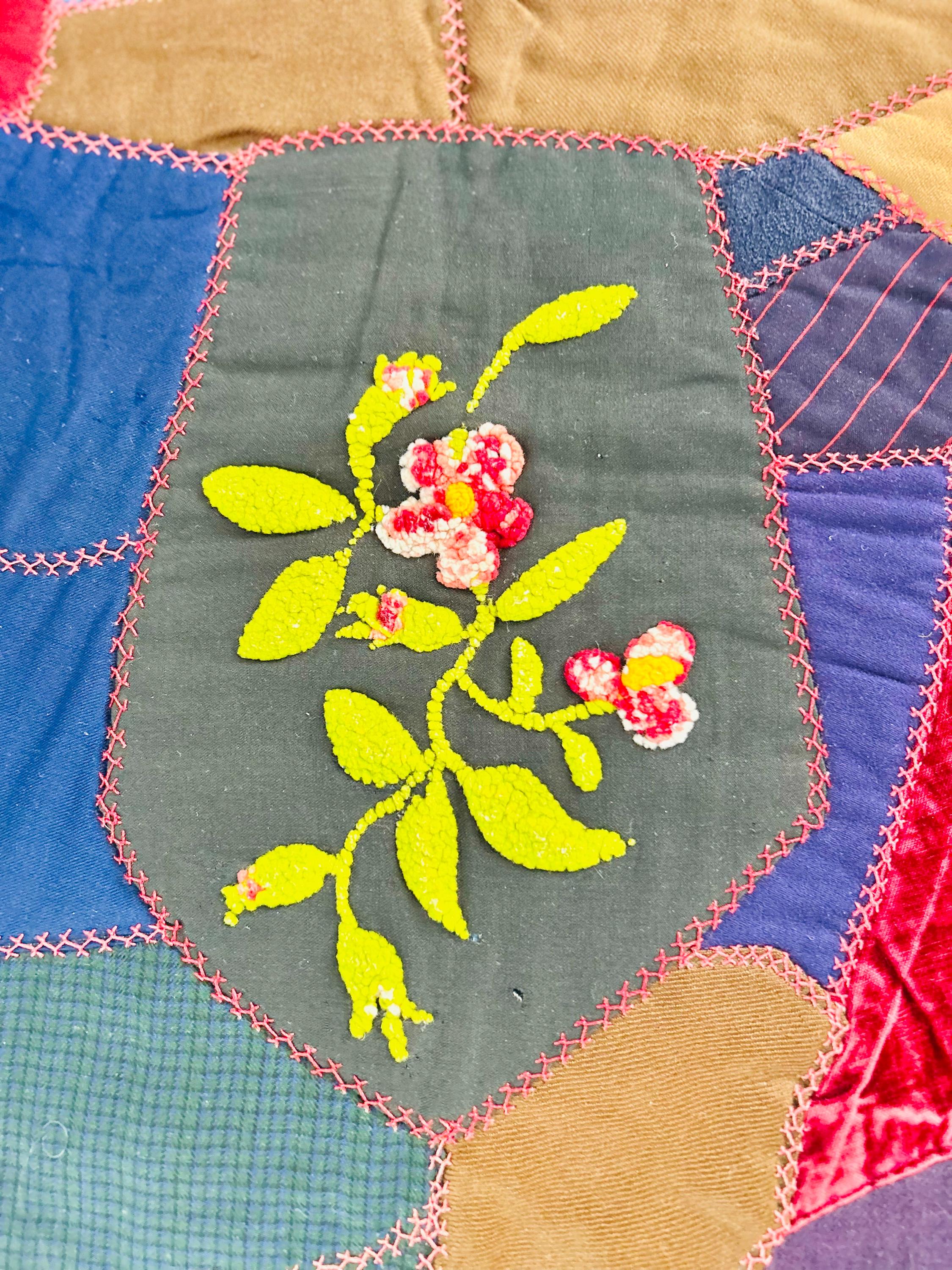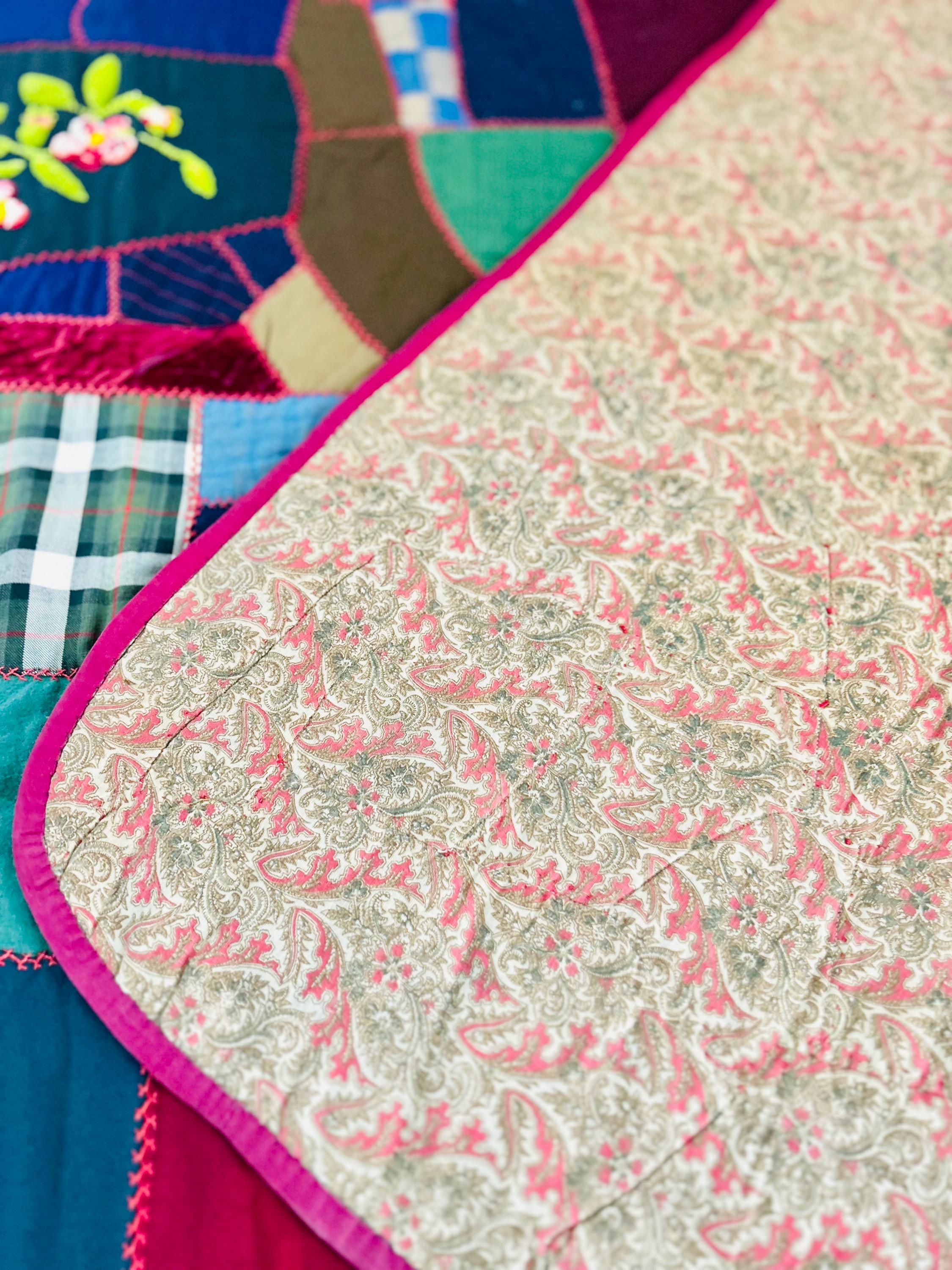 This Crazy Quilt has a center hand-stitched flower in green and reds, all surrounded by velvets, cottons, linens, wools and taffetas. Each patch has been hand-embroidered, while the quilting (which is rare on a crazy quilt) is machine-stitched in outlines of the patchwork.