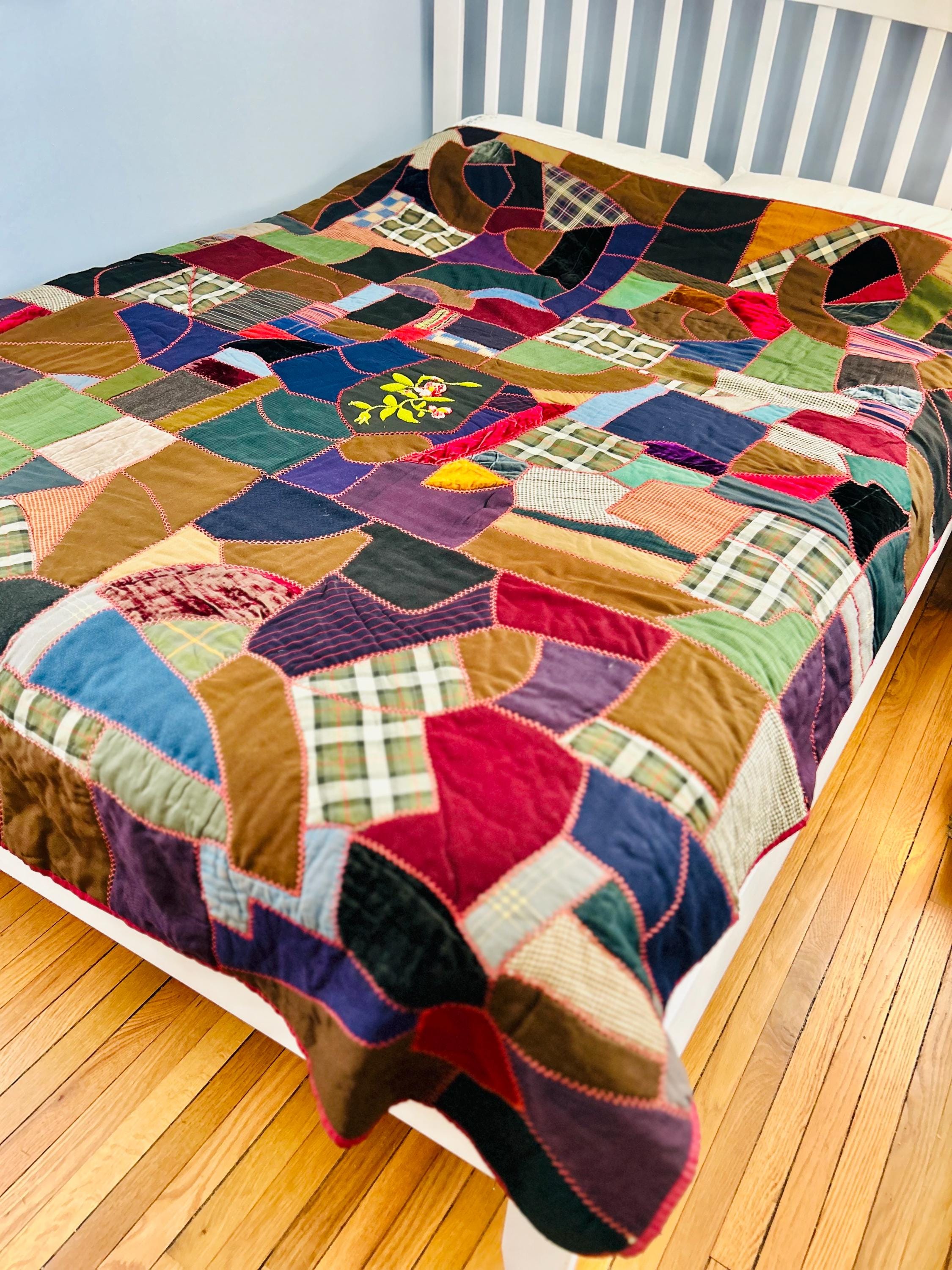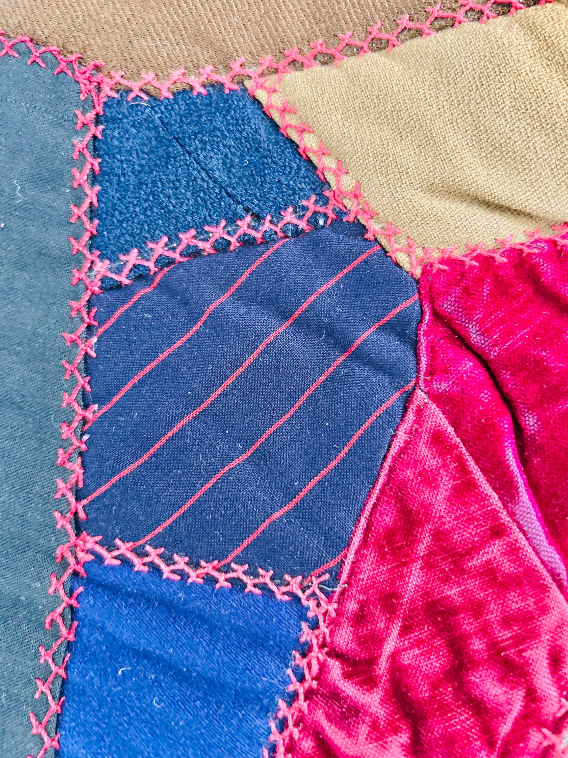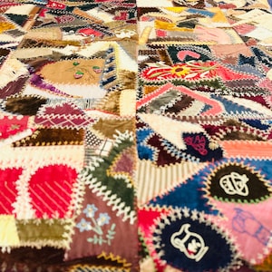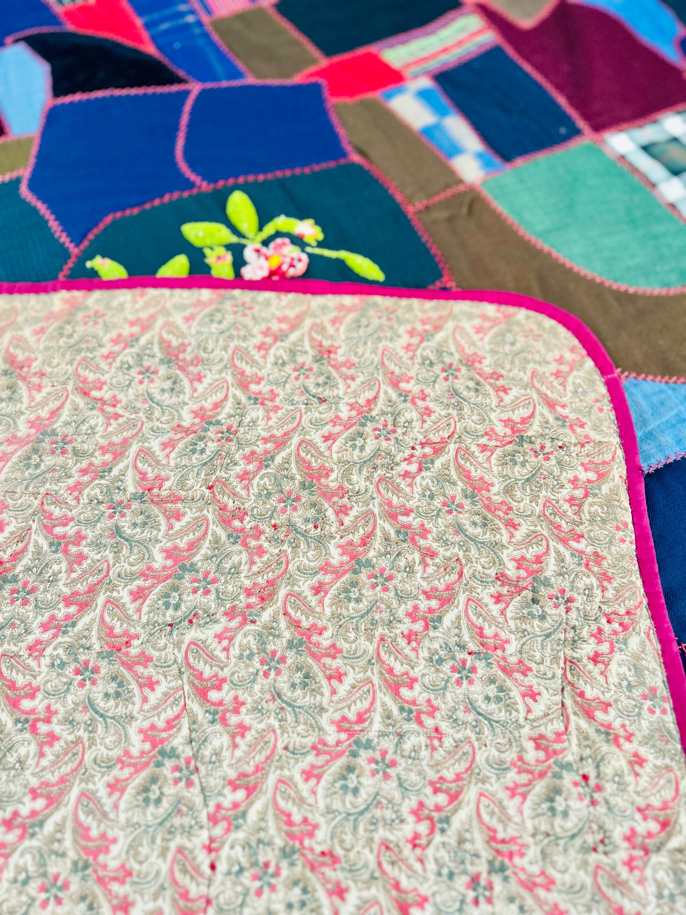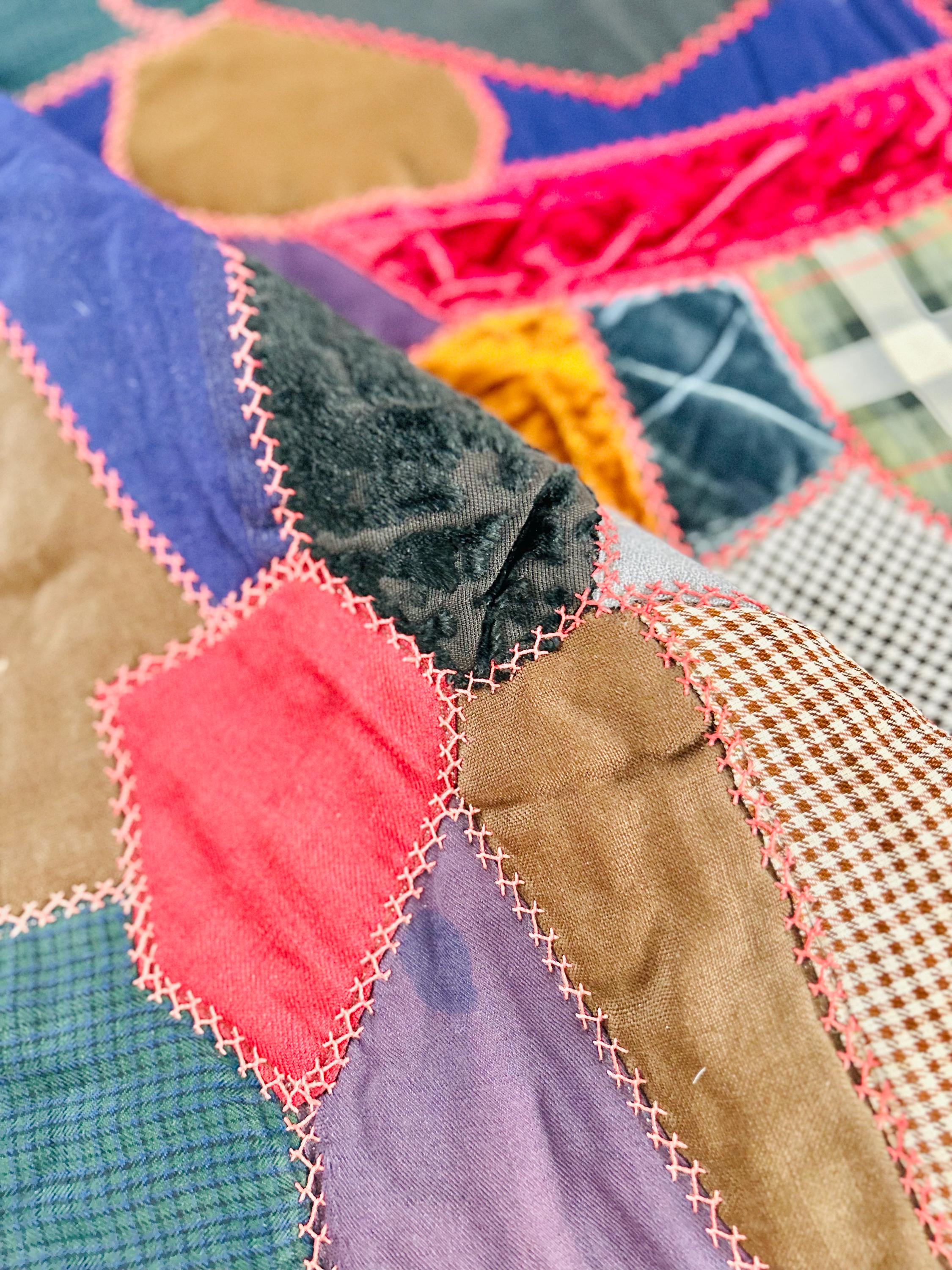 This Crazy Quilt has a center hand-stitched flower in green and reds, all surrounded by velvets, cottons, linens, wools and taffetas. Each patch has been hand-embroidered, while the quilting (which is rare on a crazy quilt) is machine-stitched in outlines of the patchwork.