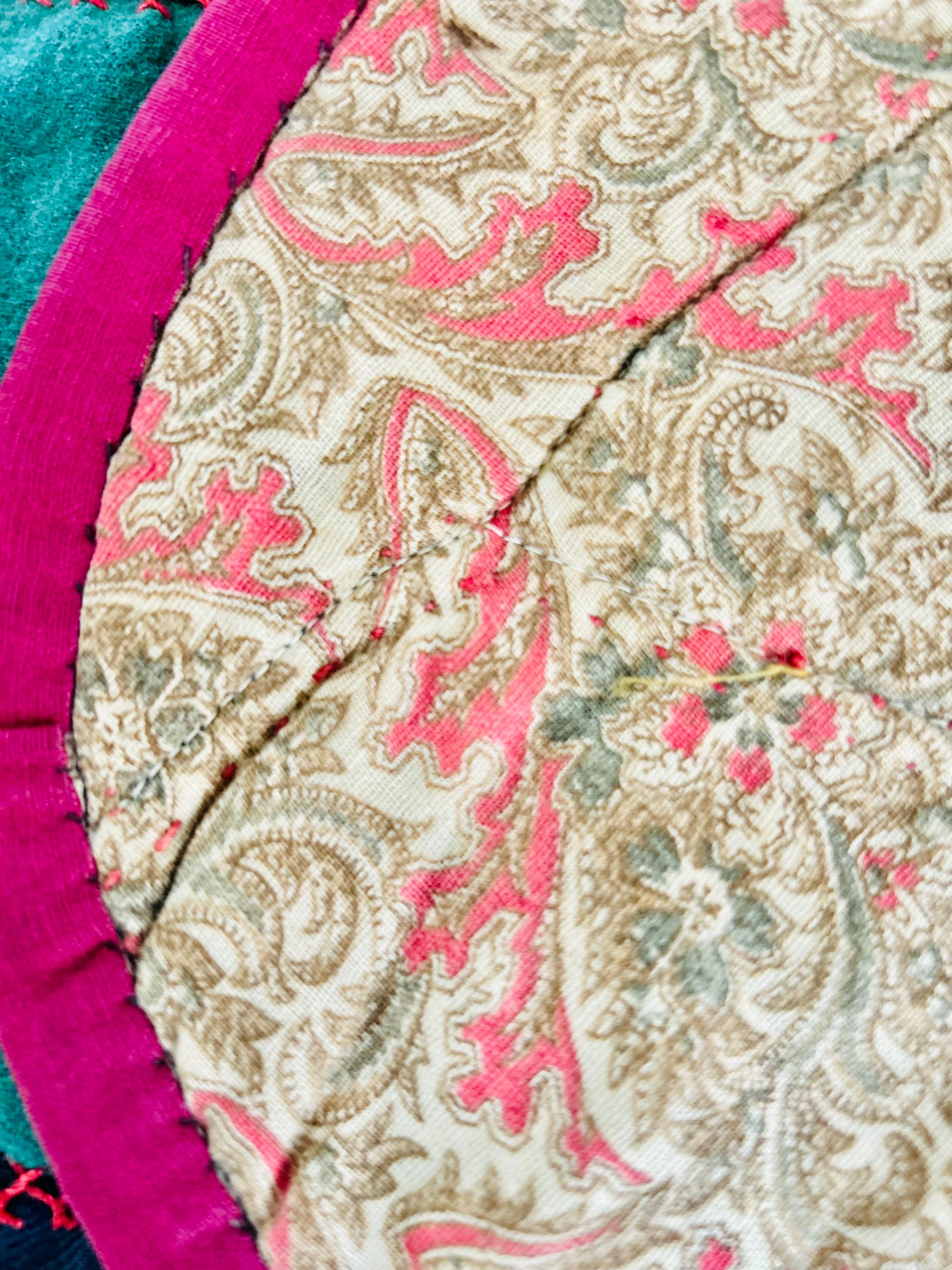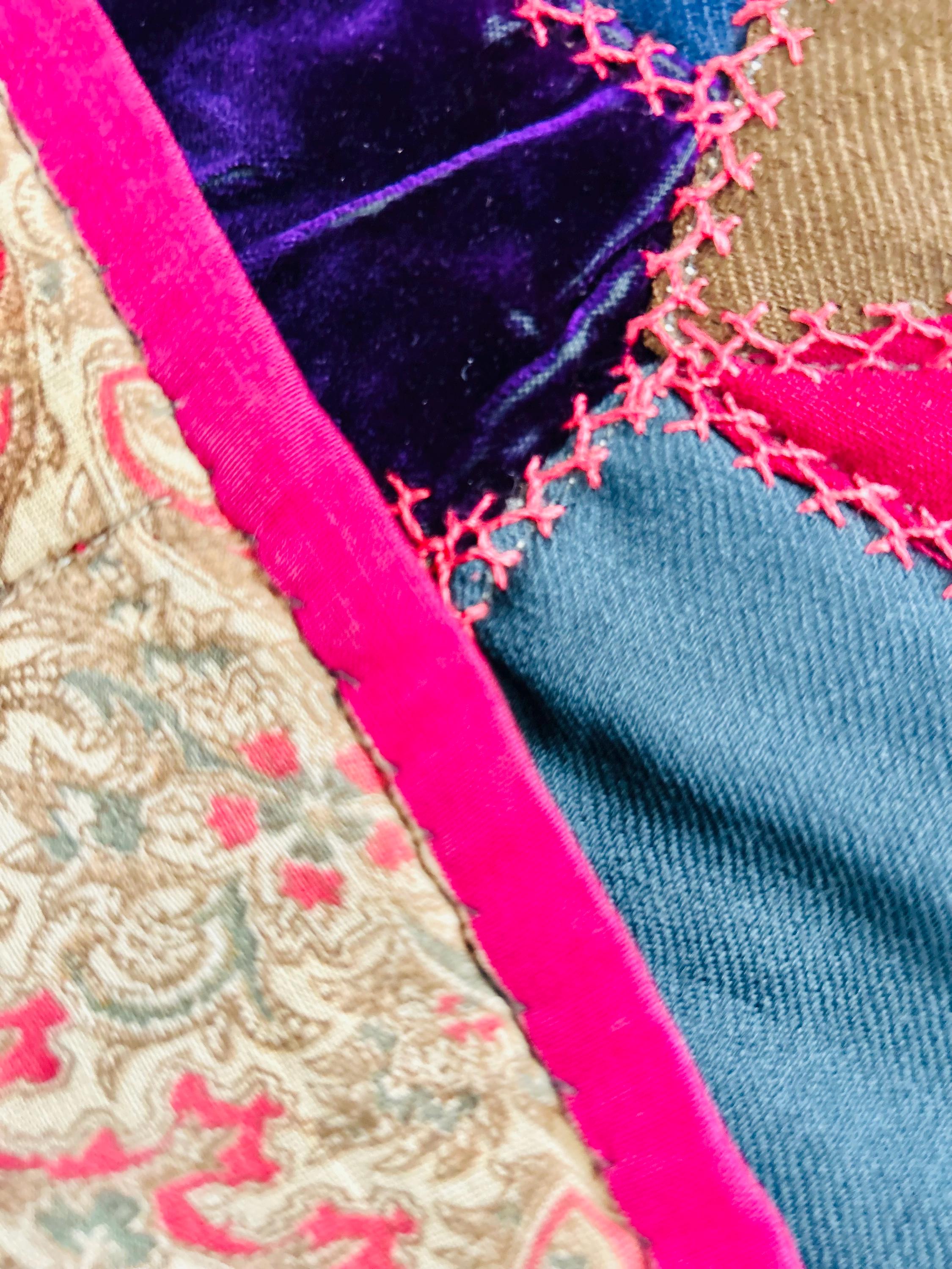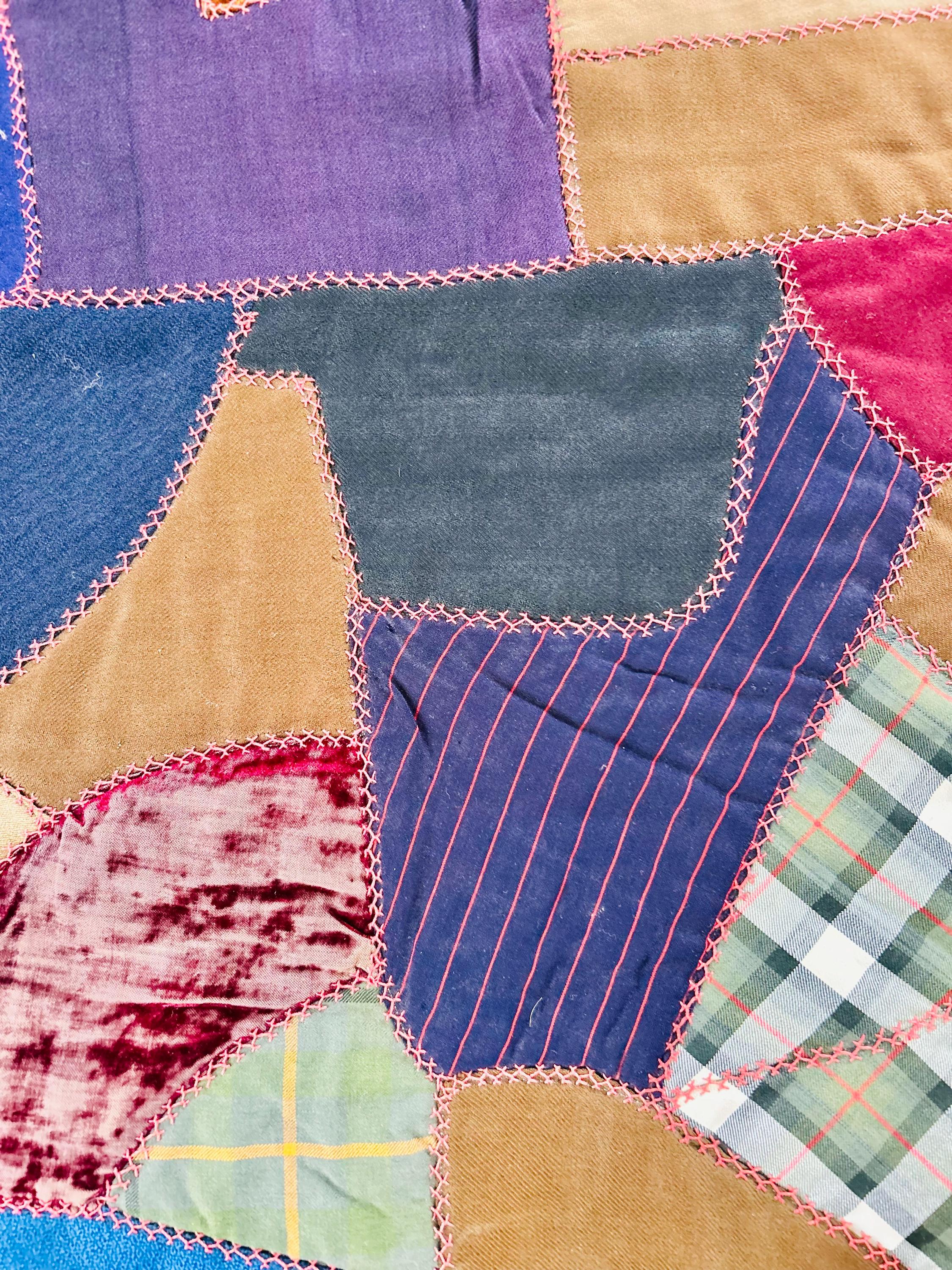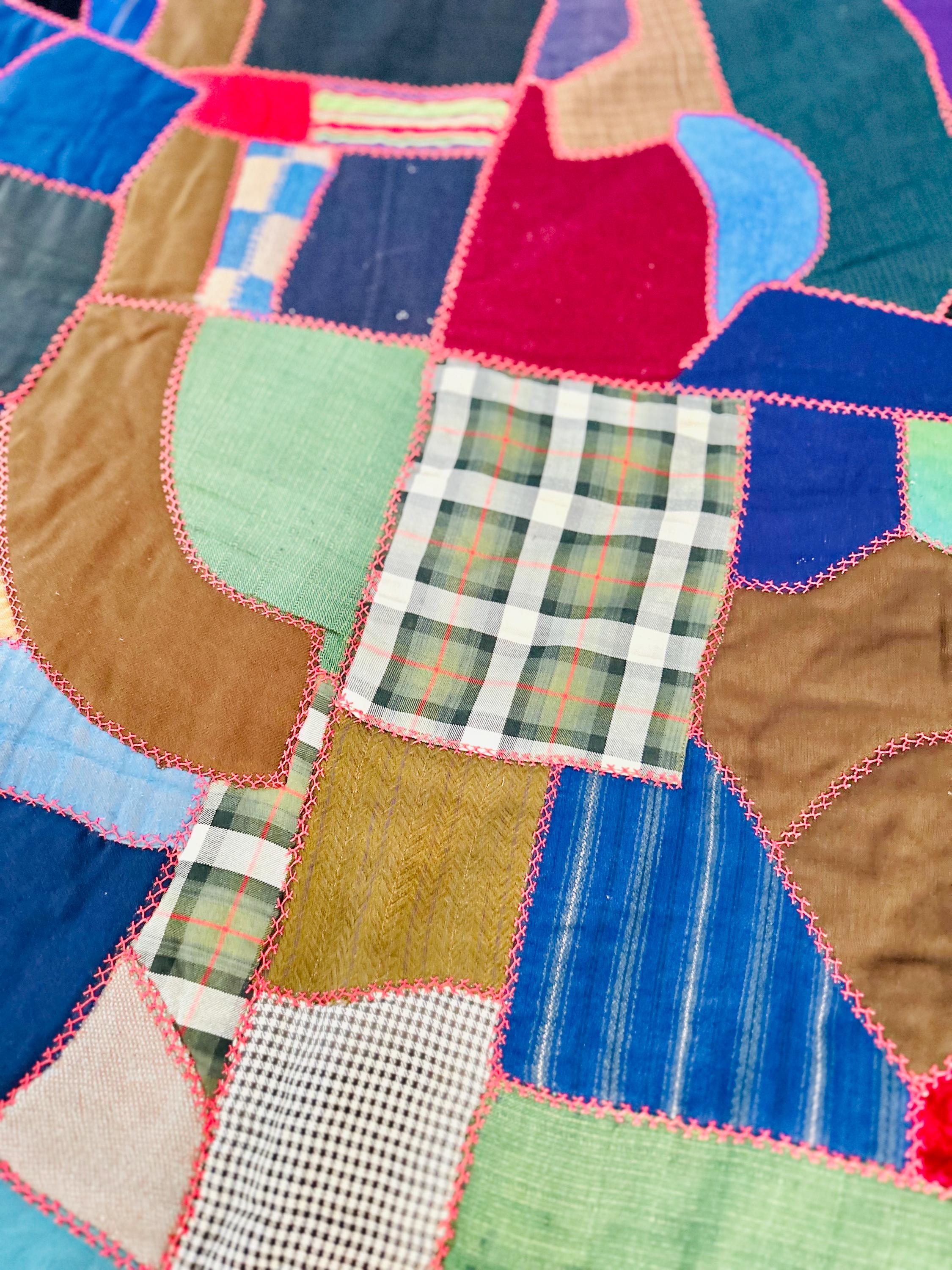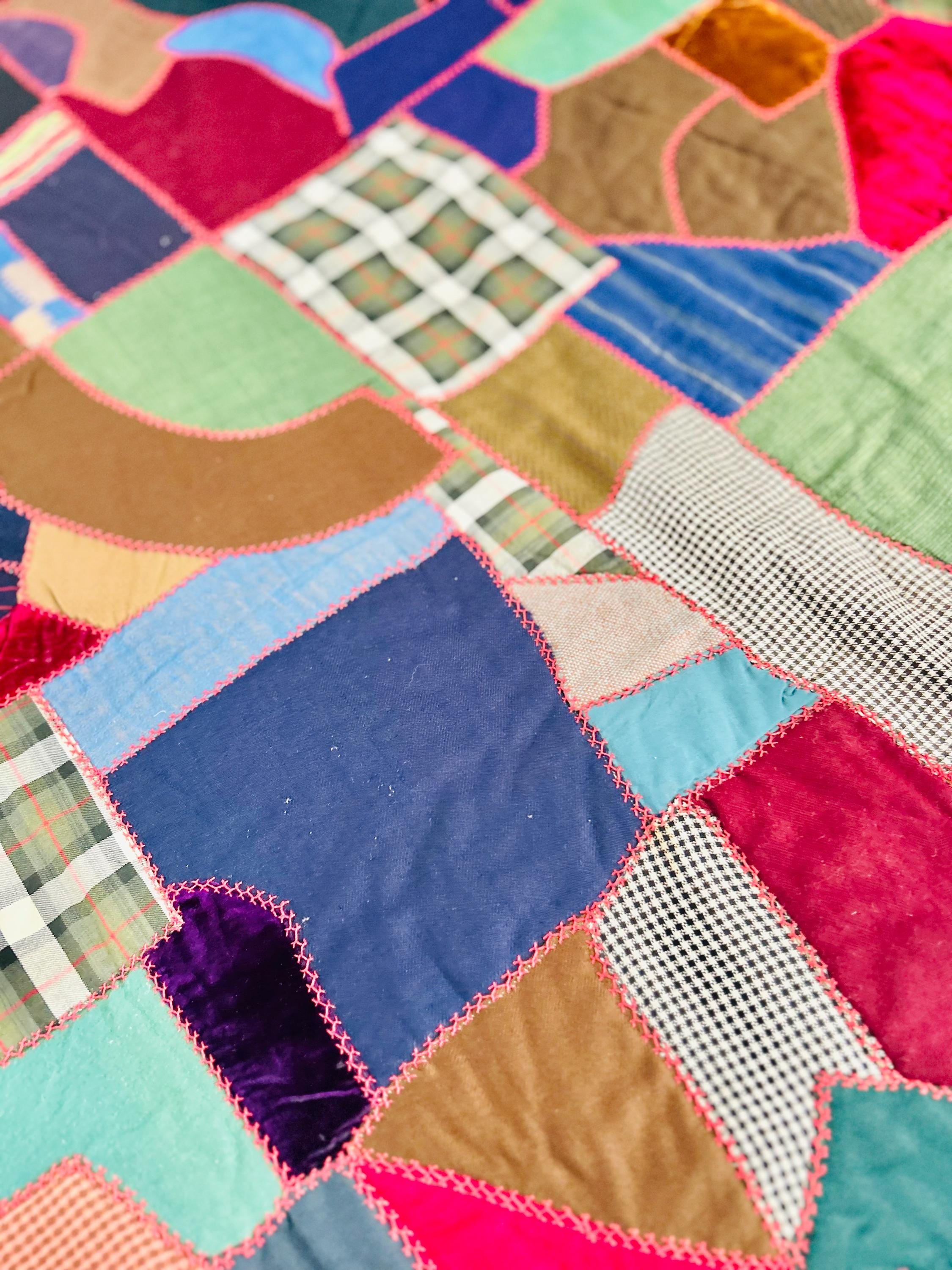 This Crazy Quilt has a center hand-stitched flower in green and reds, all surrounded by velvets, cottons, linens, wools and taffetas. Each patch has been hand-embroidered, while the quilting (which is rare on a crazy quilt) is machine-stitched in outlines of the patchwork.