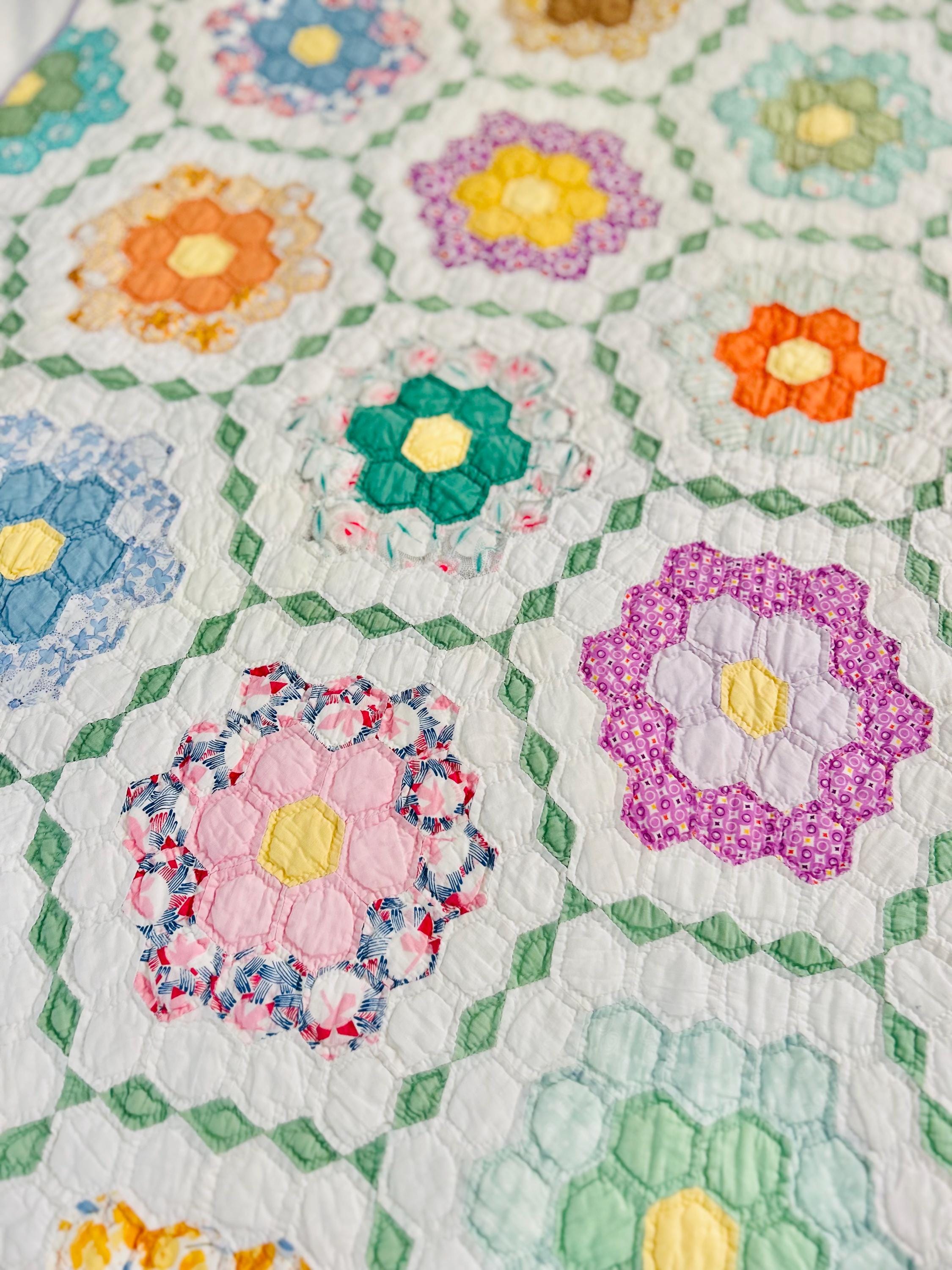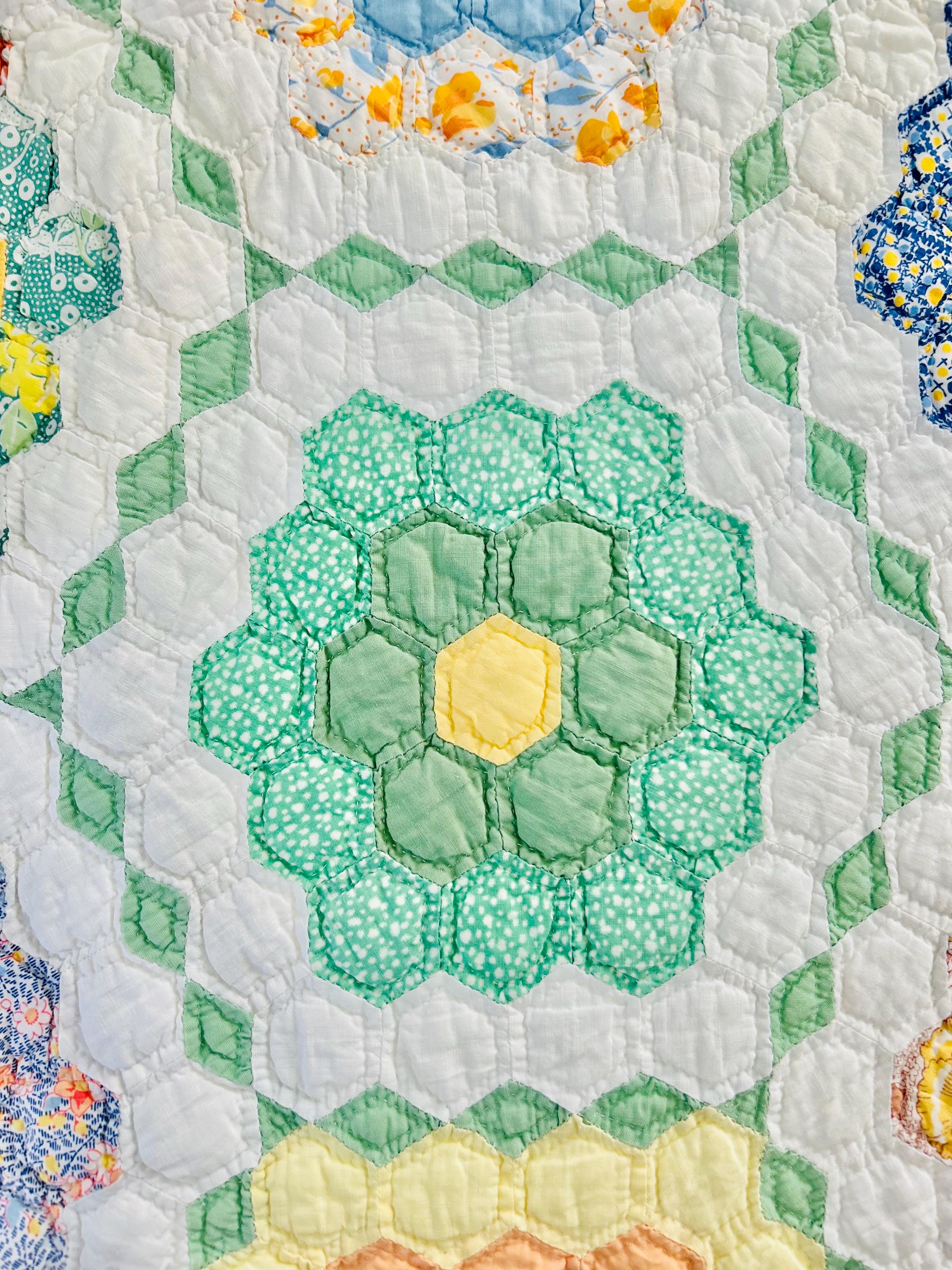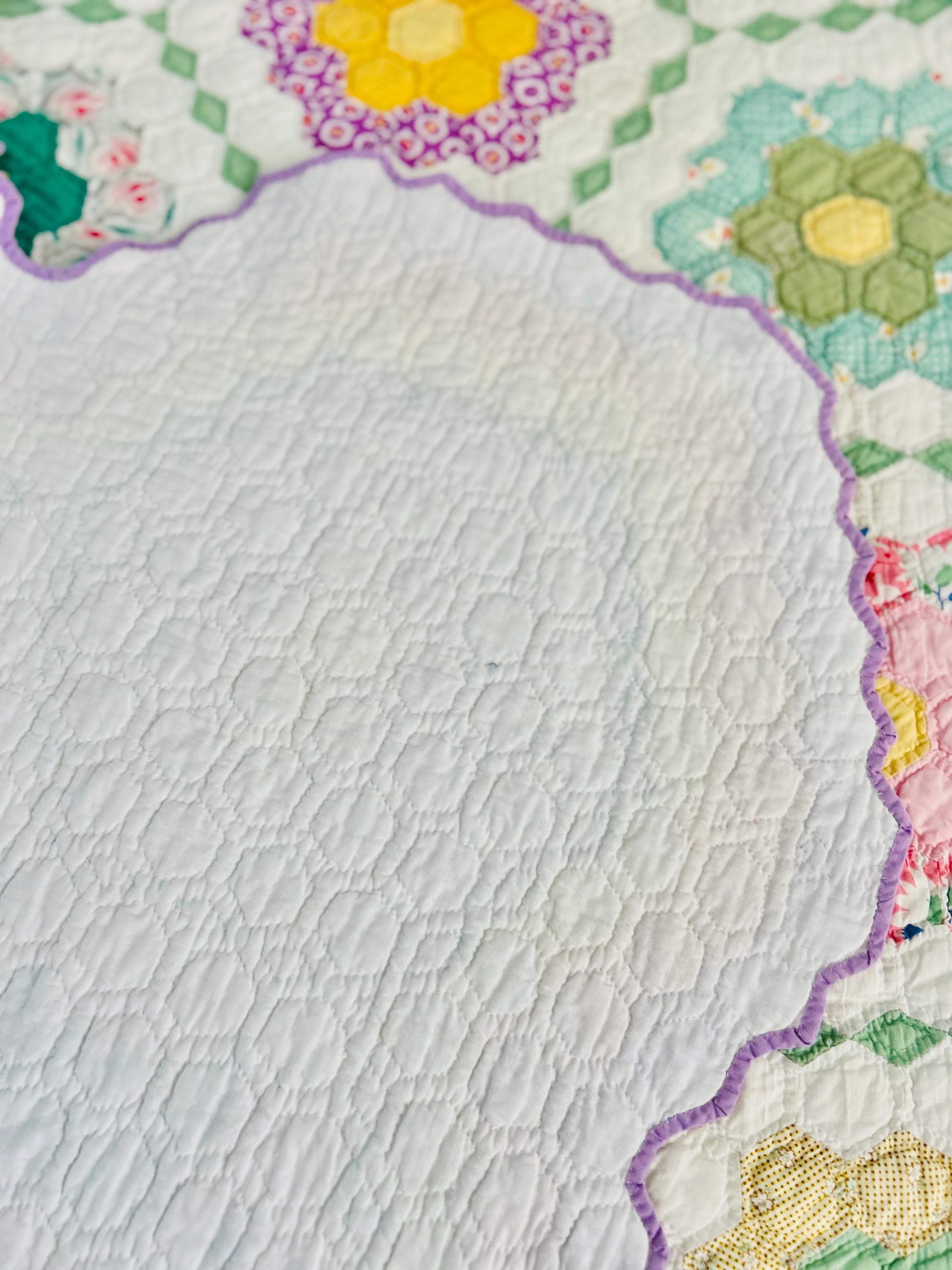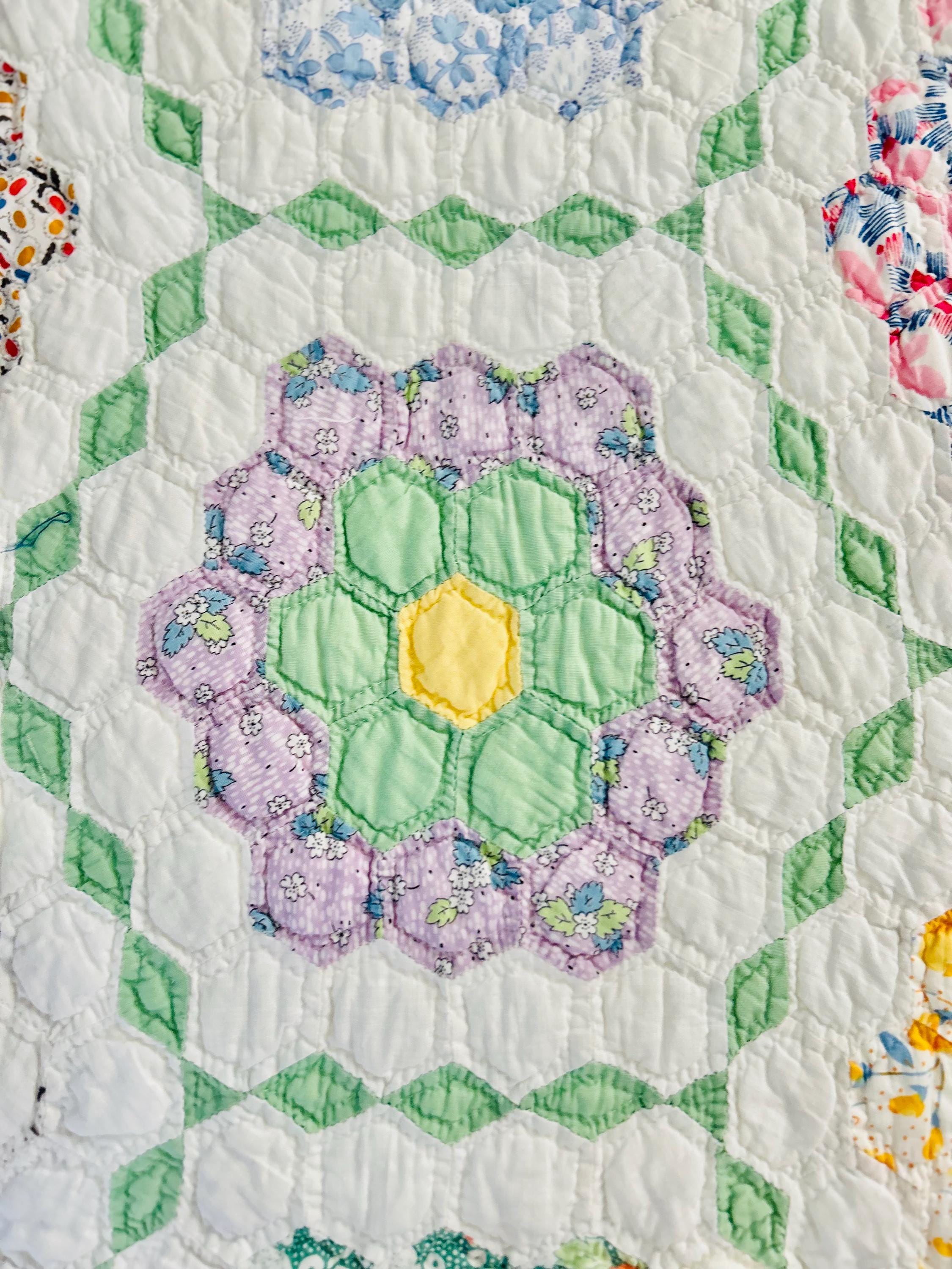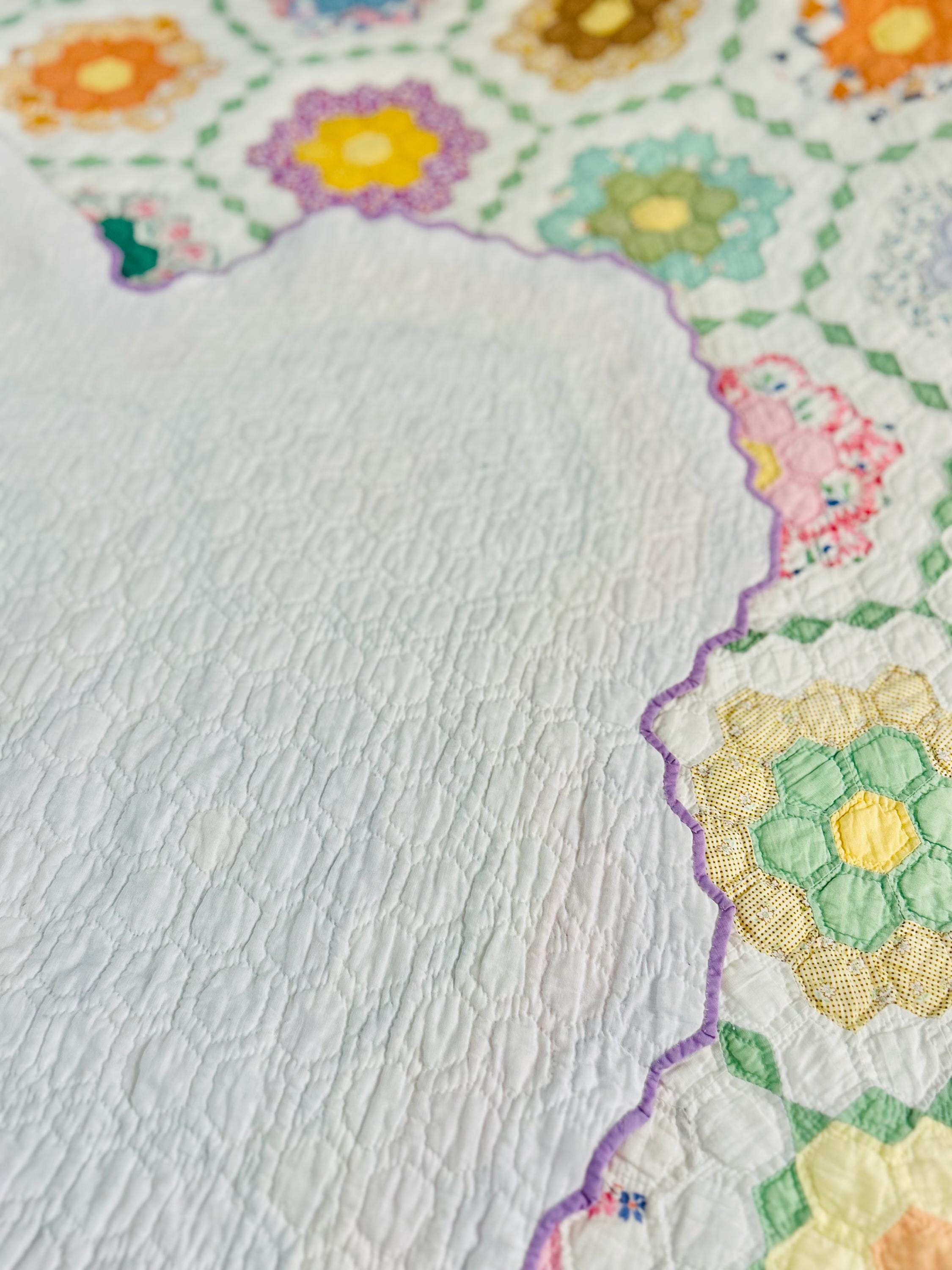Grandmother's Flower Garden Antique Quilt, circa 1930s, with a unique, three-sided border and green diamond outlines of each "garden". The hand-quilting is in outlines of each of the thousands of hexagons and small diamonds.