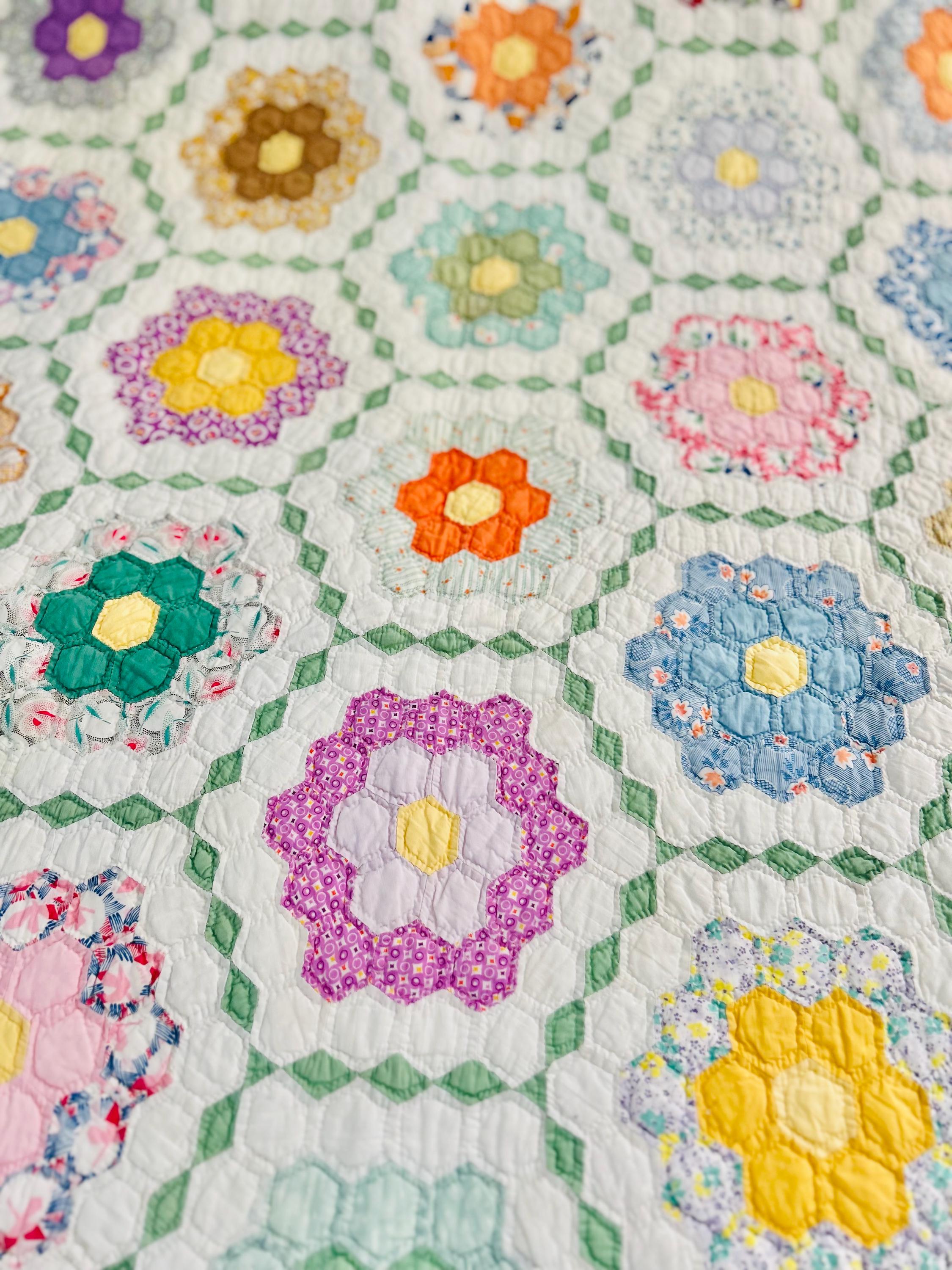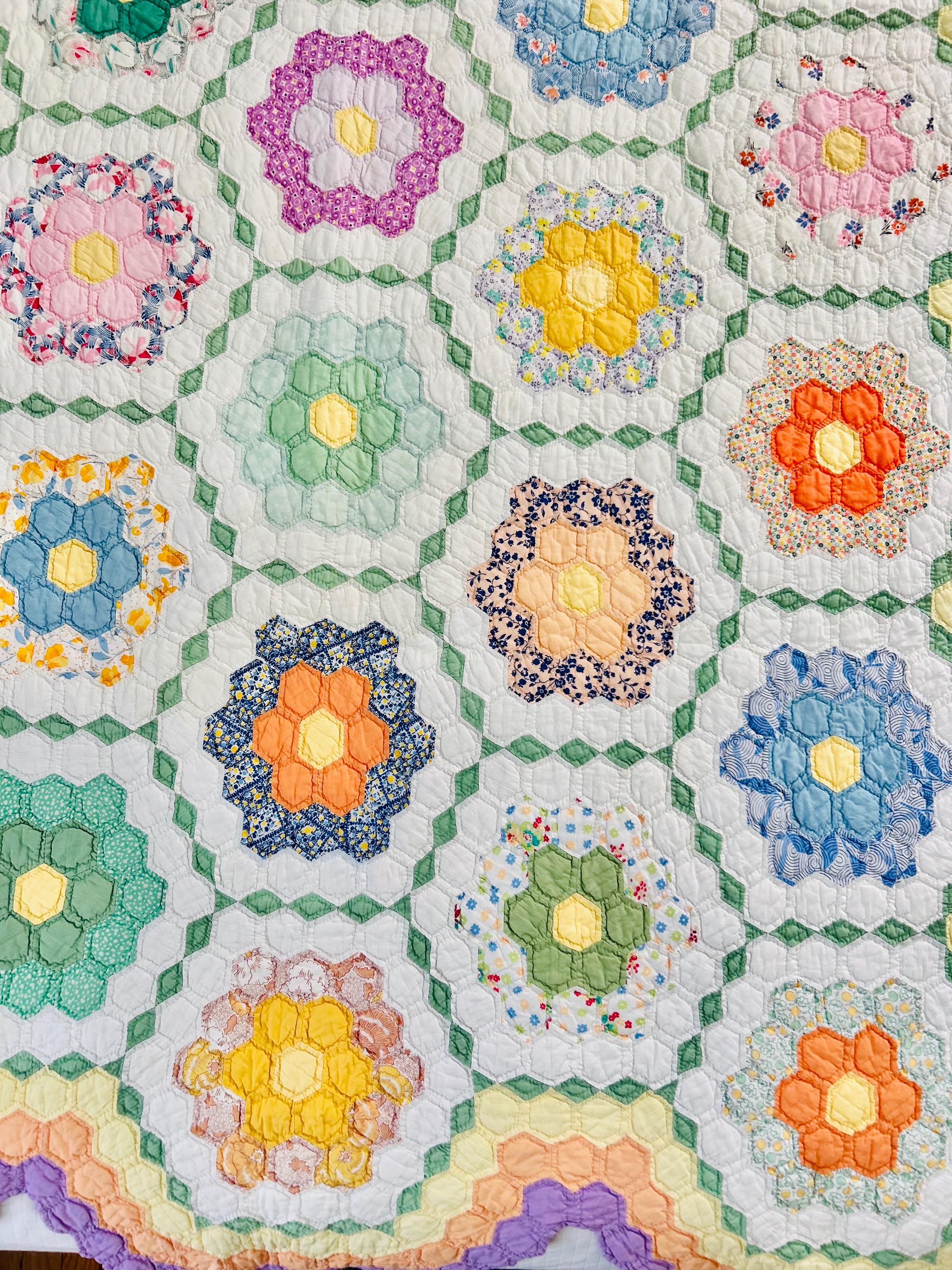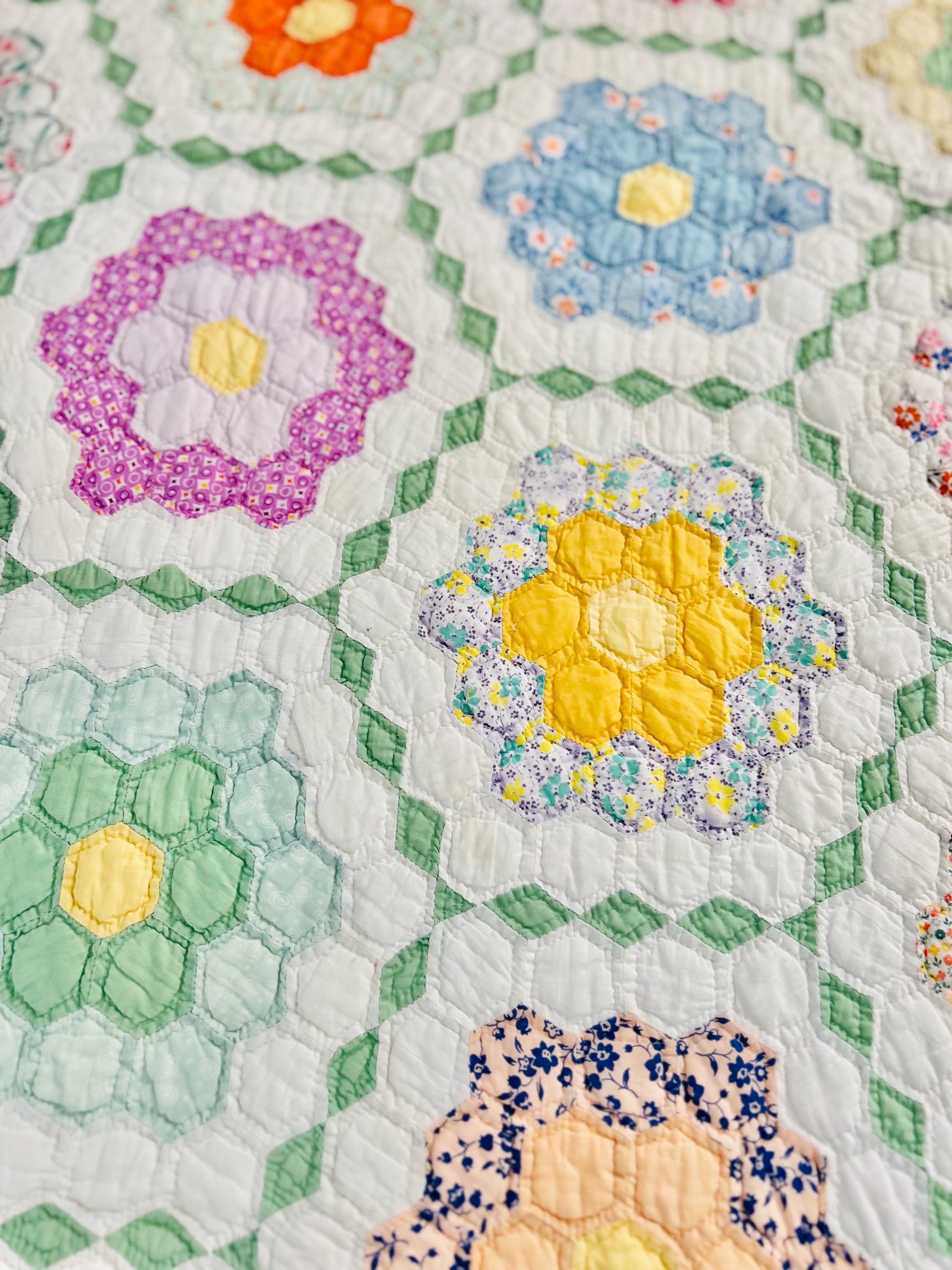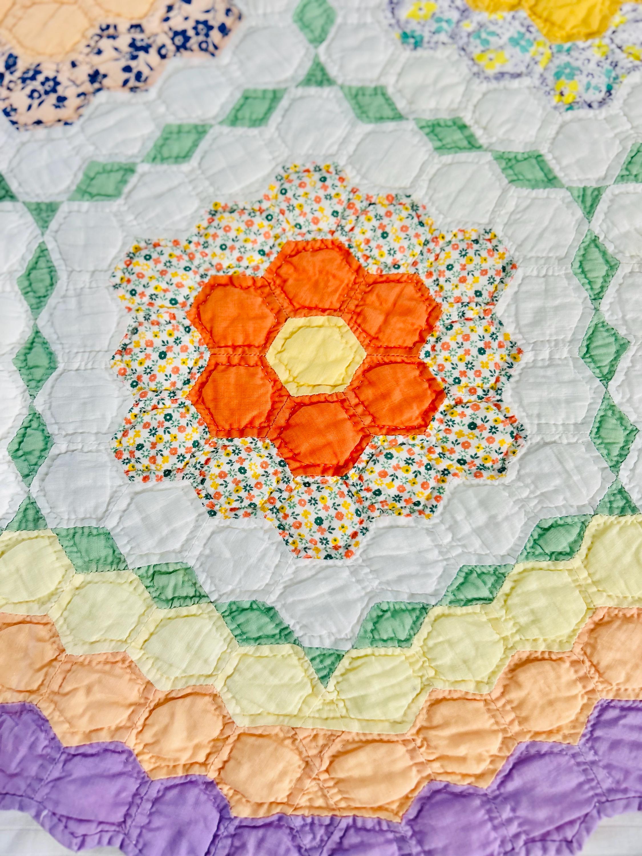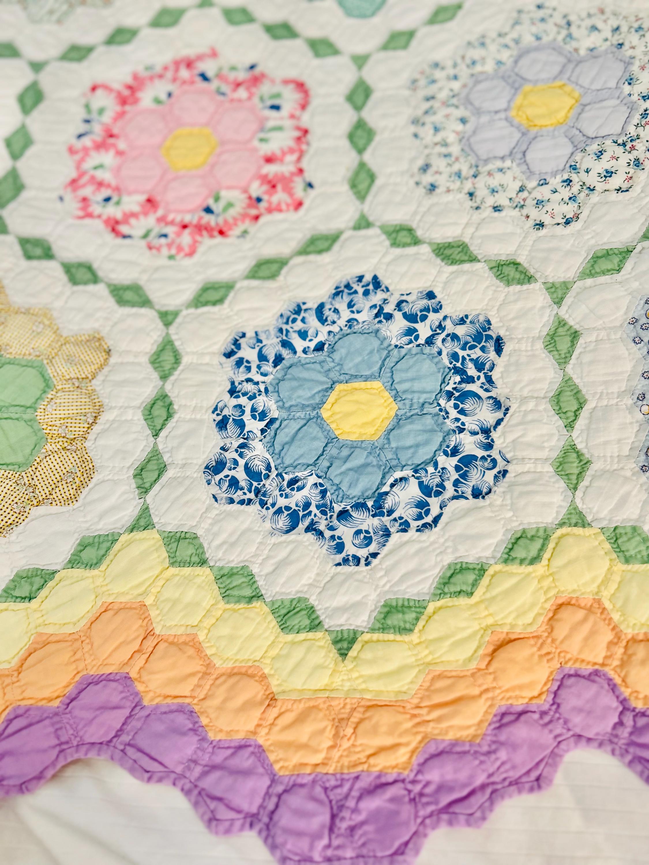 Grandmother's Flower Garden Antique Quilt, circa 1930s, with a unique, three-sided border and green diamond outlines of each "garden". The hand-quilting is in outlines of each of the thousands of hexagons and small diamonds.