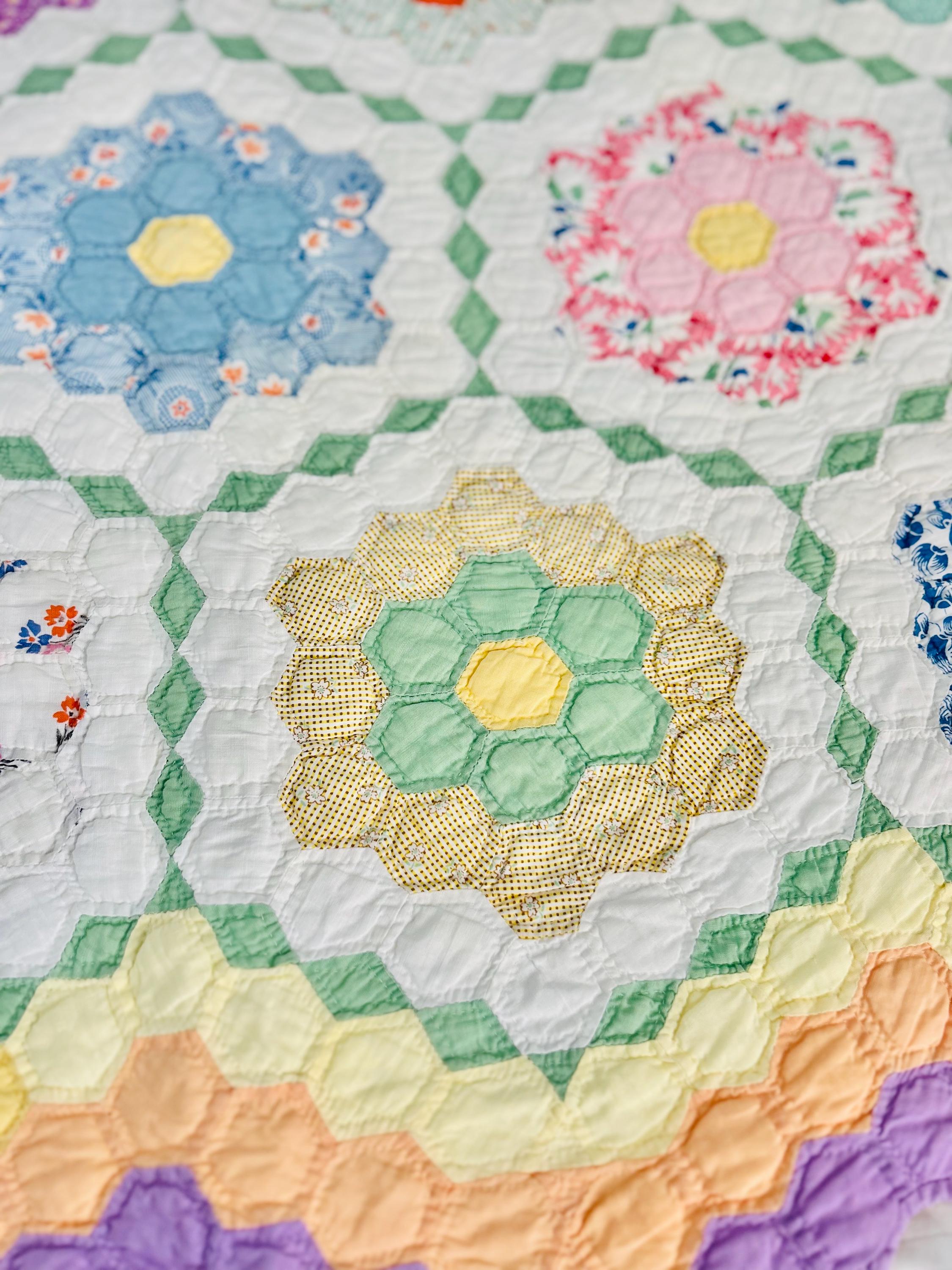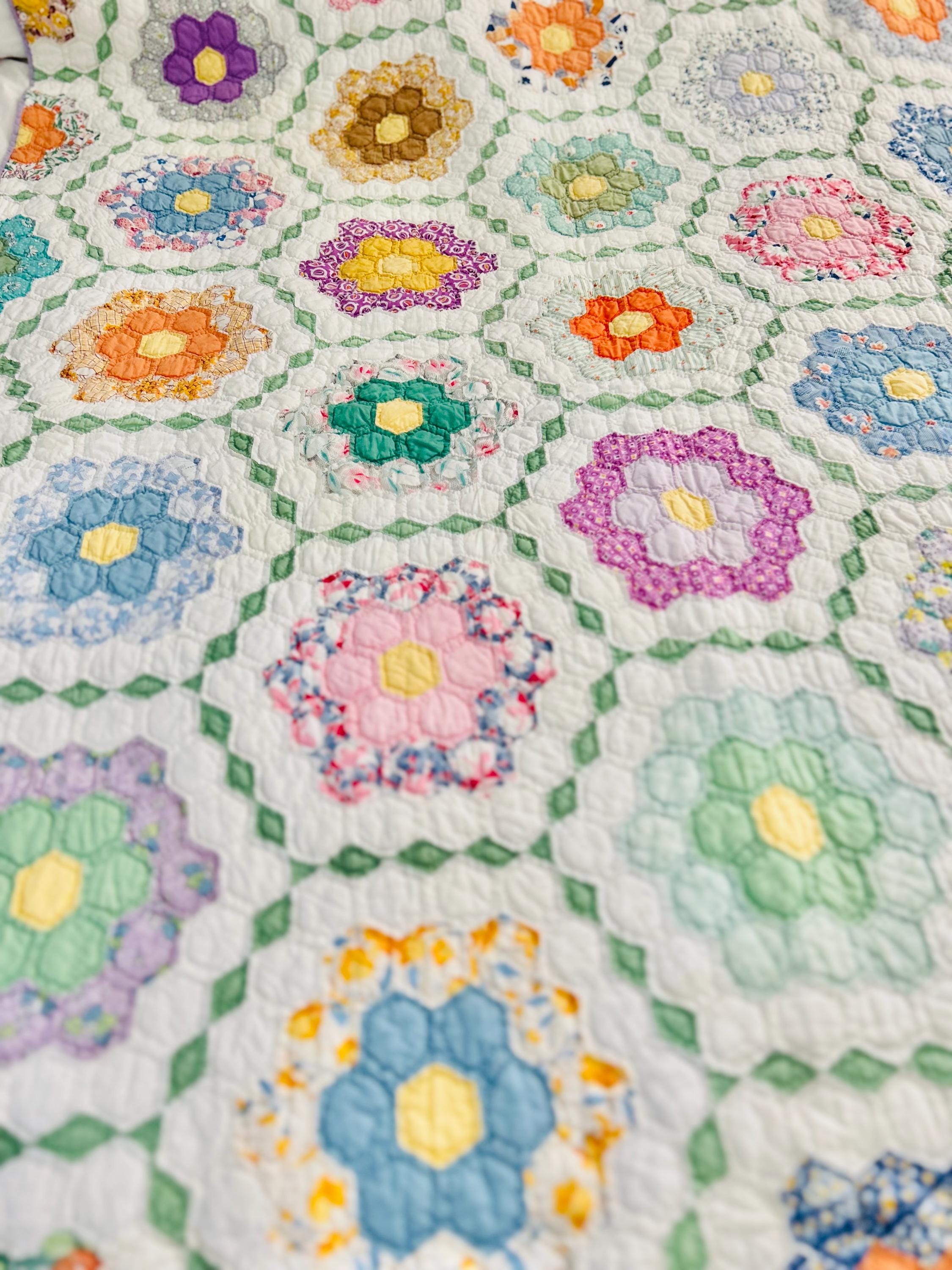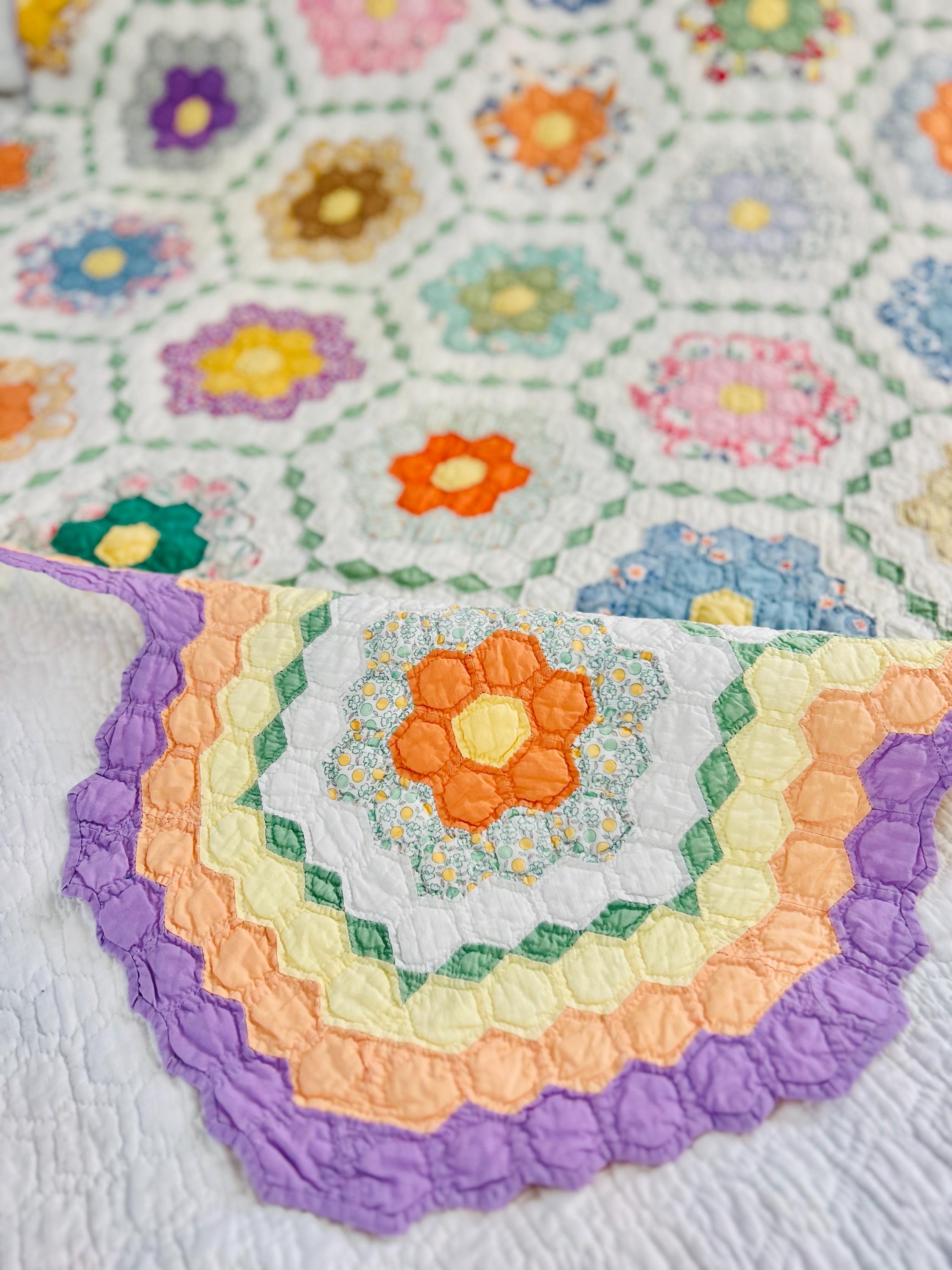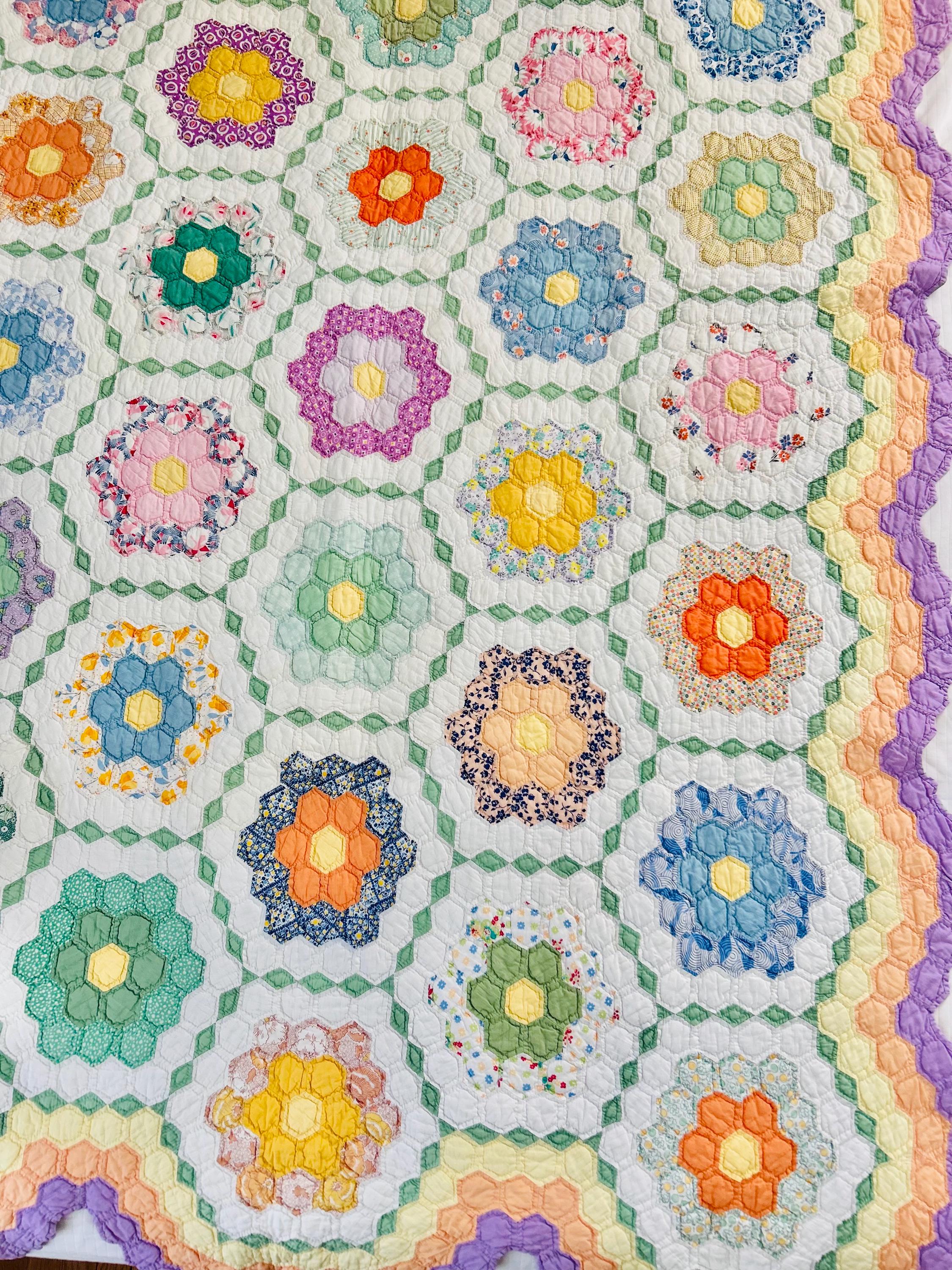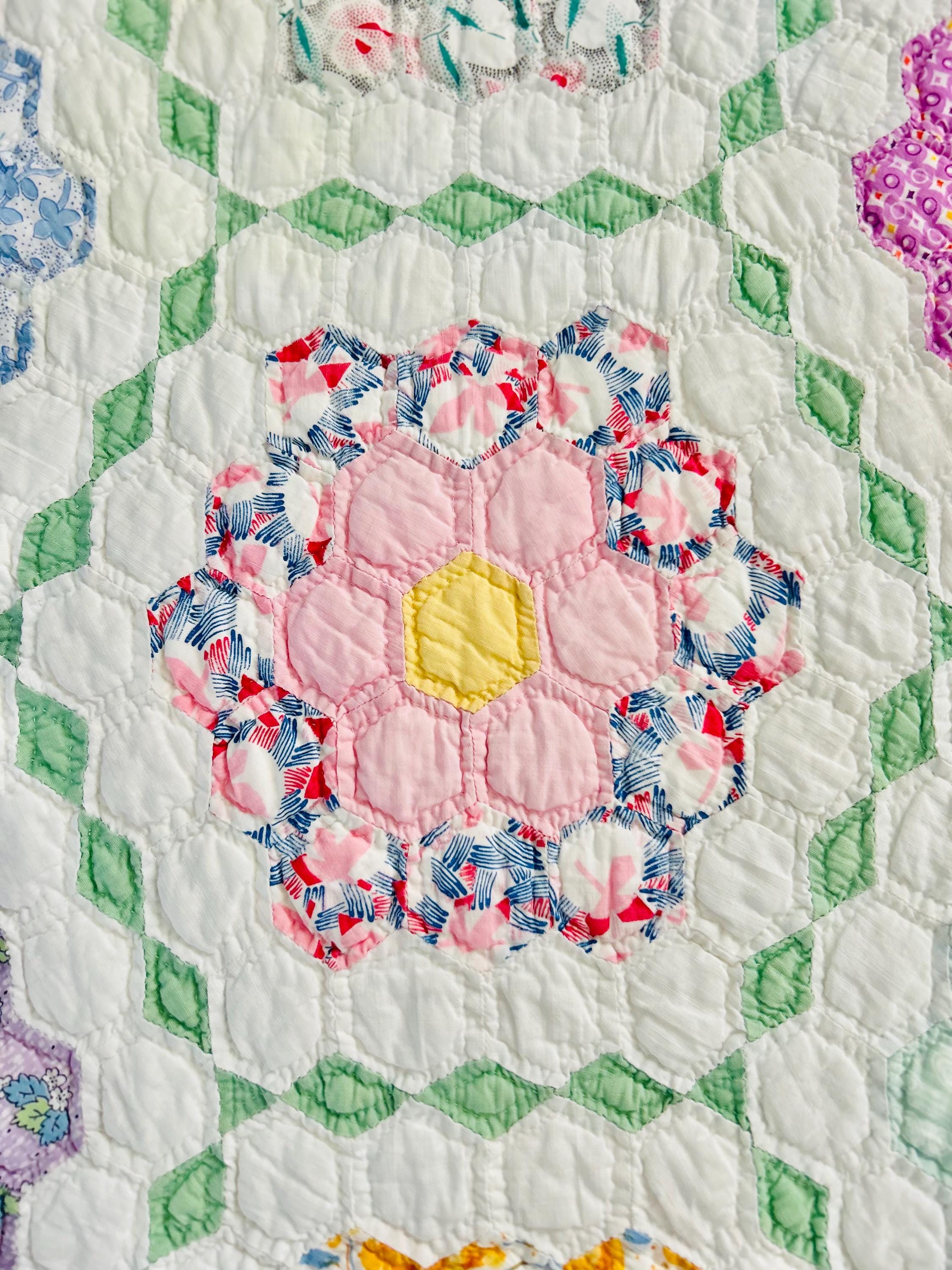 Grandmother's Flower Garden Antique Quilt, circa 1930s, with a unique, three-sided border and green diamond outlines of each "garden". The hand-quilting is in outlines of each of the thousands of hexagons and small diamonds.