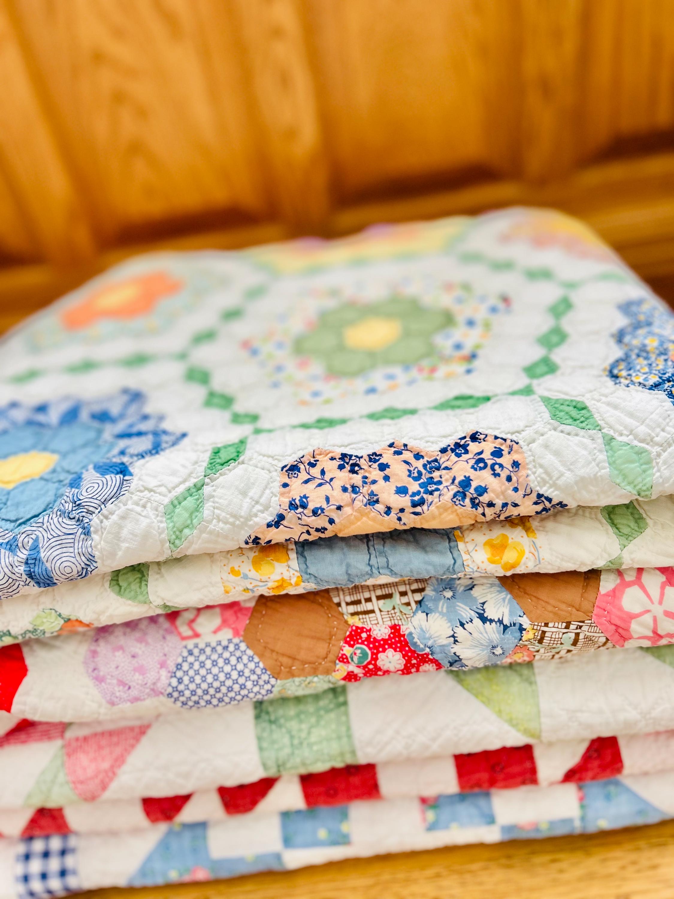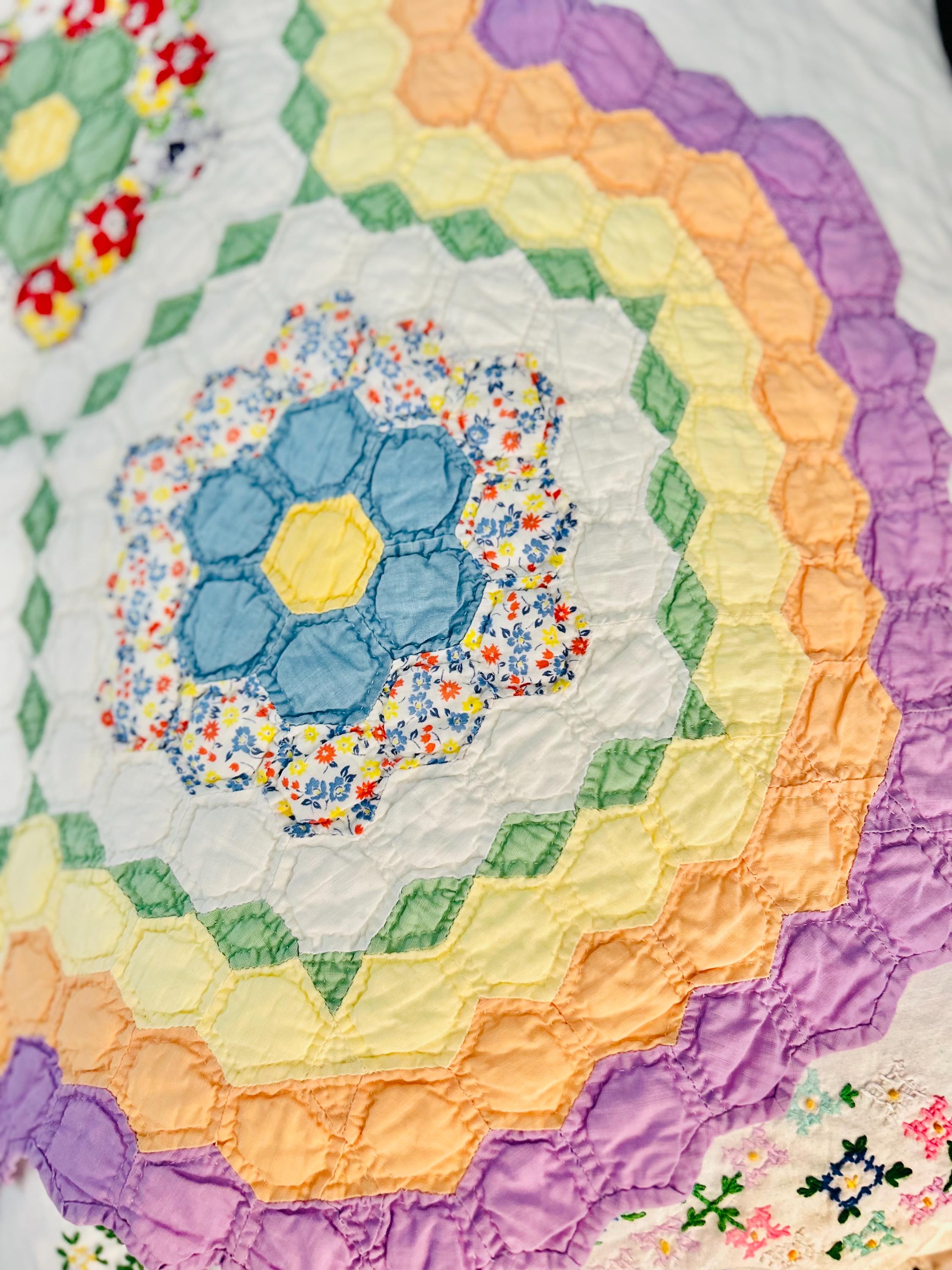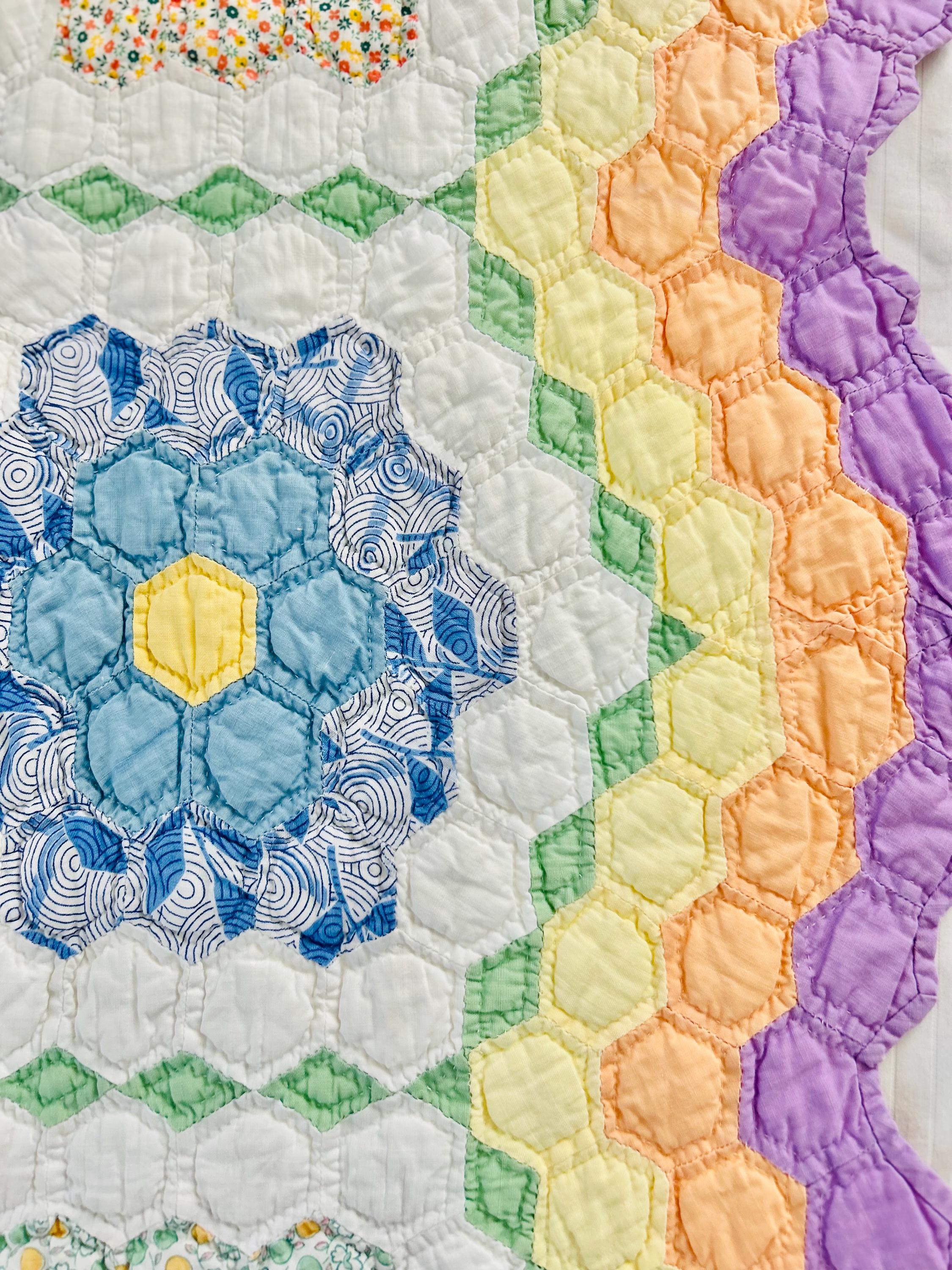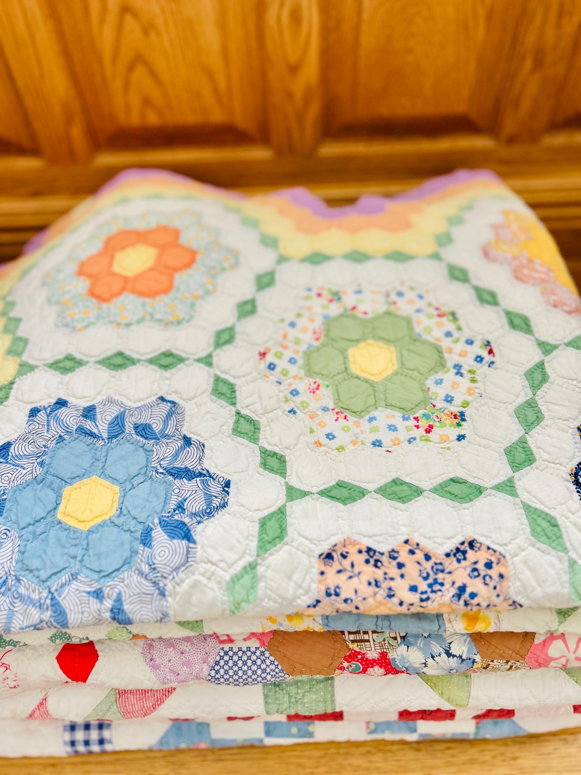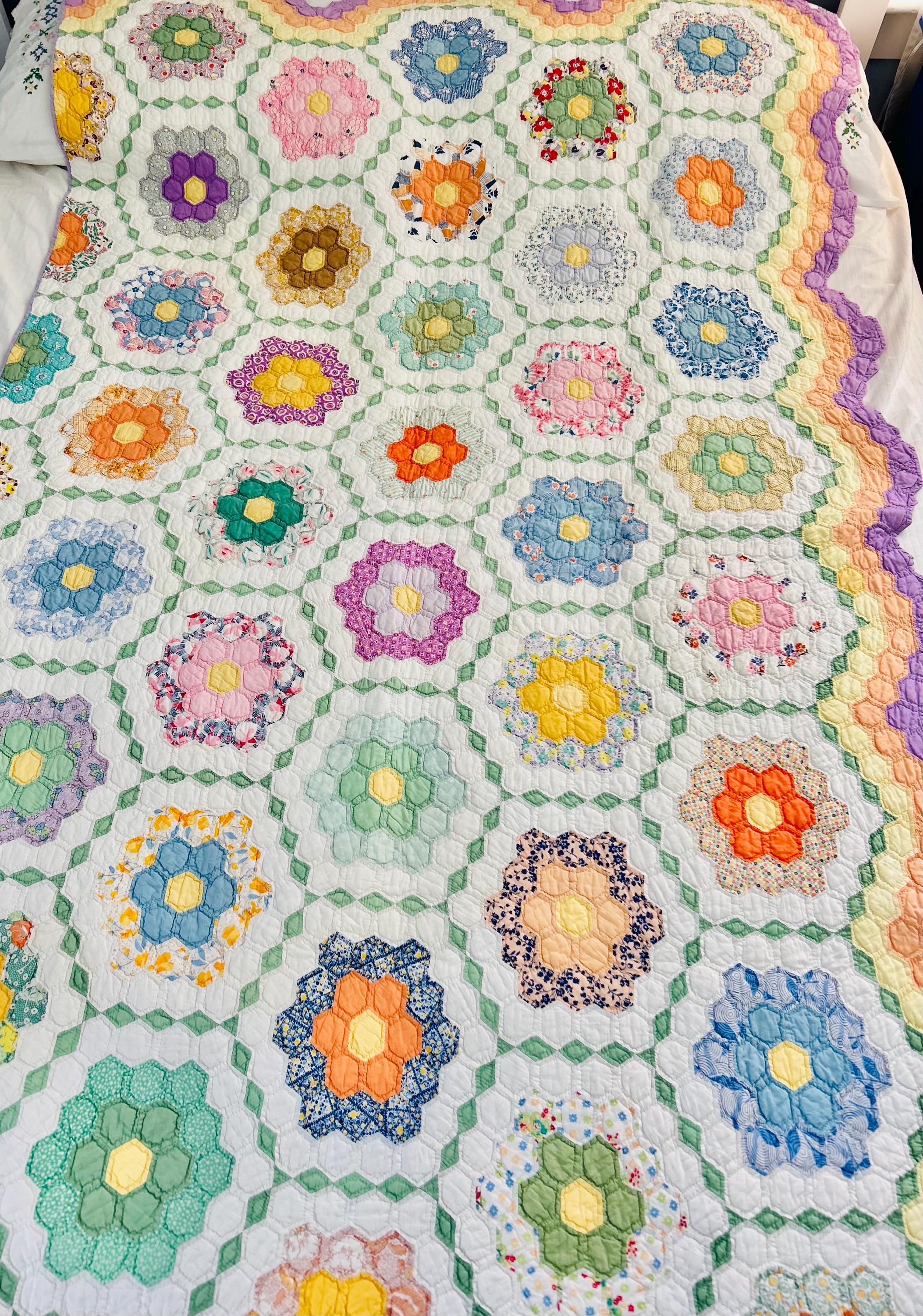 Grandmother's Flower Garden Antique Quilt, circa 1930s, with a unique, three-sided border and green diamond outlines of each "garden". The hand-quilting is in outlines of each of the thousands of hexagons and small diamonds.