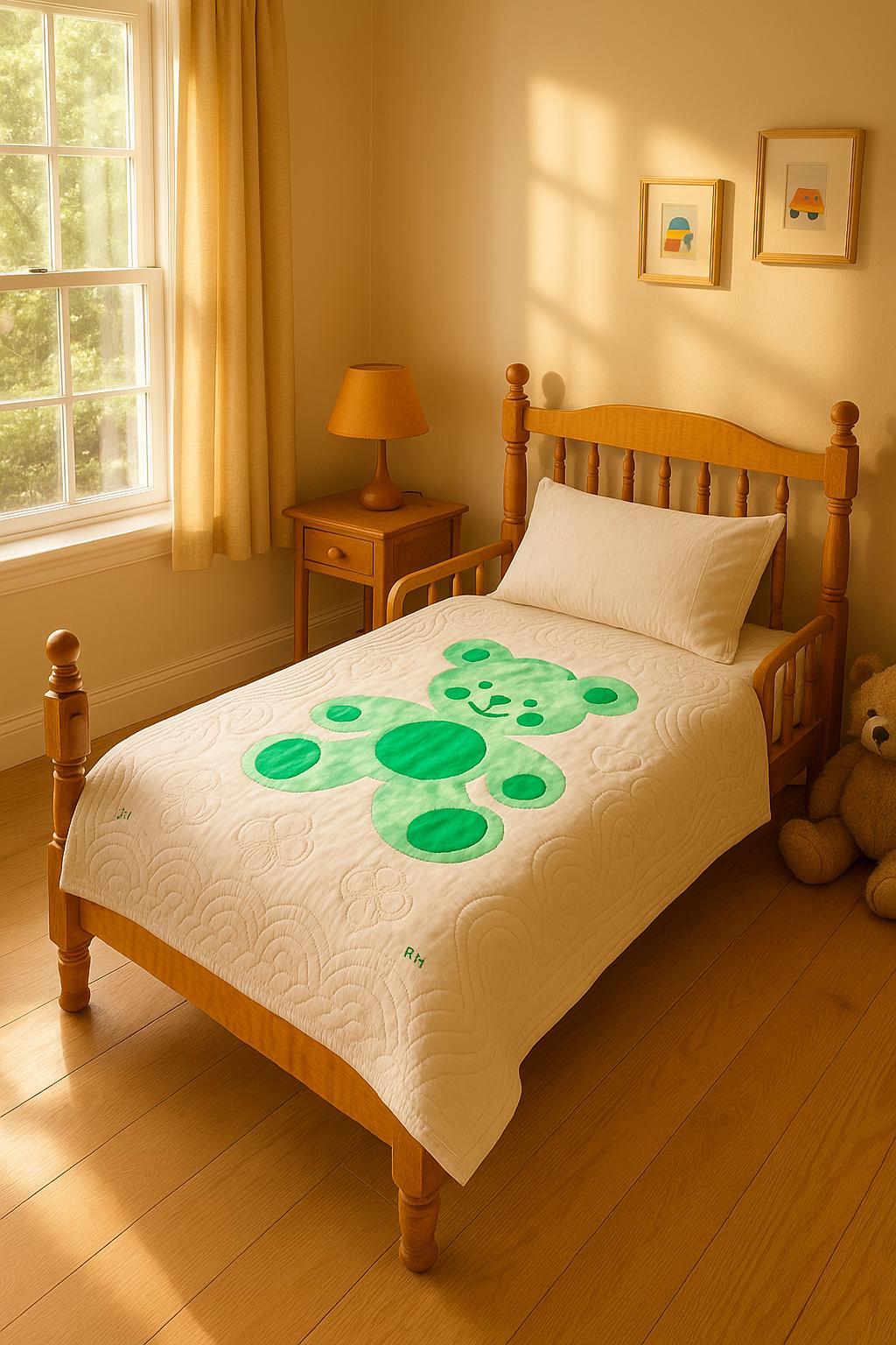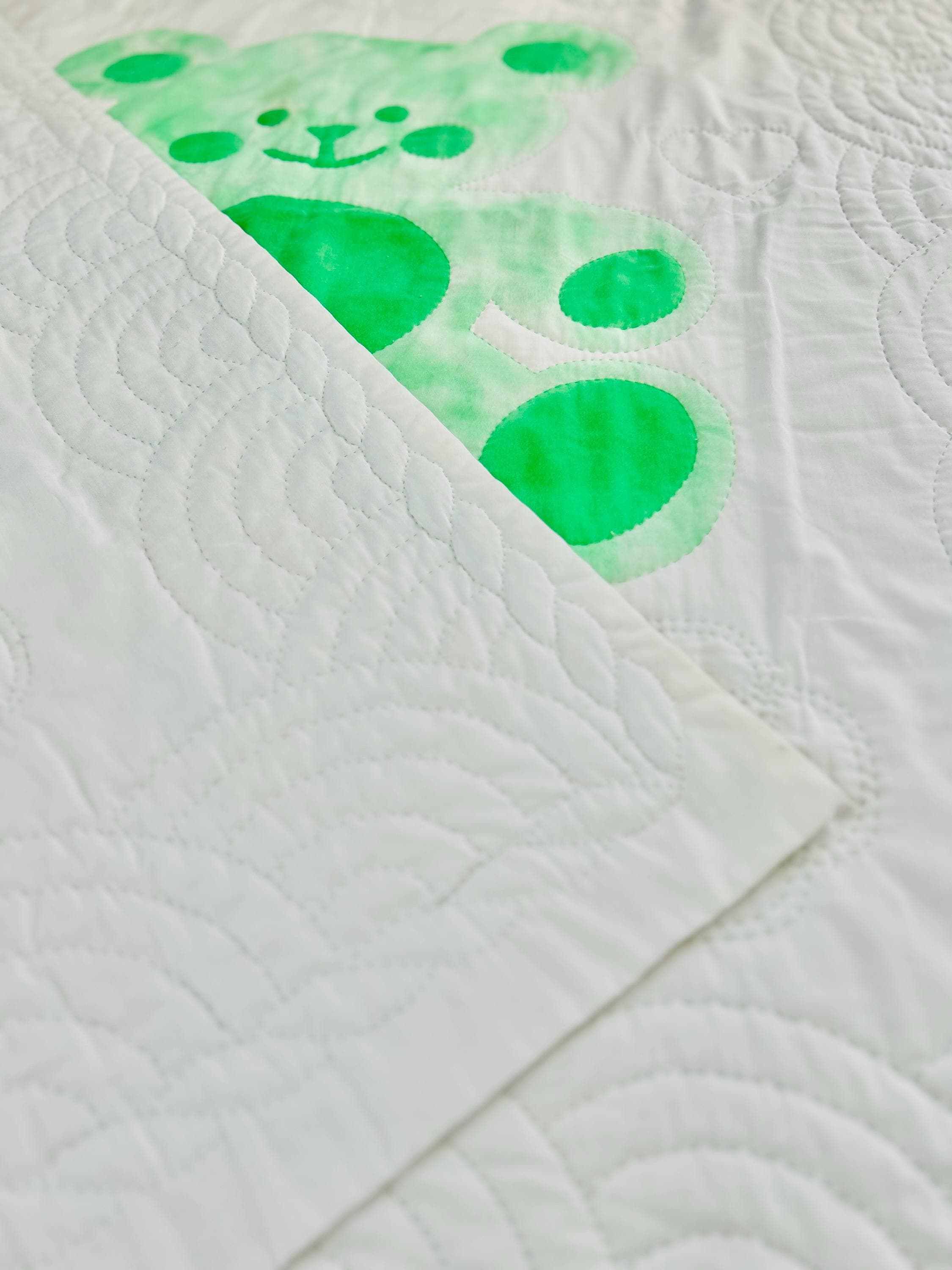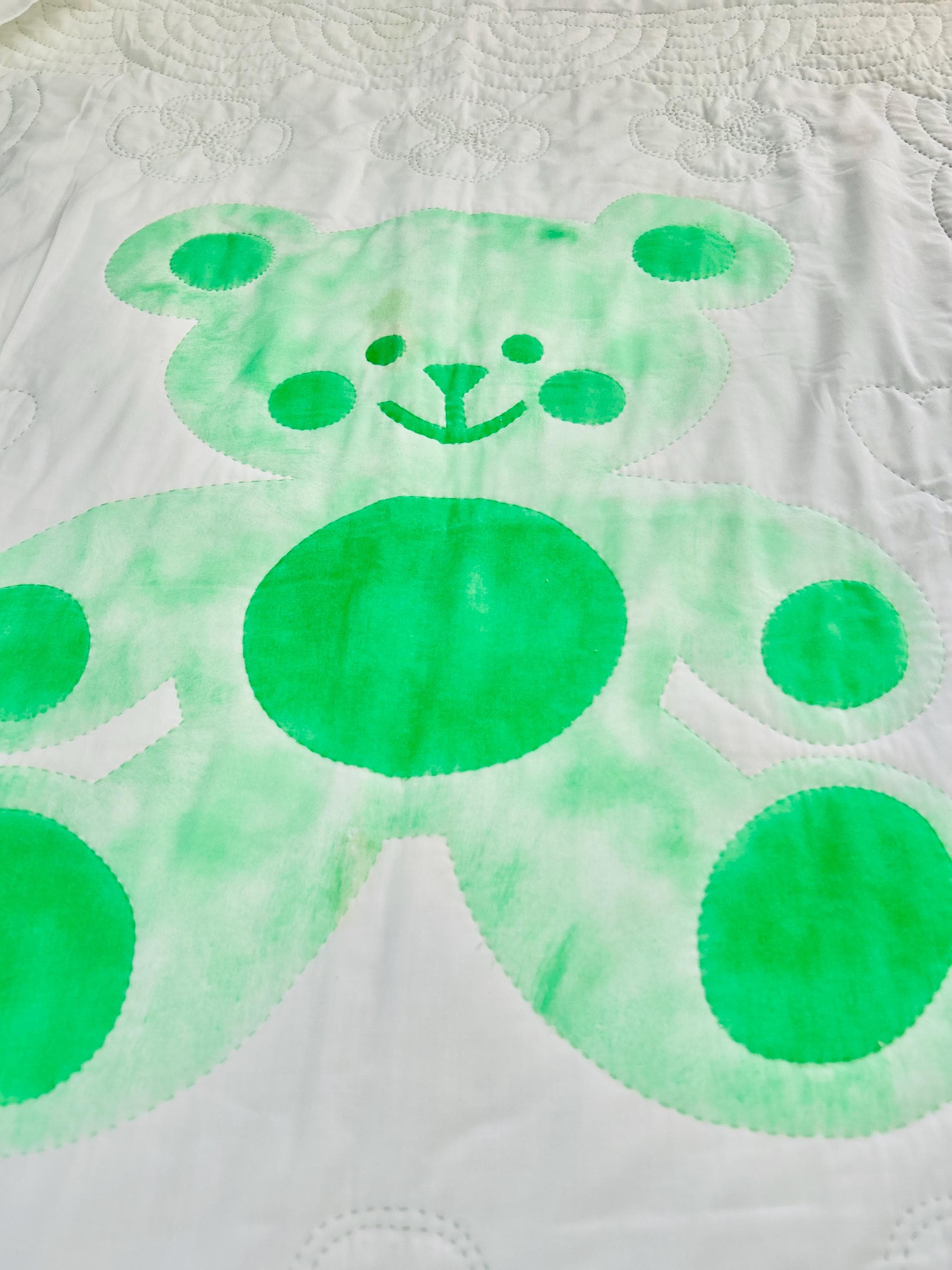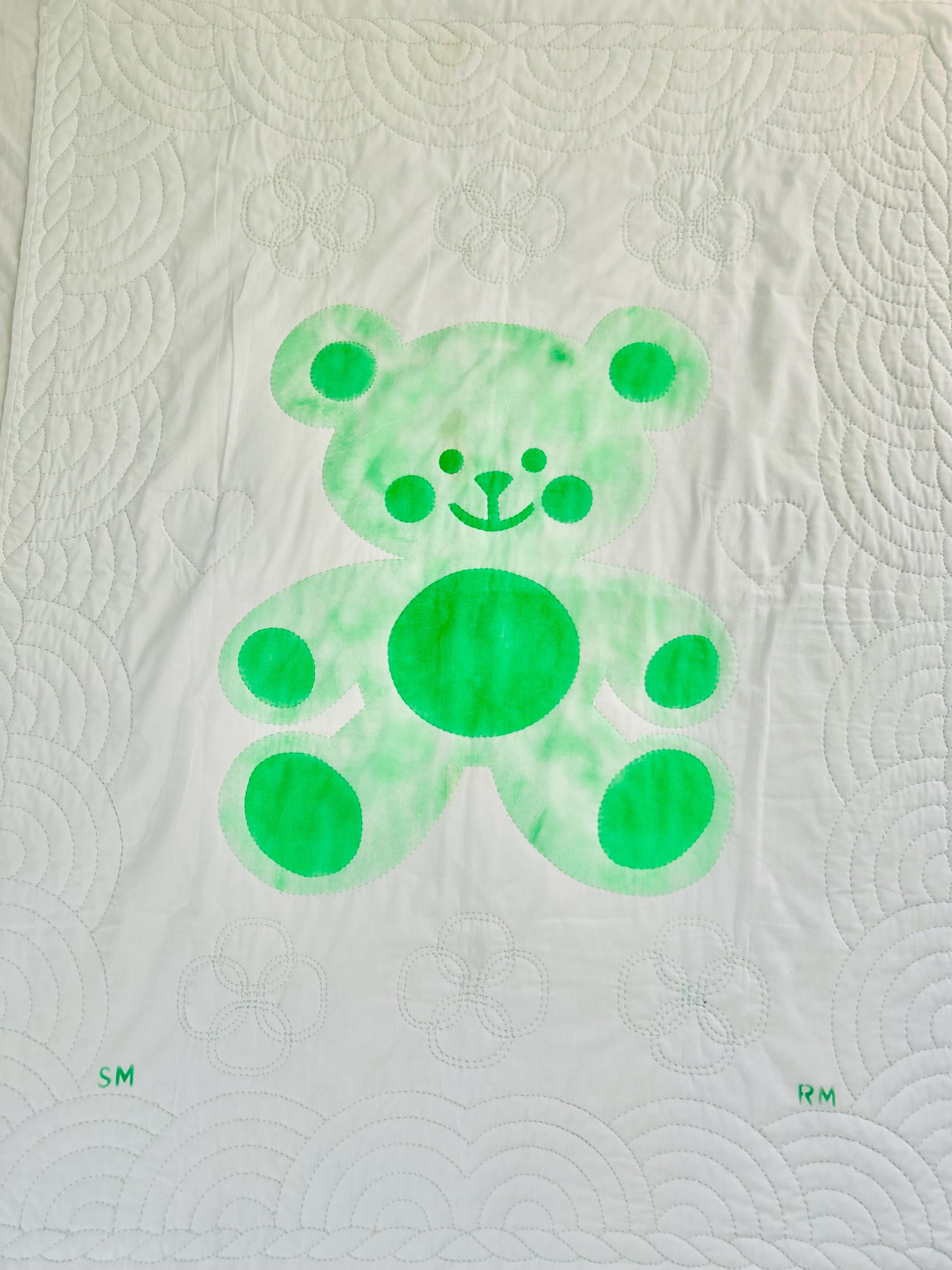 This vibrant green Teddy Bear Quilt has been initialed "SM" and "RM" and entirely hand-quilted - also in green - in braided rope patterns, interlocking circles, scallops and hearts.