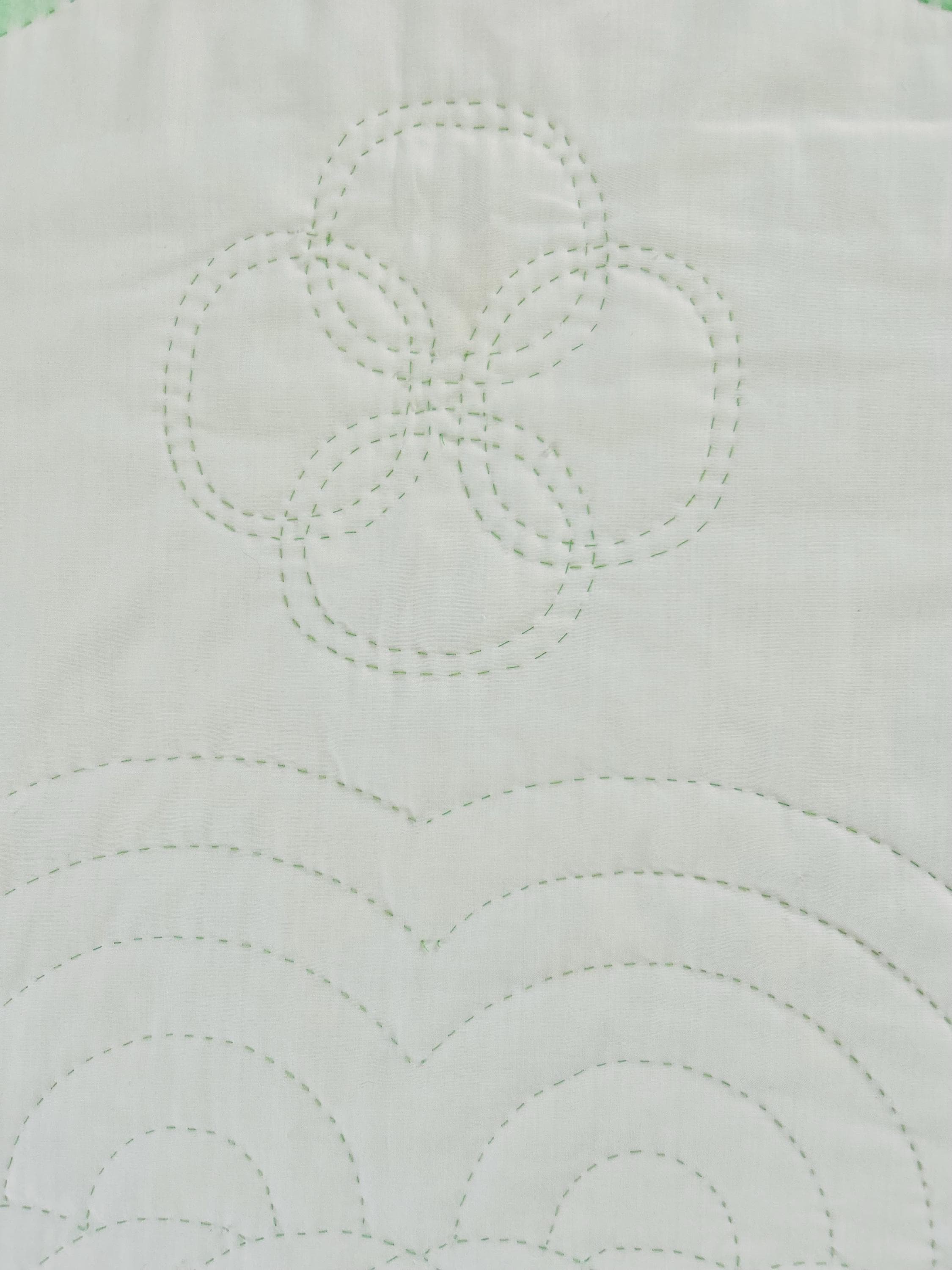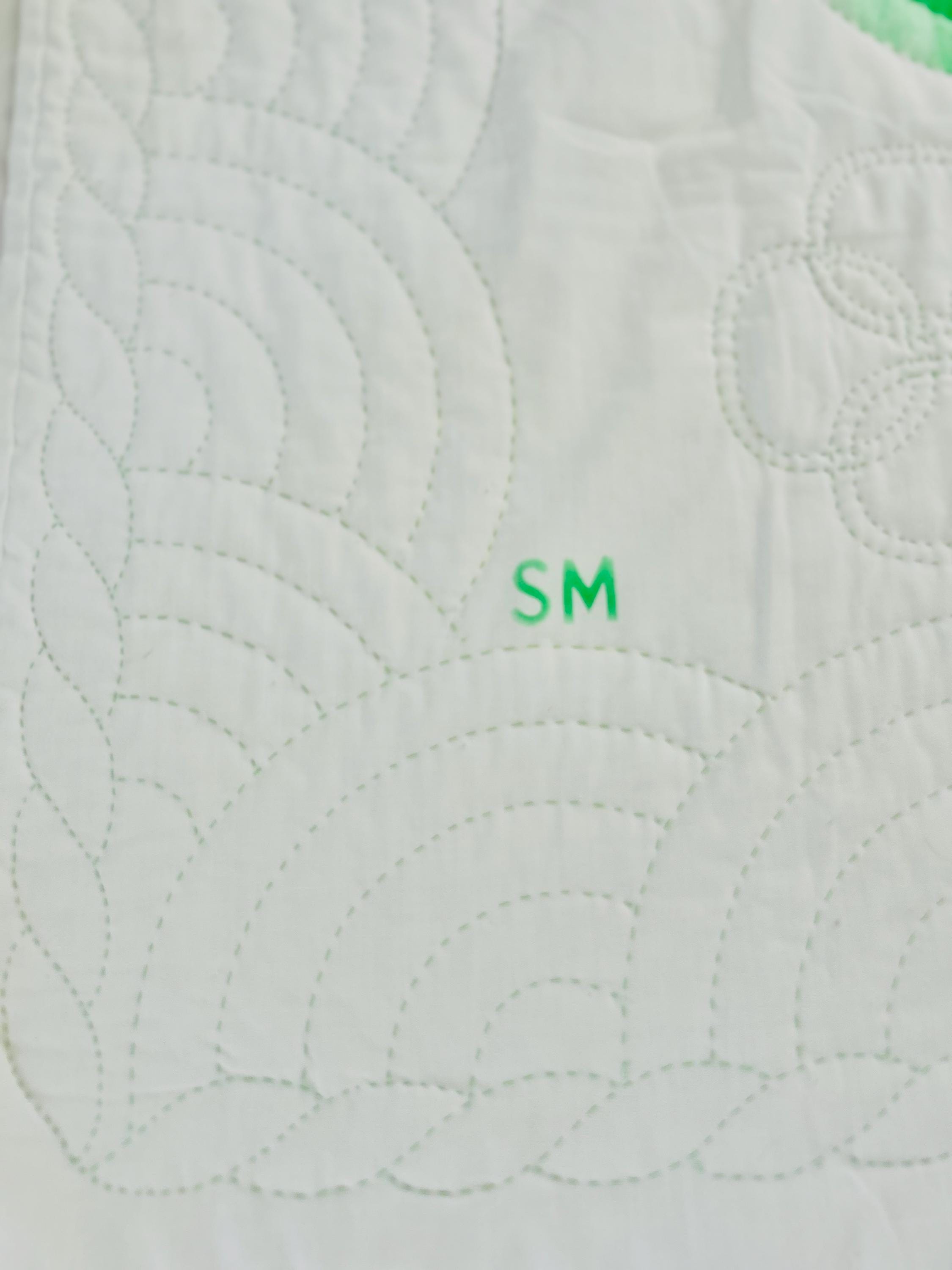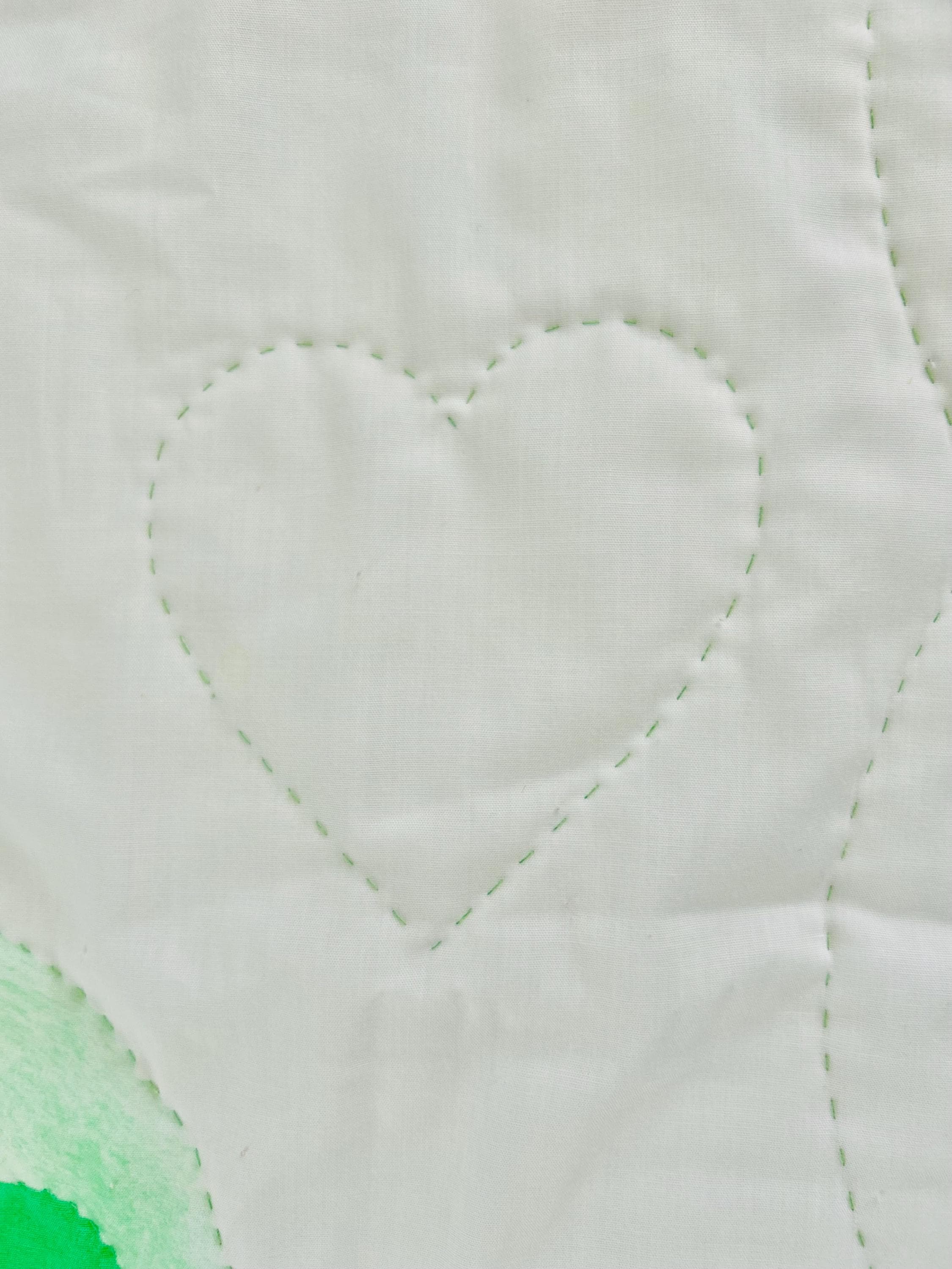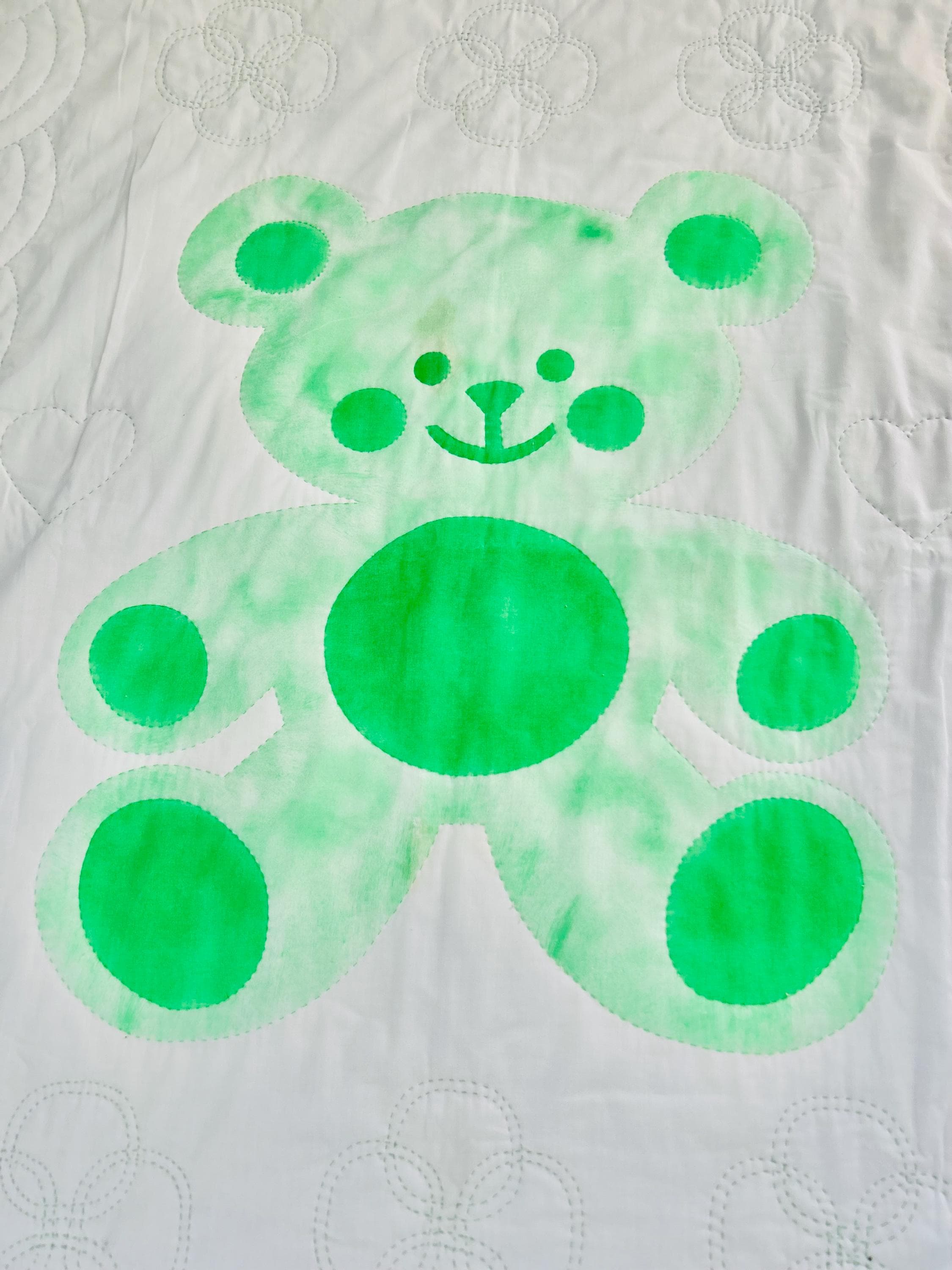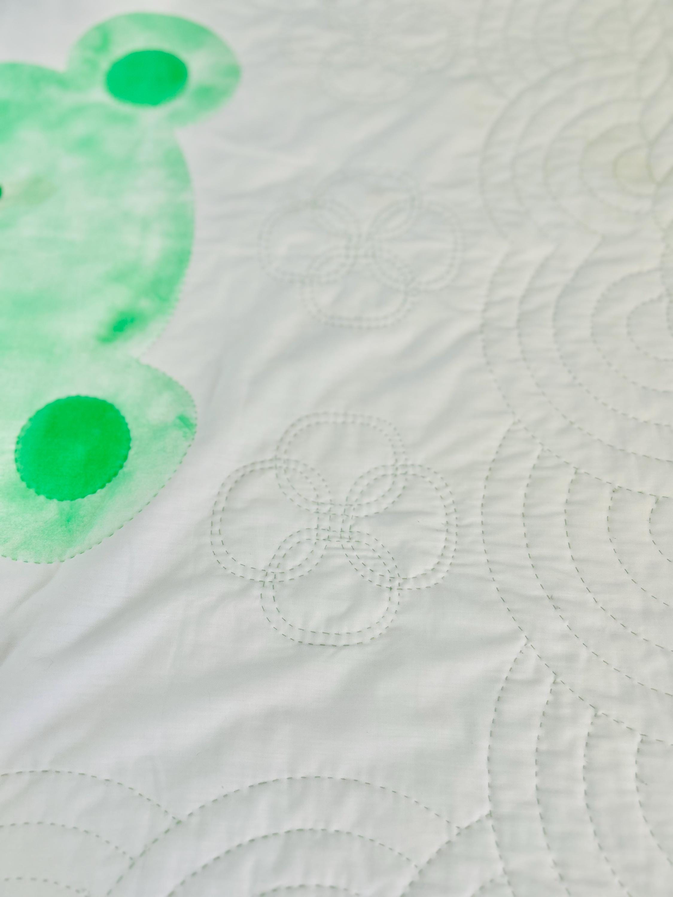 This vibrant green Teddy Bear Quilt has been initialed "SM" and "RM" and entirely hand-quilted - also in green - in braided rope patterns, interlocking circles, scallops and hearts.
