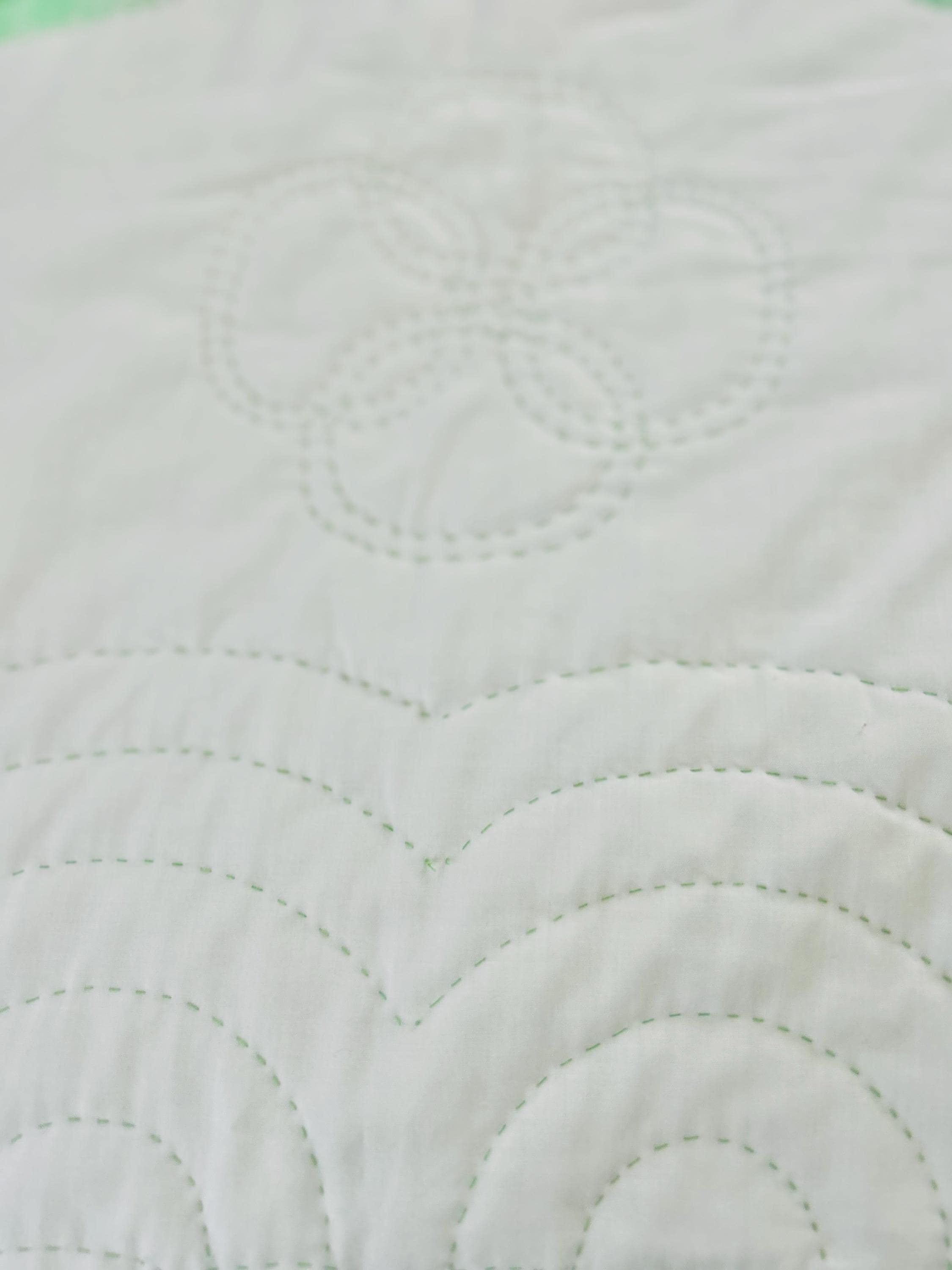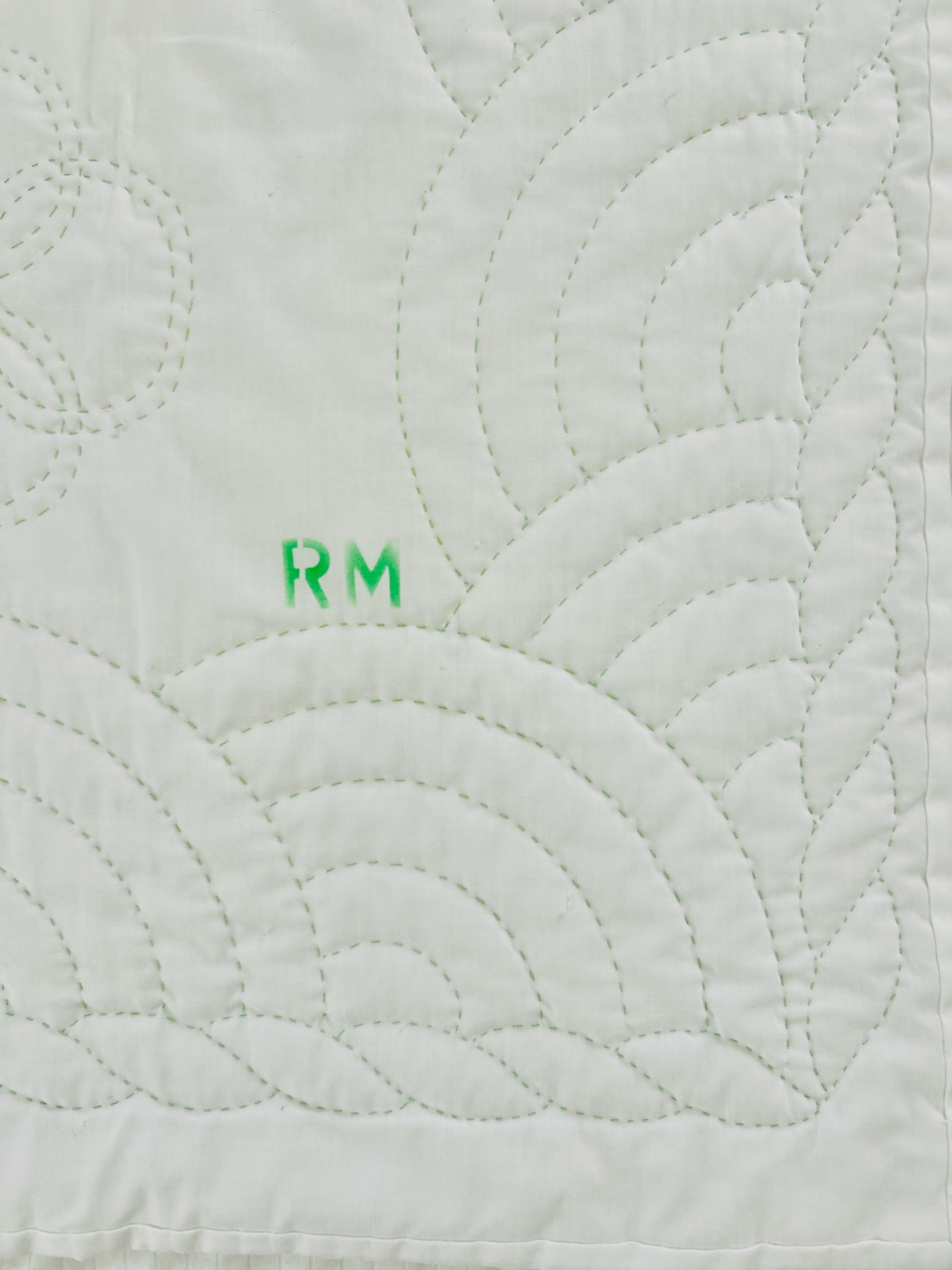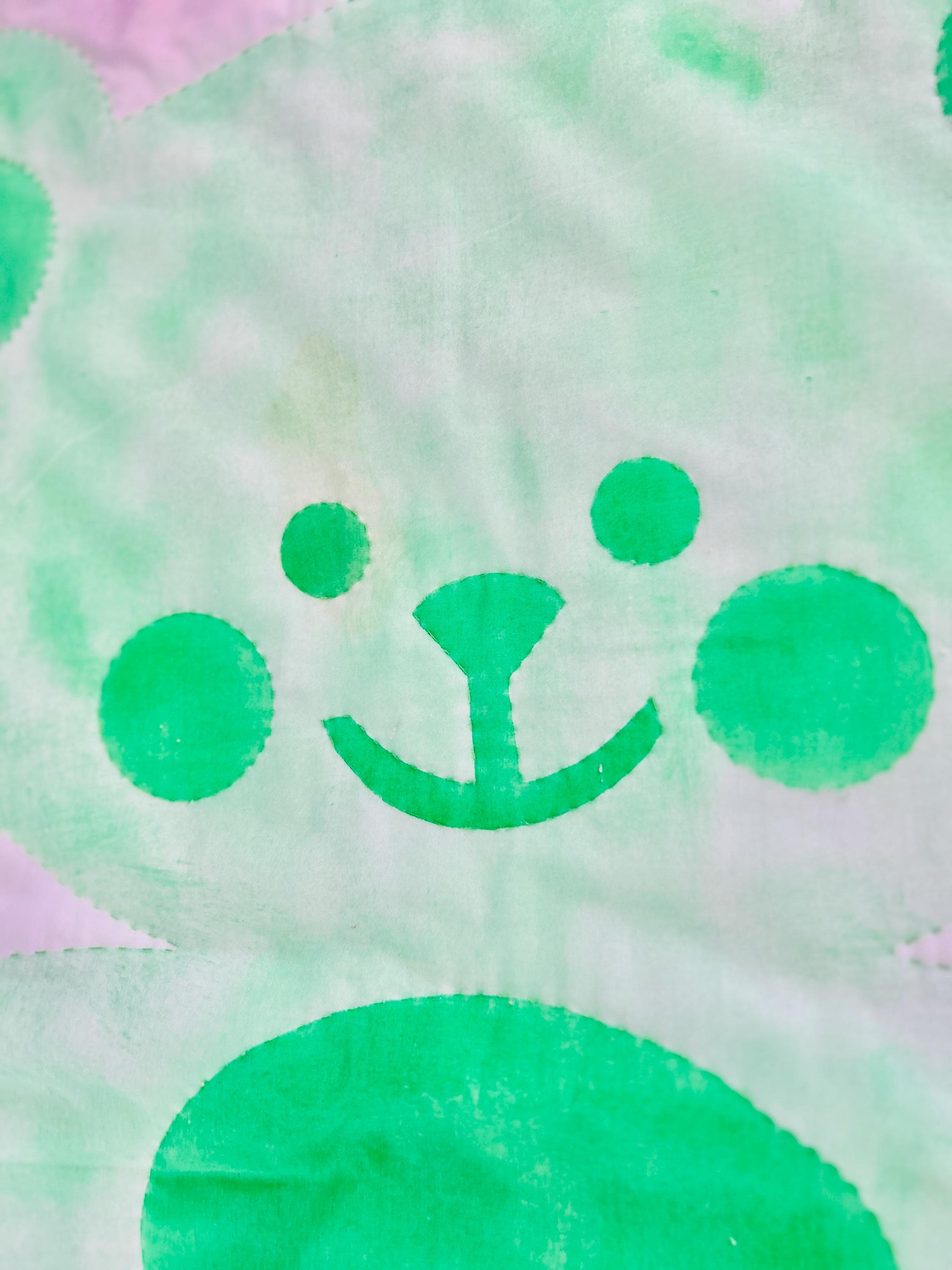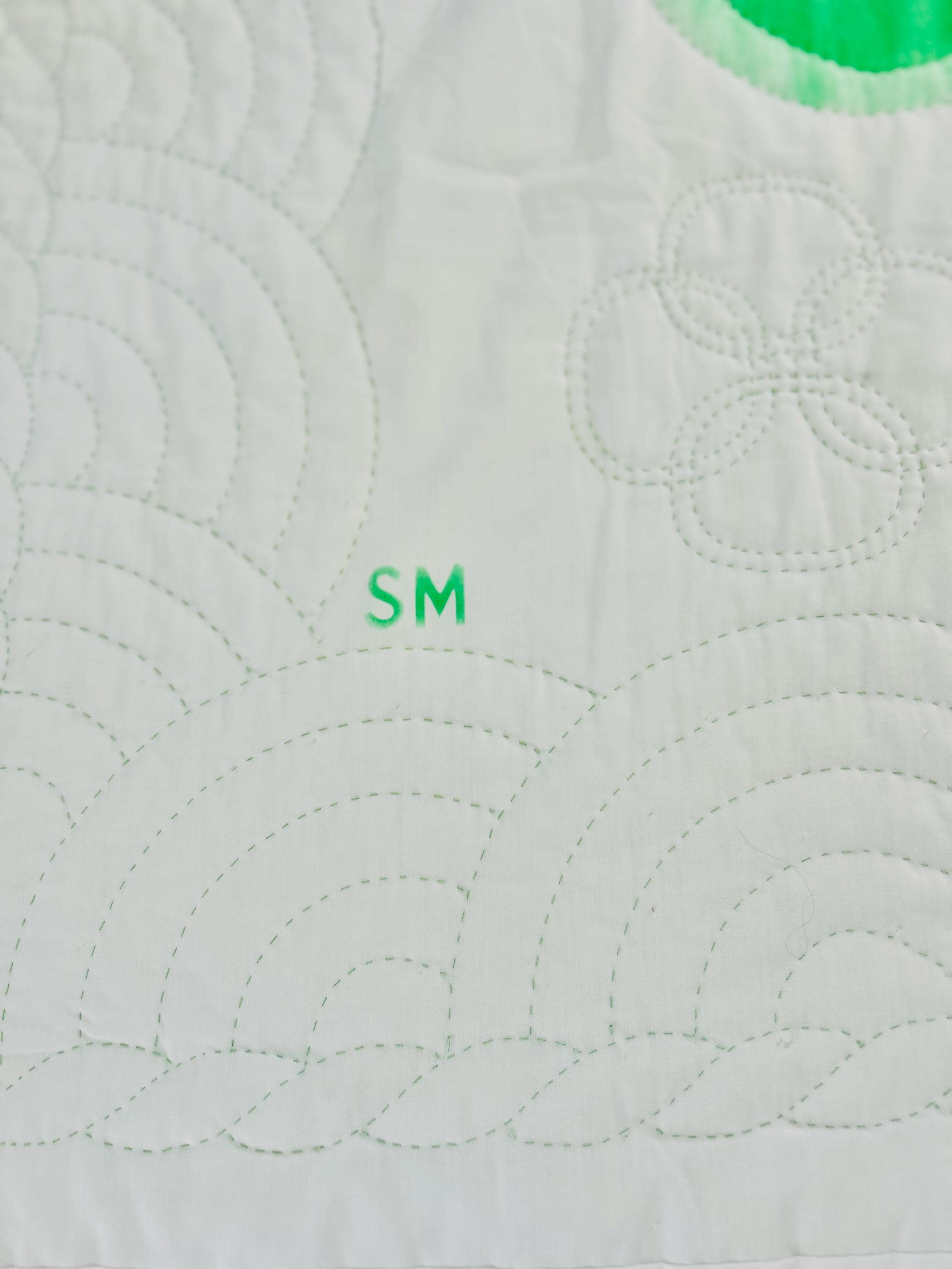 This vibrant green Teddy Bear Quilt has been initialed "SM" and "RM" and entirely hand-quilted - also in green - in braided rope patterns, interlocking circles, scallops and hearts.