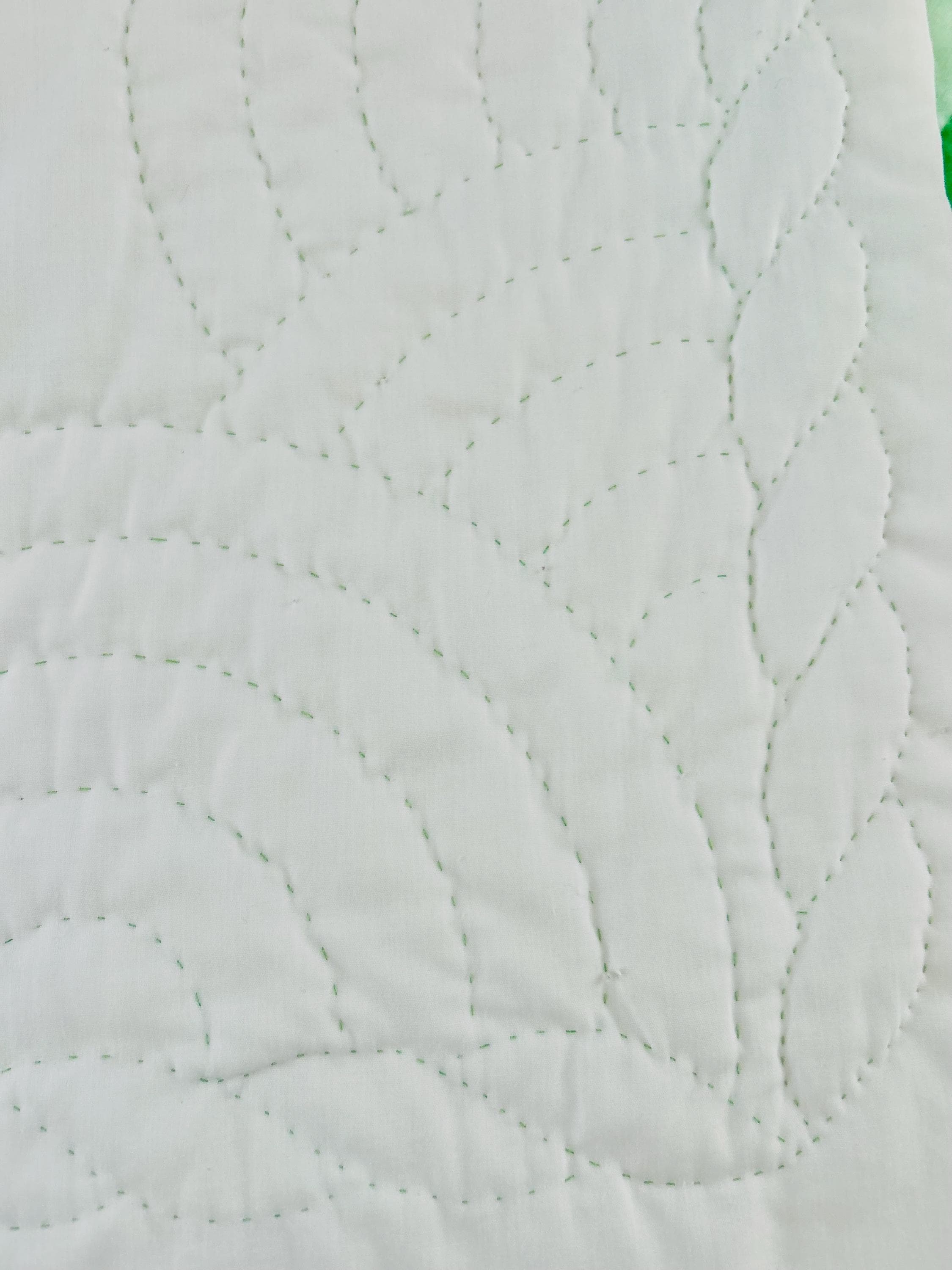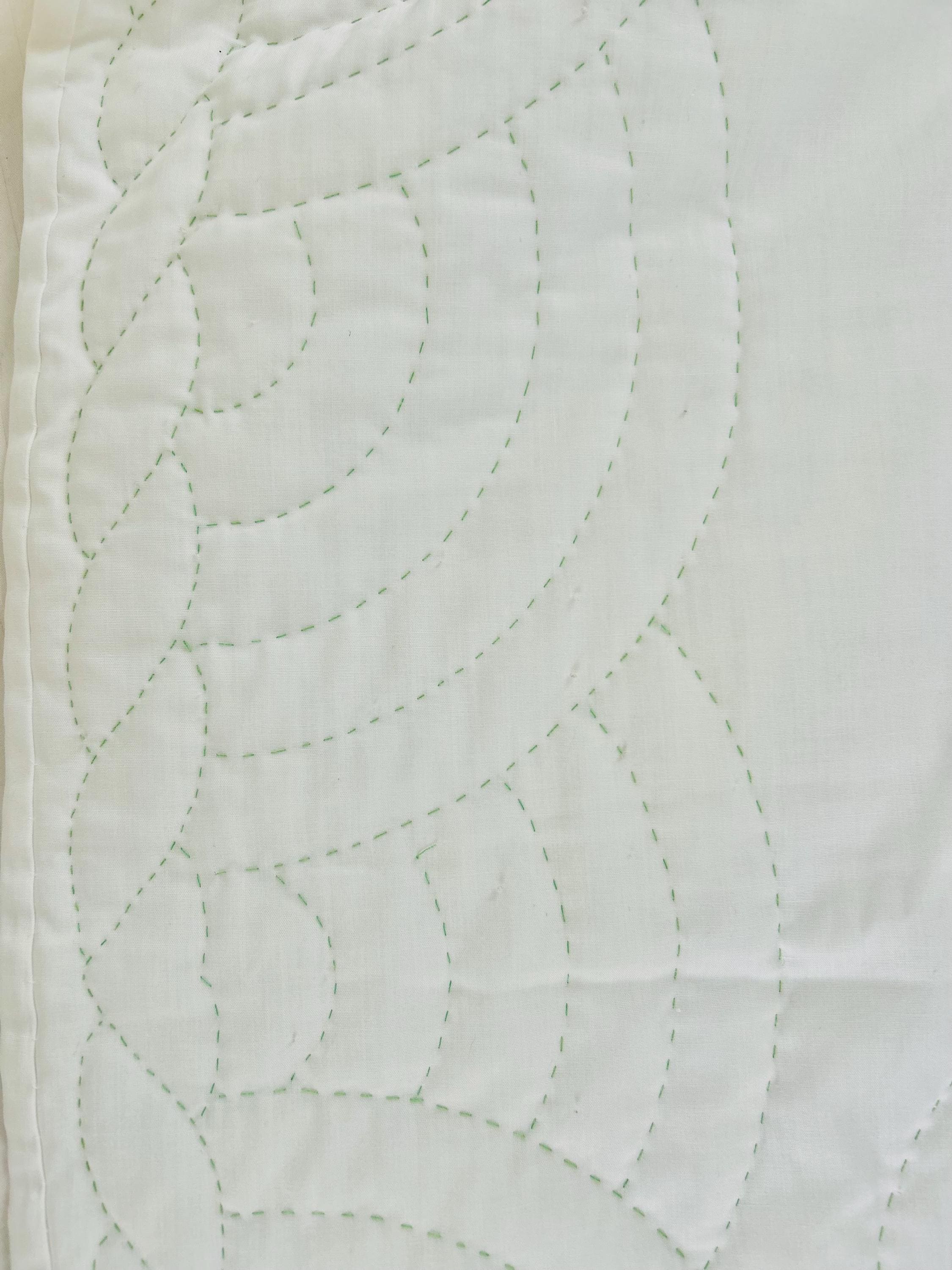 The back is white cotton that has been turned to the front and hand-stitched to form the binding. The batting is lightweight.