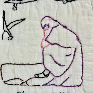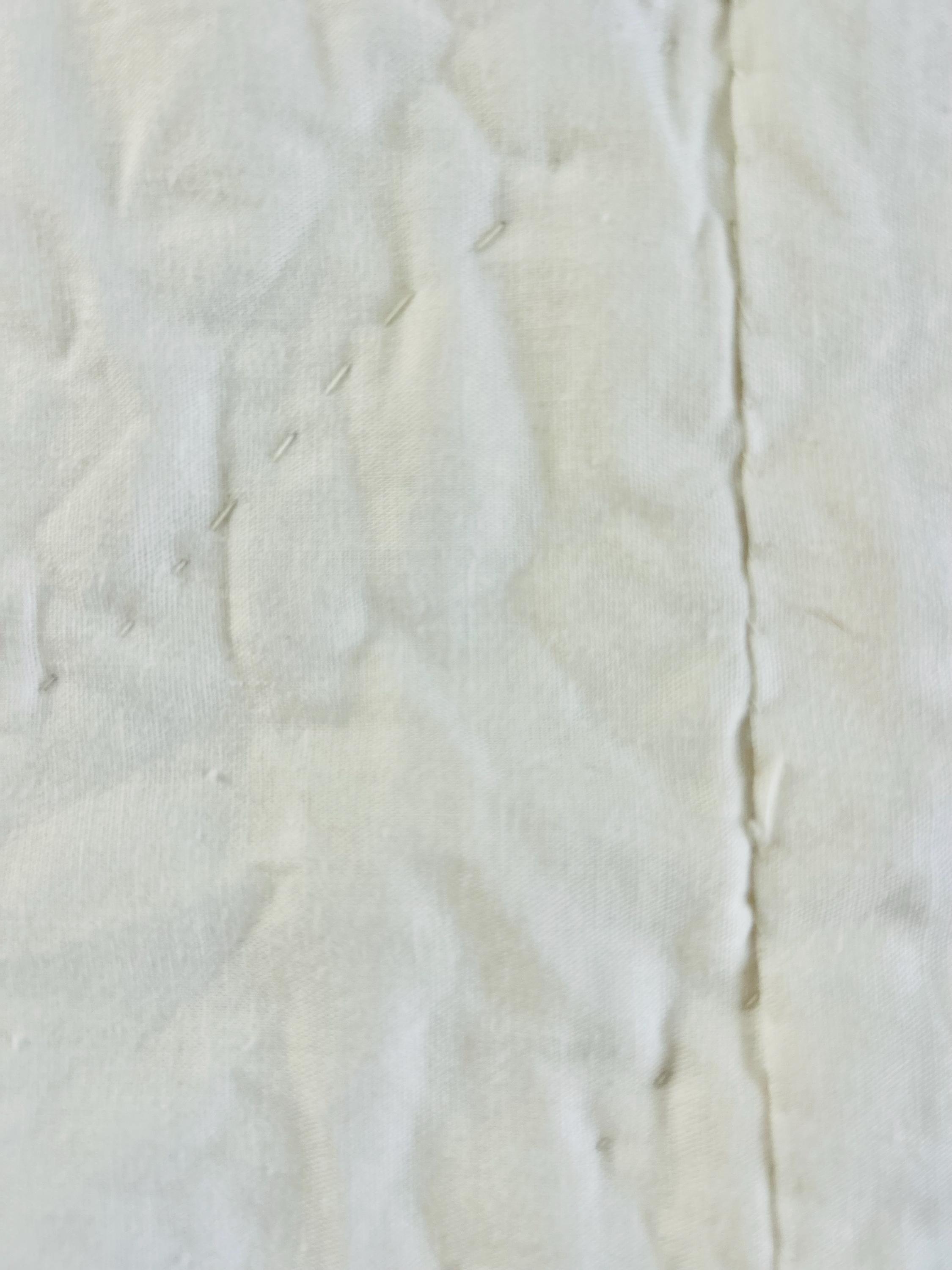 The back is white cotton that has been turned to the front and machine stitched to form the binding. The batting is cotton and very lightweight.