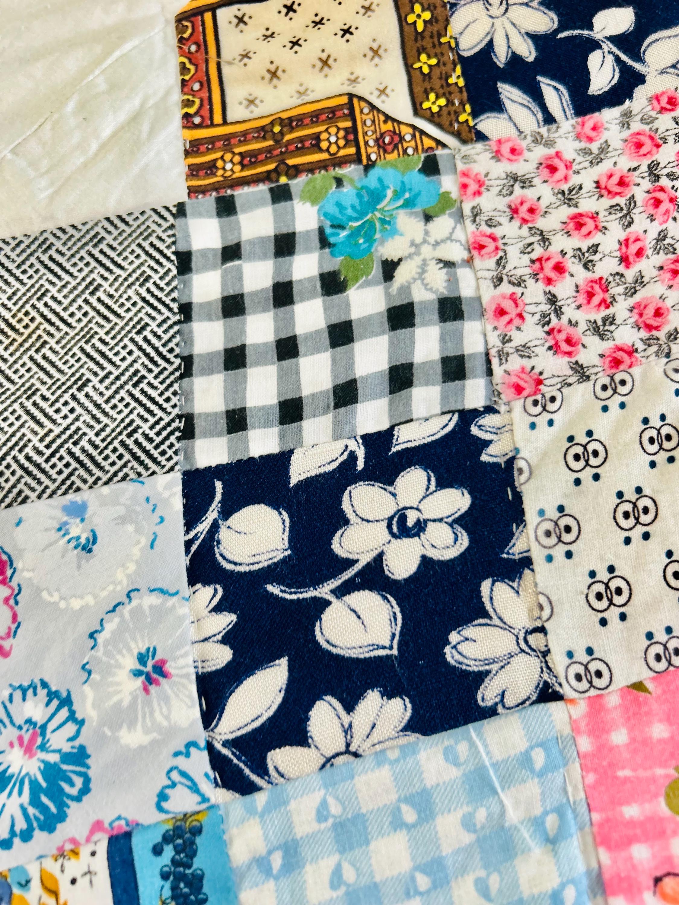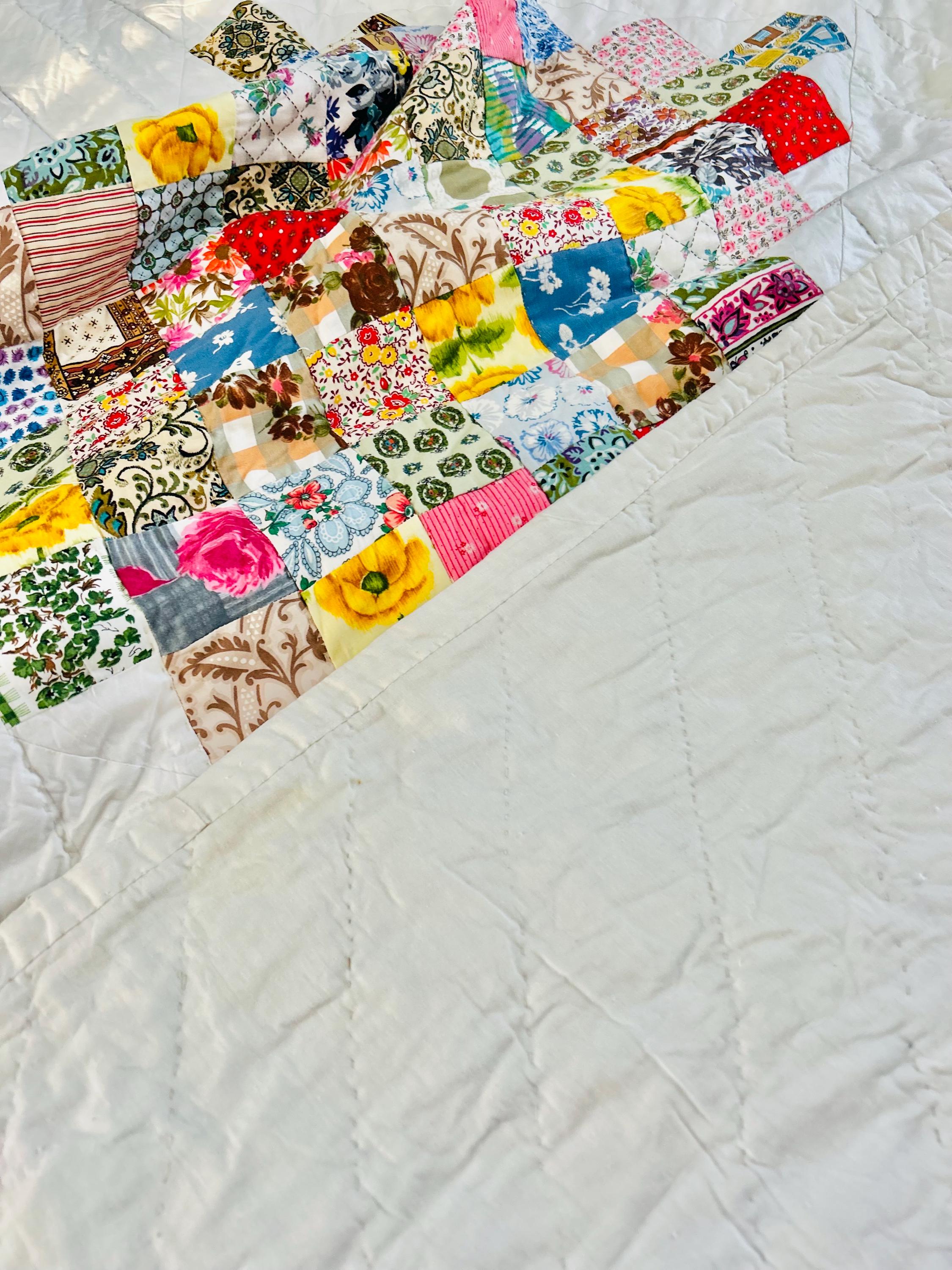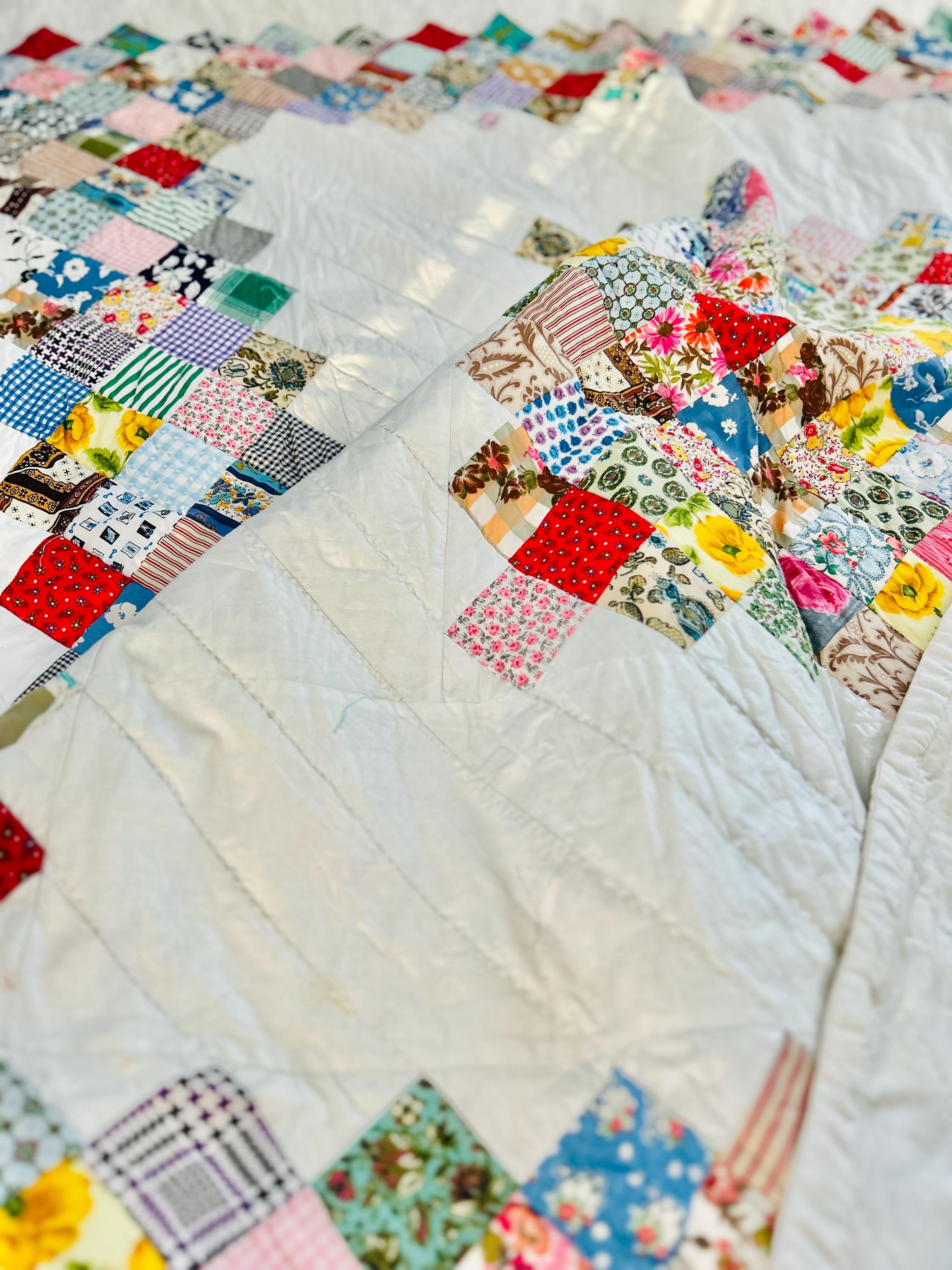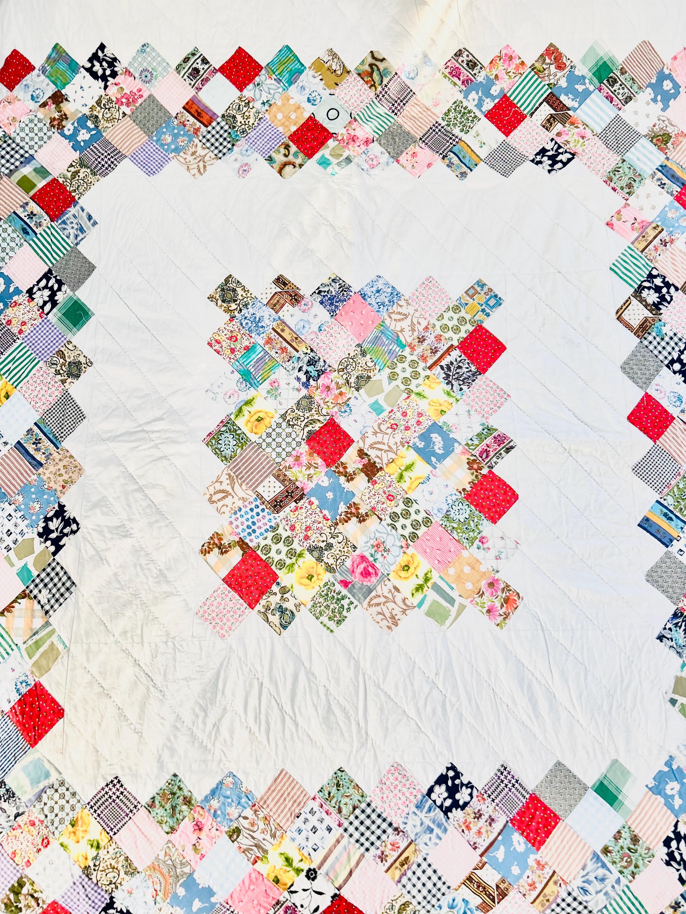 This is a 1950s or early 1960s Boston Commons Quilt pieced in a variety of high-quality cottons. It has been quilted in diagonals throughout the quilt, including on the four-sided border.