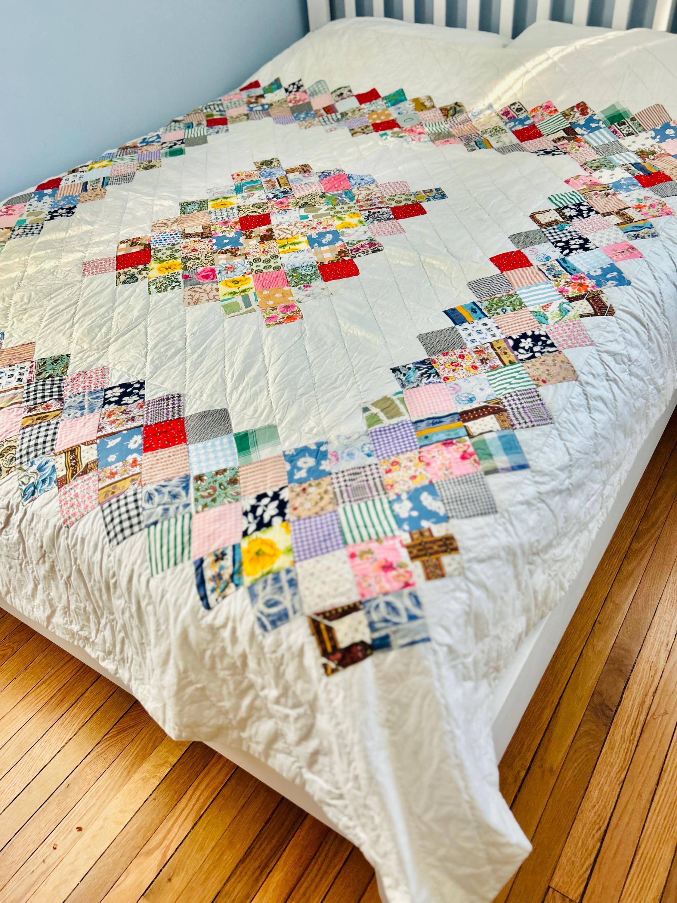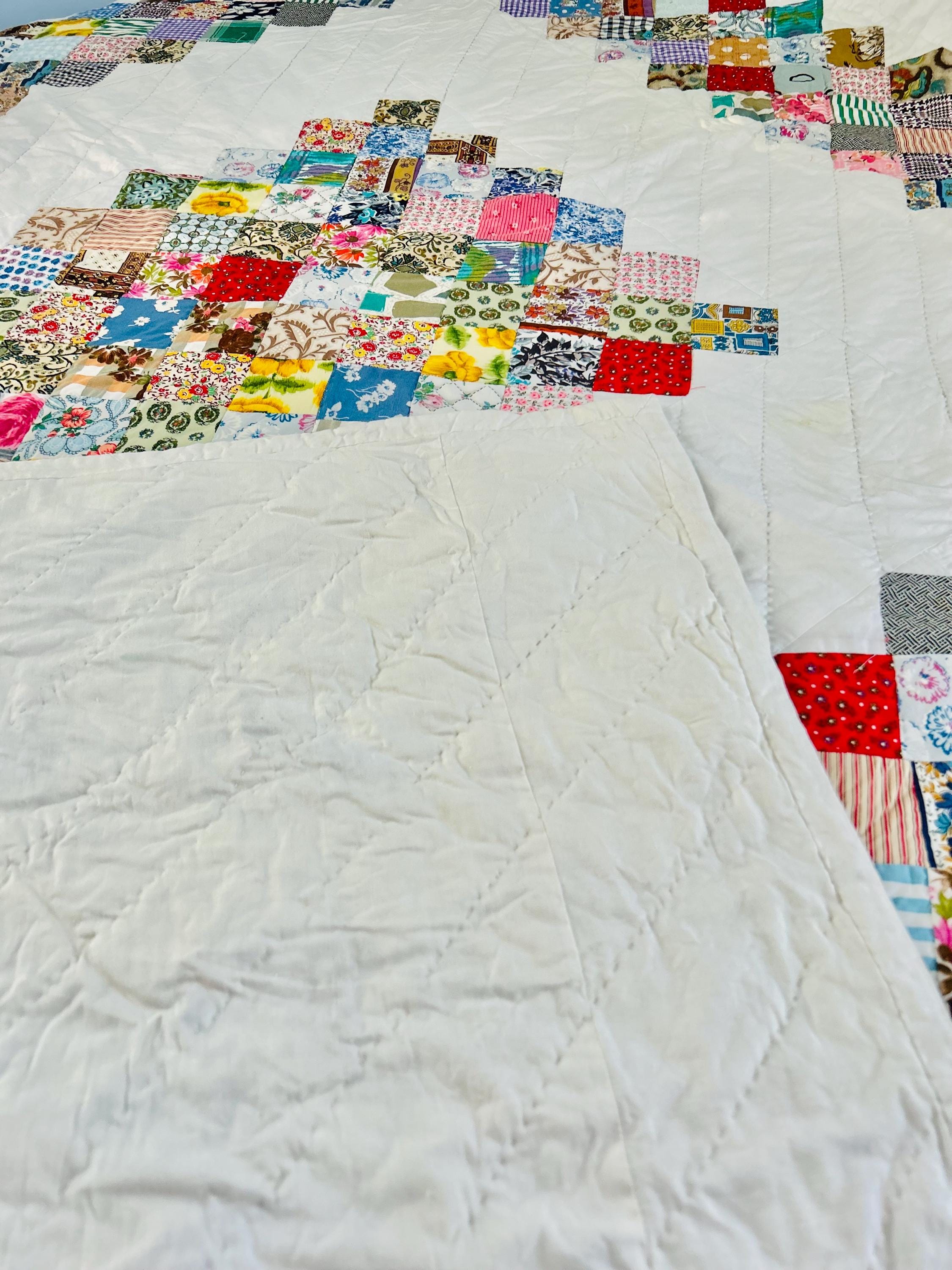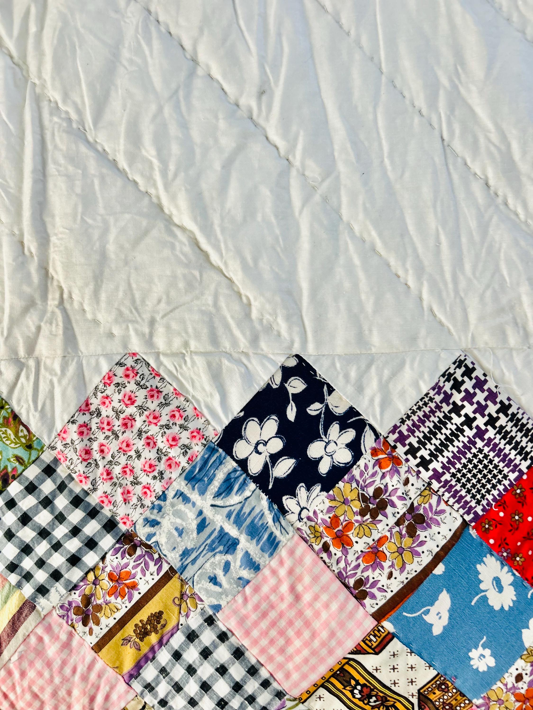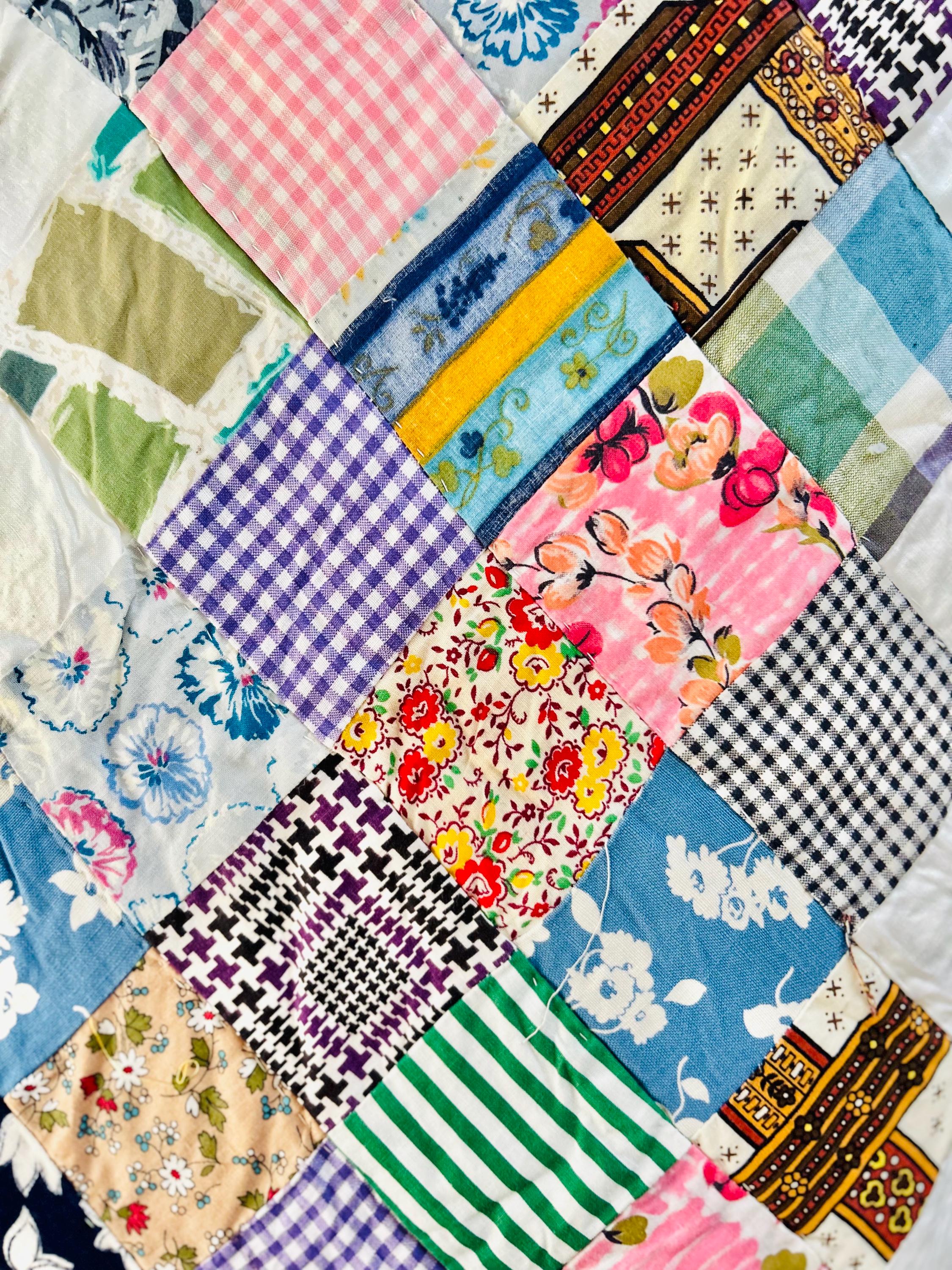 This is a 1950s or early 1960s Boston Commons Quilt pieced in a variety of high-quality cottons. It has been quilted in diagonals throughout the quilt, including on the four-sided border.