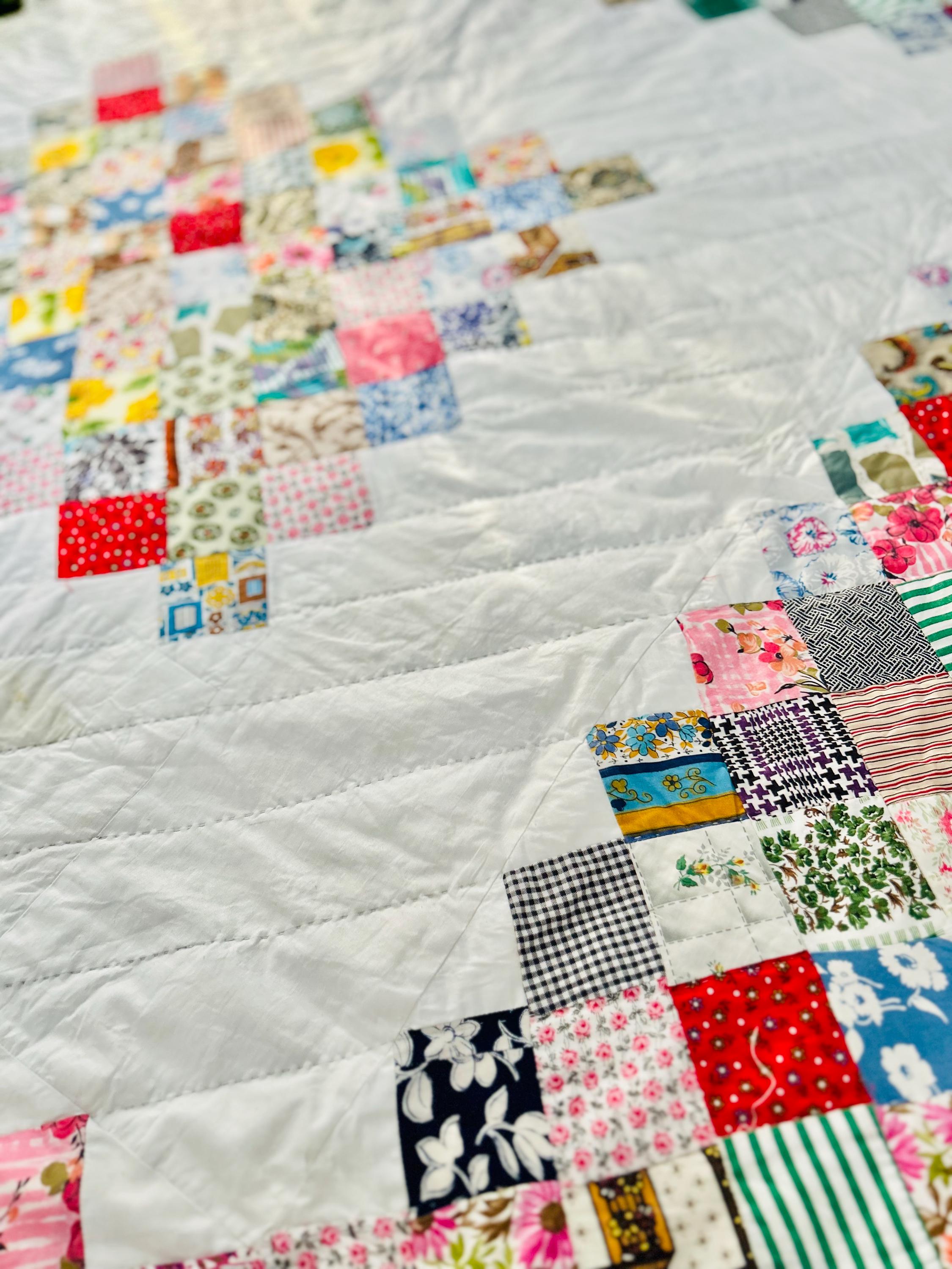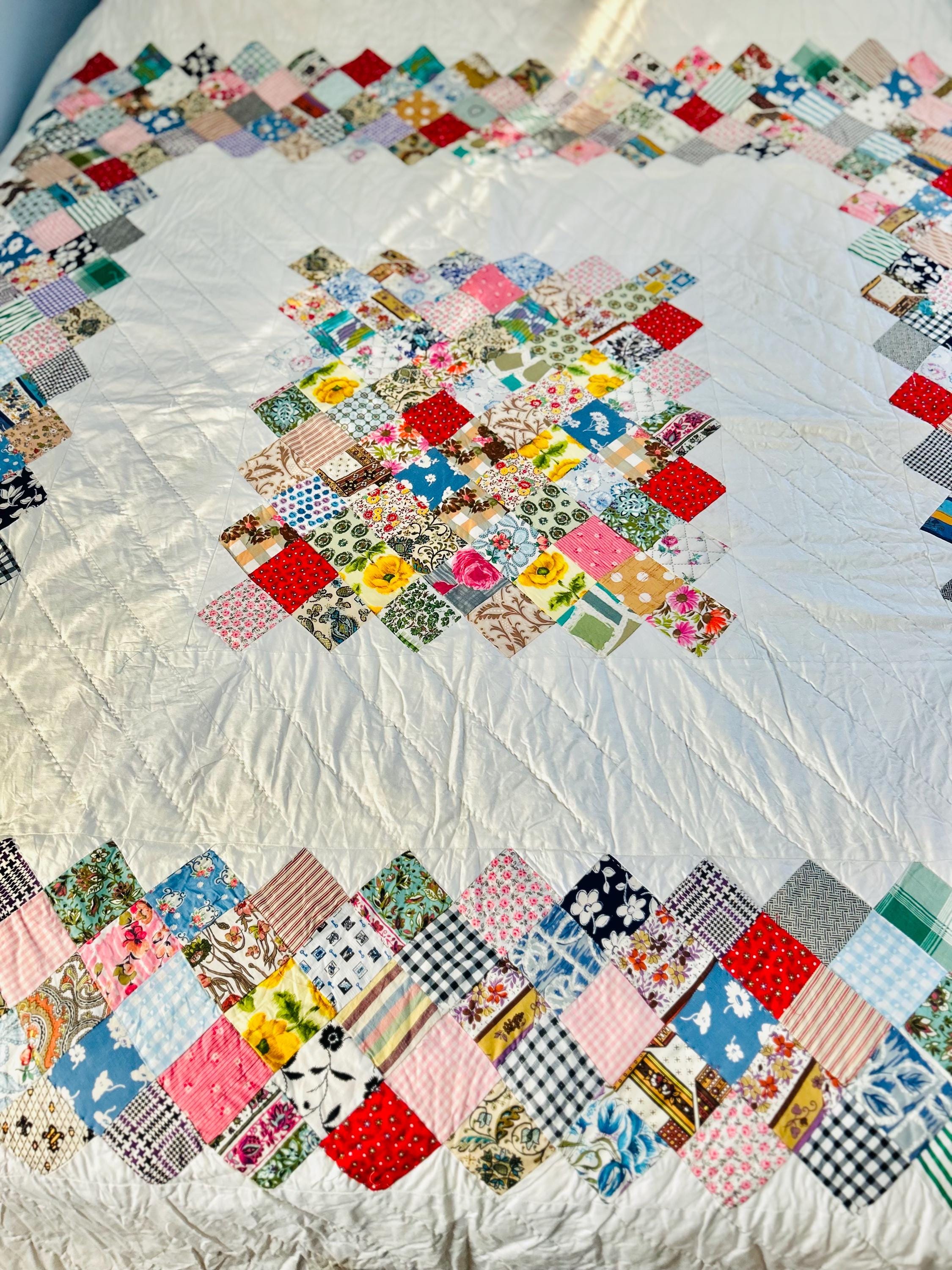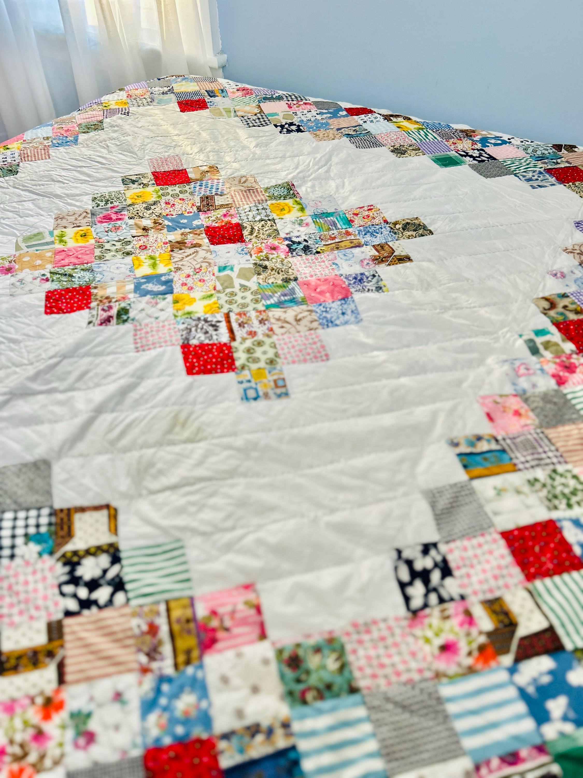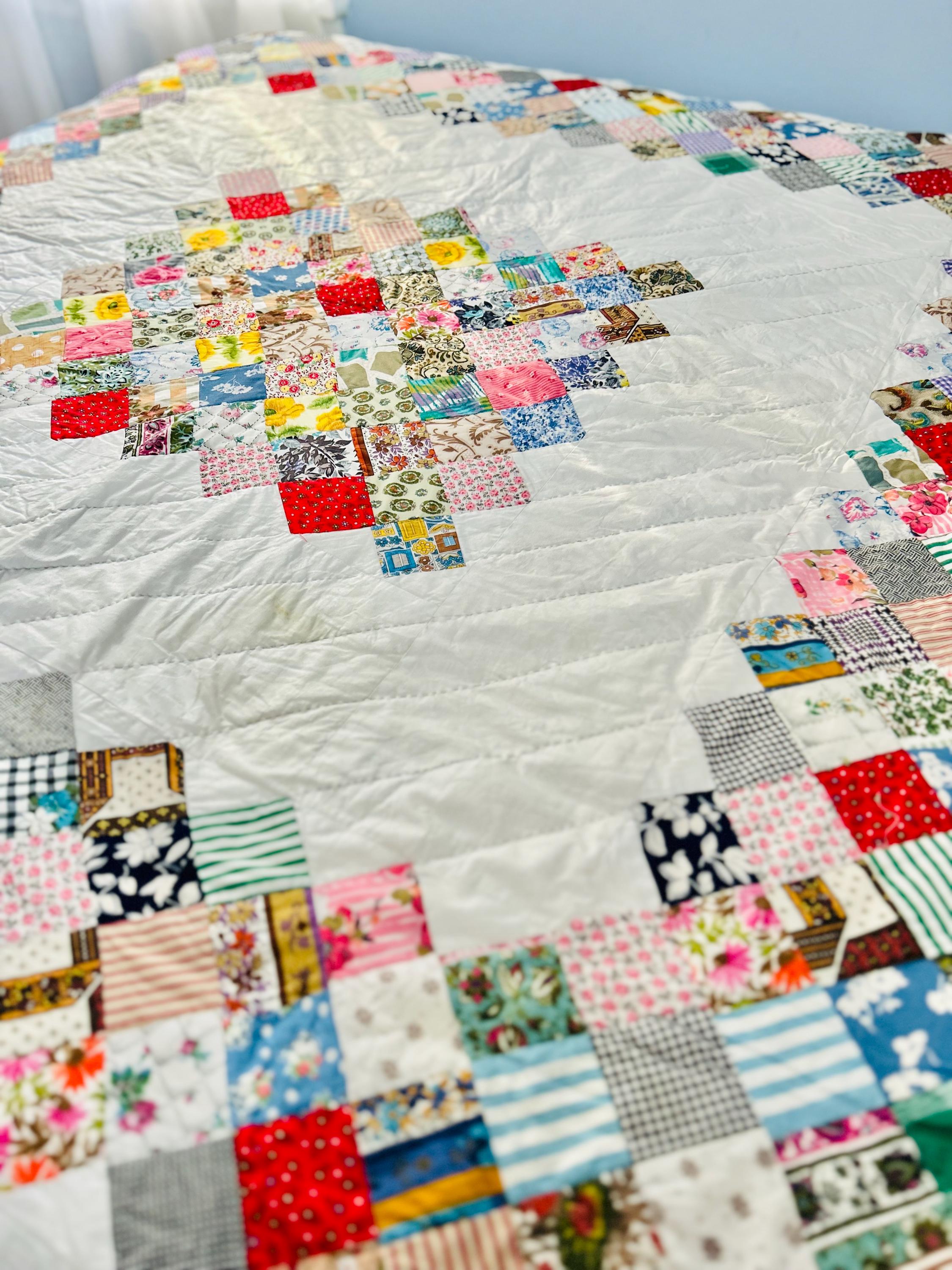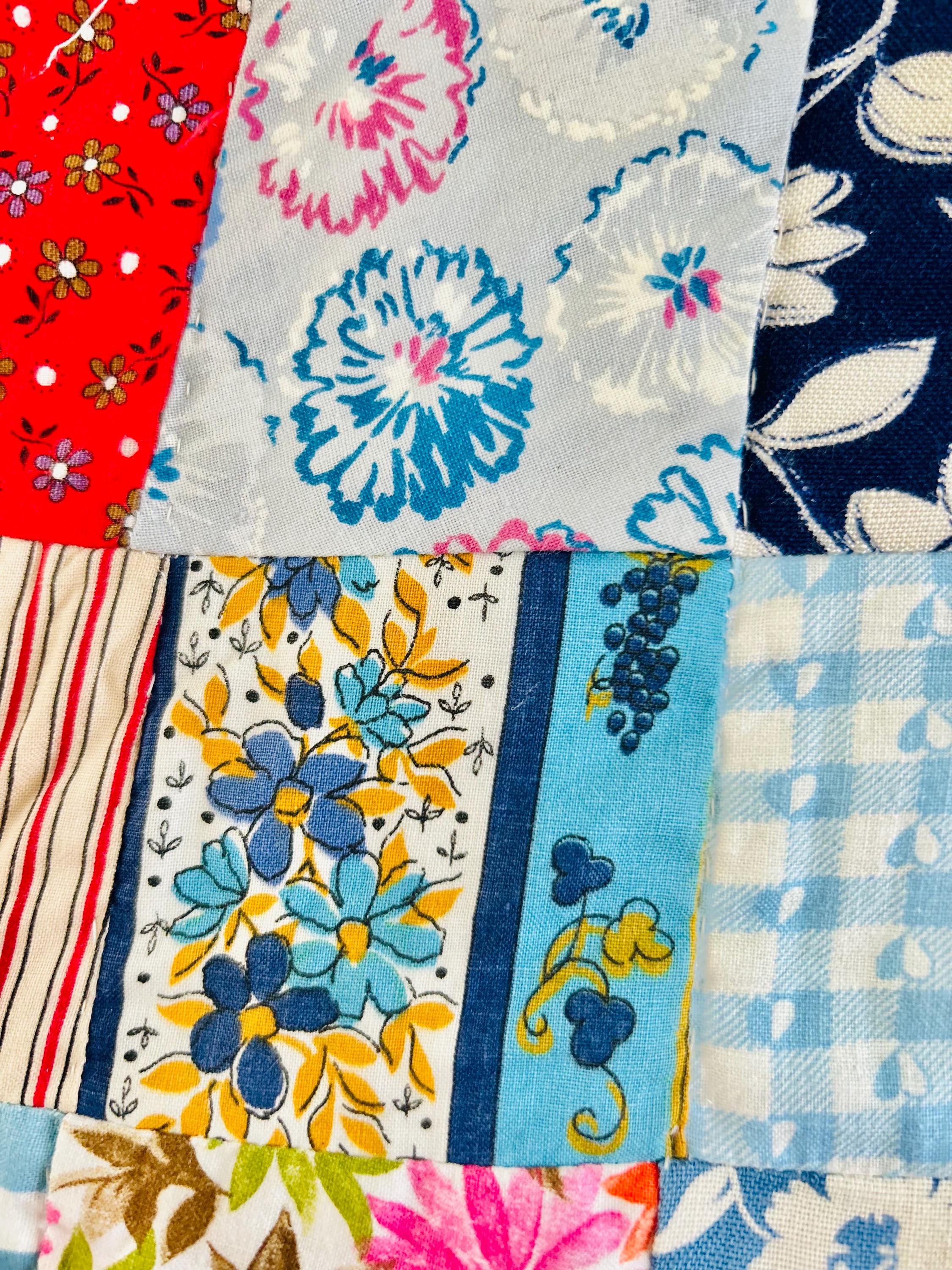This is a 1950s or early 1960s Boston Commons Quilt pieced in a variety of high-quality cottons. It has been quilted in diagonals throughout the quilt, including on the four-sided border.