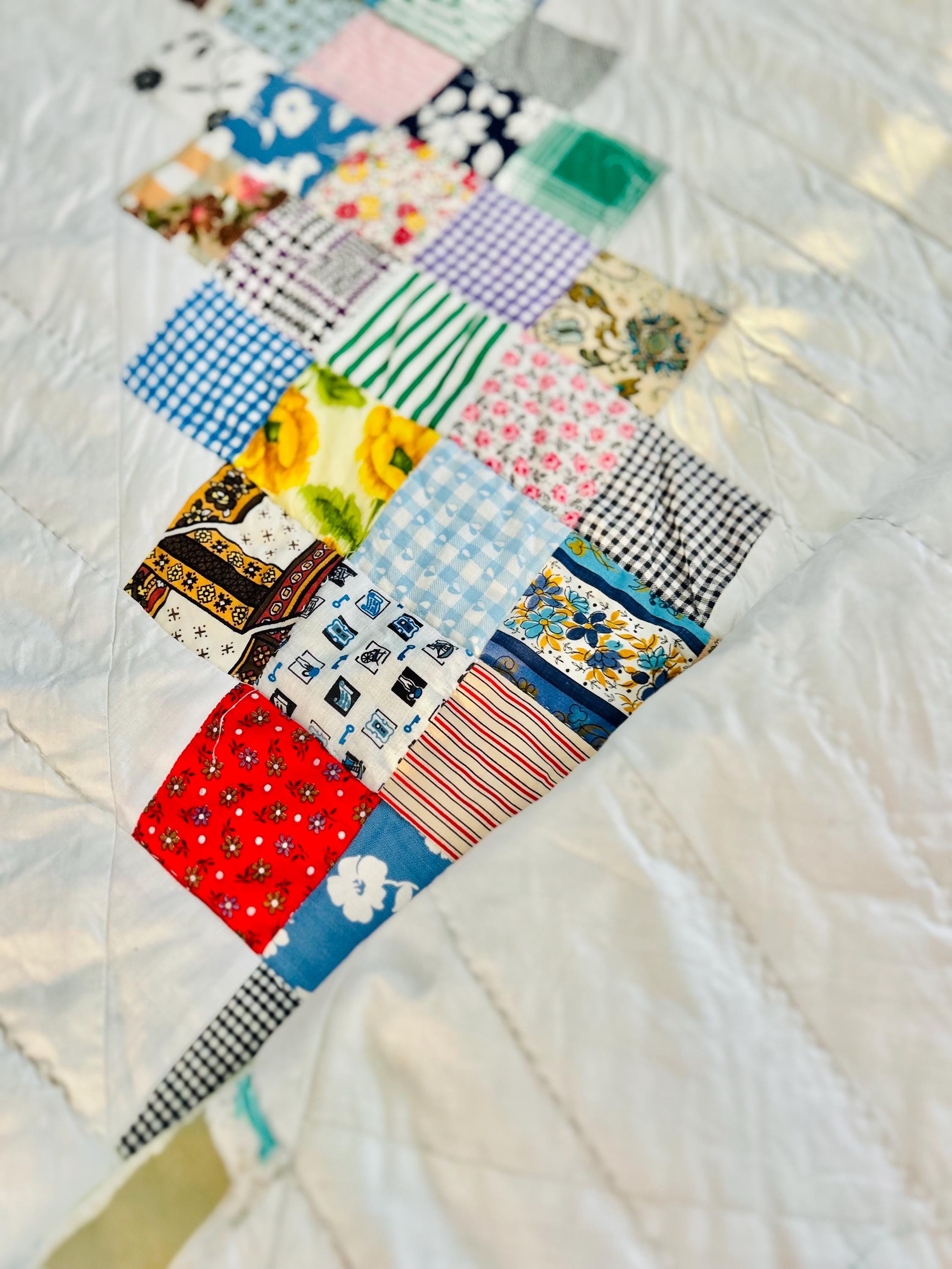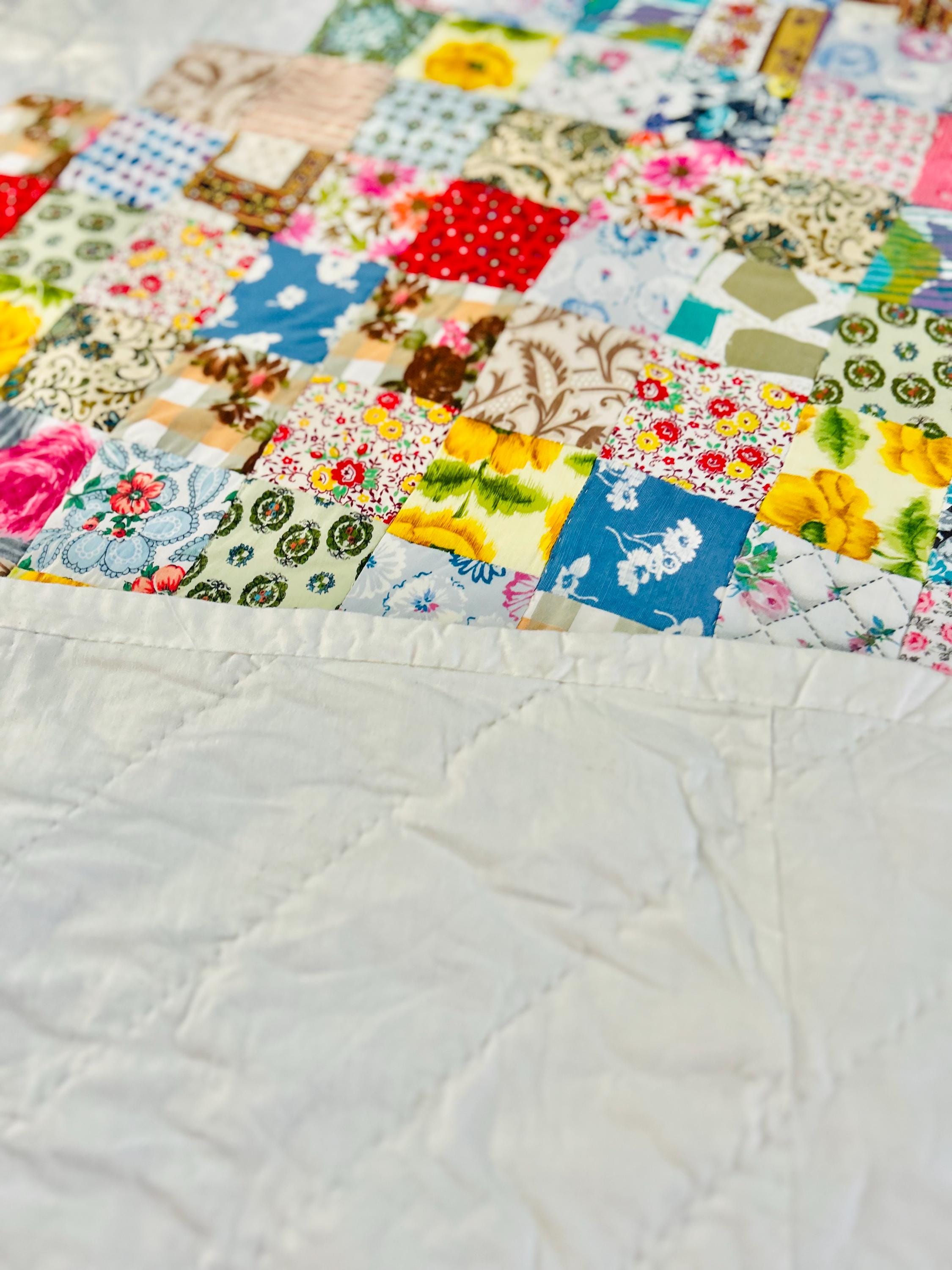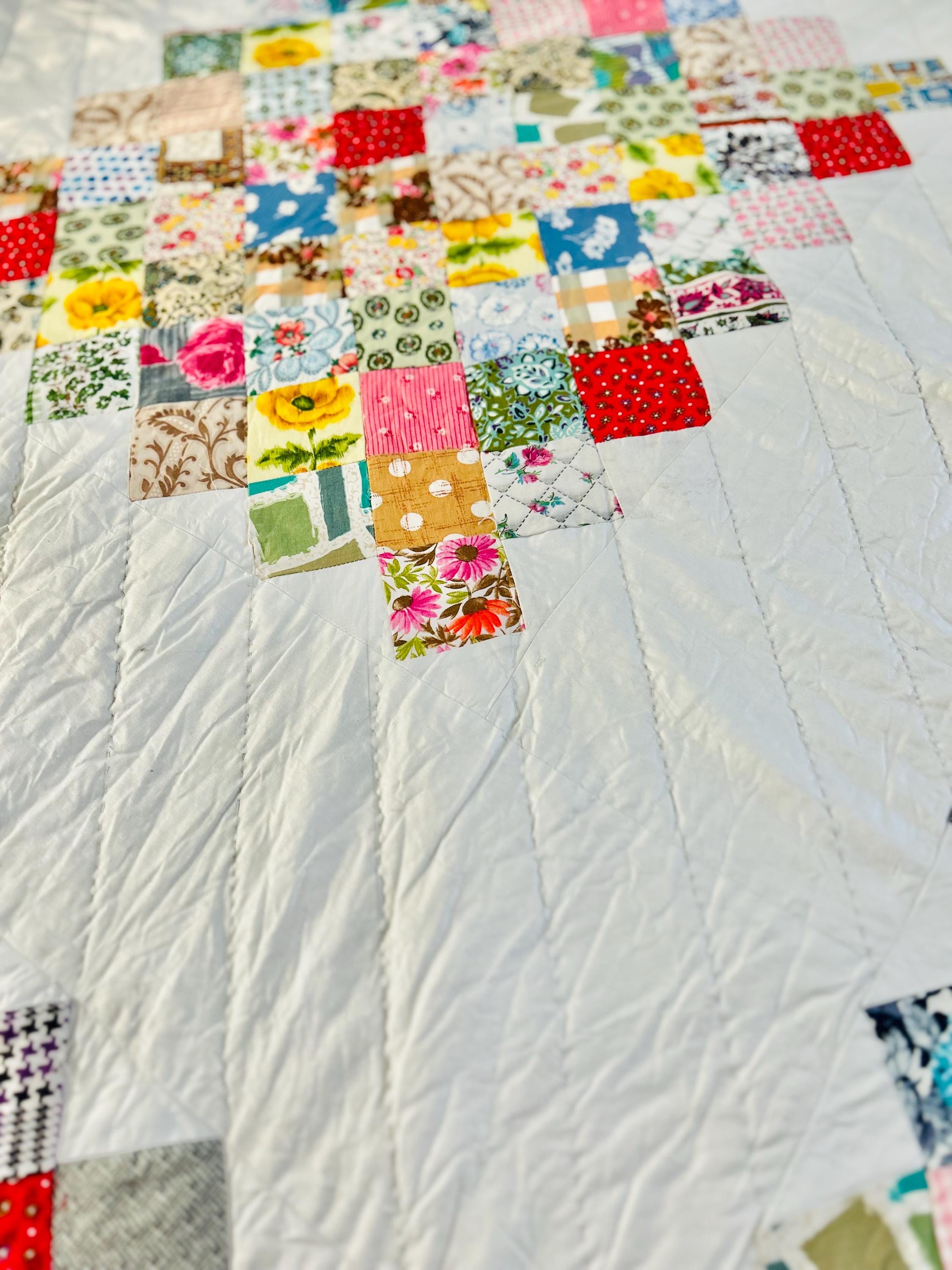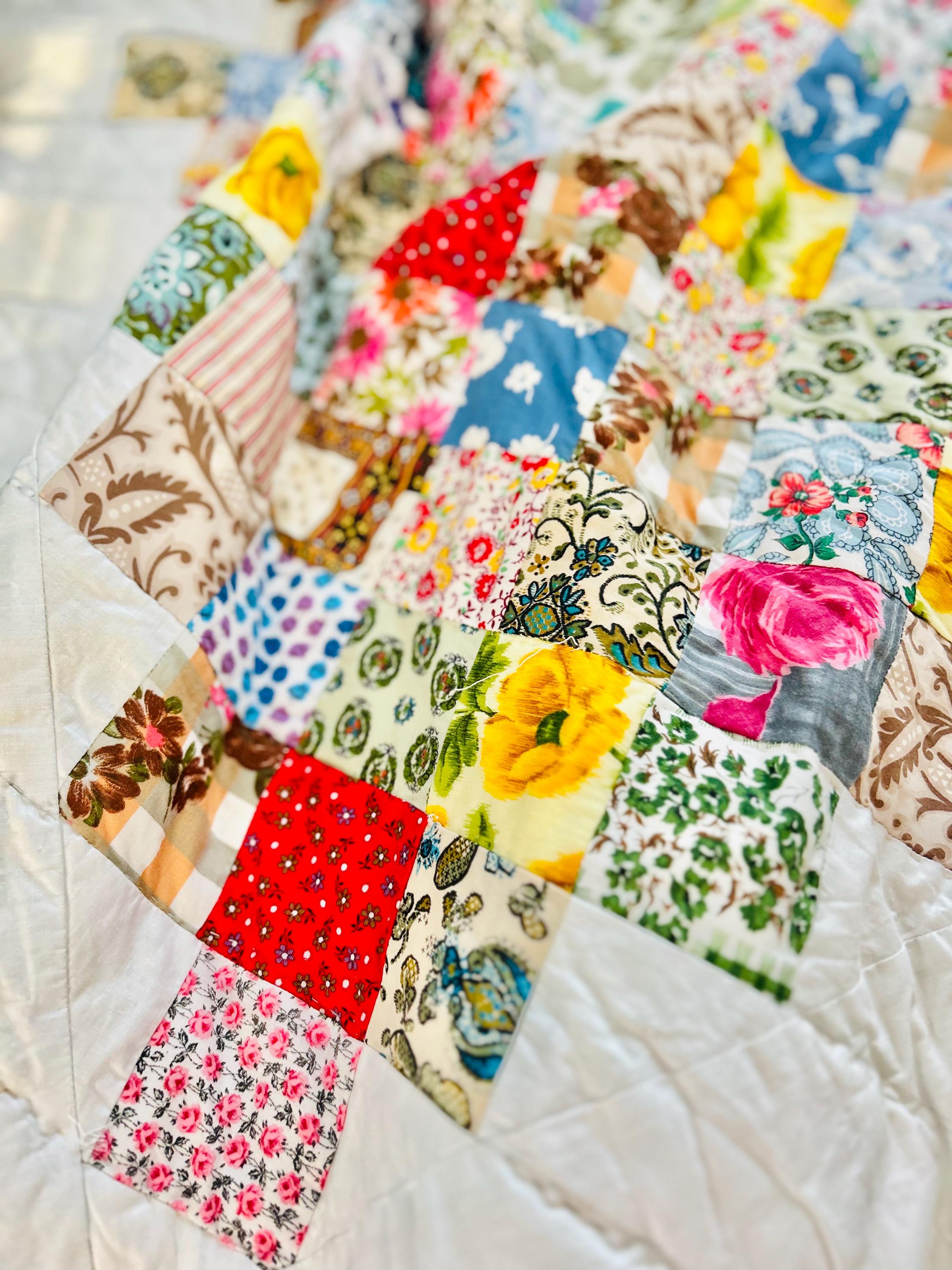 This is a 1950s or early 1960s Boston Commons Quilt pieced in a variety of high-quality cottons. It has been quilted in diagonals throughout the quilt, including on the four-sided border.