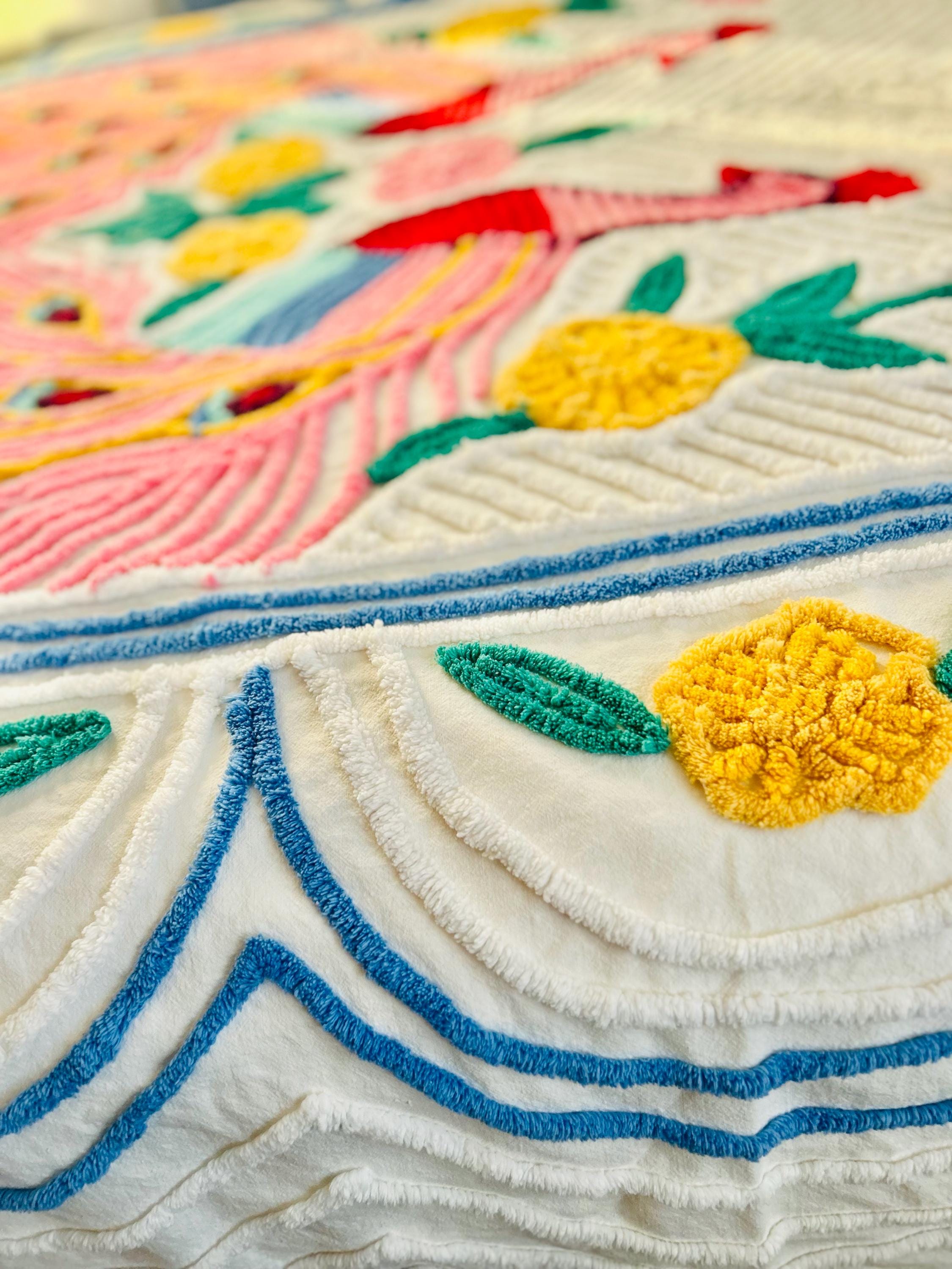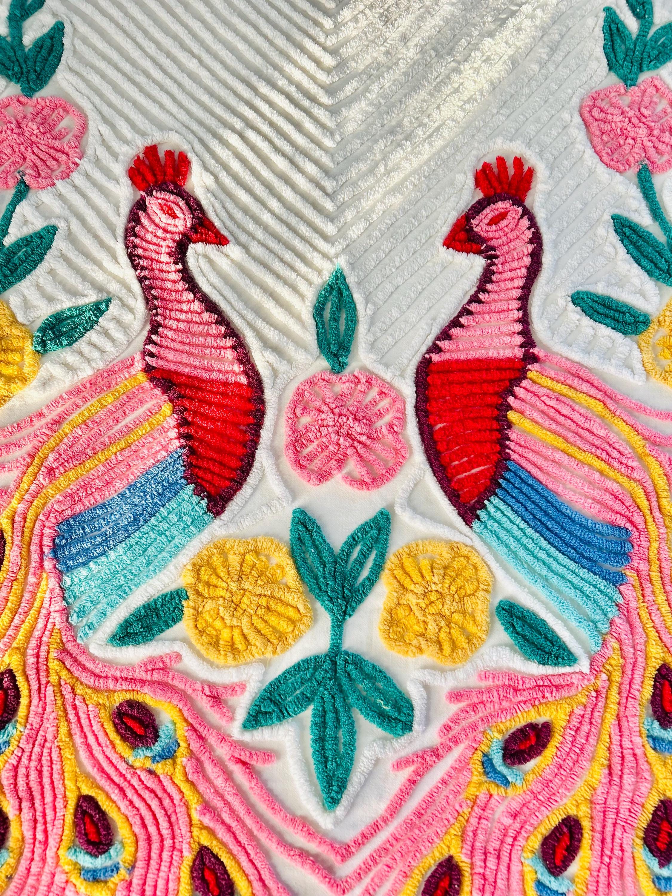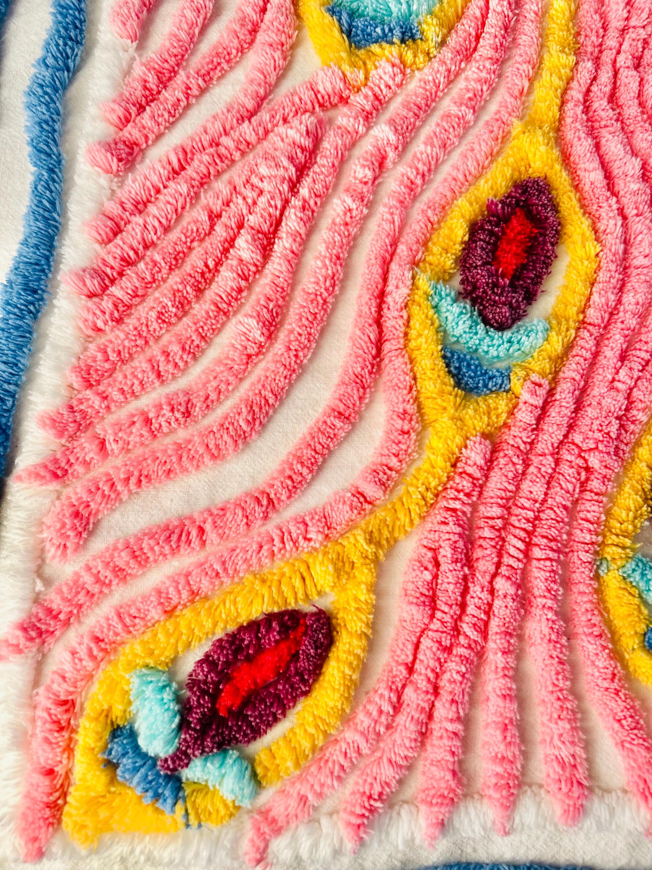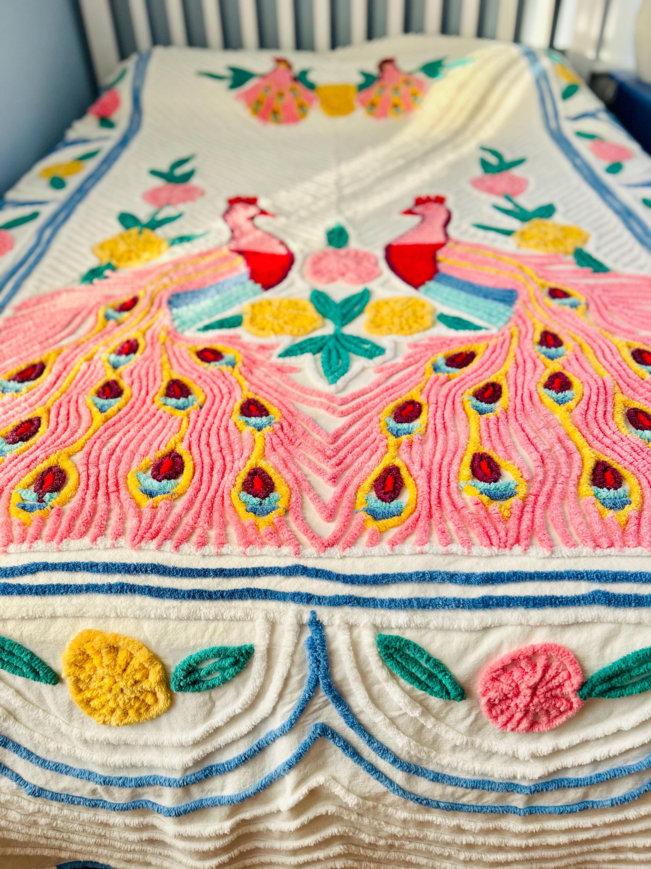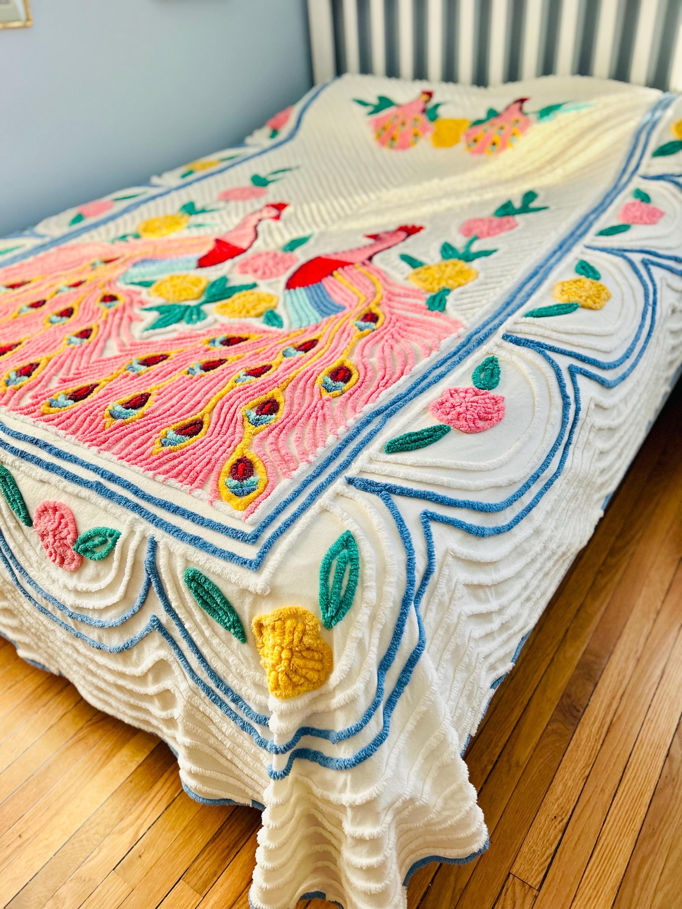 This Double Peacock Chenille bedspread is circa 1950s-1960s and is bright and fluffy all over with no bald spots, holes or stains. The top is straight across while the bottom two edges are curved (see photos).