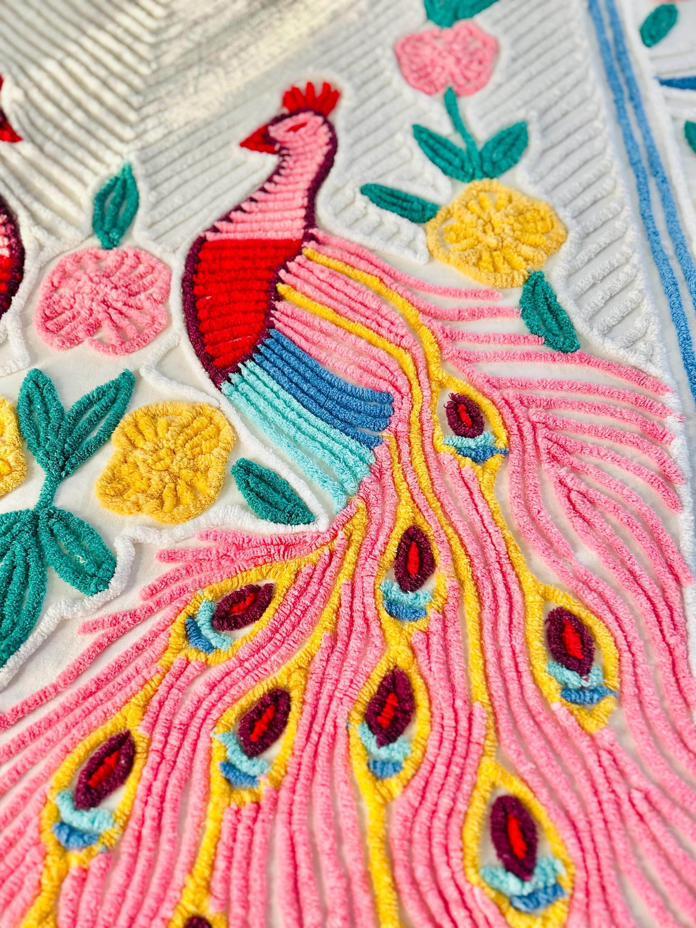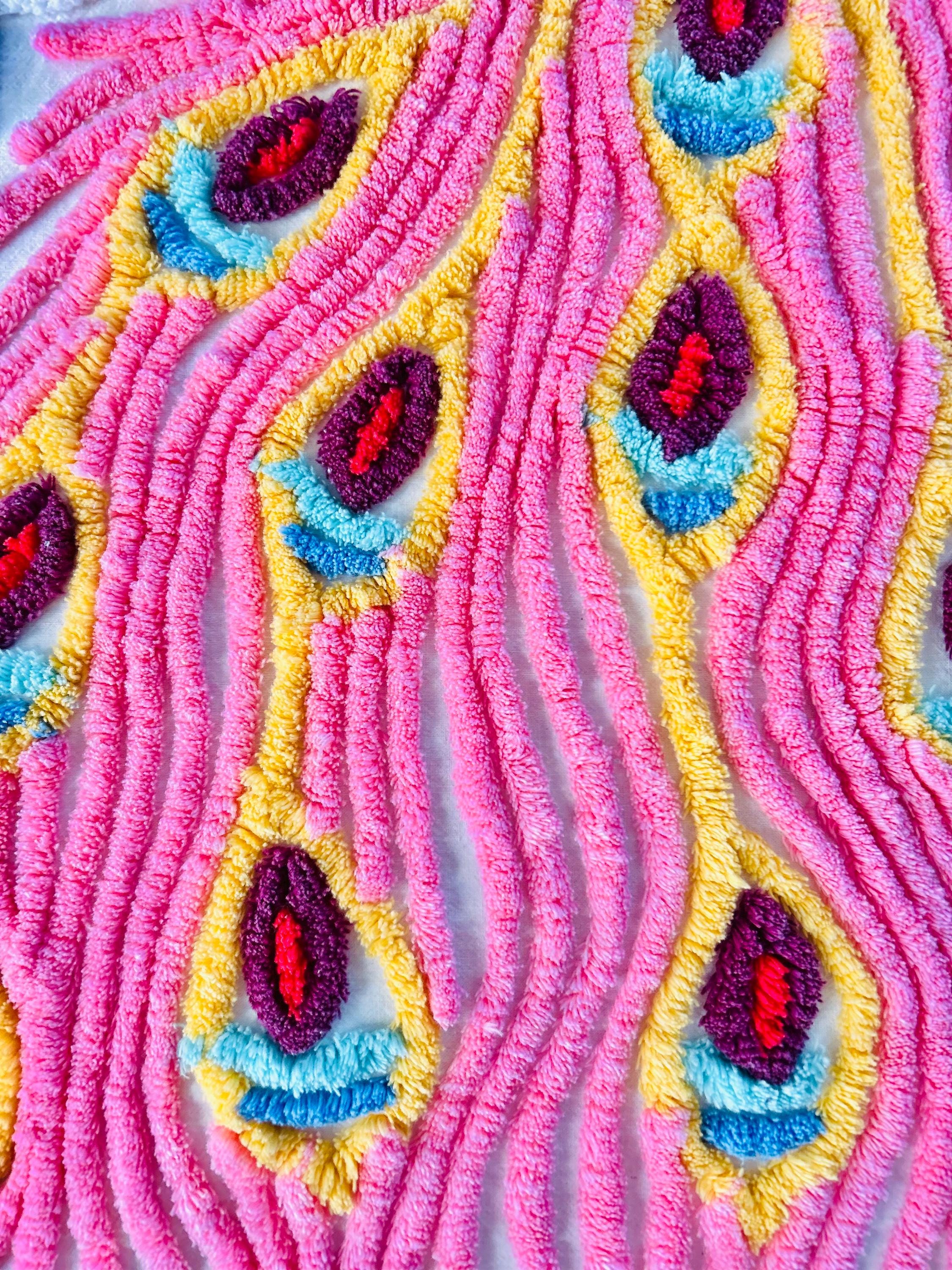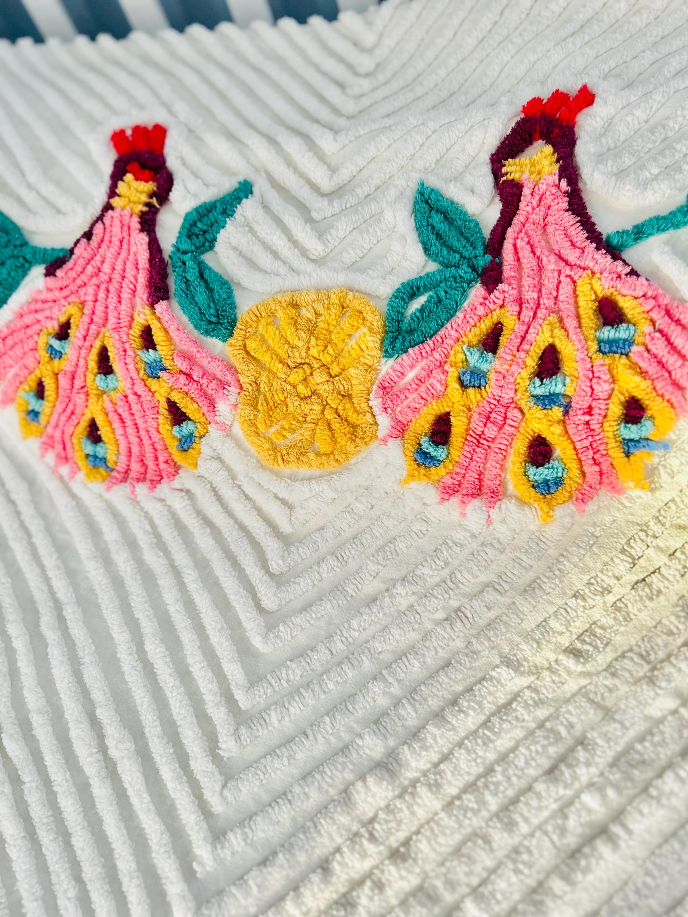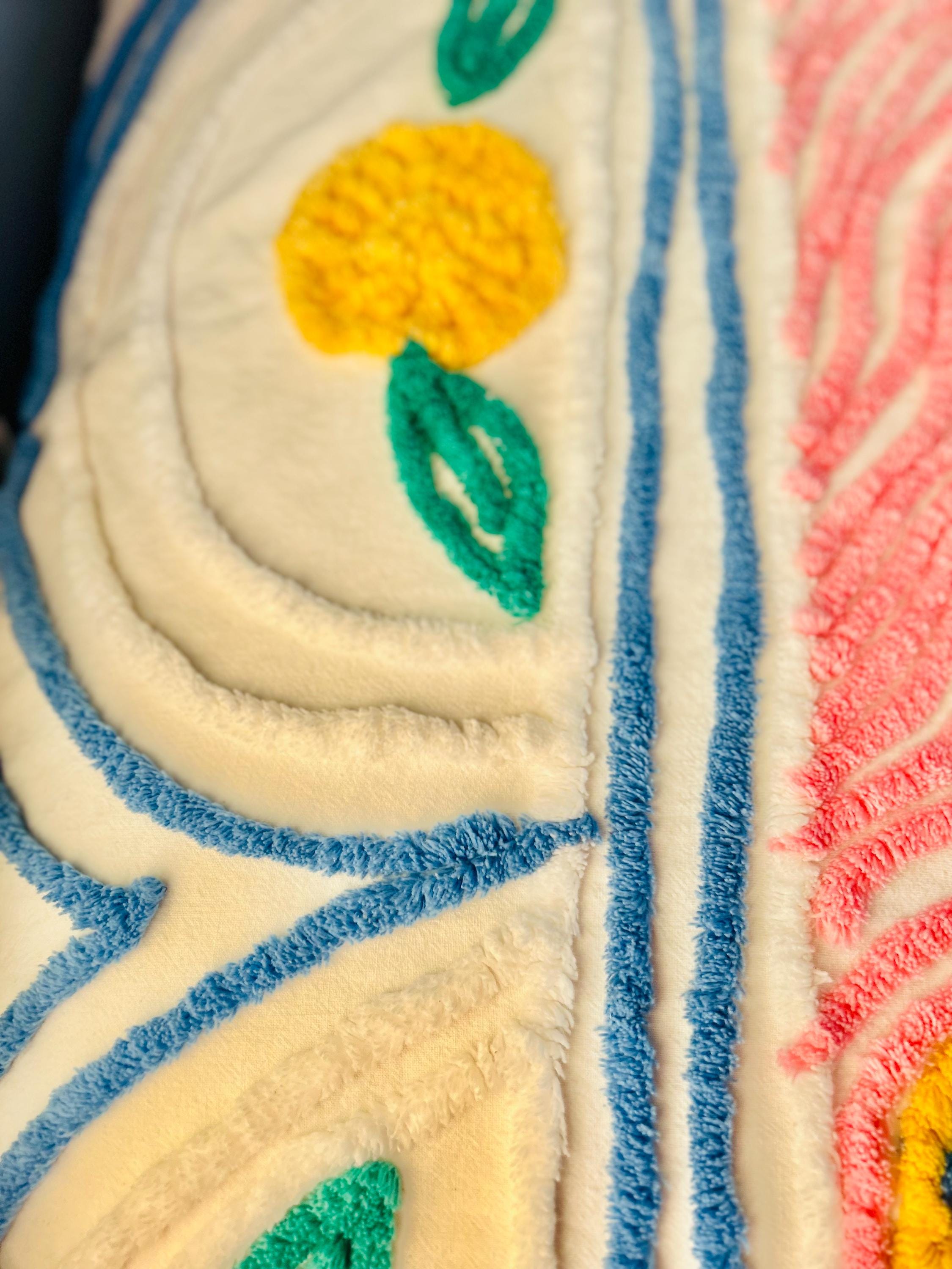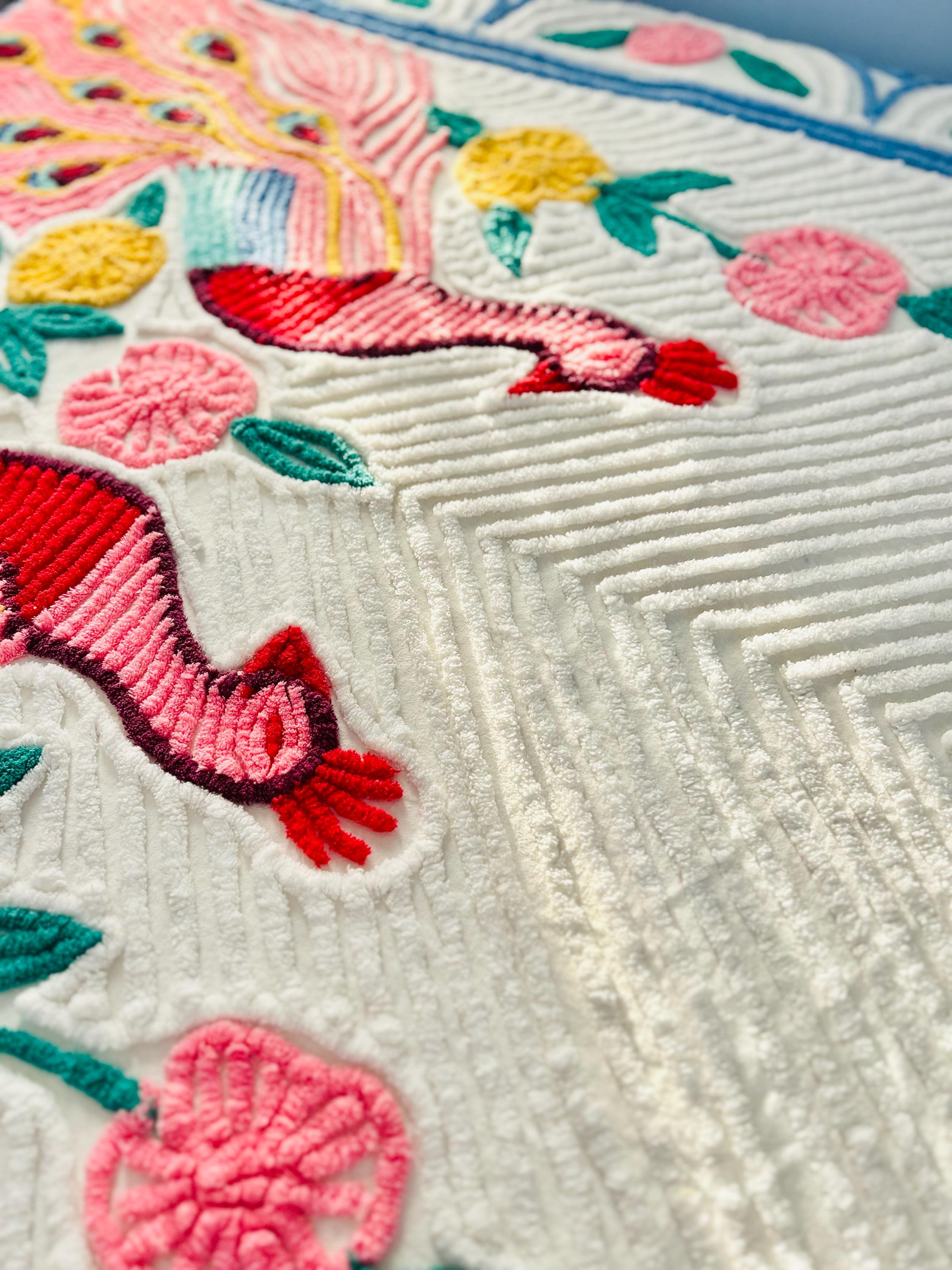 This Double Peacock Chenille bedspread is circa 1950s-1960s and is bright and fluffy all over with no bald spots, holes or stains. The top is straight across while the bottom two edges are curved (see photos).
